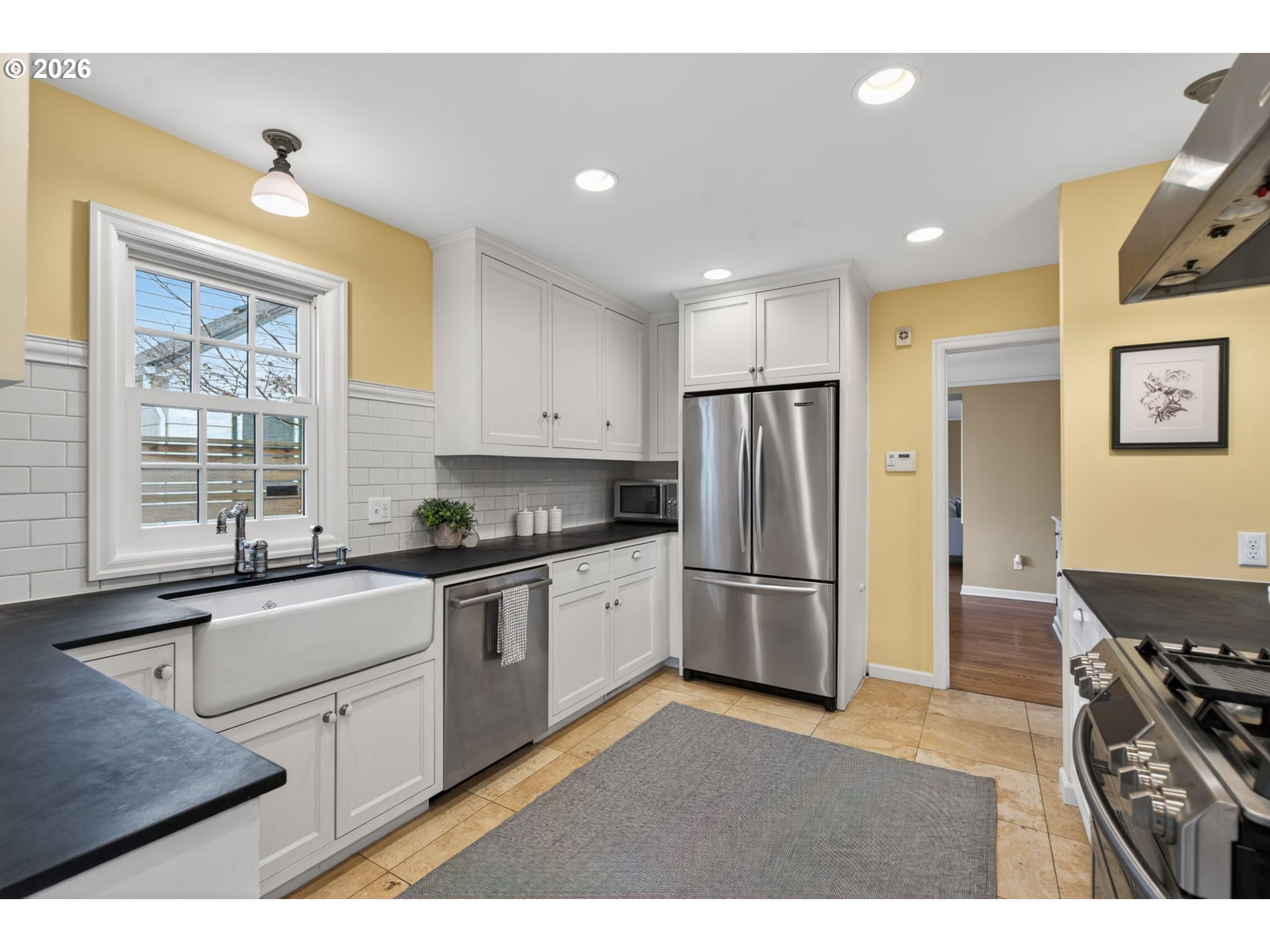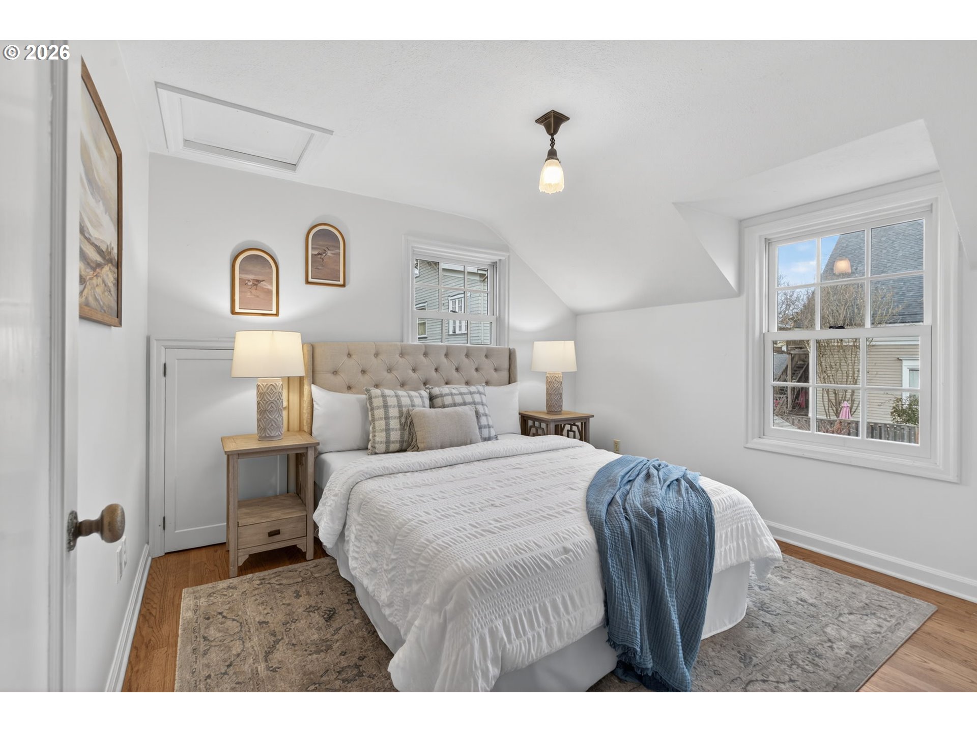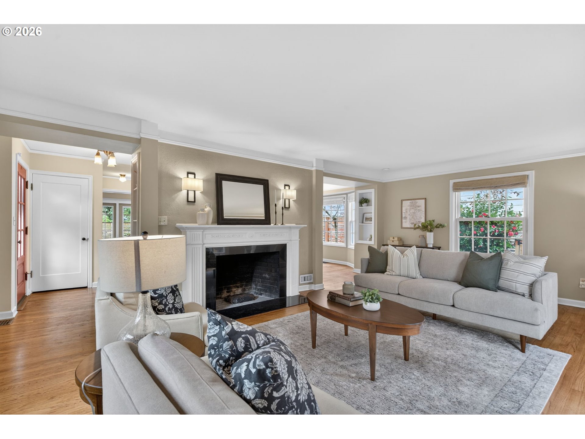 (503) 893-8874***Offer Deadline Sat. 2/21 at 2:30pm*** Open House Sat. 2/21 12-2pm. Perfectly situated on a sun-drenched corner lot in the heart of the coveted Irvington neighborhood, this beautiful Colonial offers a rare blend of timeless character, charm and a functional floor plan. Just blocks from local shops, cafes, and parks, this home is designed for both quiet daily living and effortless hosting. The main level glows with natural light throughout and features a circular flow, beginning in the entryway and proceeding into an oversized living room anchored by a wood-burning fireplace, picture rail detailing, and French doors leading to a "perfectly petite" side patio. Enjoy meals in the formal dining room, complete with period built-ins and a large bay window. The updated kitchen serves as the heart of the home, boasting travertine tile floors, SS appliances, and a seamless flow into a flex space perfect for a family room, extra dining area, reading nook + more. A second set of French doors leads directly to the backyard, complemented by a main-floor half bath. Retreat upstairs to the primary suite complete with vaulted ceilings, a cozy reading nook, and a walk-in closet. The en-suite bathroom is functional and bright, offering a tiled shower and skylight. Two additional bedrooms—one featuring a charming "secret hideaway"—share a second full bath with a double vanity. The lower level provides a versatile bonus room ideal for an office or guest suite, plus a half bath, utility room, and extensive unfinished storage for all your PNW gear. The fully fenced backyard is an entertainer’s dream. Enjoy summer gatherings on the large patio surrounded by mature foliage, fruit trees, and roses. The yard is ready for the garden enthusiast with raised beds, full irrigation system and garden shed. Modern essentials include: premium Marvin wood windows throughout, a high-efficiency heat pump for heating/cooling, heated tile floors, and secure off-street parking with an electronic gate. [Home Energy Score = 3. HES Report at https://rpt.greenbuildingregistry.com/hes/OR10241648]