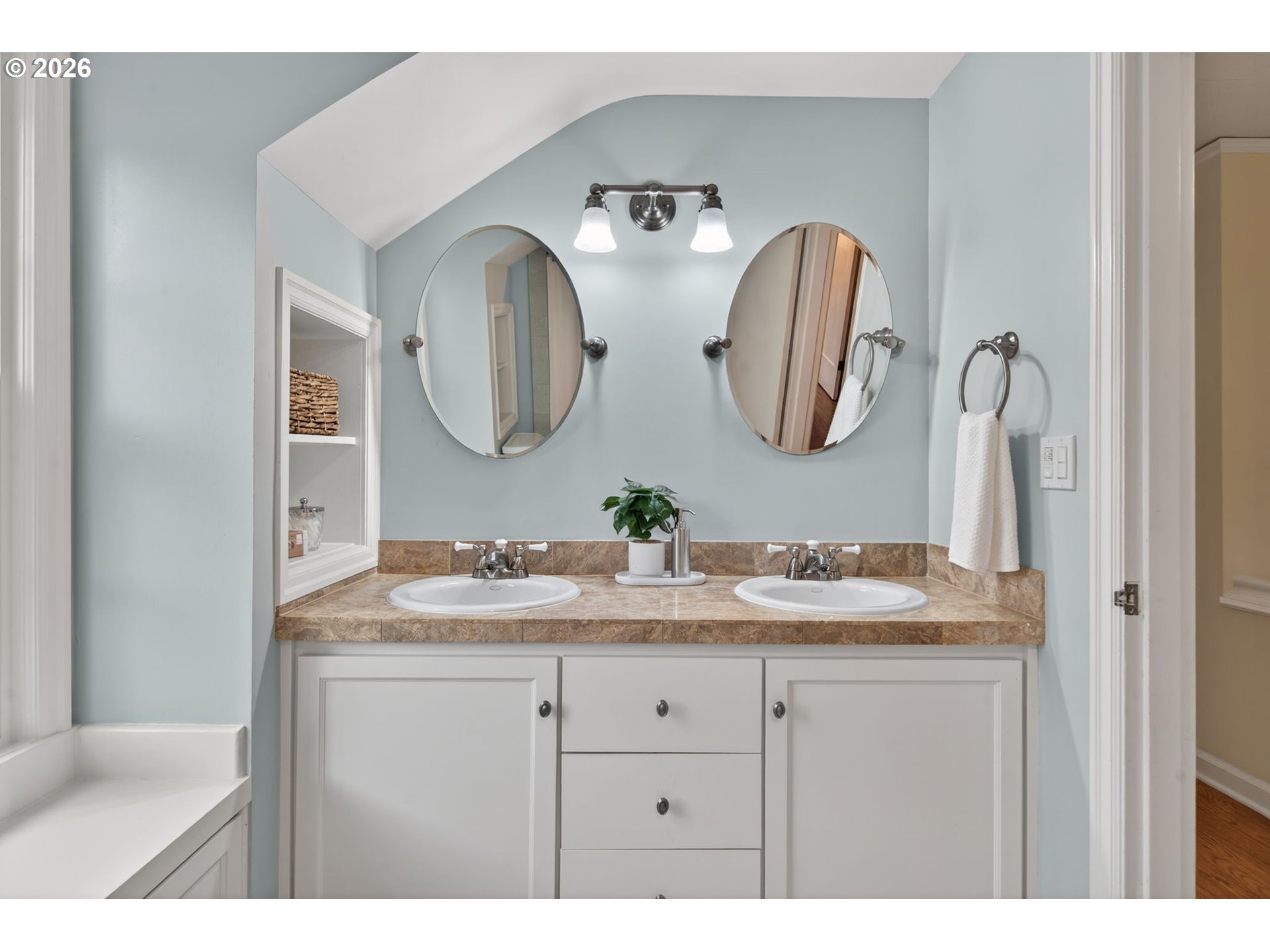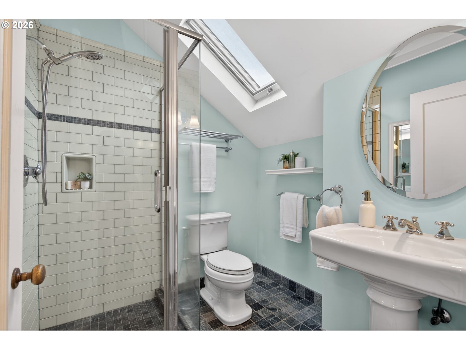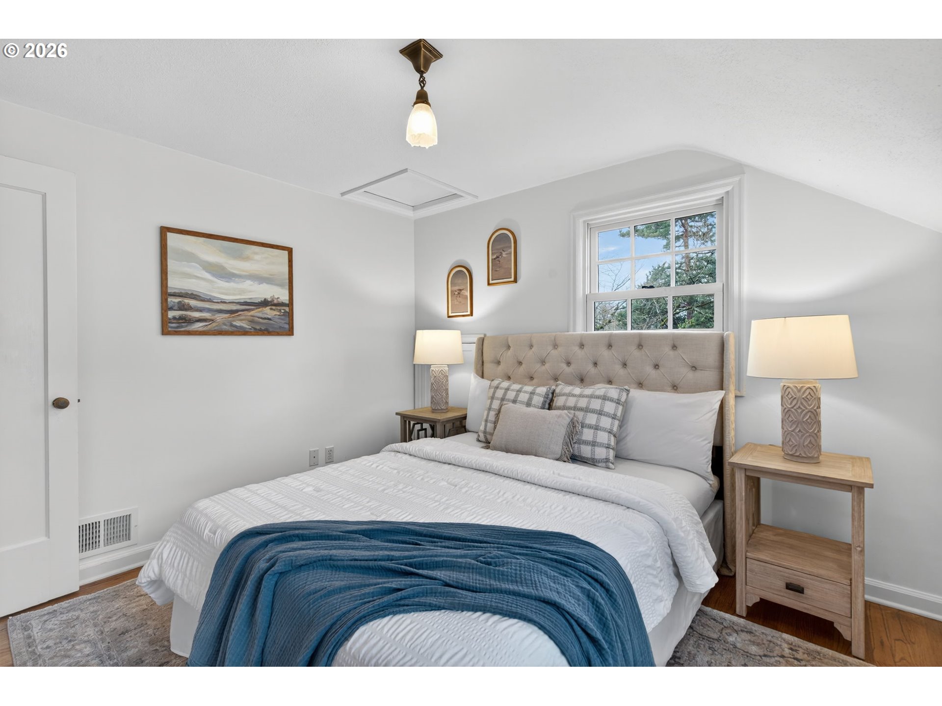 (503) 893-8874***Offer Deadline Sat. 2/21 at 2:30pm*** Open House Sat. 2/21 12-2pm. Perfectly situated on a sun-drenched corner lot in the heart of the coveted Irvington neighborhood, this beautiful Colonial offers a rare blend of timeless character, charm and a functional floor plan. Just blocks from local shops, cafes, and parks, this home is designed for both quiet daily living and effortless hosting. The main level glows with natural light throughout and features a circular flow, beginning in the entryway and proceeding into an oversized living room anchored by a wood-burning fireplace, picture rail detailing, and French doors leading to a "perfectly petite" side patio. Enjoy meals in the formal dining room, complete with period built-ins and a large bay window. The updated kitchen serves as the heart of the home, boasting travertine tile floors, SS appliances, and a seamless flow into a flex space perfect for a family room, extra dining area, reading nook + more. A second set of French doors leads directly to the backyard, complemented by a main-floor half bath. Retreat upstairs to the primary suite complete with vaulted ceilings, a cozy reading nook, and a walk-in closet. The en-suite bathroom is functional and bright, offering a tiled shower and skylight. Two additional bedrooms—one featuring a charming "secret hideaway"—share a second full bath with a double vanity. The lower level provides a versatile bonus room ideal for an office or guest suite, plus a half bath, utility room, and extensive unfinished storage for all your PNW gear. The fully fenced backyard is an entertainer’s dream. Enjoy summer gatherings on the large patio surrounded by mature foliage, fruit trees, and roses. The yard is ready for the garden enthusiast with raised beds, full irrigation system and garden shed. Modern essentials include: premium Marvin wood windows throughout, a high-efficiency heat pump for heating/cooling, heated tile floors, and secure off-street parking with an electronic gate. [Home Energy Score = 3. HES Report at https://rpt.greenbuildingregistry.com/hes/OR10241648]