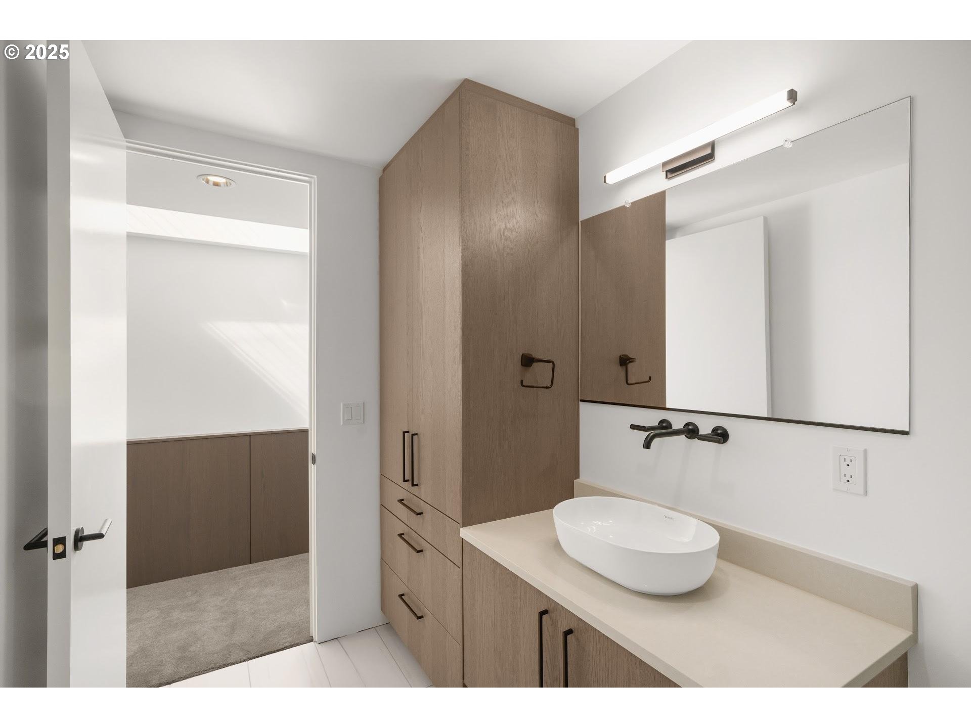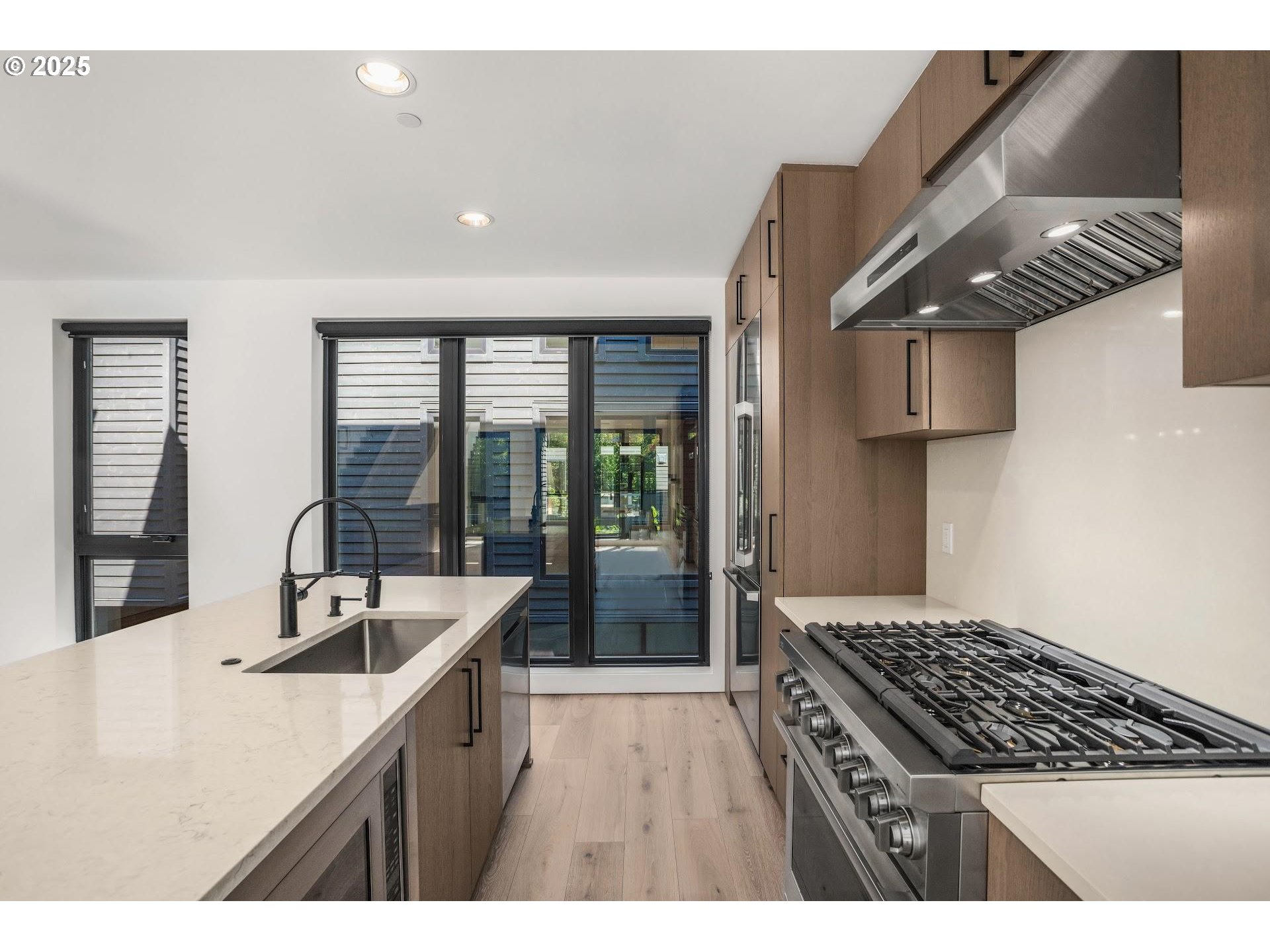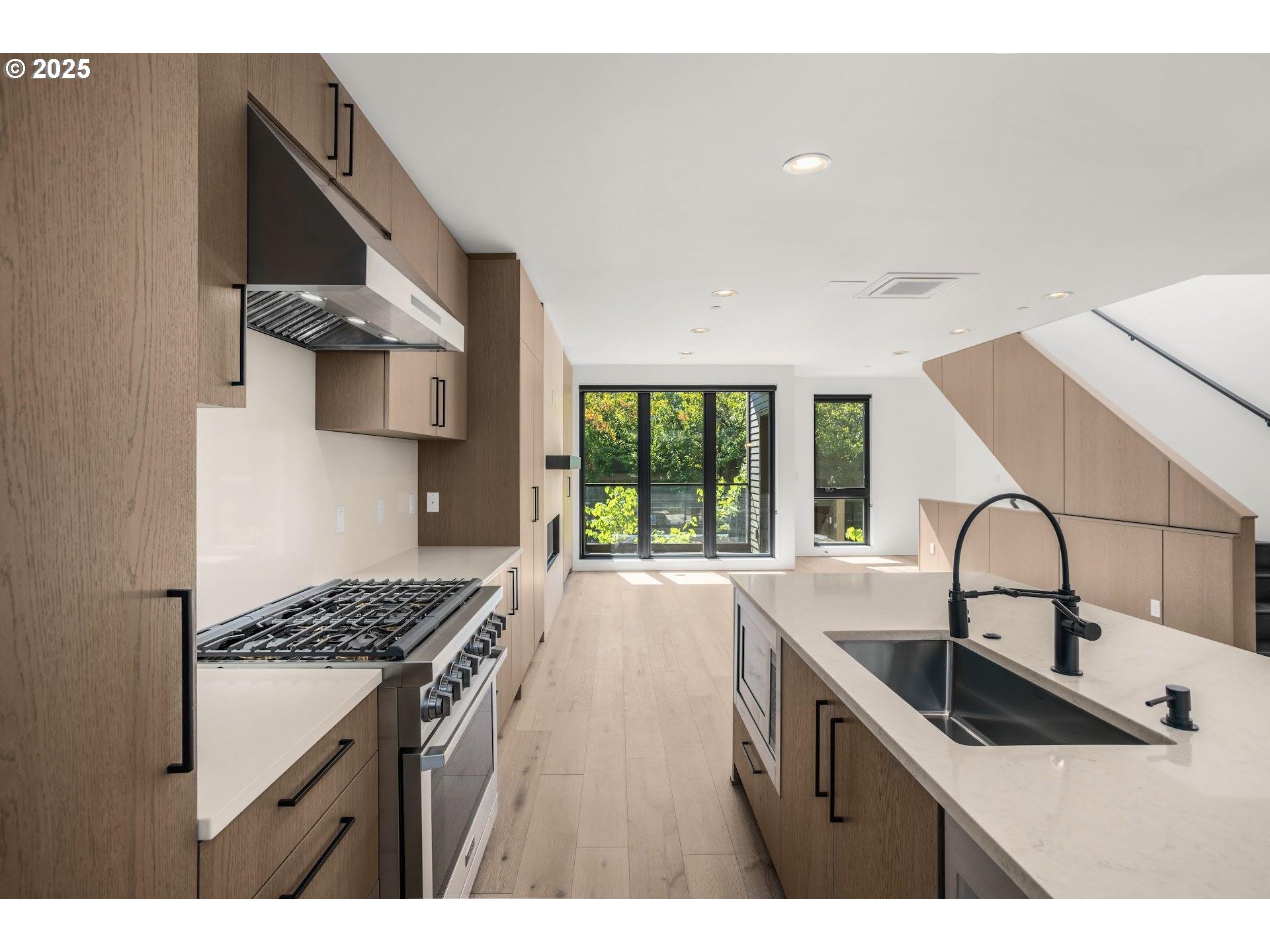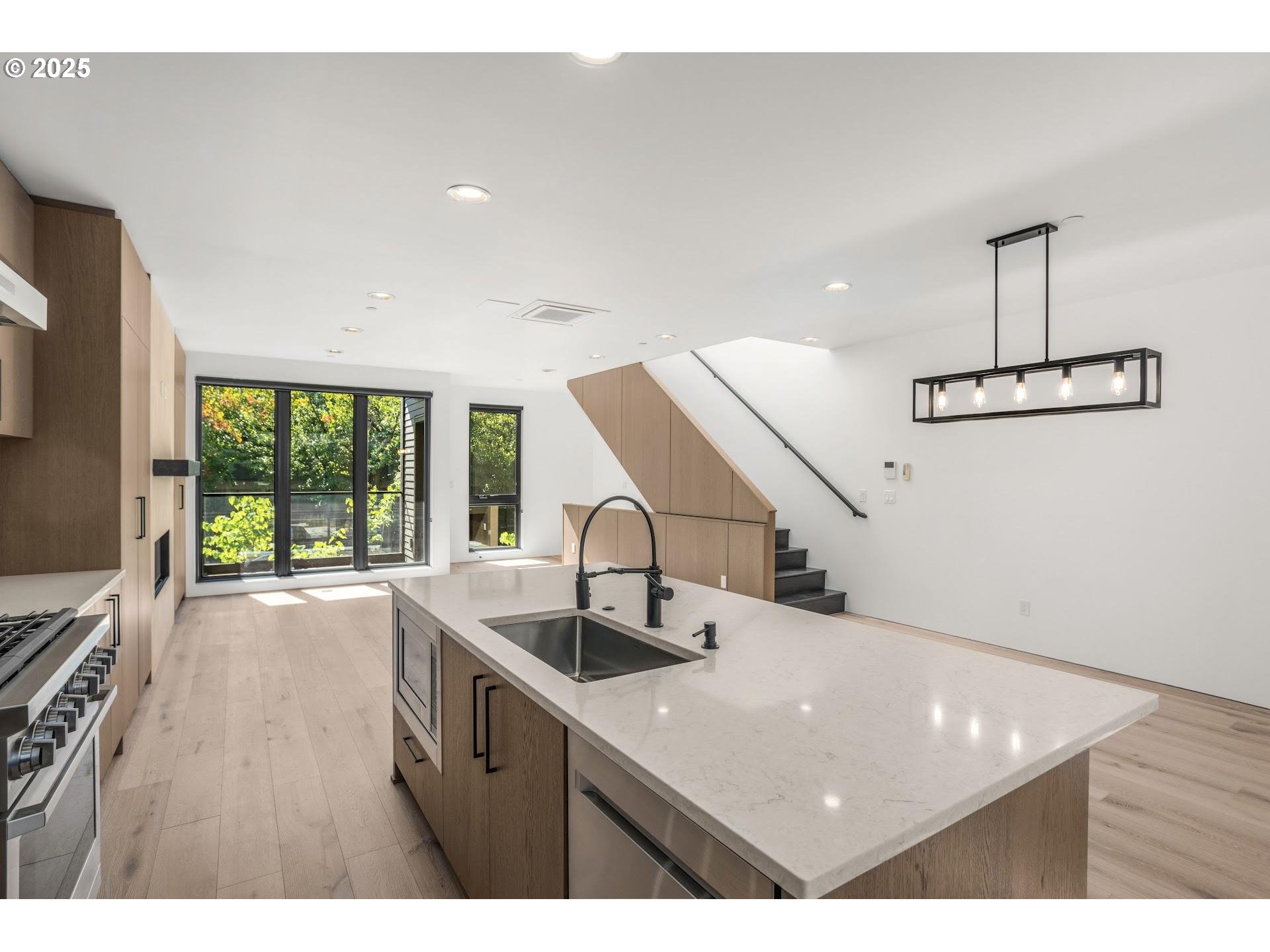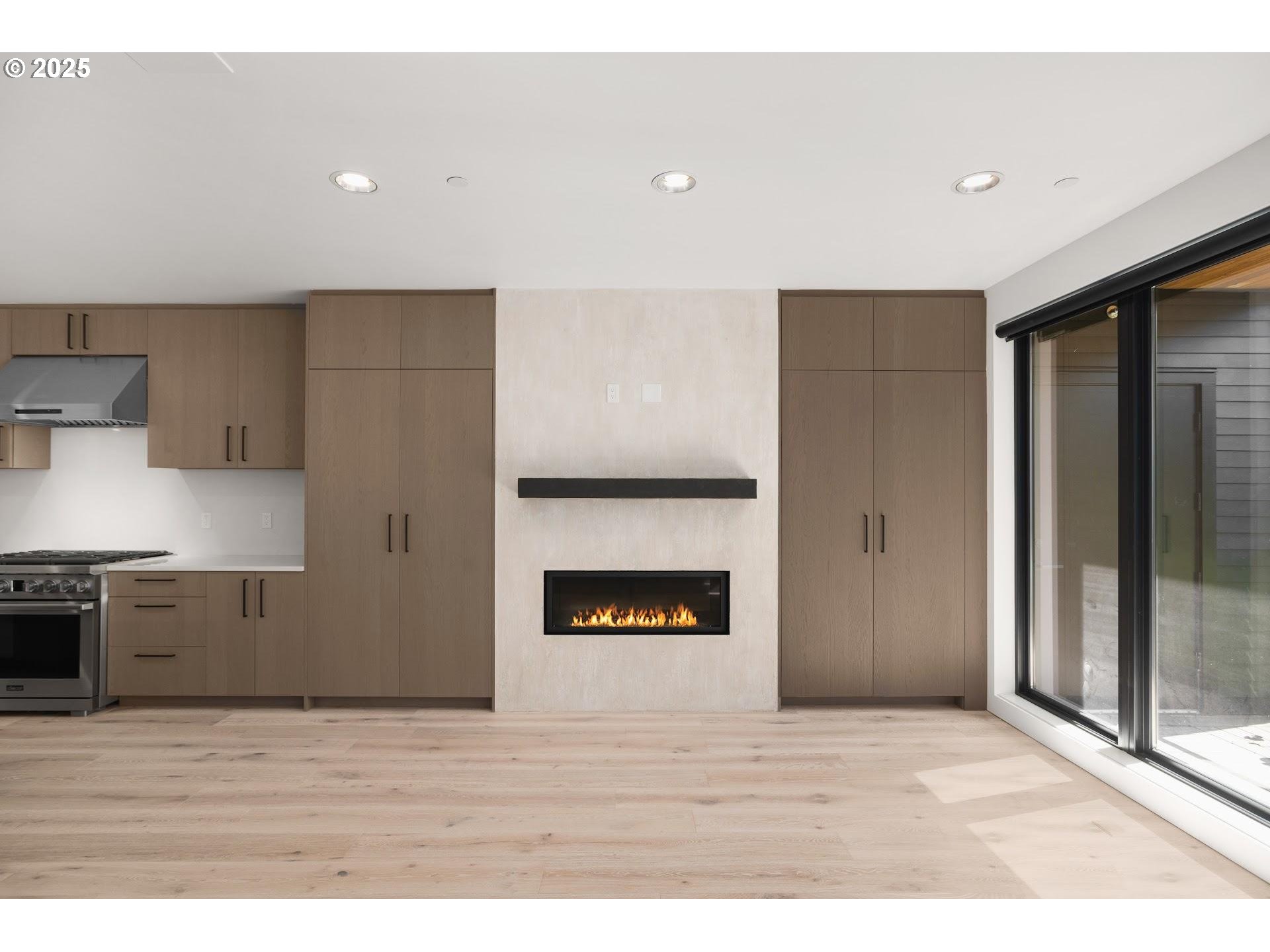 Nestled at the edge of Forest Park, enjoy life in an established quiet neighborhood in your stunning contemporary home in the Balch Creek Townhomes. Thoughtfully designed by FieldWorks, this home features clean lines and fine finishes - custom cabinetry throughout, wide plank hardwood floors, polished concrete, and impressive walls of windows. This home (the smaller of the two available floorplan types) has 2 bedrooms and a first floor bonus / office area. Living room is anchored with a beautiful fireplace with custom European plaster surround, and tons of built in storage. Kitchen features a large island with extra seating, Viking appliances, slab quartz counters, and access to a covered patio with storage space. The primary bedroom features custom cabinetry based storage closets, and a luxurious ensuite bath with glass enclosed shower, Duravit fixtures, and elegant tile floors with beautiful accent shower tiles. The guest bedroom also features custom cabinetry based storage and easy access to a large hall bathroom with tons of storage for linens and products. One car attached garage (wired for EV) has lots of extra storage space, and is accessed secured via a secure gated driveway entry. A bold, modern development with easy access to the Thurman corridor and all its shops, bakeries and dining.