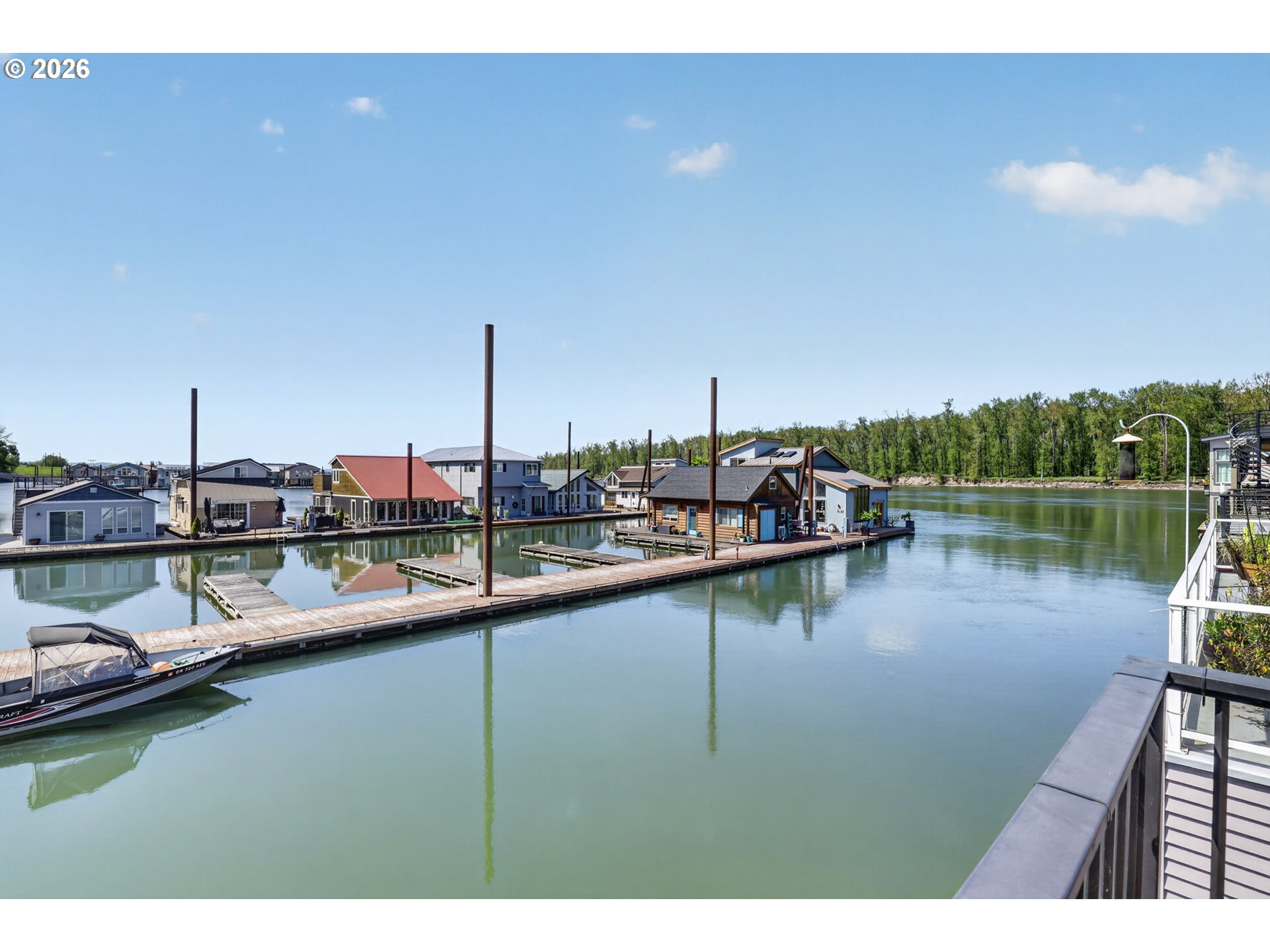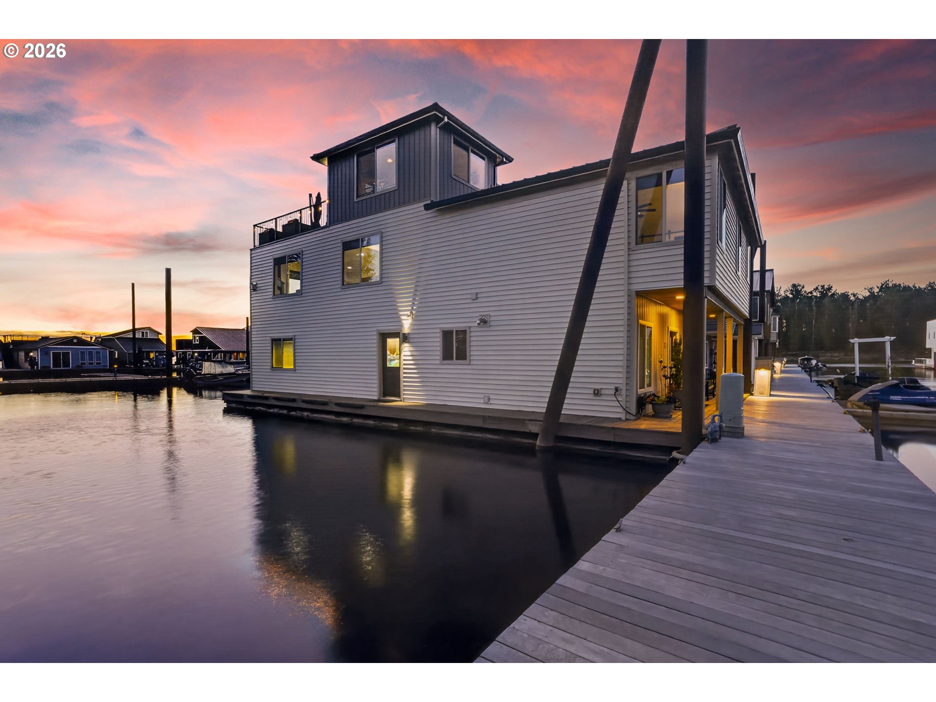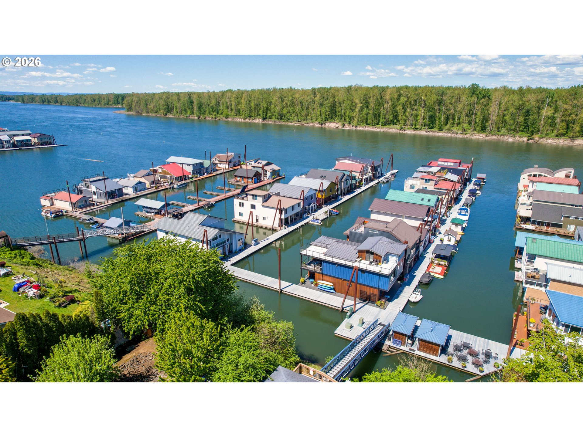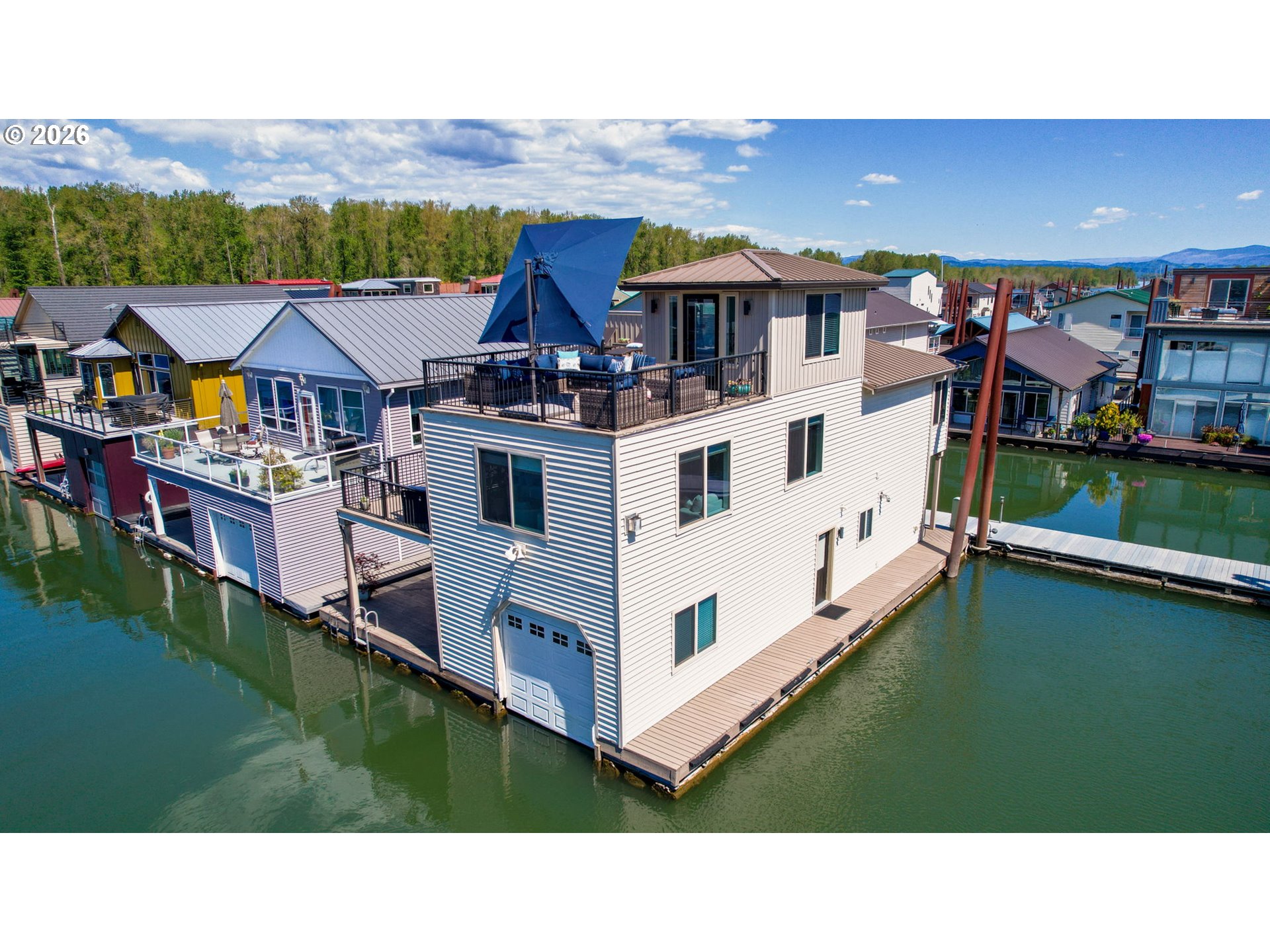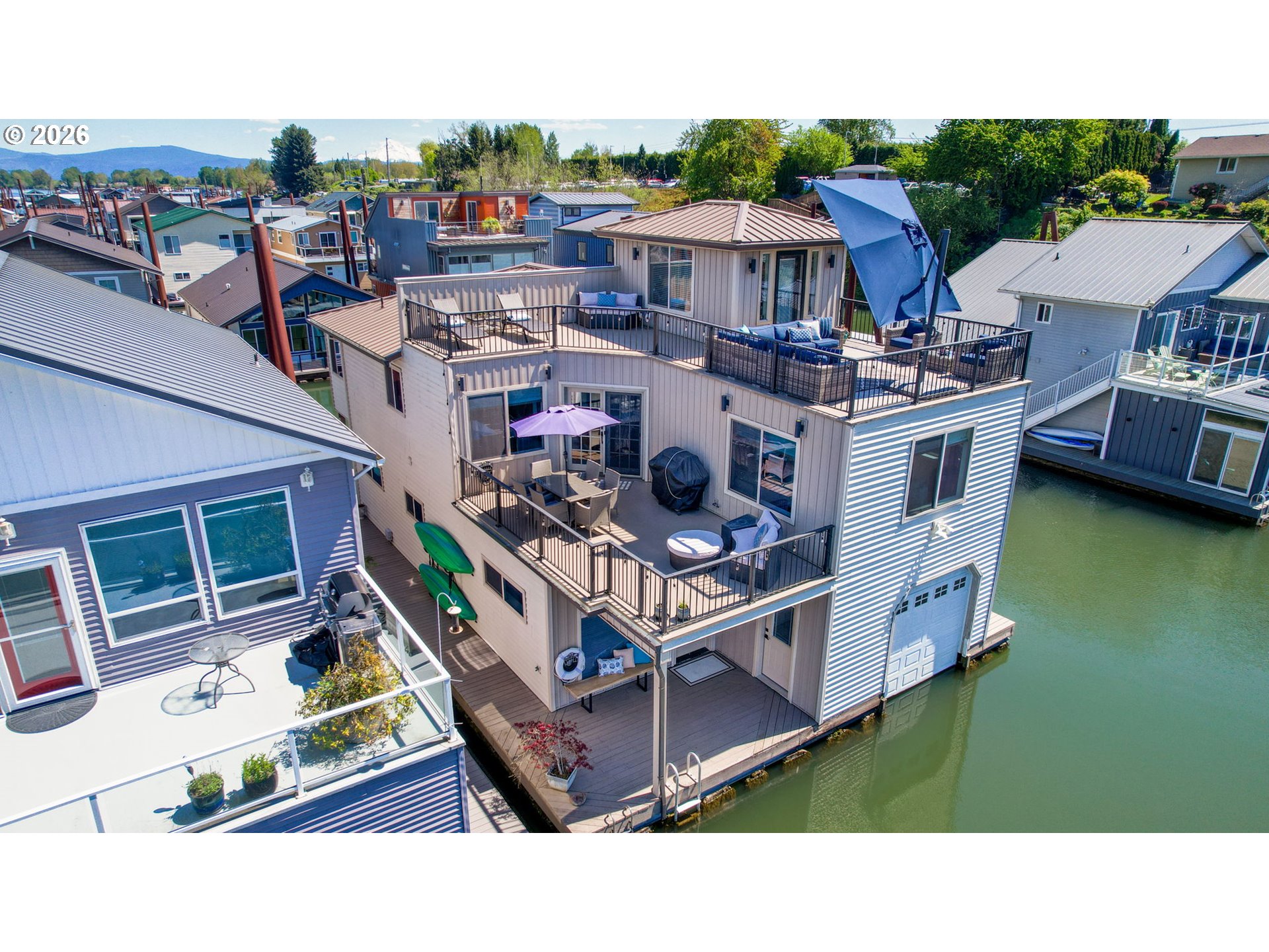 Breathtaking Columbia Ridge Moorage Retreat. Experience elevated waterfront living in this spacious, light-filled end-row home boasting Mt. Hood and Columbia River views. Perfectly positioned near the west edge of the gorge, this unique residence offers a front-row seat to the natural beauty of the Pacific Northwest. This home features a primary on the upper level with an attached ensuite offering a jetted-tub, walk in closet and dual sinks. Open floor plan from the kitchen to the great room with a gas fireplace, french doors to a back deck for entertaining and relaxing and beautiful views of the river. On the lower level you will find two additional bedrooms, a family hall bath, and family room with access to the back deck. Just a short boat ride to the mouth of the Sandy River, you’ll enjoy world-class salmon fishing and unforgettable scenery right at your doorstep. This floating home has it's own private boat well with a lift to house a 23ft boat. In addition there is a generous 12’ x 40’ space at the front of the home giving opportunity for a floating patio for entertaining or relaxing under the sunset, extra storage or park your water crafts. Expansive outdoor living spans three decks, each capturing some of the most striking views in the Portland area. Inside, natural light pours through every level, highlighting thoughtful design and spacious interiors offering new trim, new window coverings, new hardware, new mirrors, light fixtures. Climb the spiraling staircase to the third-story den/office offers an inspiring home office retreat — leading out to an oversized deck for taking in the panoramic river vista views and sunsets. Across Marine Dr there is the South parking lot which is gated and secure to park your RV/boat, storage, plus additional parking for guests or overflow, and enjoy the bike & walking paths. This home floats across from McGuire Island, and is 10-15 minutes from the PDX airport.