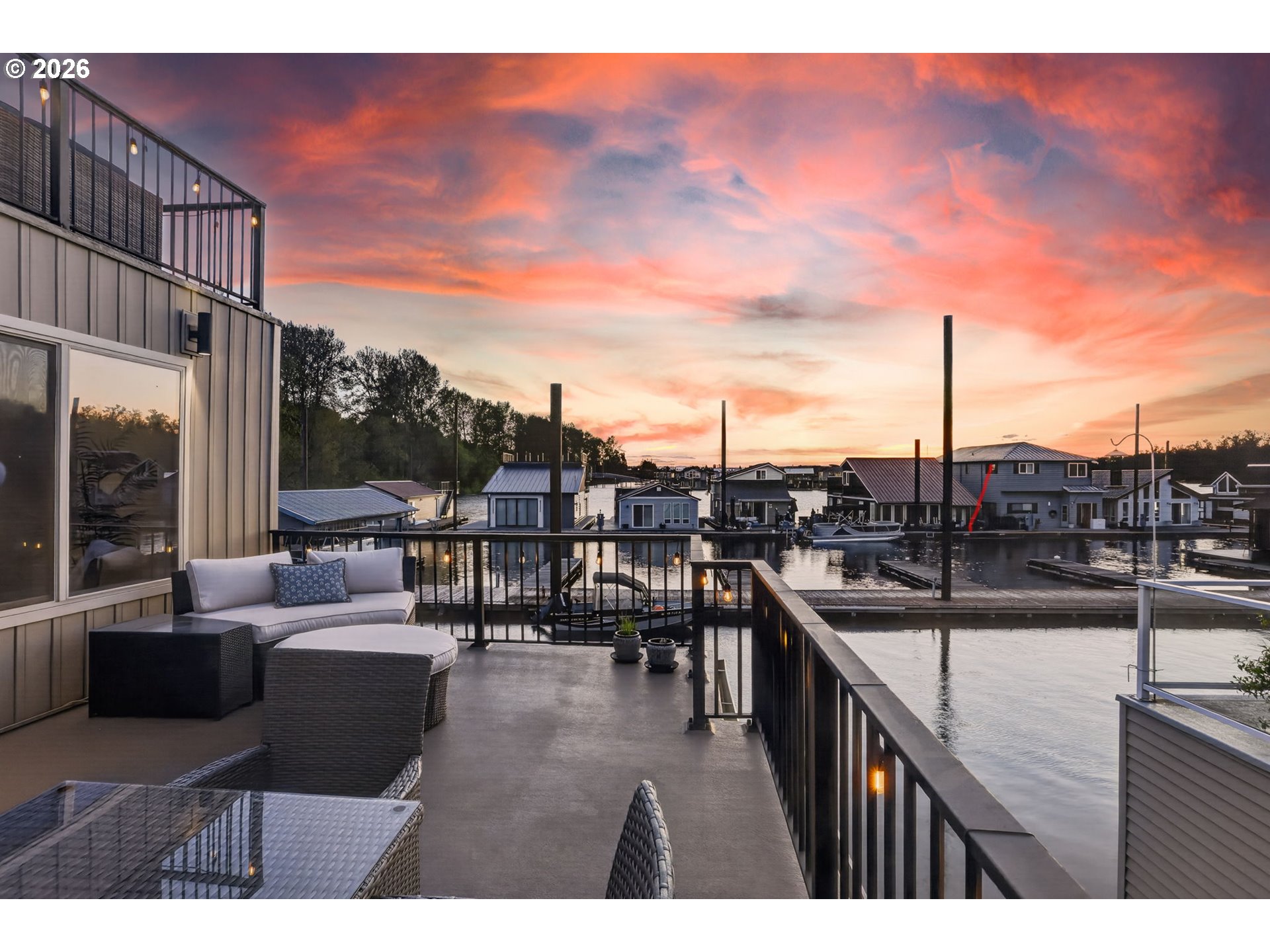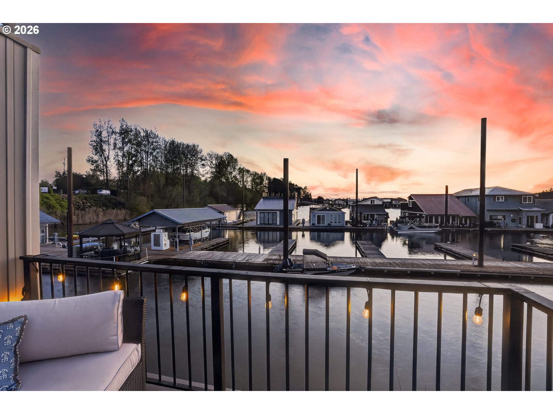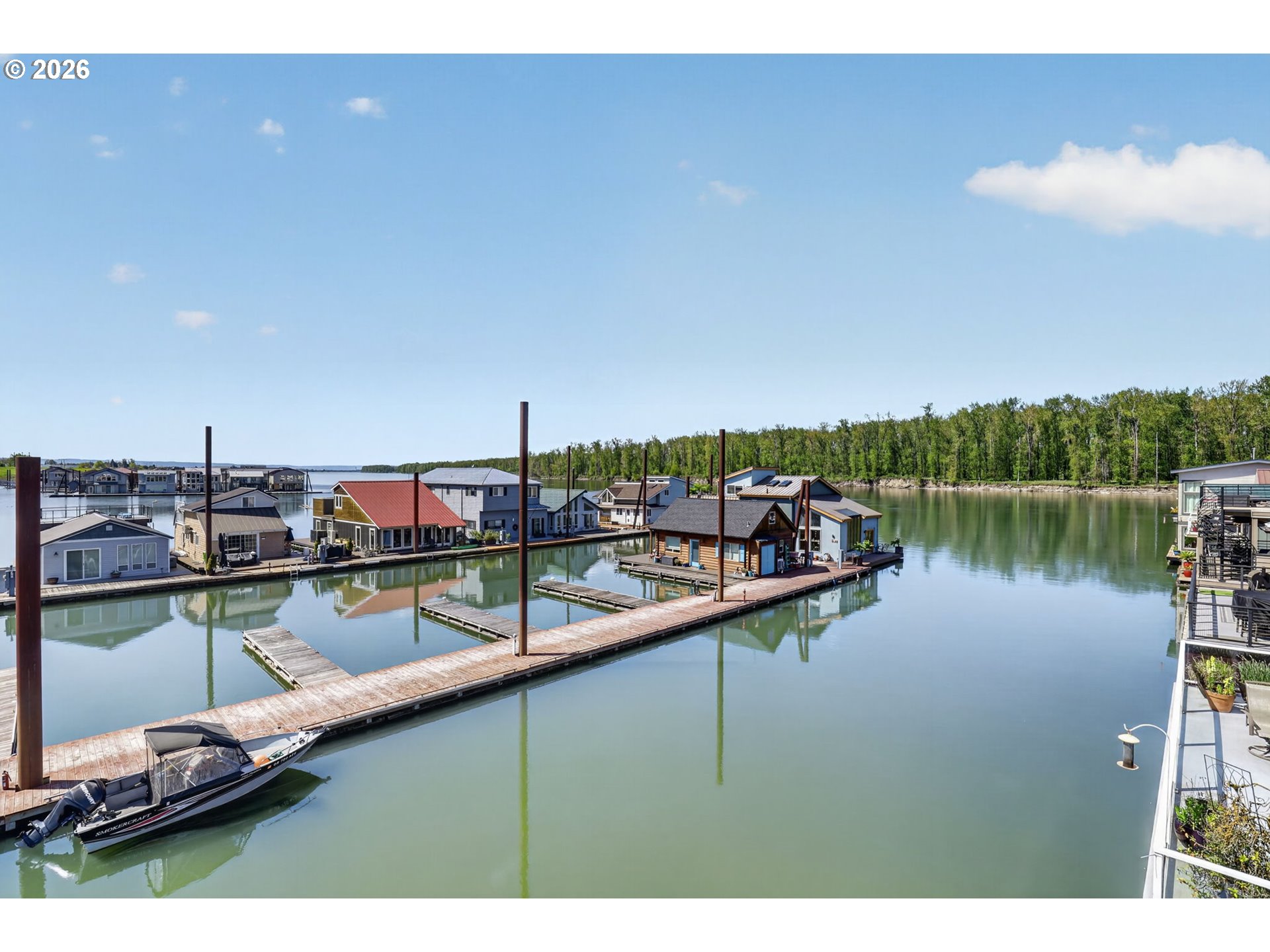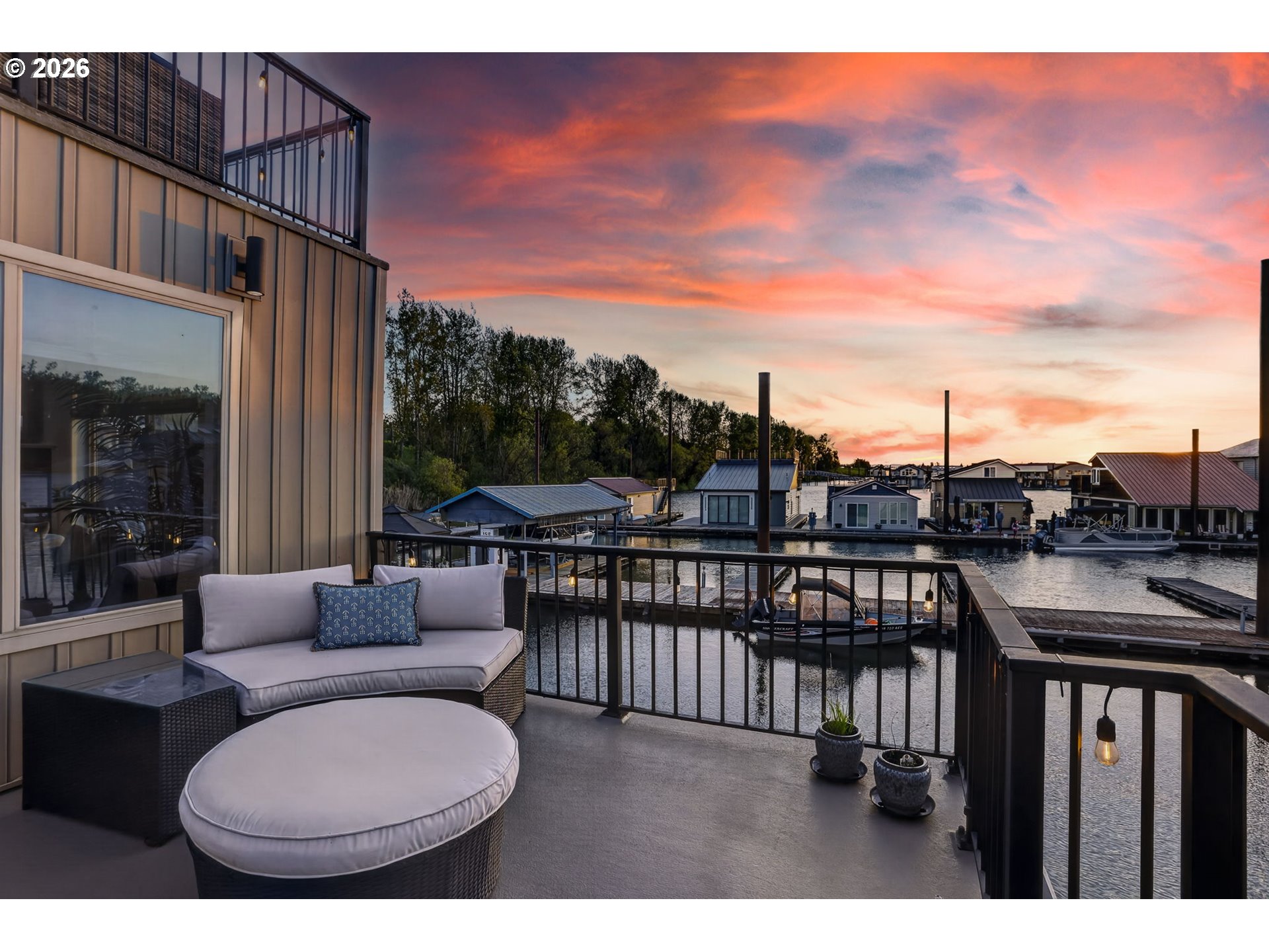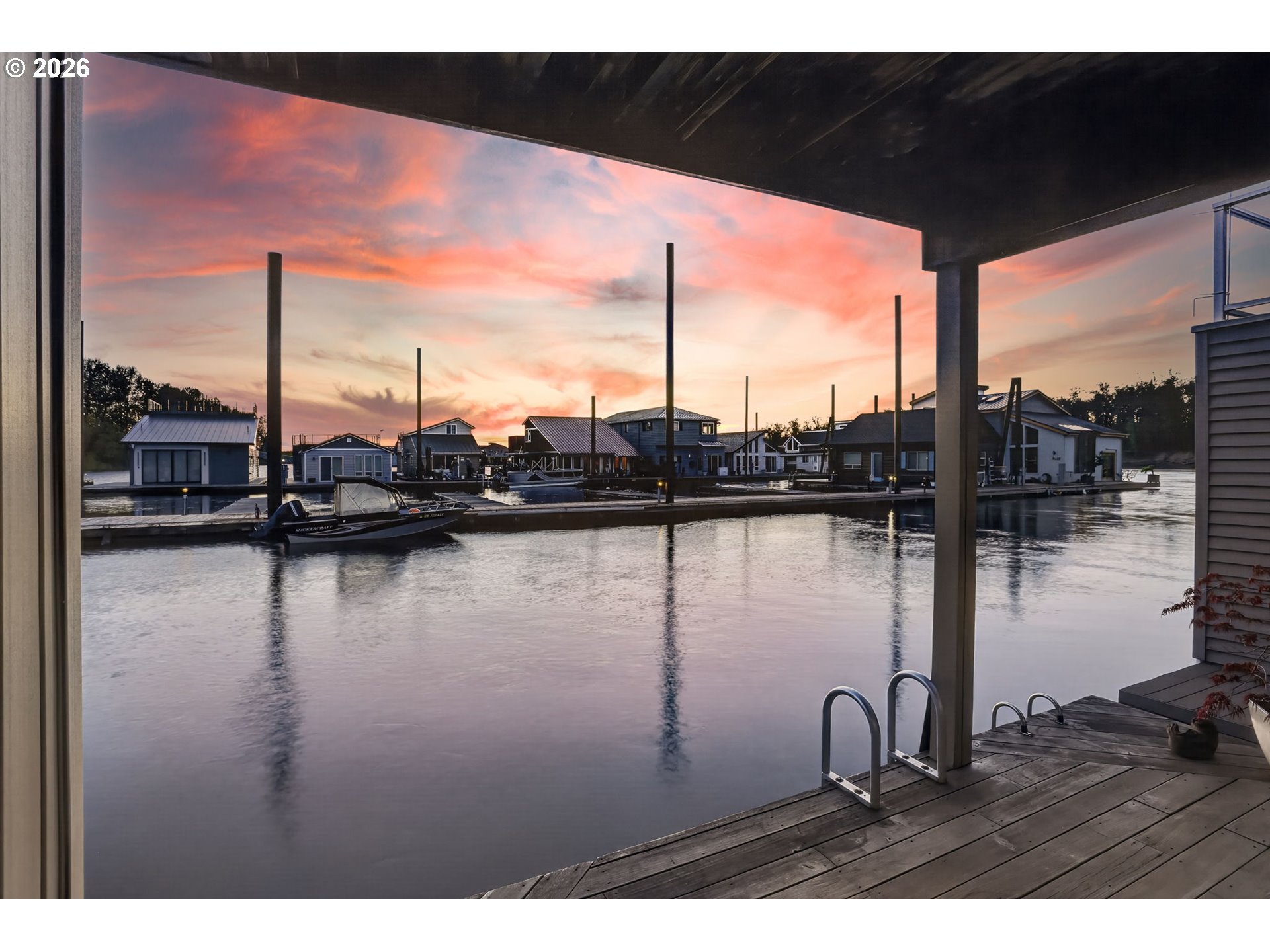 Breathtaking Columbia Ridge Moorage Retreat. Experience elevated waterfront living in this spacious, light-filled end-row home boasting Mt. Hood and Columbia River views. Perfectly positioned near the west edge of the gorge, this unique residence offers a front-row seat to the natural beauty of the Pacific Northwest. This home features a primary on the upper level with an attached ensuite offering a jetted-tub, walk in closet and dual sinks. Open floor plan from the kitchen to the great room with a gas fireplace, french doors to a back deck for entertaining and relaxing and beautiful views of the river. On the lower level you will find two additional bedrooms, a family hall bath, and family room with access to the back deck. Just a short boat ride to the mouth of the Sandy River, you’ll enjoy world-class salmon fishing and unforgettable scenery right at your doorstep. This floating home has it's own private boat well with a lift to house a 23ft boat. In addition there is a generous 12’ x 40’ space at the front of the home giving opportunity for a floating patio for entertaining or relaxing under the sunset, extra storage or park your water crafts. Expansive outdoor living spans three decks, each capturing some of the most striking views in the Portland area. Inside, natural light pours through every level, highlighting thoughtful design and spacious interiors offering new trim, new window coverings, new hardware, new mirrors, light fixtures. Climb the spiraling staircase to the third-story den/office offers an inspiring home office retreat — leading out to an oversized deck for taking in the panoramic river vista views and sunsets. Across Marine Dr there is the South parking lot which is gated and secure to park your RV/boat, storage, plus additional parking for guests or overflow, and enjoy the bike & walking paths. This home floats across from McGuire Island, and is 10-15 minutes from the PDX airport.