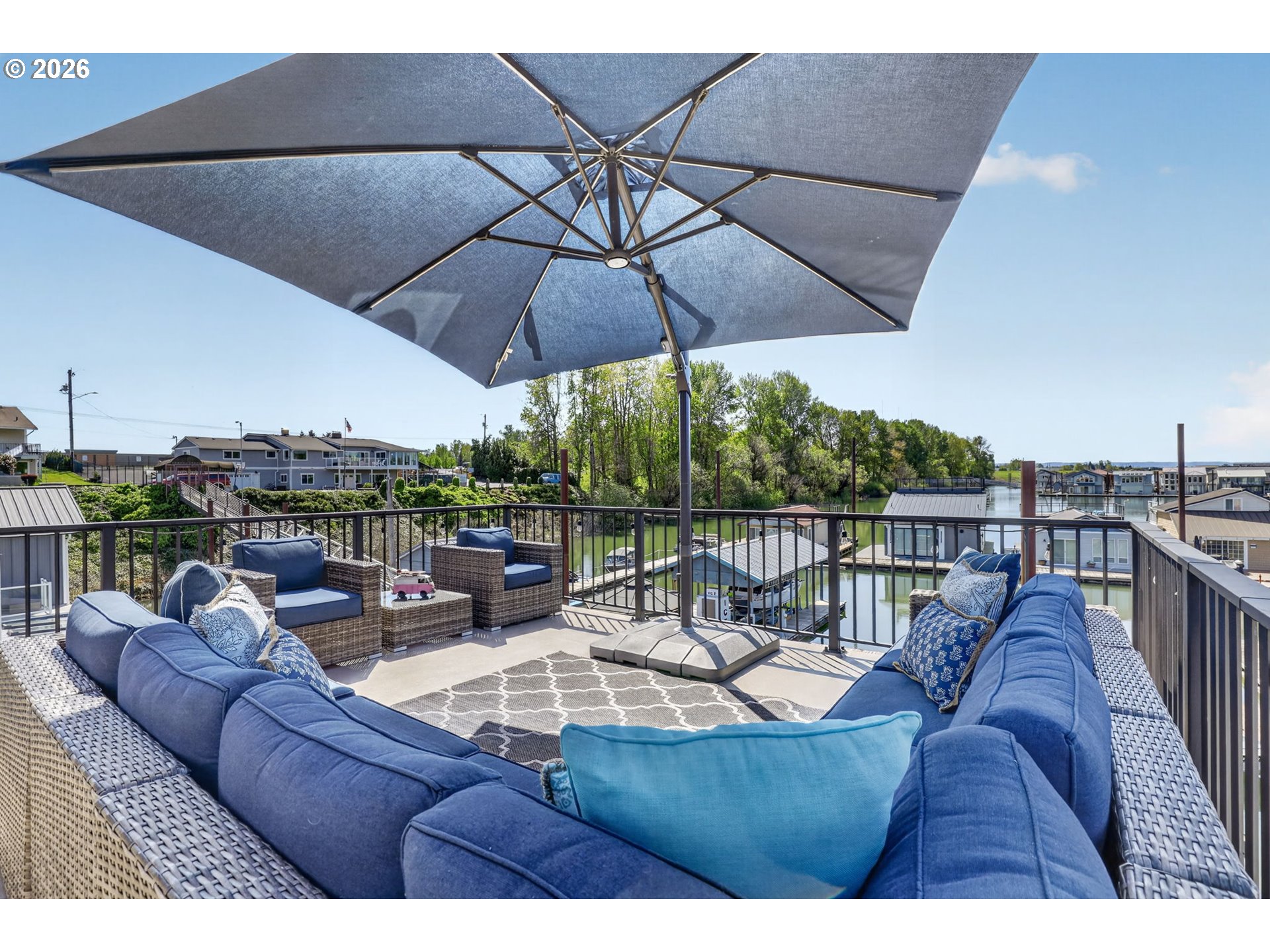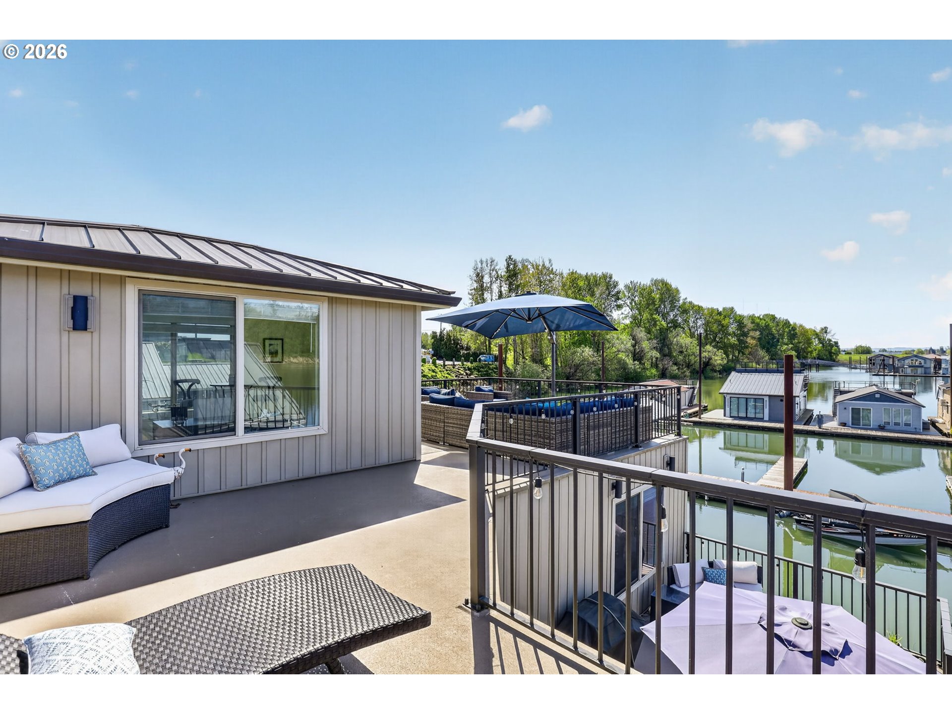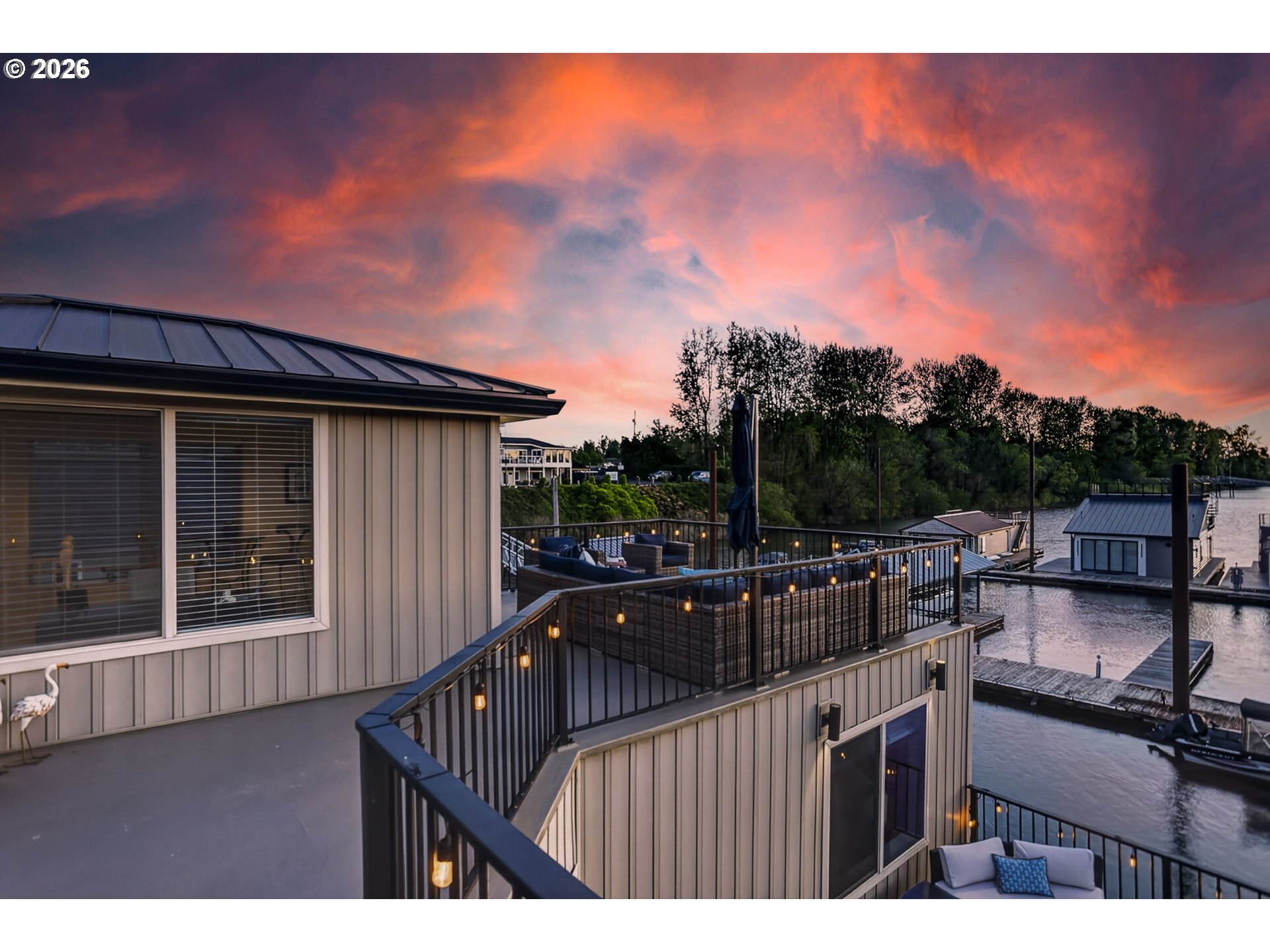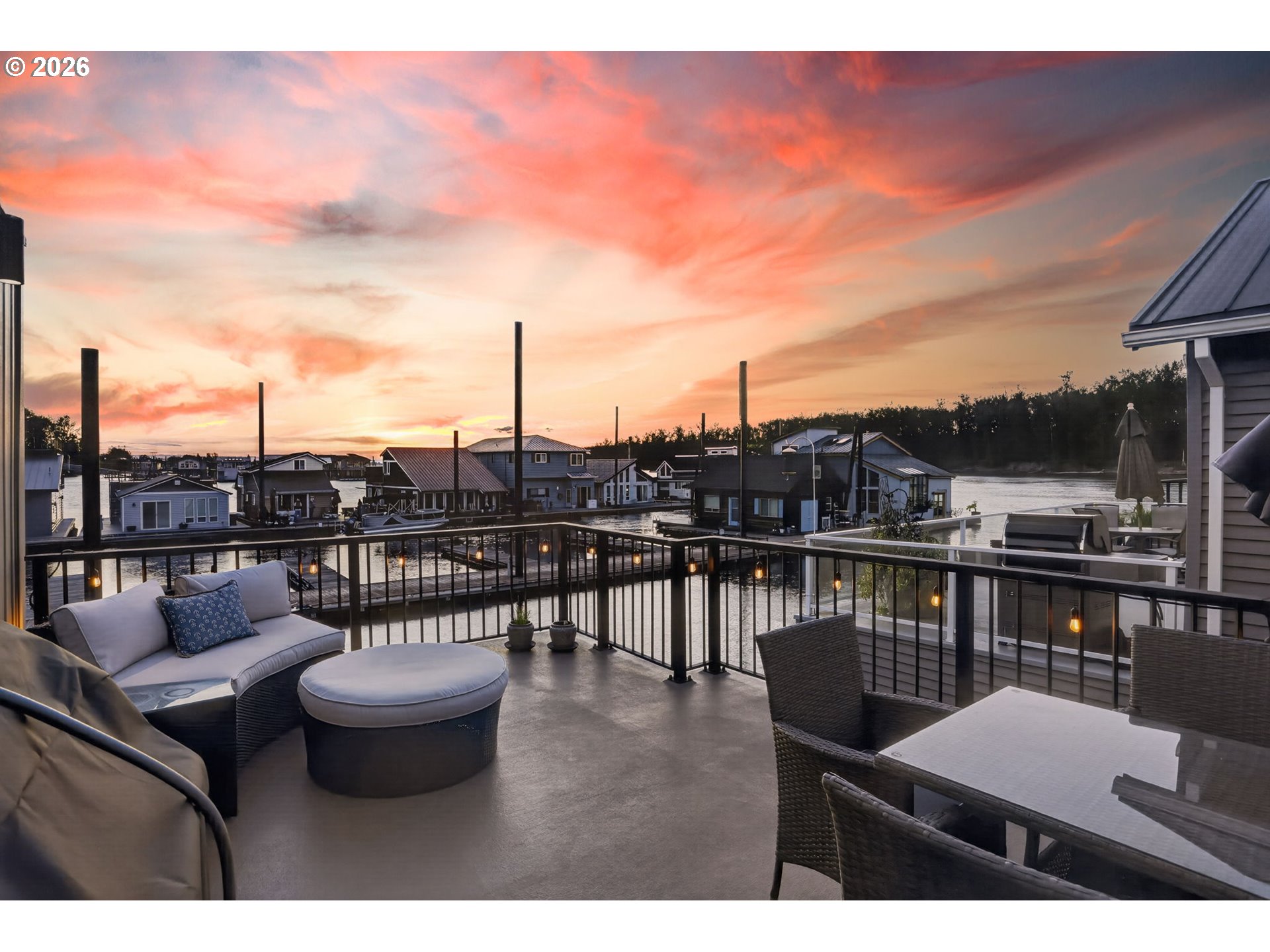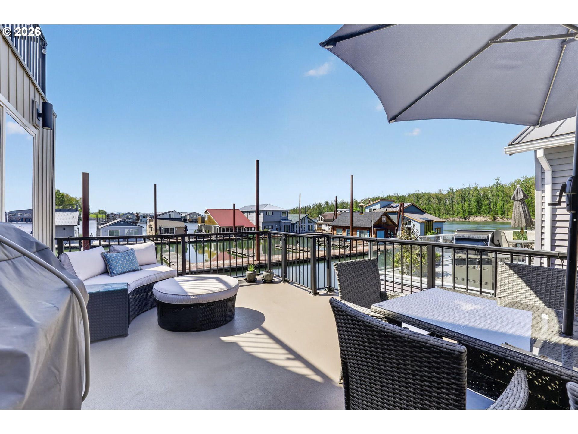 Breathtaking Columbia Ridge Moorage Retreat. Experience elevated waterfront living in this spacious, light-filled end-row home boasting Mt. Hood and Columbia River views. Perfectly positioned near the west edge of the gorge, this unique residence offers a front-row seat to the natural beauty of the Pacific Northwest. This home features a primary on the upper level with an attached ensuite offering a jetted-tub, walk in closet and dual sinks. Open floor plan from the kitchen to the great room with a gas fireplace, french doors to a back deck for entertaining and relaxing and beautiful views of the river. On the lower level you will find two additional bedrooms, a family hall bath, and family room with access to the back deck. Just a short boat ride to the mouth of the Sandy River, you’ll enjoy world-class salmon fishing and unforgettable scenery right at your doorstep. This floating home has it's own private boat well with a lift to house a 23ft boat. In addition there is a generous 12’ x 40’ space at the front of the home giving opportunity for a floating patio for entertaining or relaxing under the sunset, extra storage or park your water crafts. Expansive outdoor living spans three decks, each capturing some of the most striking views in the Portland area. Inside, natural light pours through every level, highlighting thoughtful design and spacious interiors offering new trim, new window coverings, new hardware, new mirrors, light fixtures. Climb the spiraling staircase to the third-story den/office offers an inspiring home office retreat — leading out to an oversized deck for taking in the panoramic river vista views and sunsets. Across Marine Dr there is the South parking lot which is gated and secure to park your RV/boat, storage, plus additional parking for guests or overflow, and enjoy the bike & walking paths. This home floats across from McGuire Island, and is 10-15 minutes from the PDX airport.