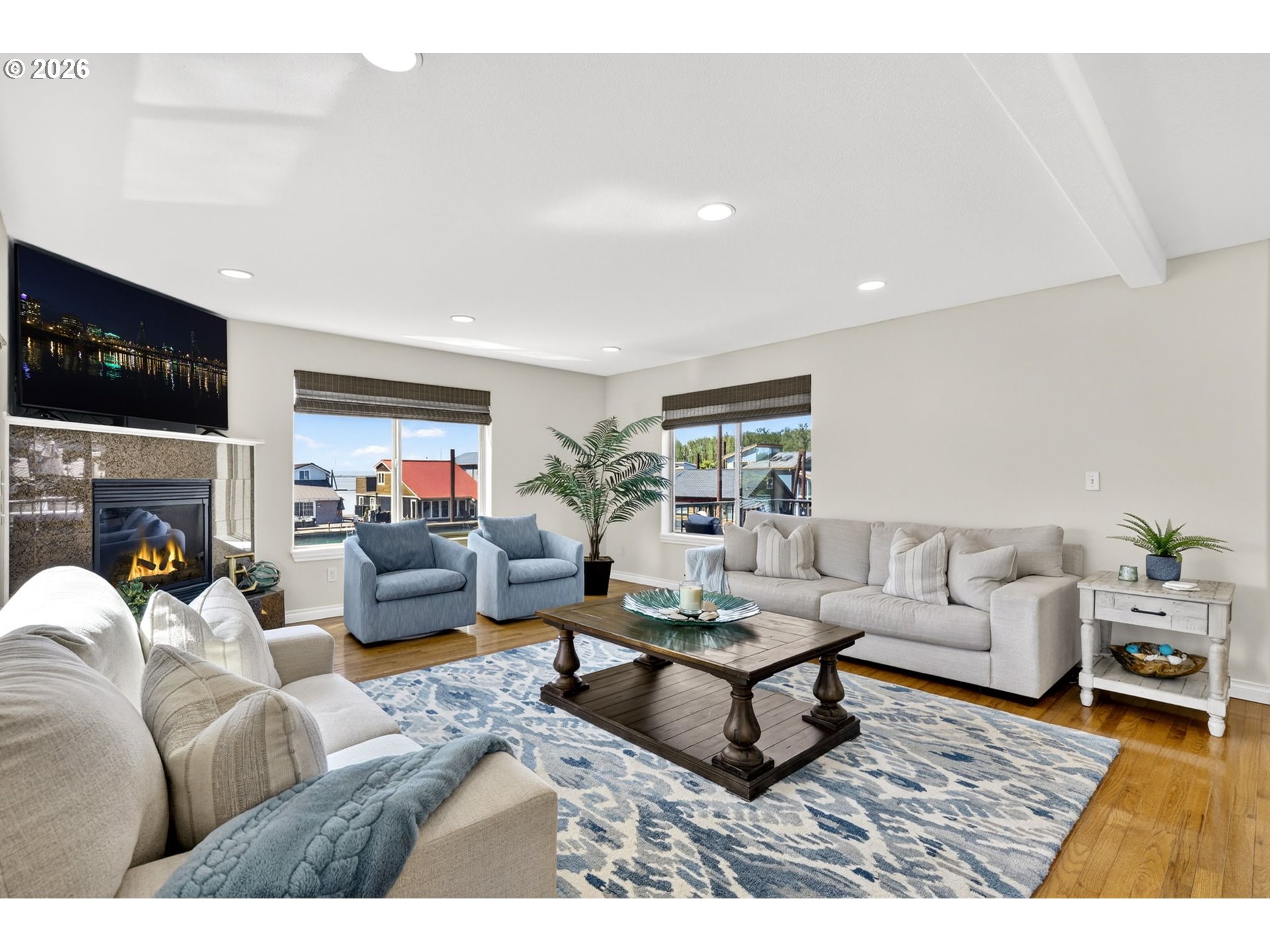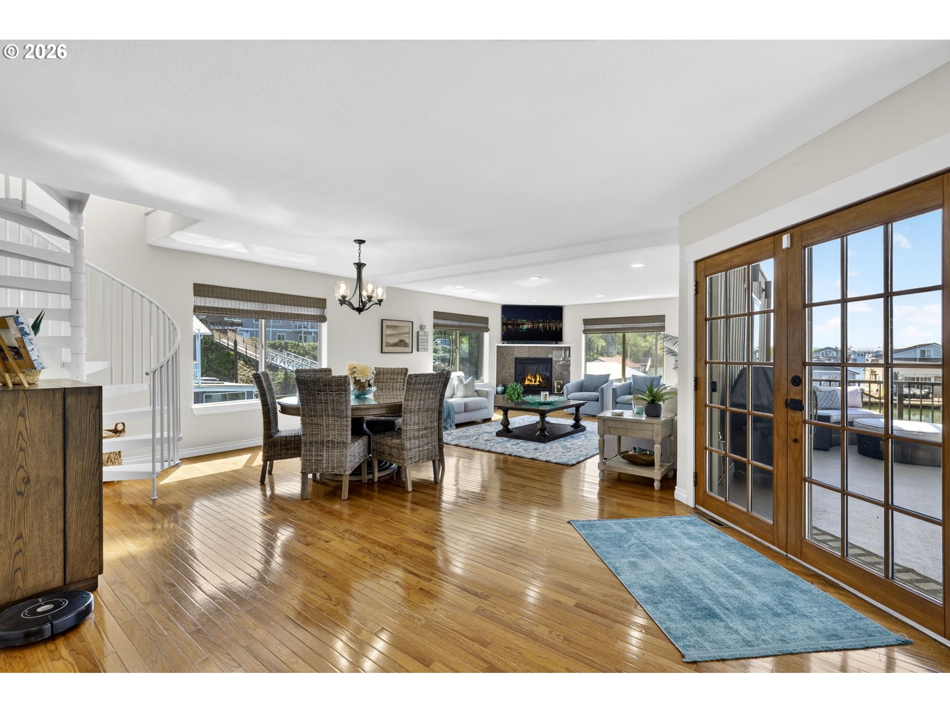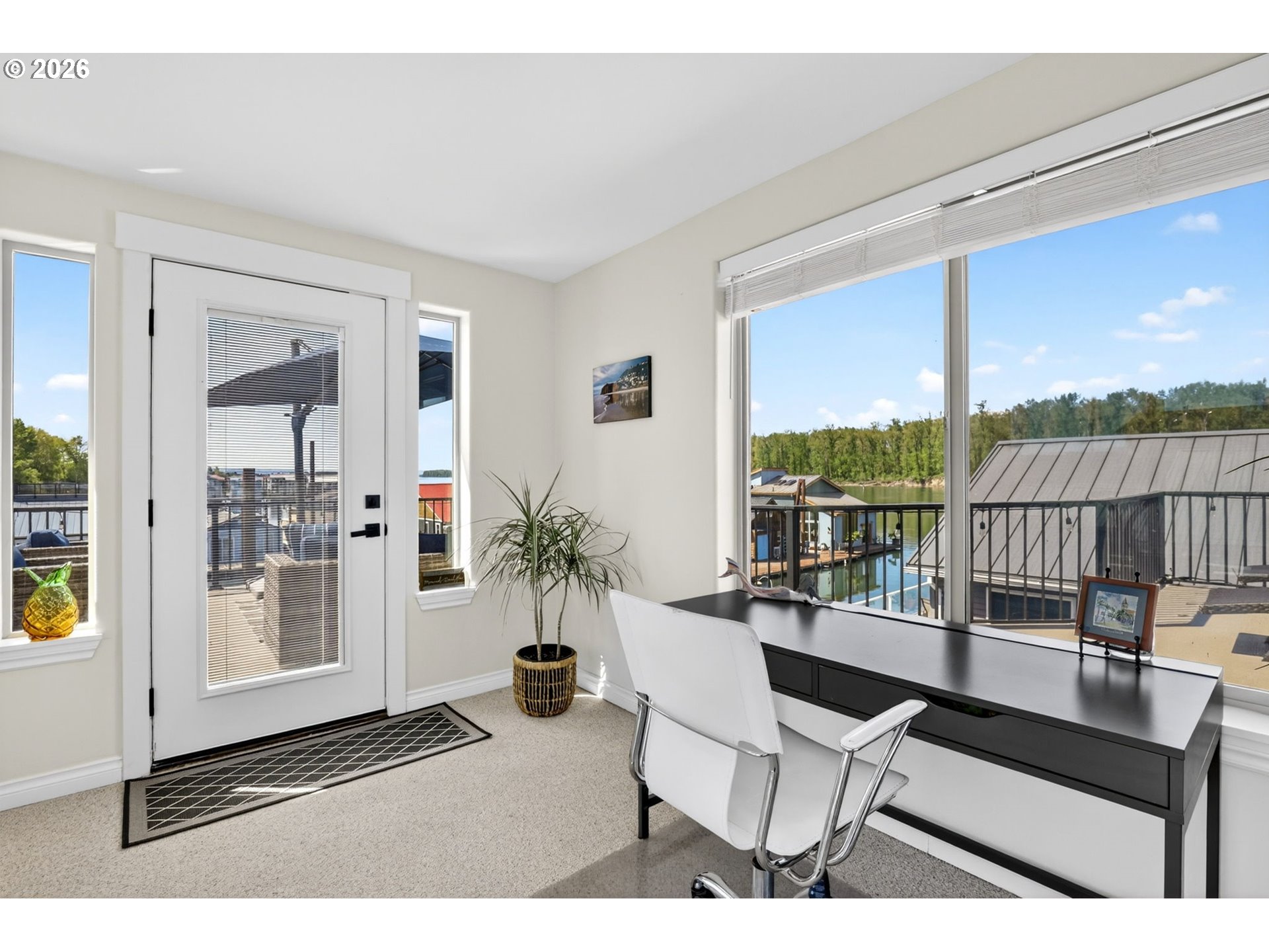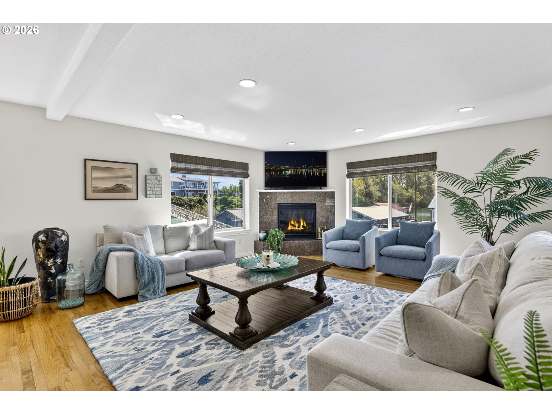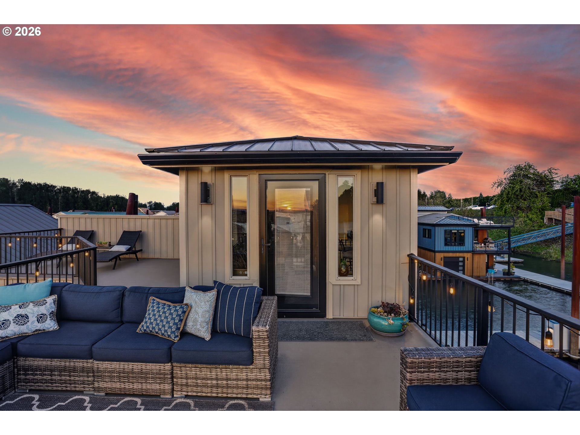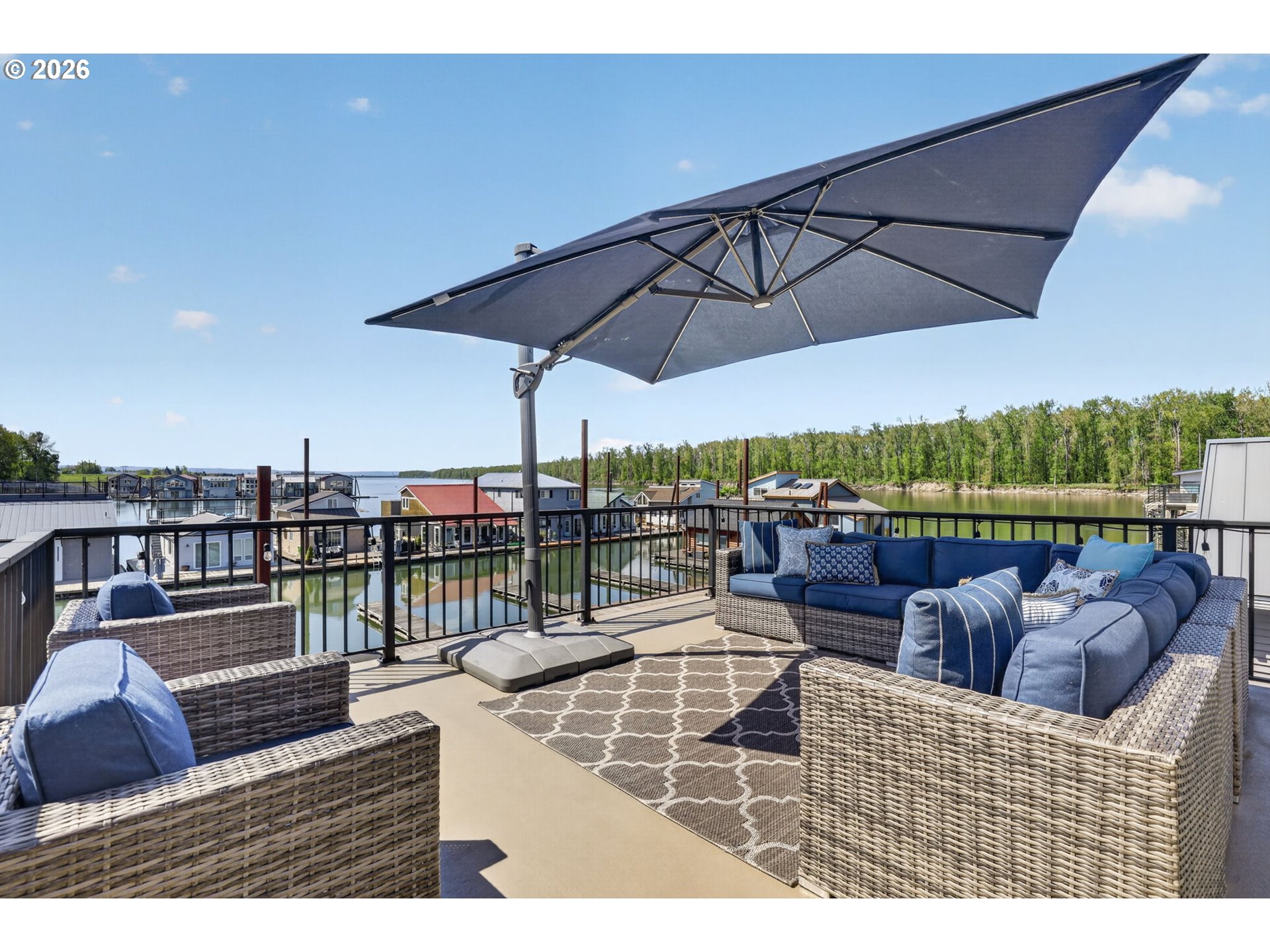 Breathtaking Columbia Ridge Moorage Retreat. Experience elevated waterfront living in this spacious, light-filled end-row home boasting Mt. Hood and Columbia River views. Perfectly positioned near the west edge of the gorge, this unique residence offers a front-row seat to the natural beauty of the Pacific Northwest. This home features a primary on the upper level with an attached ensuite offering a jetted-tub, walk in closet and dual sinks. Open floor plan from the kitchen to the great room with a gas fireplace, french doors to a back deck for entertaining and relaxing and beautiful views of the river. On the lower level you will find two additional bedrooms, a family hall bath, and family room with access to the back deck. Just a short boat ride to the mouth of the Sandy River, you’ll enjoy world-class salmon fishing and unforgettable scenery right at your doorstep. This floating home has it's own private boat well with a lift to house a 23ft boat. In addition there is a generous 12’ x 40’ space at the front of the home giving opportunity for a floating patio for entertaining or relaxing under the sunset, extra storage or park your water crafts. Expansive outdoor living spans three decks, each capturing some of the most striking views in the Portland area. Inside, natural light pours through every level, highlighting thoughtful design and spacious interiors offering new trim, new window coverings, new hardware, new mirrors, light fixtures. Climb the spiraling staircase to the third-story den/office offers an inspiring home office retreat — leading out to an oversized deck for taking in the panoramic river vista views and sunsets. Across Marine Dr there is the South parking lot which is gated and secure to park your RV/boat, storage, plus additional parking for guests or overflow, and enjoy the bike & walking paths. This home floats across from McGuire Island, and is 10-15 minutes from the PDX airport.
