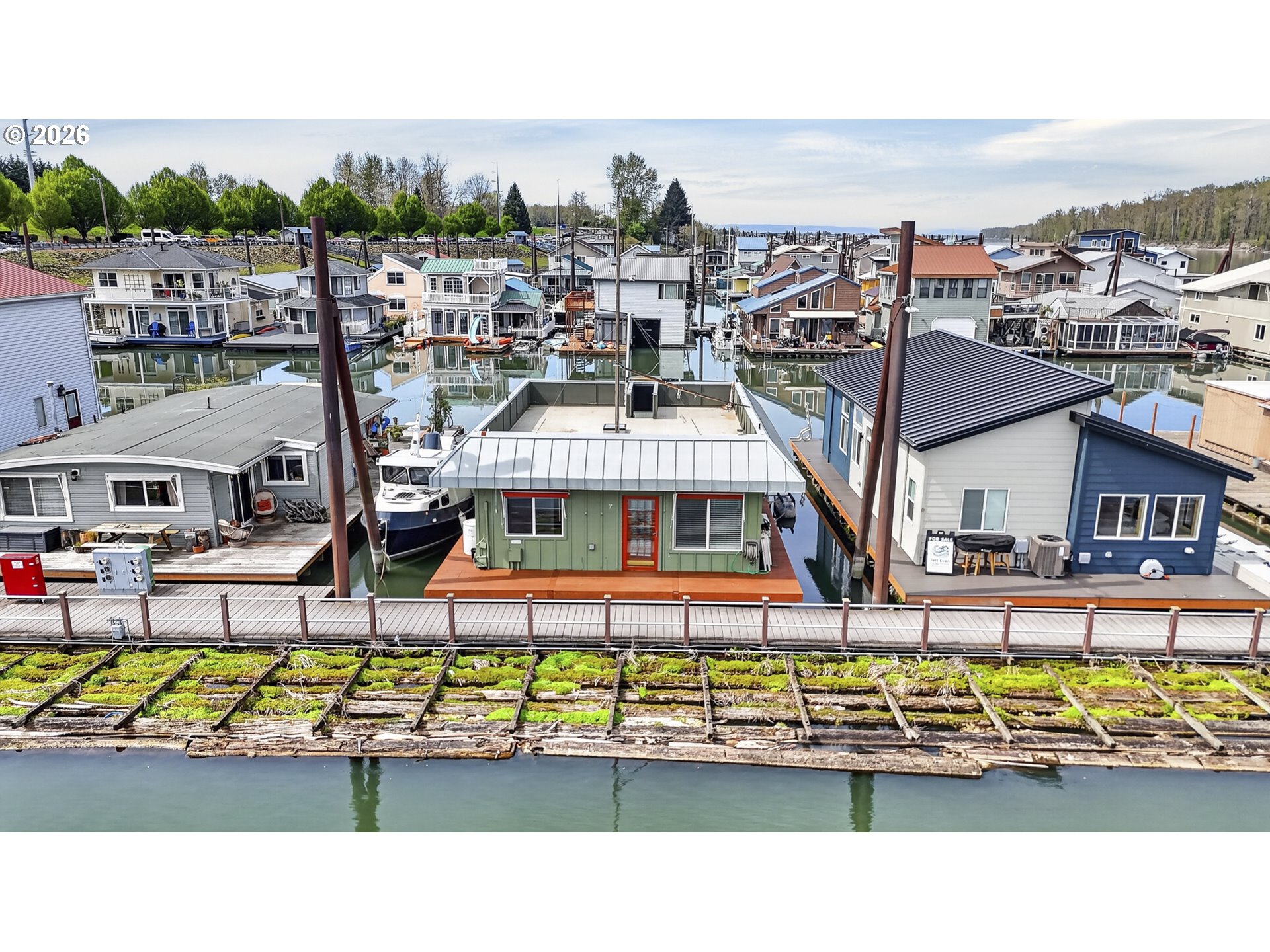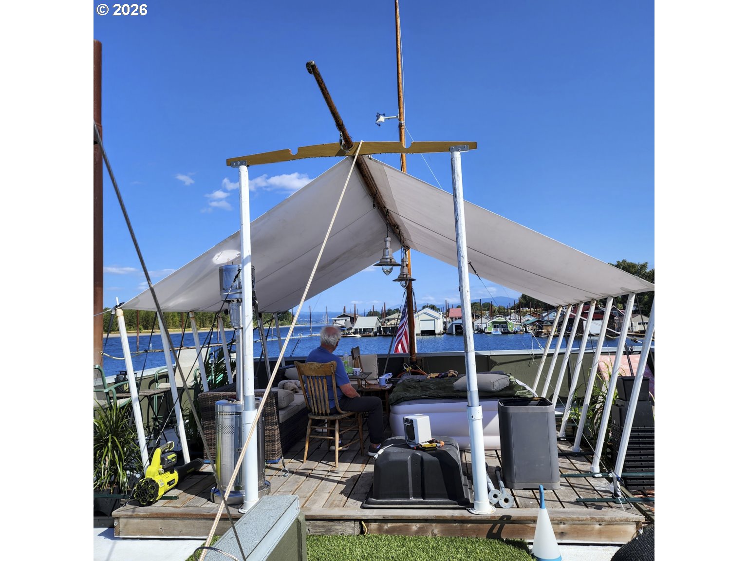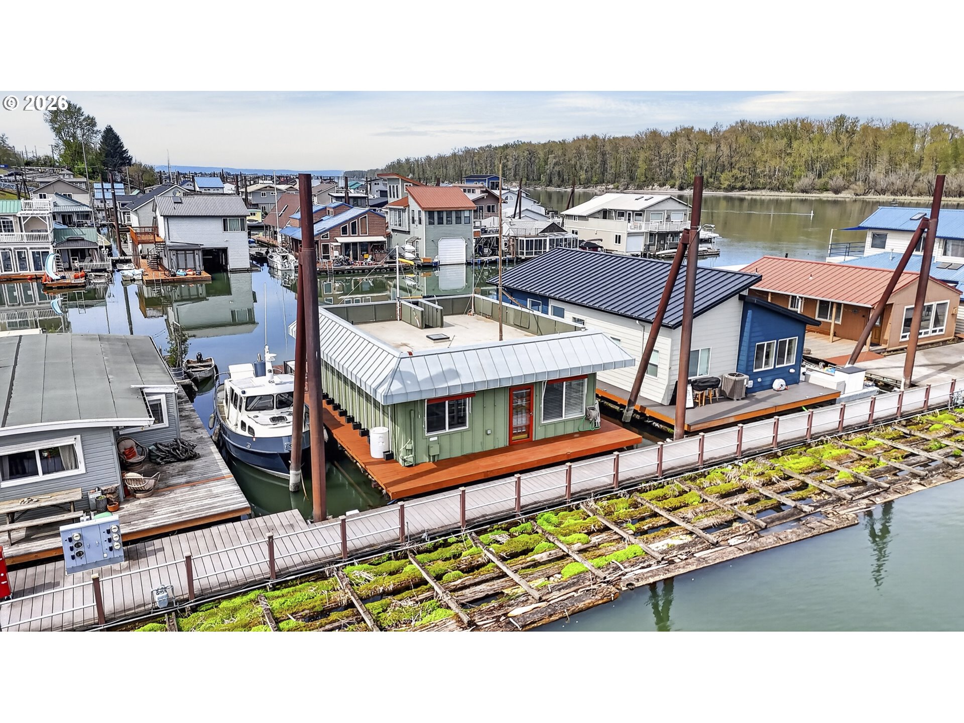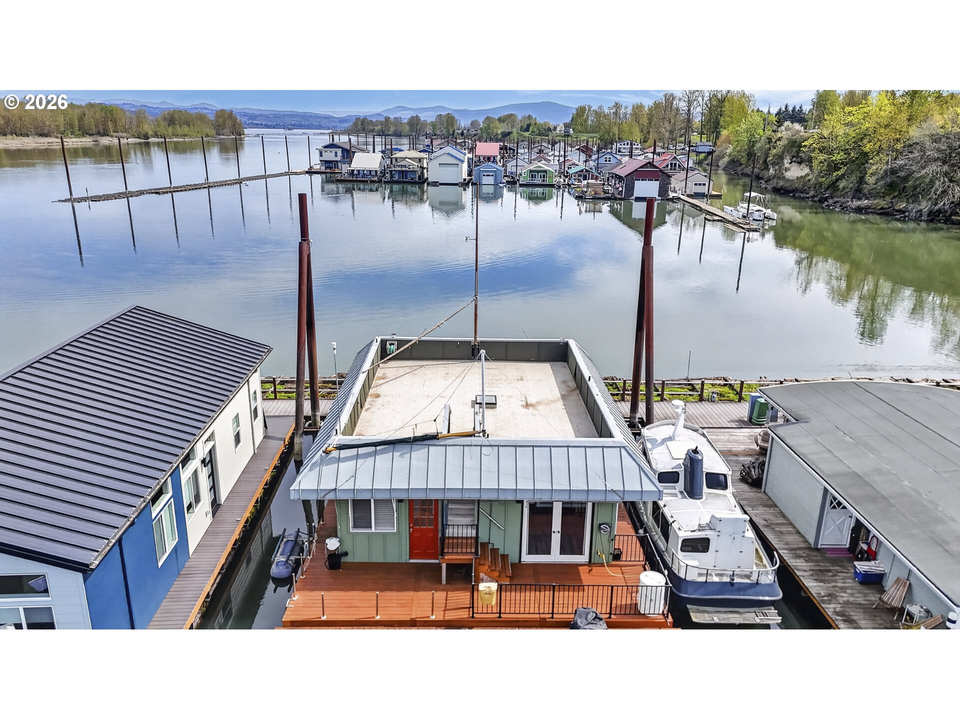 Rare A row view slip with unobstructed sunrise views to the East! Take in 360 degree river, island, & territorial views from the incredible roof top deck with new membrane roof in 2025' with transferrable warranty! This cozy custom style home lives large for its size with 2 full bathrooms and 2 bedrooms (2nd bedroom non-conforming / no closet), a well-appointed kitchen, and loads of outdoor space which is what river living is all about! The updated kitchen comes with a complete appliance package, granite countertops, and an eating bar with room for a small dinette. Downsizing, condo alternative, or simply looking to get on the river at an affordable price? How about in an ownership moorage with one-of-a-kind views and turn-key living? This may be the home you've been waiting for! Cash only due to float condition, perfectly livable as-is for years to come or complete float repairs for ability to refinance and solid for decades. Over $45k in recent upgrades to include: New membrane roof, newer deck boards, newer swim float, interior upgrades. A true highlight of this home is the ample outdoor space including a roof top deck with 360 degree river, island, & sunrise views to the East! Unique nautical themed mast & Boom set up on the roof deck for sheltered summertime sleeping quarters... a heavenly spot to lay one's head to rest & awake to the sunrise & the sounds of area wildlife. Loads of value here in a premium slip location & owned slip, room to park your boat and watercraft with no added moorage fees, & loads of outdoor space! All for under $280k with low taxes at $1105yr & your river lifestyle aspirations can be achieved!
