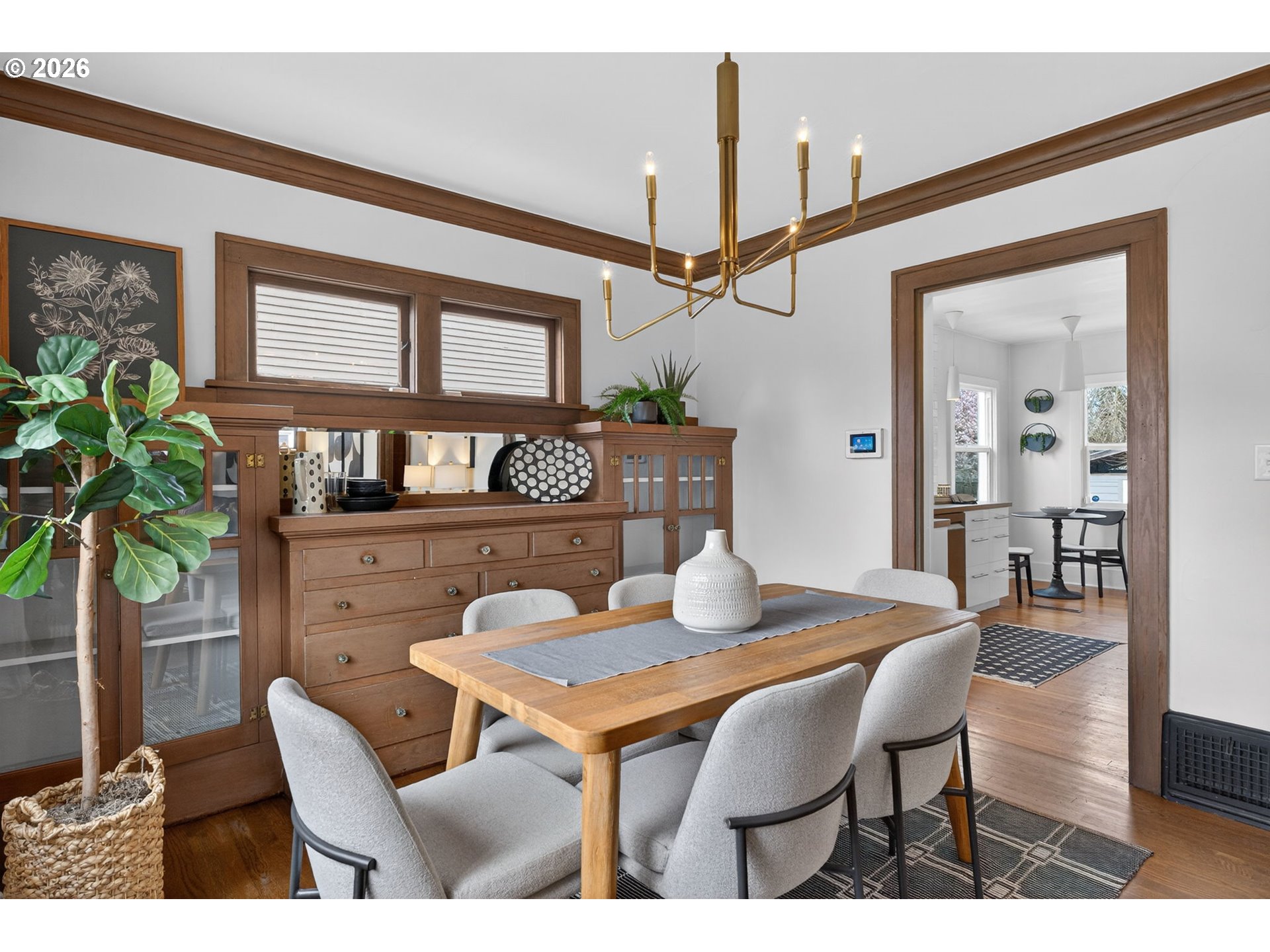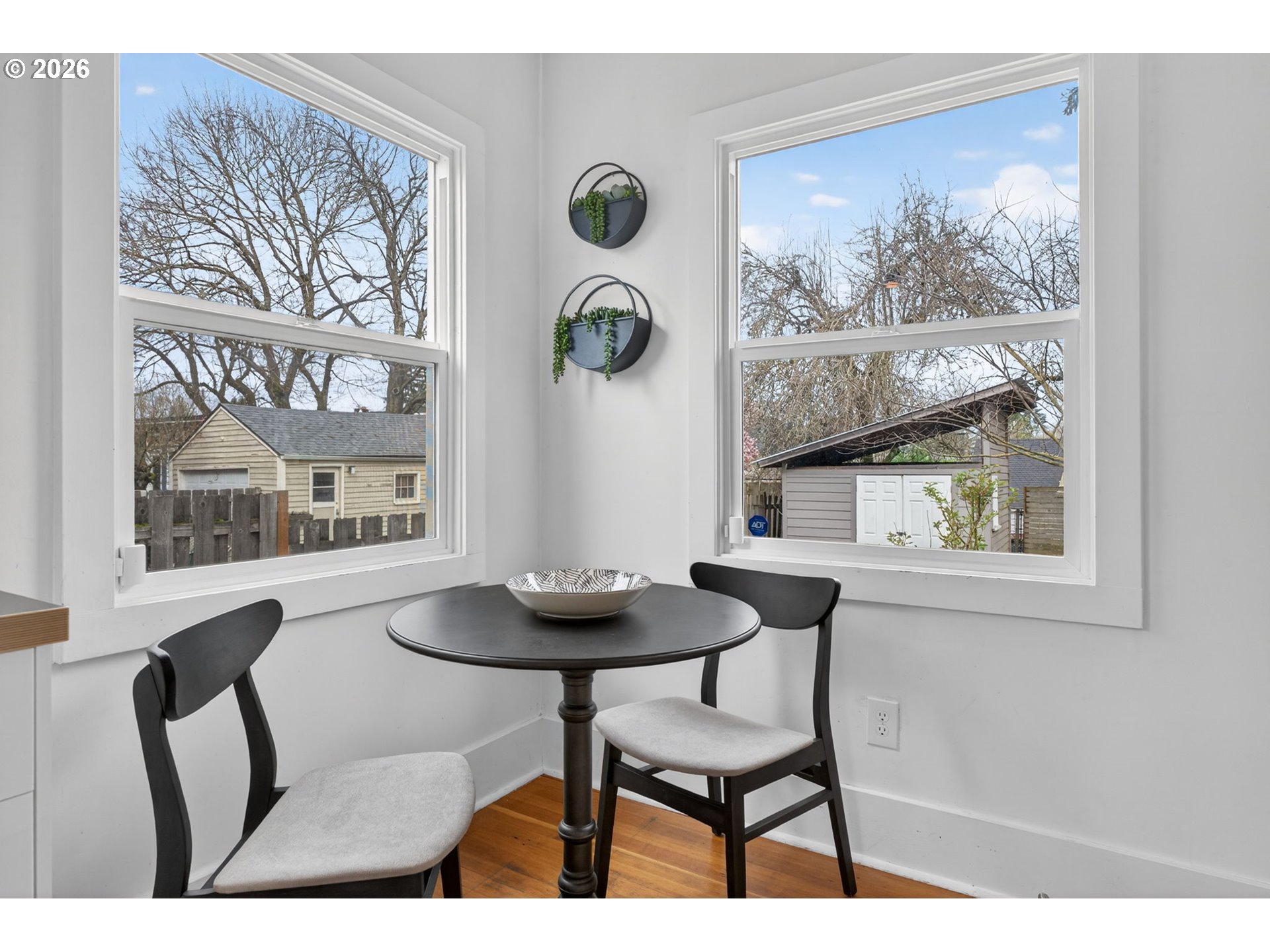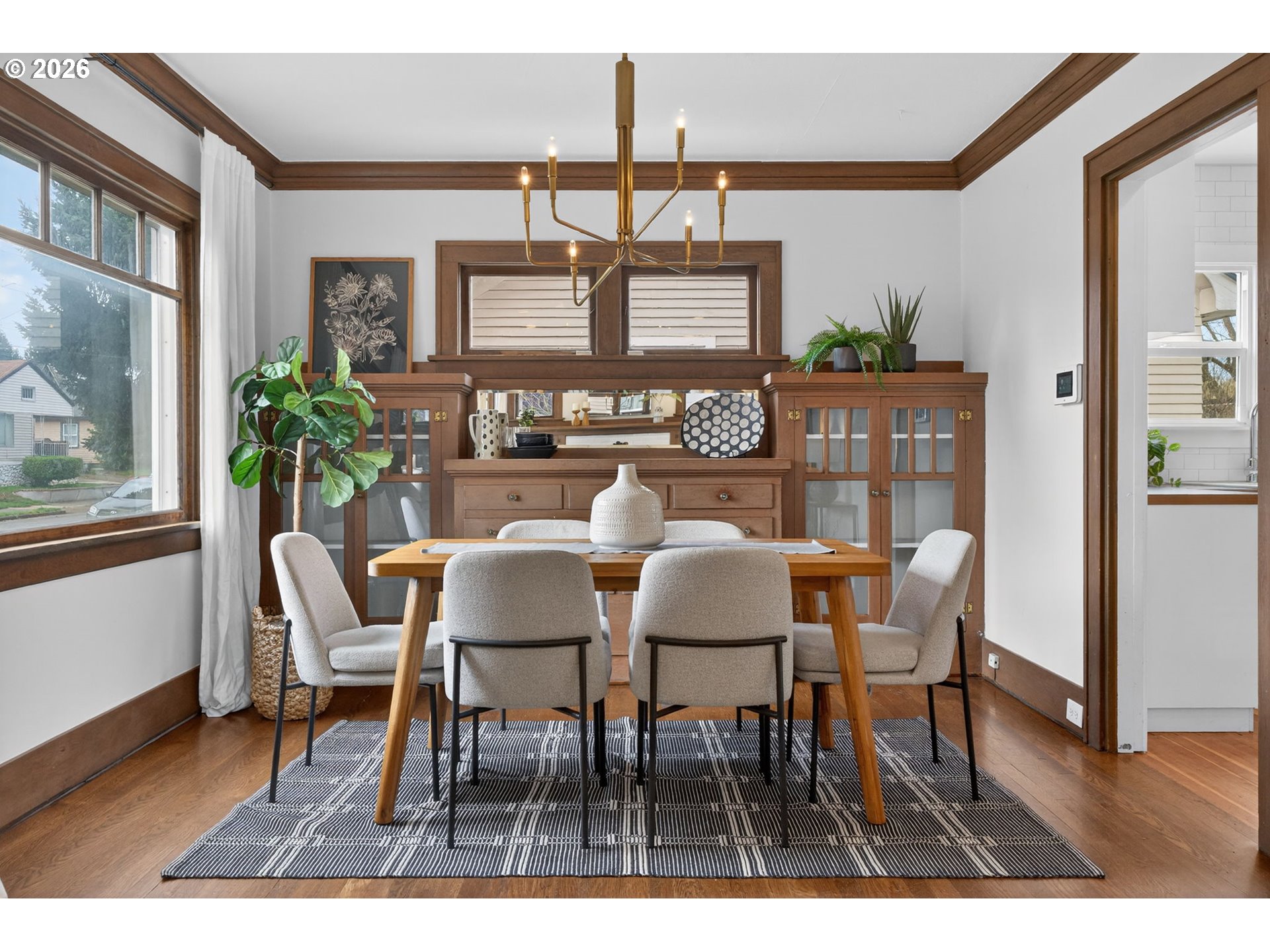 A charming Woodlawn bungalow in an unbeatable location, just moments from some of Portland’s best restaurants and parks. Filled with natural light, this home beautifully blends modern conveniences with the timeless character of its original 1920s woodwork. Step in from the charming front porch to a warm and inviting living and dining space, complete with rich, dark wood built-ins and a statement light fixture from Crate & Barrel. Large windows bring in great light, creating an easy, comfortable flow throughout the main living areas. The kitchen offers a clean, spacious layout with ample cabinetry and an additional eat-in area—ideal for casual mornings & a cup of Joe. The remodeled bathroom on the main floor features a large walk-in shower with a polished, designer-inspired feel. All three bedrooms are well-sized and offer a flexible layout, making it easy to use the space in whatever way best fits your needs. Downstairs, the basement provides excellent ceiling height, a spacious laundry room & storage area. Outside, the expansive backyard offers room to entertain, garden, or play, making it a true extension of the home’s living space. Enjoy nearby favorites like Bless Your Heart Burger, Tough Luck, Campana, La Verne’s, No Saint, Orange & Blossom, Podnah’s, and Wilder Bar, or take a stroll to Woodlawn and Alberta Park just moments away. [Home Energy Score = 6. HES Report at https://rpt.greenbuildingregistry.com/hes/OR10188722]