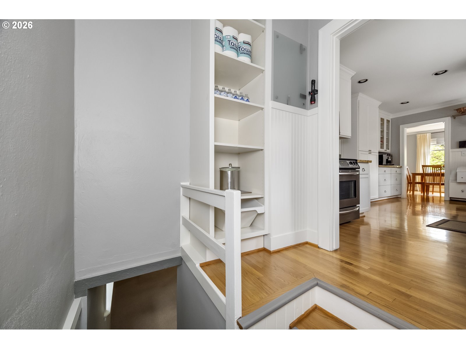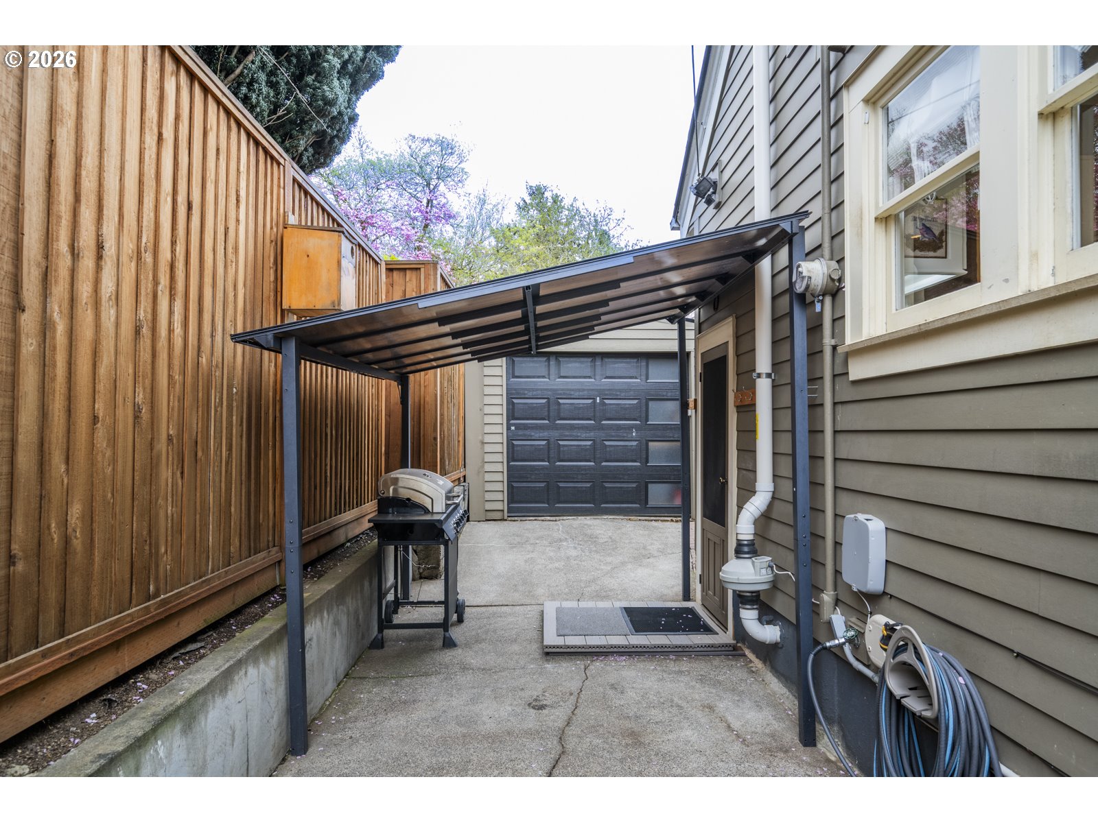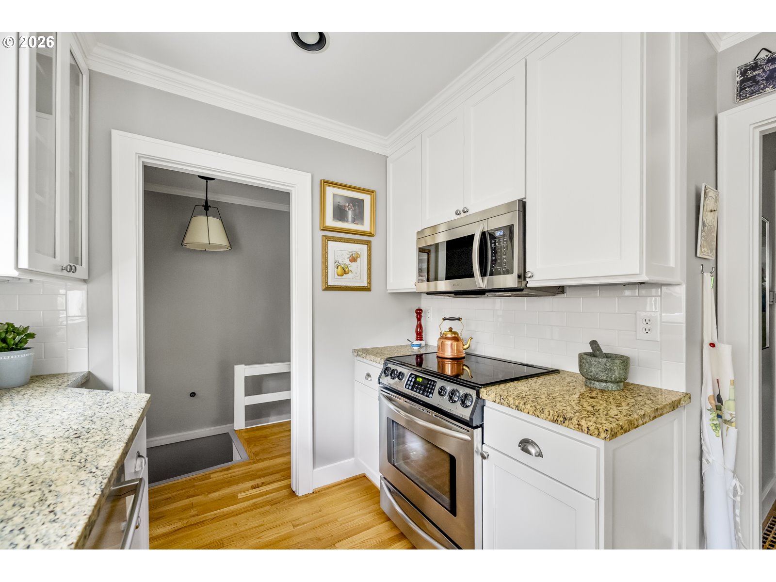 Meticulously maintained and lovingly updated Grant Park English tudor with all the sweetness. Sitting high up off the street this home offers a cozy and private feeling, with beautiful views of the terraced front garden and neighboring cherry tree from the living room. The primary bedroom on the main floor features a walk-in closet, and french doors onto the deck in the low maintenance backyard. The updated kitchen comes complete with granite countertops, stainless steel appliances, so much cabinet storage, and a seating area for morning coffee, or catching up with friends while you're cooking. Upstairs features two more bedrooms with a half bath, and the finished basement boasts a family room with egress window, an office or non-conforming bedroom, and a full bathroom and laundry room. Fresh upgrades since 2022 include a new roof, earthquake retrofitting, refinished hardwood floors, brick patio, bathroom tile floors, main water line, and gas log fireplace. Not long before that this sweetie got all new siding, windows, sewer line, radon system, electrical panel, and garden shed. Whew! The list is long. All of this packaged perfectly within a half mile of Grant Park, New Seasons and Fred Meyer. [Home Energy Score = 4. HES Report at https://rpt.greenbuildingregistry.com/hes/OR10204372]