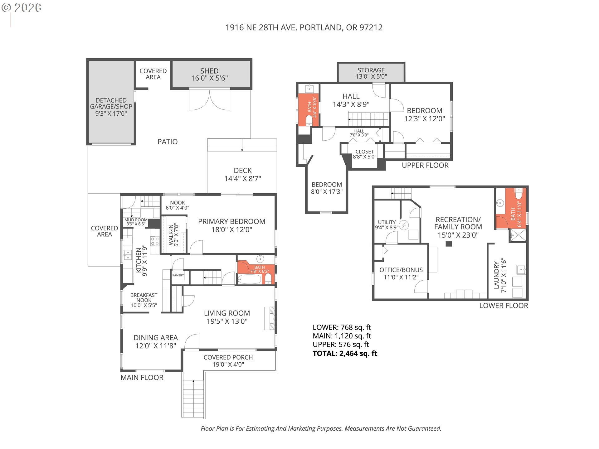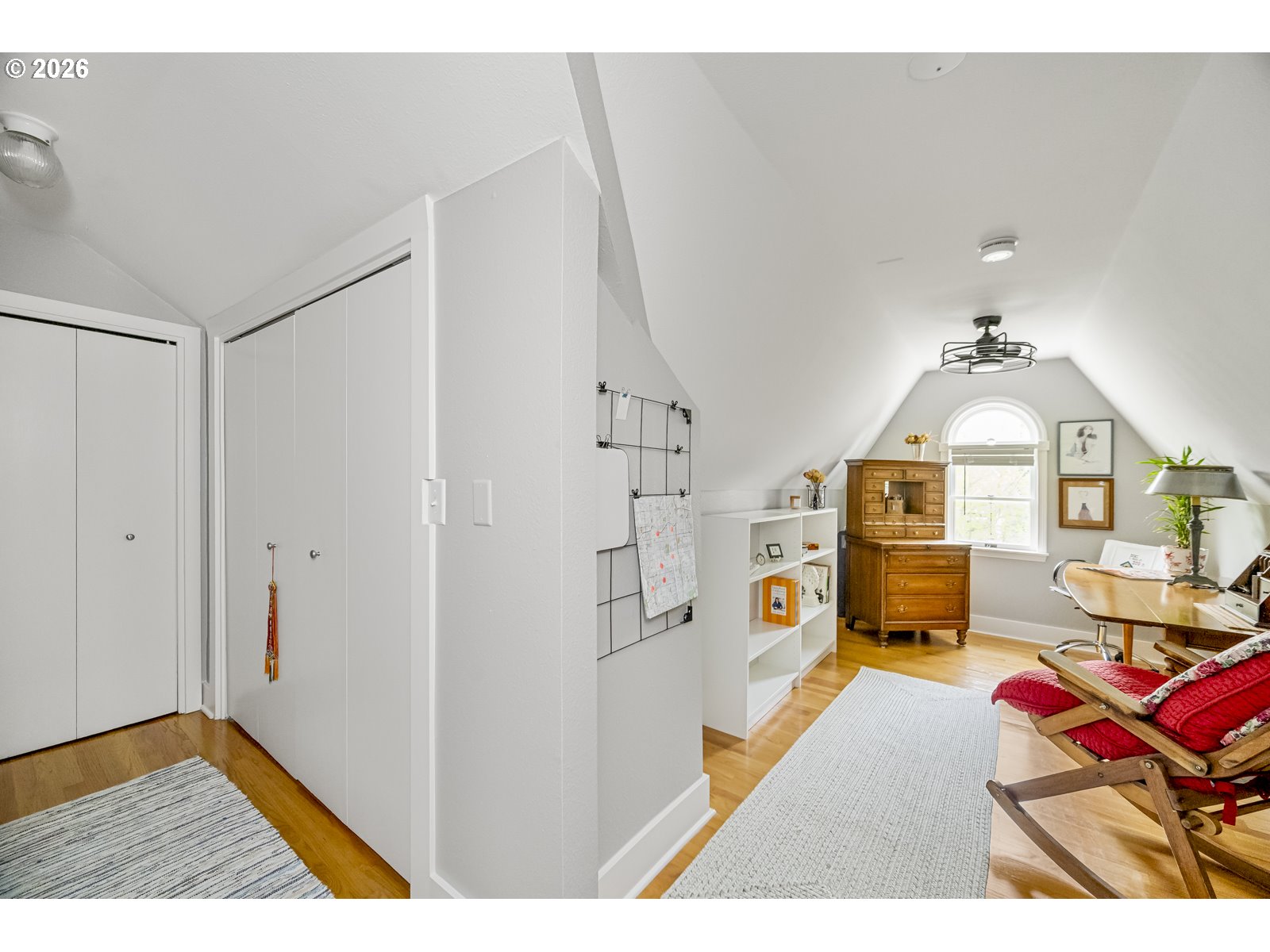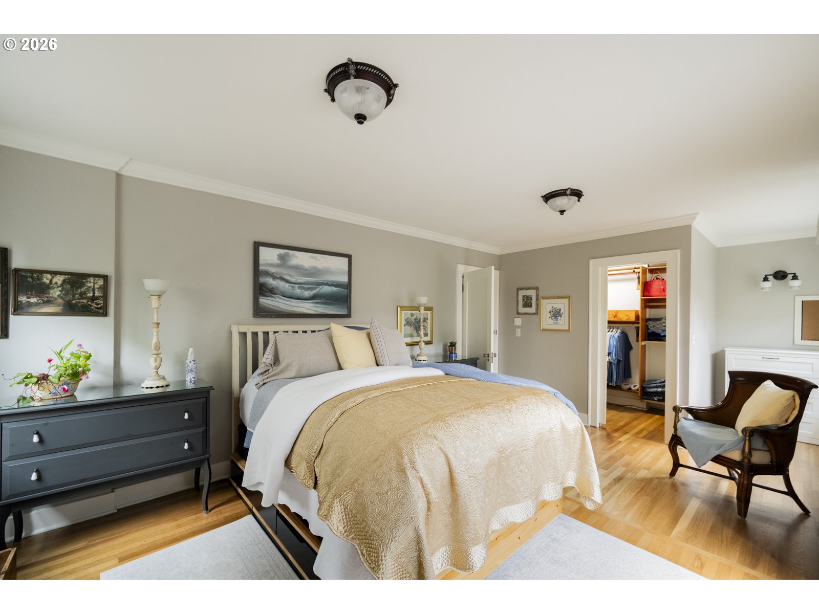 Meticulously maintained and lovingly updated Grant Park English tudor with all the sweetness. Sitting high up off the street this home offers a cozy and private feeling, with beautiful views of the terraced front garden and neighboring cherry tree from the living room. The primary bedroom on the main floor features a walk-in closet, and french doors onto the deck in the low maintenance backyard. The updated kitchen comes complete with granite countertops, stainless steel appliances, so much cabinet storage, and a seating area for morning coffee, or catching up with friends while you're cooking. Upstairs features two more bedrooms with a half bath, and the finished basement boasts a family room with egress window, an office or non-conforming bedroom, and a full bathroom and laundry room. Fresh upgrades since 2022 include a new roof, earthquake retrofitting, refinished hardwood floors, brick patio, bathroom tile floors, main water line, and gas log fireplace. Not long before that this sweetie got all new siding, windows, sewer line, radon system, electrical panel, and garden shed. Whew! The list is long. All of this packaged perfectly within a half mile of Grant Park, New Seasons and Fred Meyer. [Home Energy Score = 4. HES Report at https://rpt.greenbuildingregistry.com/hes/OR10204372]
