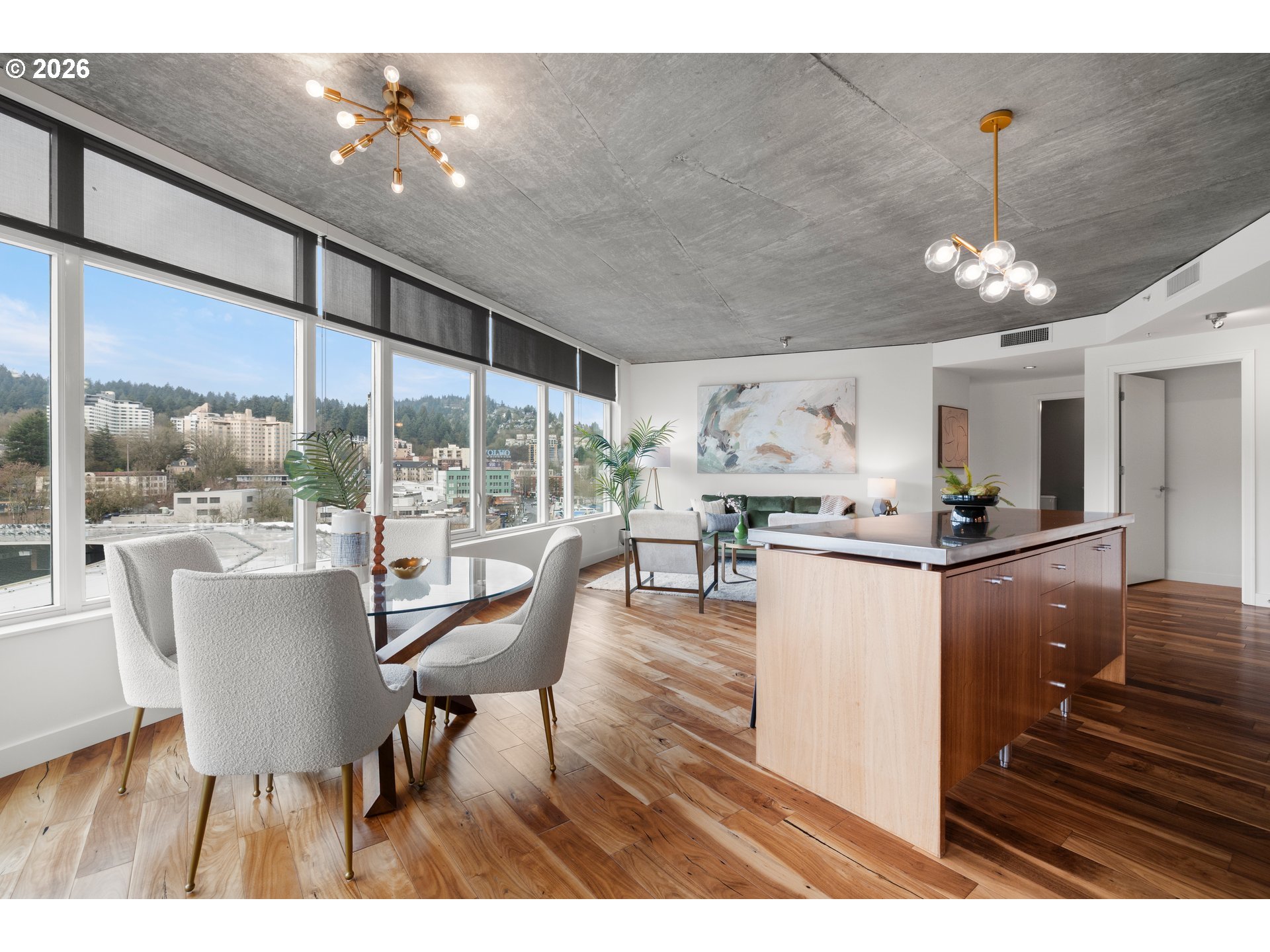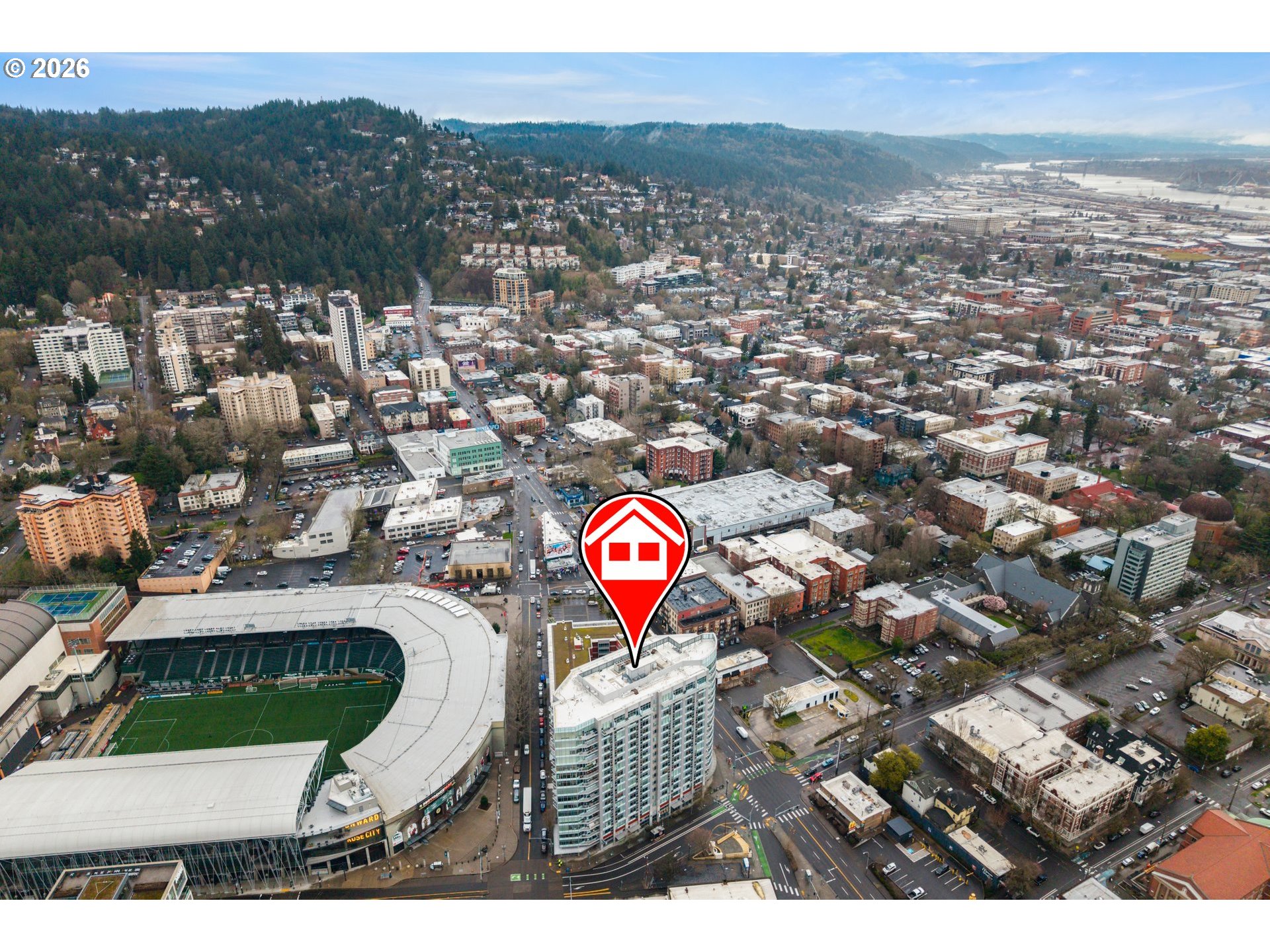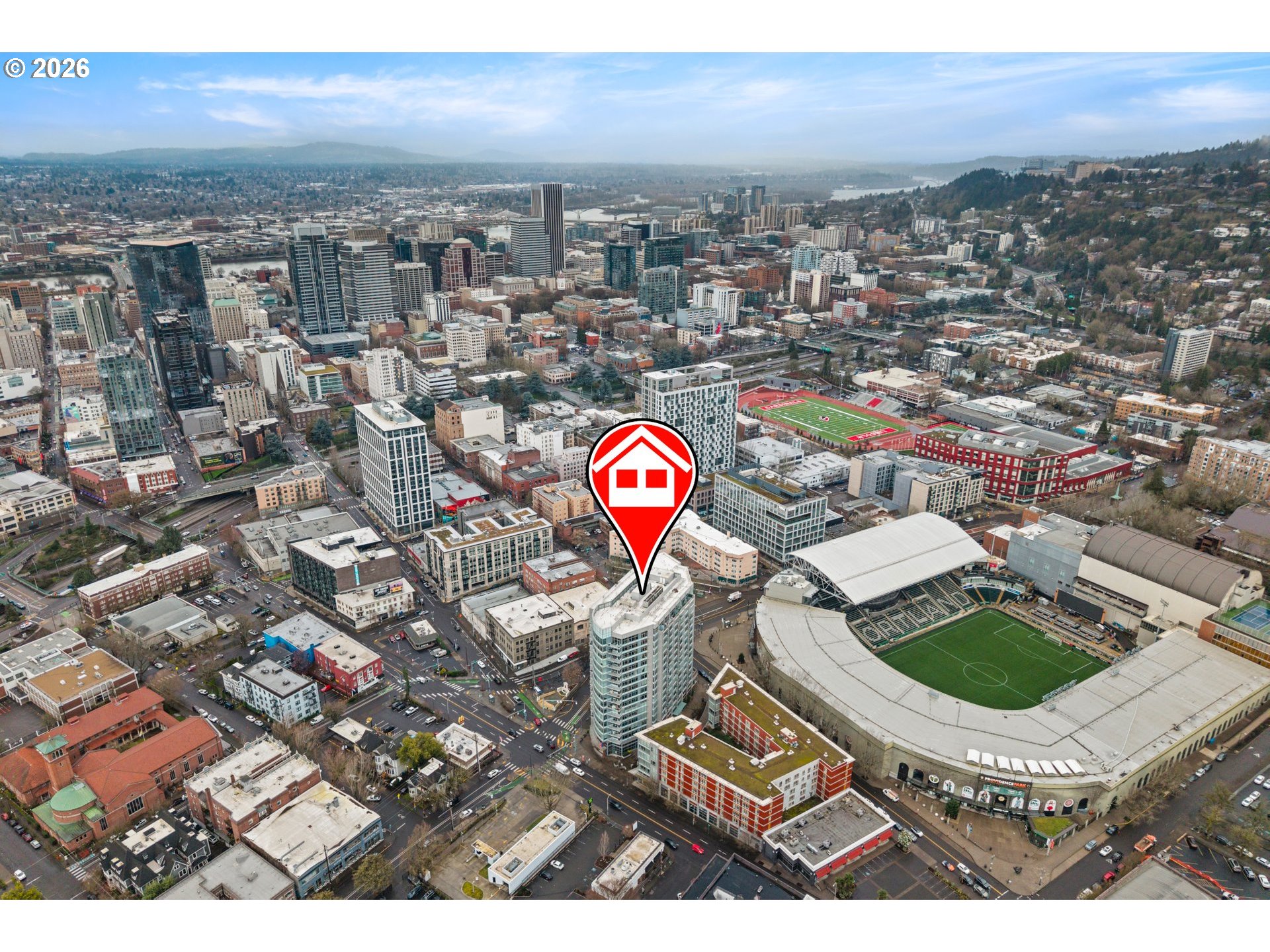 Stunning views from the 10th floor overlooking PGE Park, the city & the West Hills! Unique & desirable corner unit with walls of windows, tons of natural light, private balcony & views from every room. Upgraded hardwood floors throughout, open great room floorplan with island kitchen, eat-bar, nook & large living room, 2 spacious bedrooms & bonus storage closet area of entry. Stackable washer/dryer & linen closet. 2 assigned parking spots, assigned storage unit. Secure entry plus on site concierge. All appliances included. Move in ready, so hip & so cool!