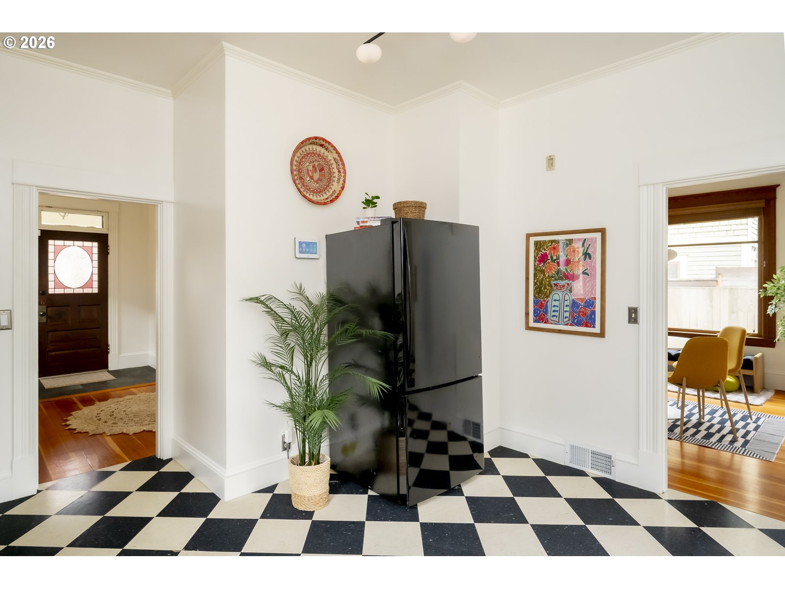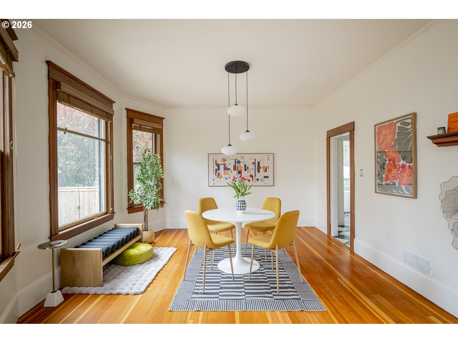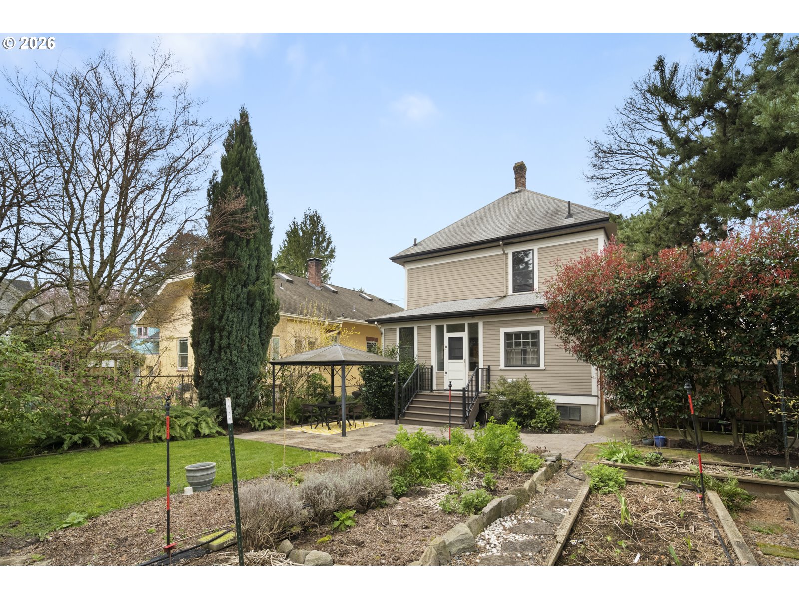 This bright and fresh 1904 Foursquare is serving major curb appeal and porch-hangs energy! Natural light pours into every corner, highlighting a home where original character and modern life play perfectly together. Kick things off with a gorgeous original stained glass door welcoming you into the formal entry with its classic open staircase, leading into a spacious living and dining layout anchored by warm fir floors, wood trim and high ceilings. The kitchen is a vibe, packed with personality with those nooks and details only found in an older home, plus a traditional butler’s pantry looking out onto the garden. The main floor is fitted with a charming full bath with claw-foot soaking tub. Upstairs, the floor plan hits all the right notes with three sunny bedrooms punctuated by tree canopy views in every direction. Downstairs, the unfinished basement is a blank canvas for yoga studio, workshop, or storing all of your treasures. Outside, the fully-fenced backyard is a total sanctuary— think vibrant Springtime perennials, raised beds for growing your own veggies, mature blueberry bushes, roses, dahlias and a pergola-covered patio that’s practically begging for a summer grill-out. Recent updates include a newer 200 AMP panel with EV charger, sewer line (2016), HVAC and AC (2019), radon mitigation, fresh paint, and updated lighting. All this in the Grant school district, just a quick stroll from Irvington Elementary and your favorite neighborhood coffee shops and cafes.