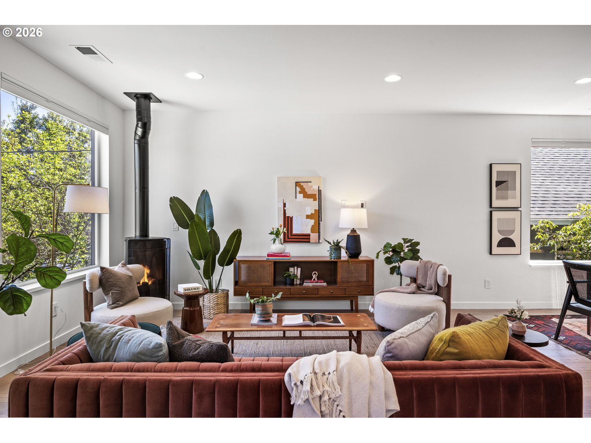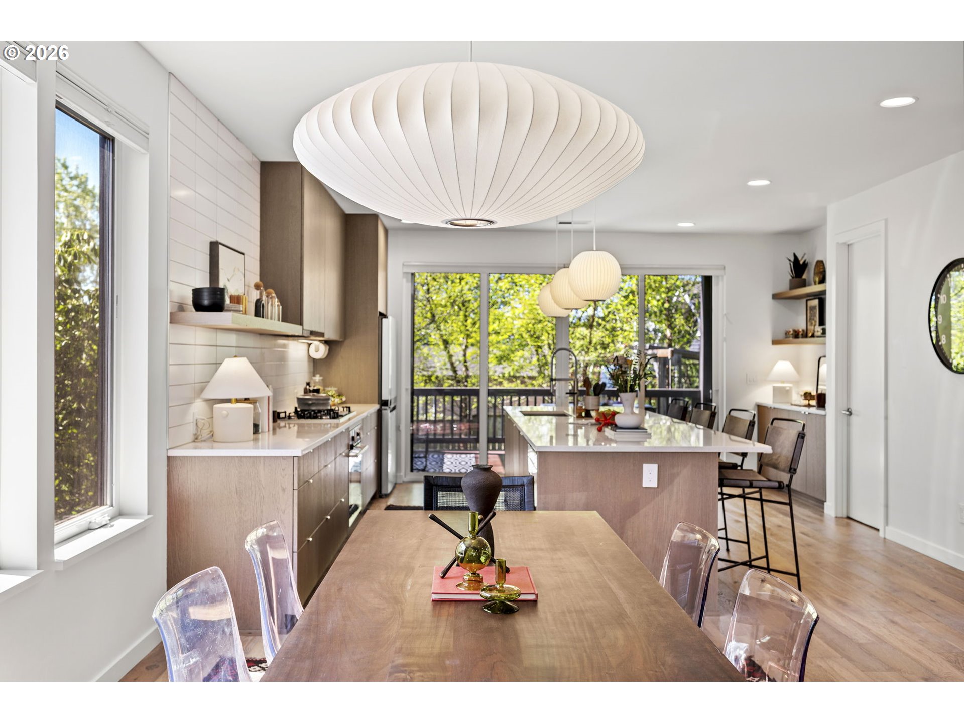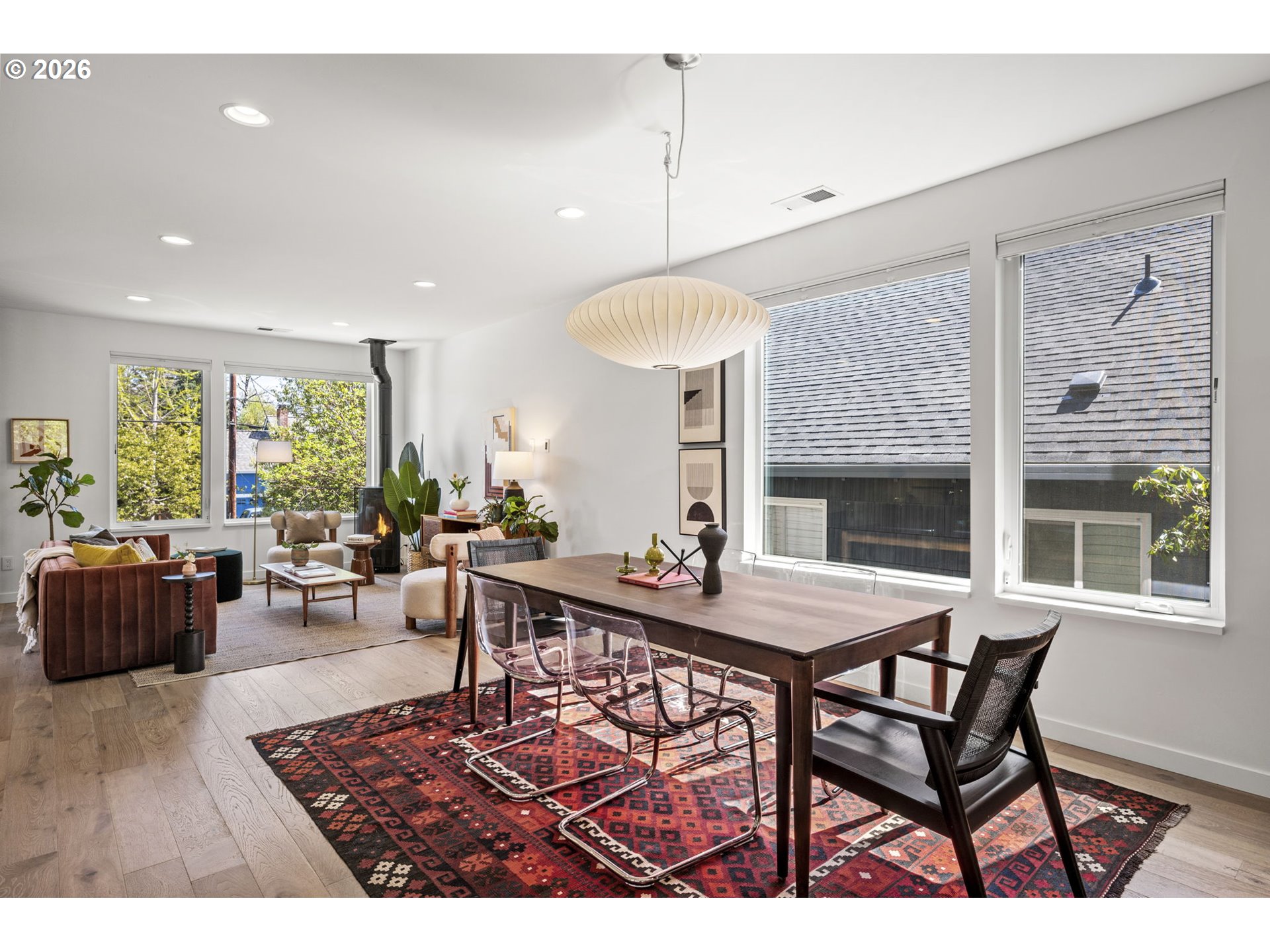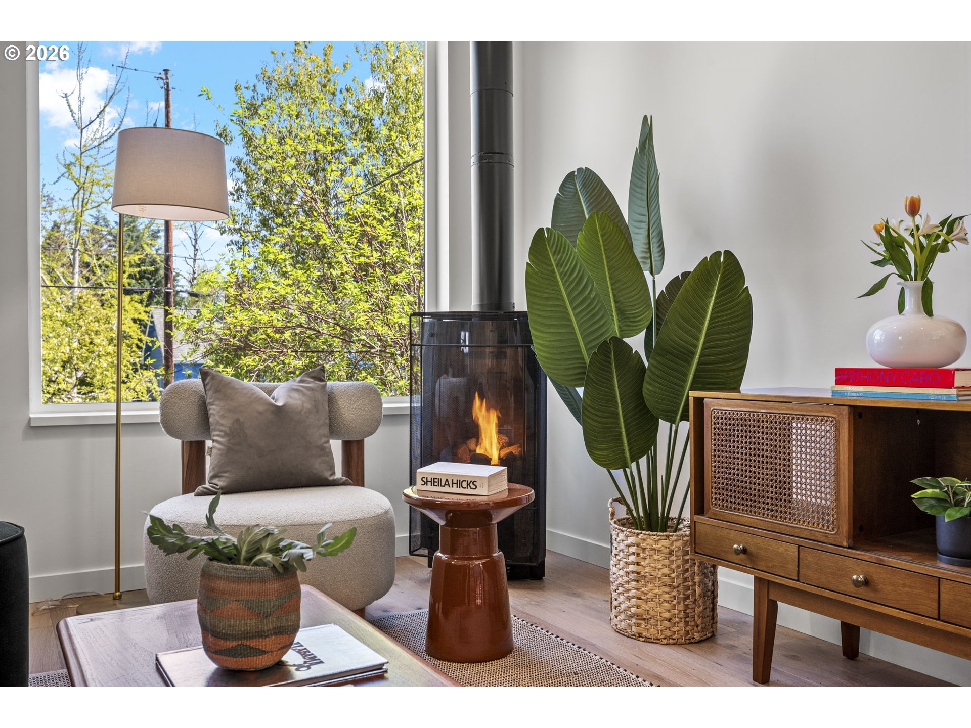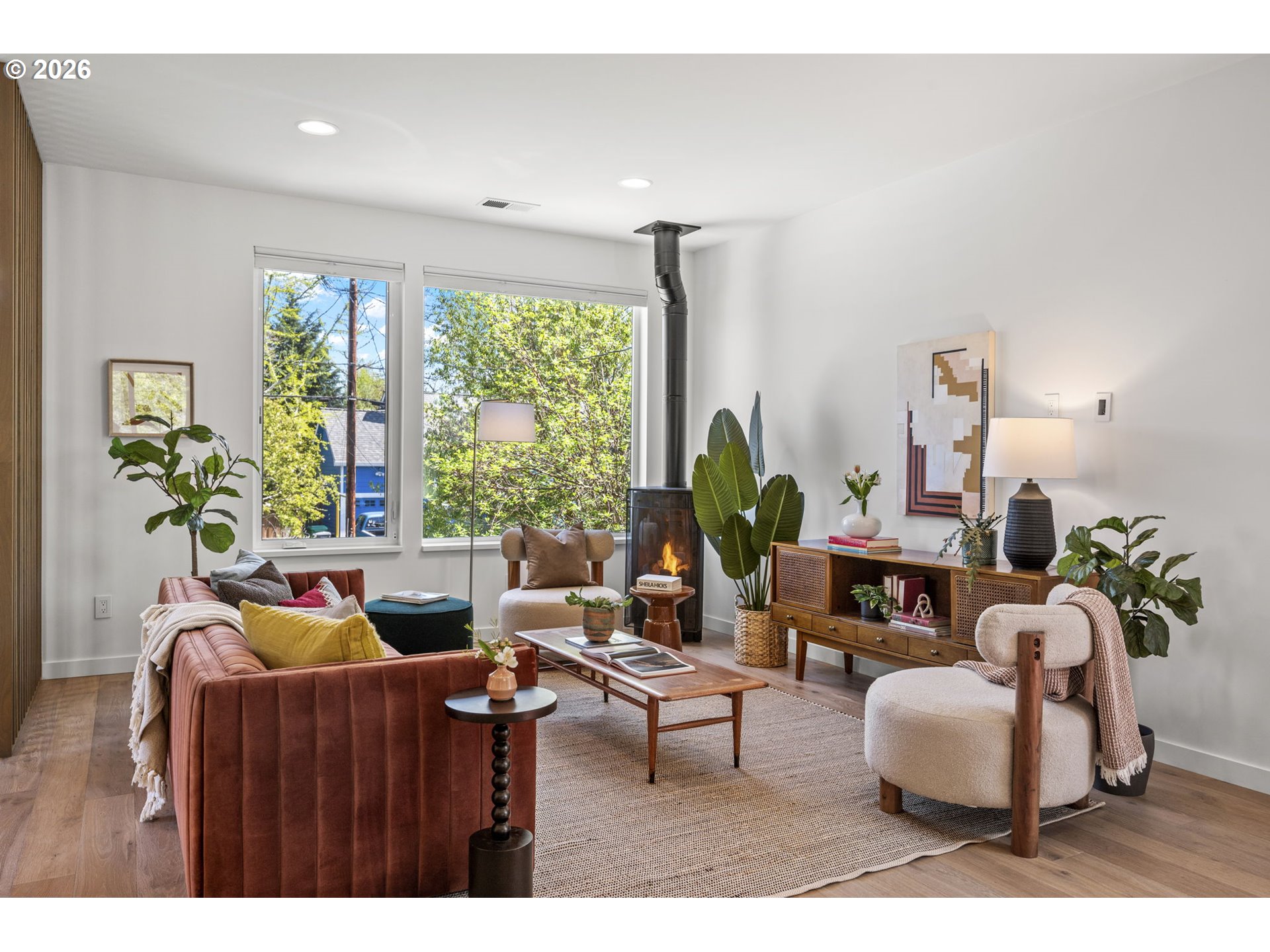 Striking Scandinavian-inspired modern home in Richmond! Soaring tall ceilings and expansive windows flood the home with incredible natural light, creating bright, airy living spaces throughout. Main floor features a warm, inviting gas stove fireplace in the living room, a convenient half bath, and opens to a spacious covered deck—perfect for seamless indoor/outdoor living and entertaining. Thoughtfully designed entryway provides space for shoes, coats, and backpacks, while an amazing mud room off the garage adds everyday convenience and organization. Gourmet kitchen features quartz counters, stainless steel appliances, a large eating island, custom built-ins, and an oversized walk-in pantry, offering both style and exceptional functionality. Upper level offers a luxurious primary suite with a vast walk-in closet and spa-like bathroom featuring an incredible walk-in shower and double sinks. Two additional bedrooms, a convenient upper-level laundry room, and an awesome loft/flex space ideal for work, play, or relaxation complete the level. Enjoy stunning views of Mt. Tabor, downtown Portland, and the West Hills. High-end engineered hardwood floors throughout upper living levels. Lower level ADU with private entrance includes modern cement floors and laundry hookup—perfect for guests or rental income. Designed for both entertaining and everyday living, this home offers light-filled spaces and a low-maintenance yard. Ideally located just a short distance to some of the best shops, restaurants, theaters, and coffee on both Hawthorne and Division. [Home Energy Score = 4. HES Report at https://rpt.greenbuildingregistry.com/hes/OR10200485]
