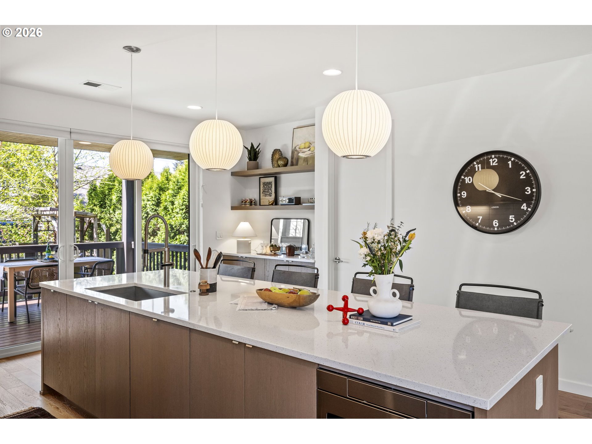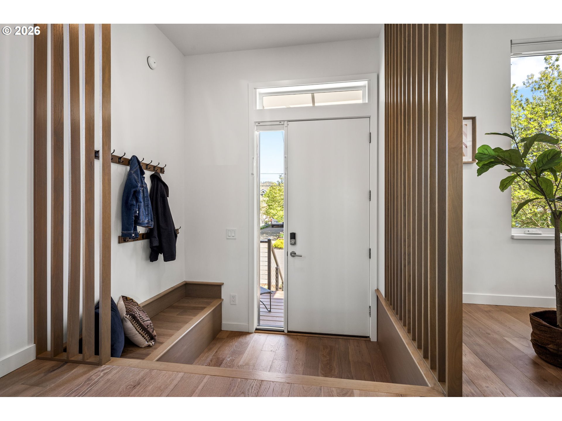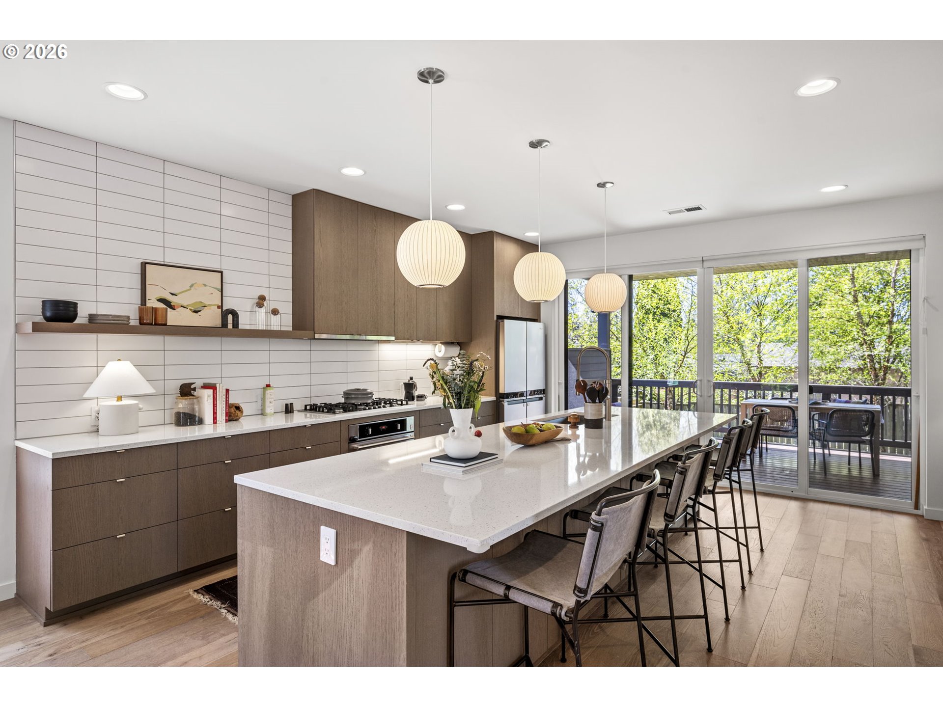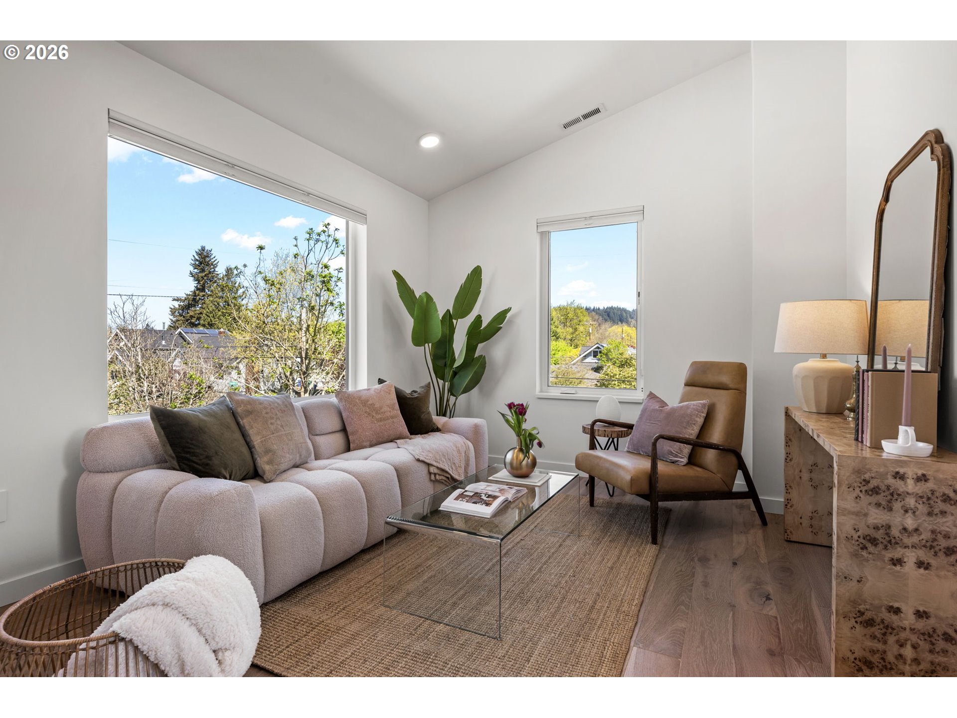 Striking Scandinavian-inspired modern home in Richmond! Soaring tall ceilings and expansive windows flood the home with incredible natural light, creating bright, airy living spaces throughout. Main floor features a warm, inviting gas stove fireplace in the living room, a convenient half bath, and opens to a spacious covered deck—perfect for seamless indoor/outdoor living and entertaining. Thoughtfully designed entryway provides space for shoes, coats, and backpacks, while an amazing mud room off the garage adds everyday convenience and organization. Gourmet kitchen features quartz counters, stainless steel appliances, a large eating island, custom built-ins, and an oversized walk-in pantry, offering both style and exceptional functionality. Upper level offers a luxurious primary suite with a vast walk-in closet and spa-like bathroom featuring an incredible walk-in shower and double sinks. Two additional bedrooms, a convenient upper-level laundry room, and an awesome loft/flex space ideal for work, play, or relaxation complete the level. Enjoy stunning views of Mt. Tabor, downtown Portland, and the West Hills. High-end engineered hardwood floors throughout upper living levels. Lower level ADU with private entrance includes modern cement floors and laundry hookup—perfect for guests or rental income. Designed for both entertaining and everyday living, this home offers light-filled spaces and a low-maintenance yard. Ideally located just a short distance to some of the best shops, restaurants, theaters, and coffee on both Hawthorne and Division. [Home Energy Score = 4. HES Report at https://rpt.greenbuildingregistry.com/hes/OR10200485]