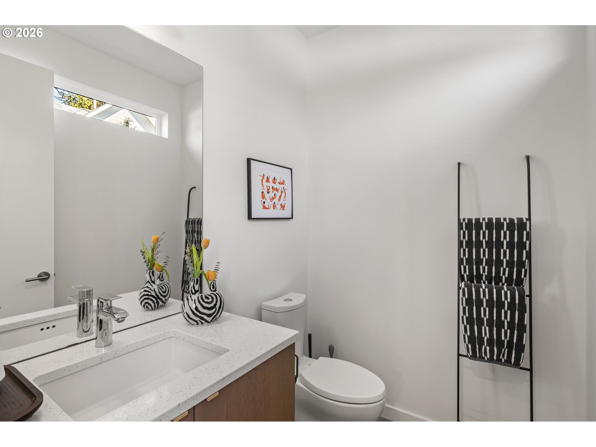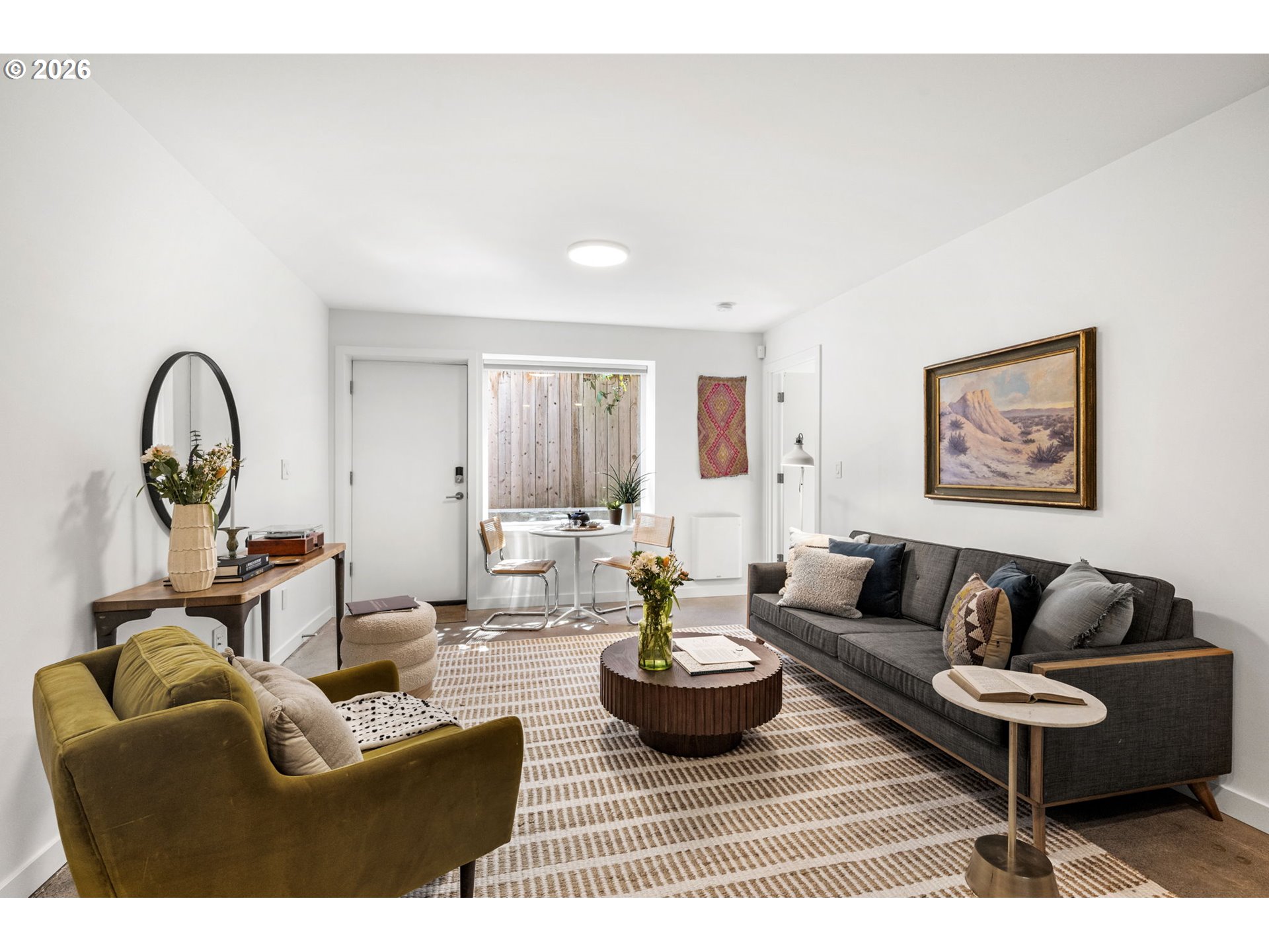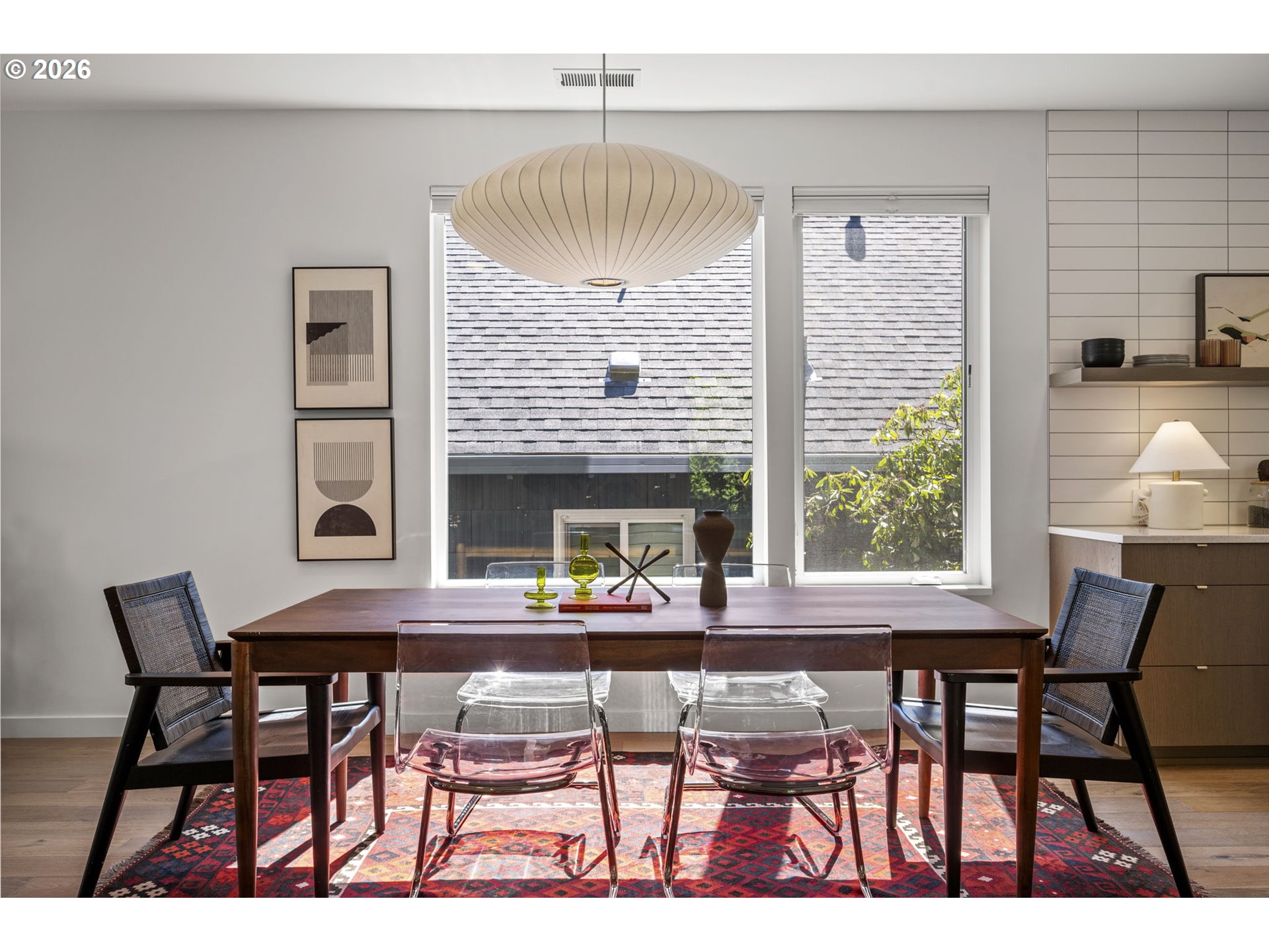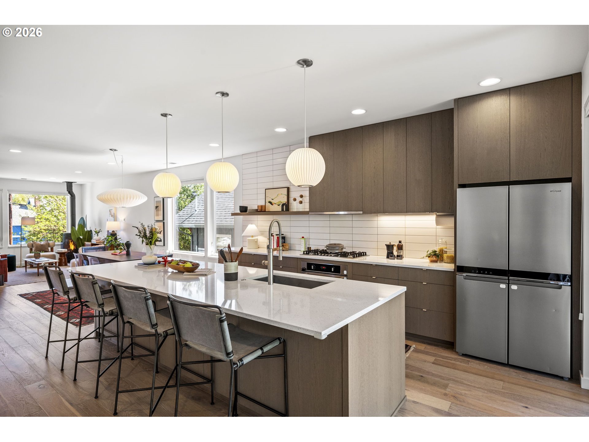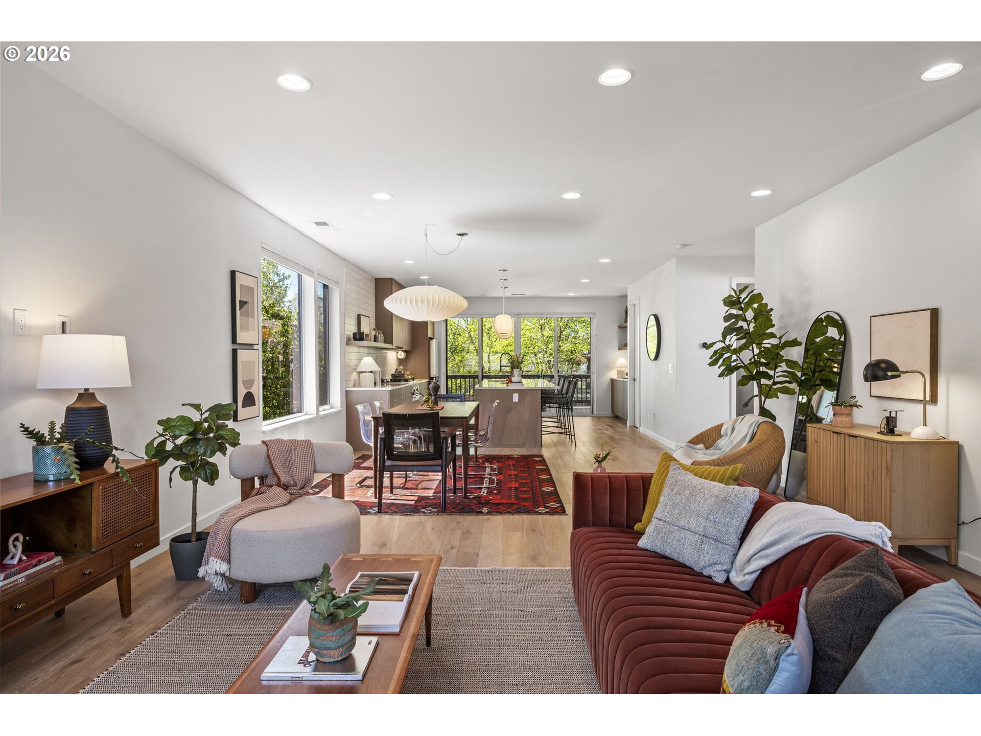 Striking Scandinavian-inspired modern home in Richmond! Soaring tall ceilings and expansive windows flood the home with incredible natural light, creating bright, airy living spaces throughout. Main floor features a warm, inviting gas stove fireplace in the living room, a convenient half bath, and opens to a spacious covered deck—perfect for seamless indoor/outdoor living and entertaining. Thoughtfully designed entryway provides space for shoes, coats, and backpacks, while an amazing mud room off the garage adds everyday convenience and organization. Gourmet kitchen features quartz counters, stainless steel appliances, a large eating island, custom built-ins, and an oversized walk-in pantry, offering both style and exceptional functionality. Upper level offers a luxurious primary suite with a vast walk-in closet and spa-like bathroom featuring an incredible walk-in shower and double sinks. Two additional bedrooms, a convenient upper-level laundry room, and an awesome loft/flex space ideal for work, play, or relaxation complete the level. Enjoy stunning views of Mt. Tabor, downtown Portland, and the West Hills. High-end engineered hardwood floors throughout upper living levels. Lower level ADU with private entrance includes modern cement floors and laundry hookup—perfect for guests or rental income. Designed for both entertaining and everyday living, this home offers light-filled spaces and a low-maintenance yard. Ideally located just a short distance to some of the best shops, restaurants, theaters, and coffee on both Hawthorne and Division. [Home Energy Score = 4. HES Report at https://rpt.greenbuildingregistry.com/hes/OR10200485]