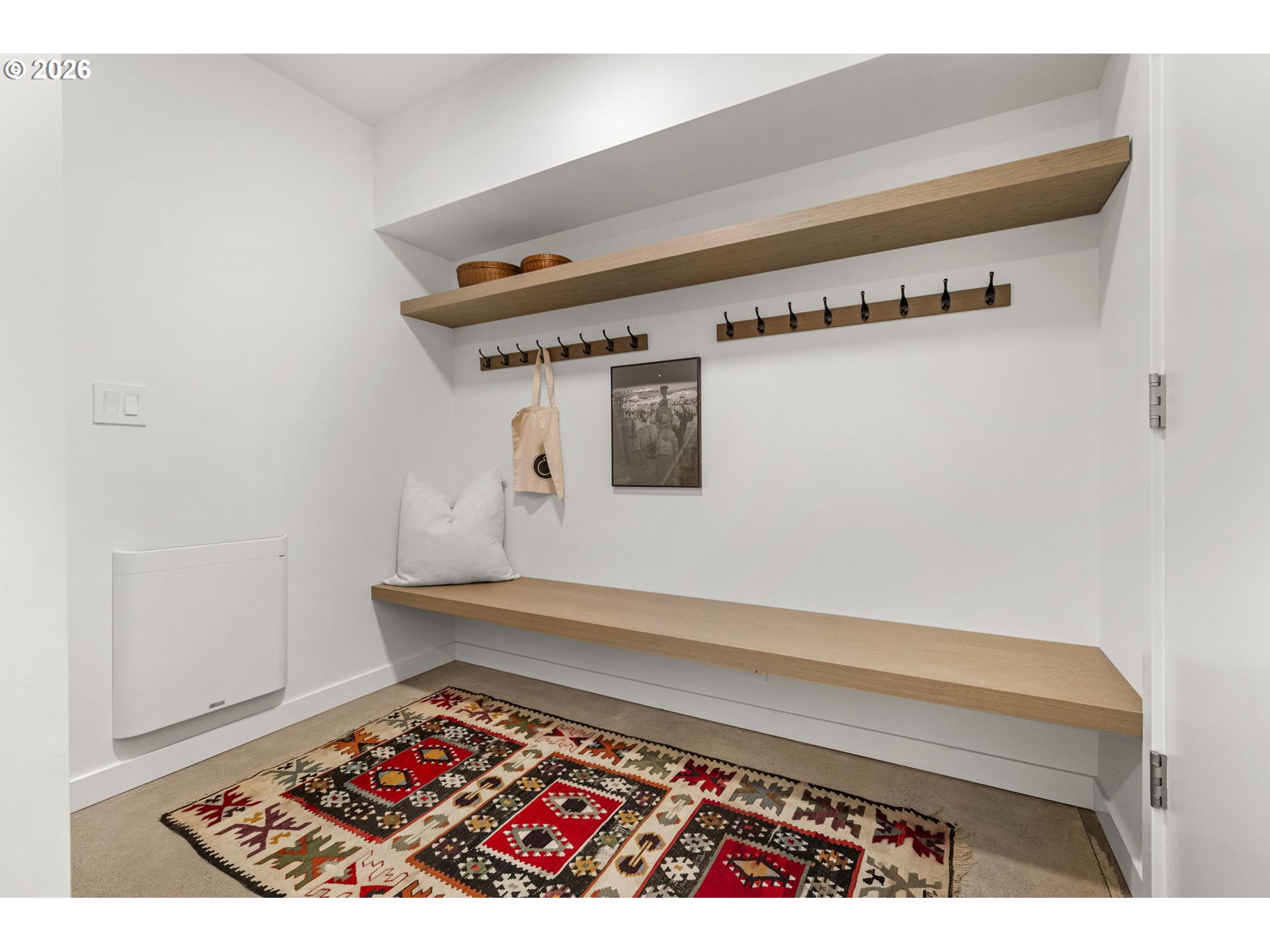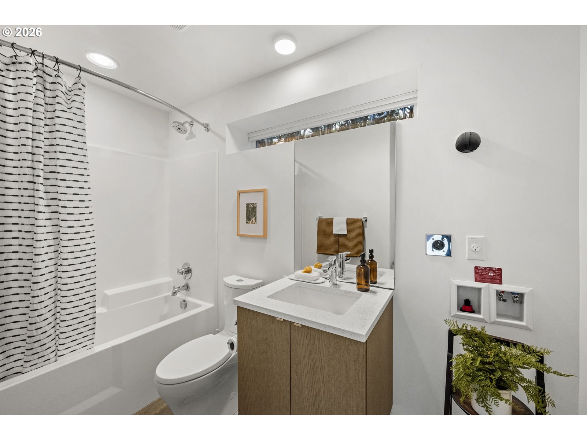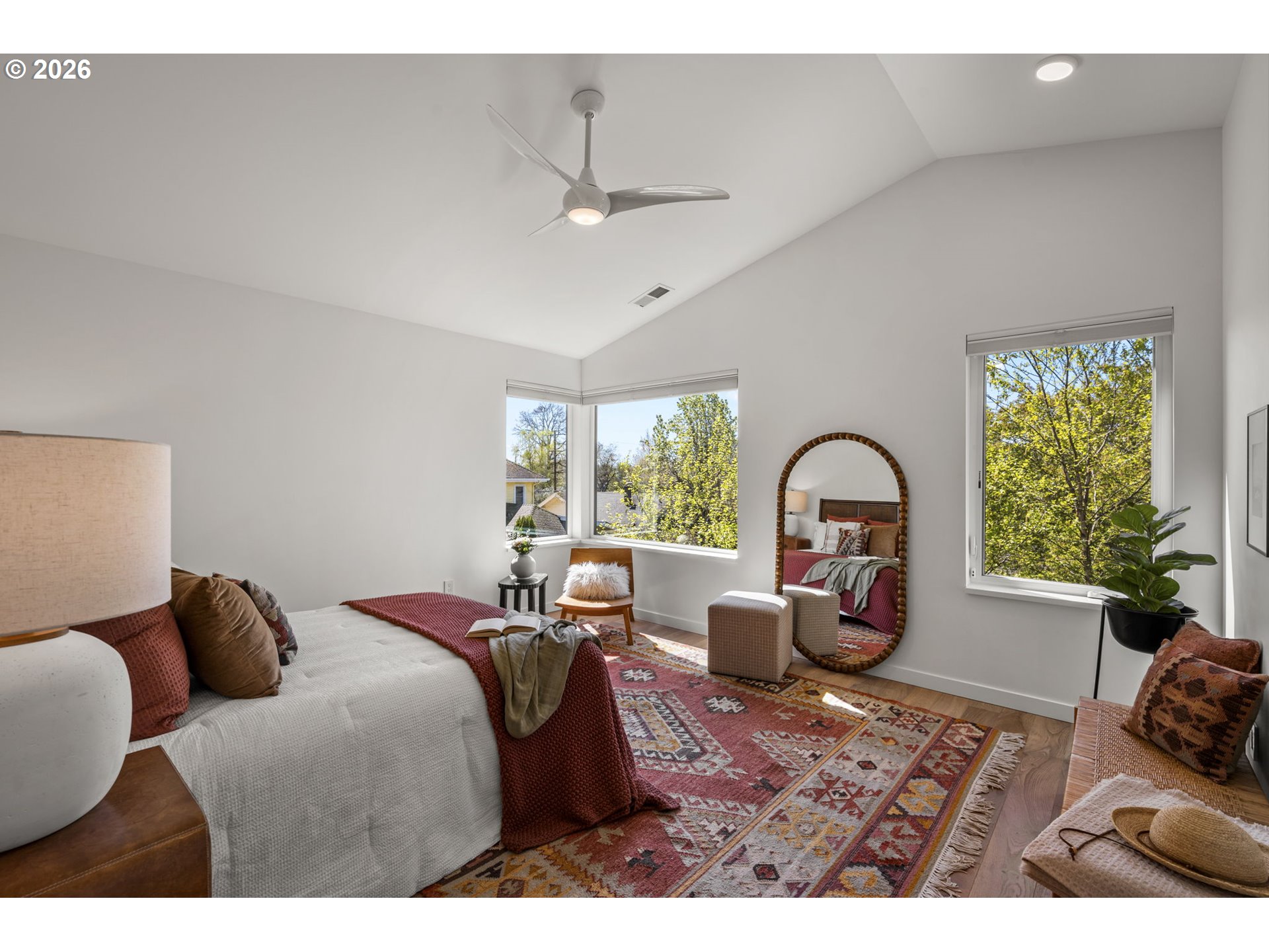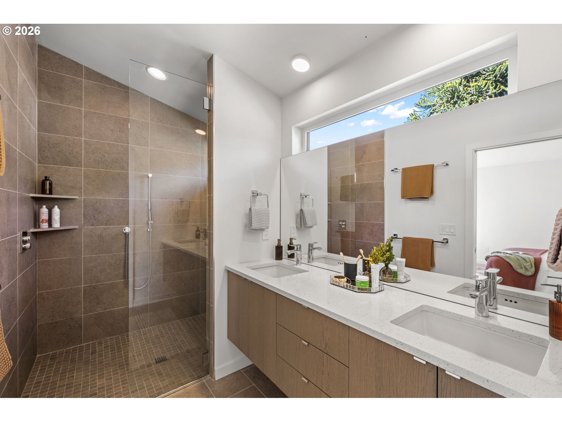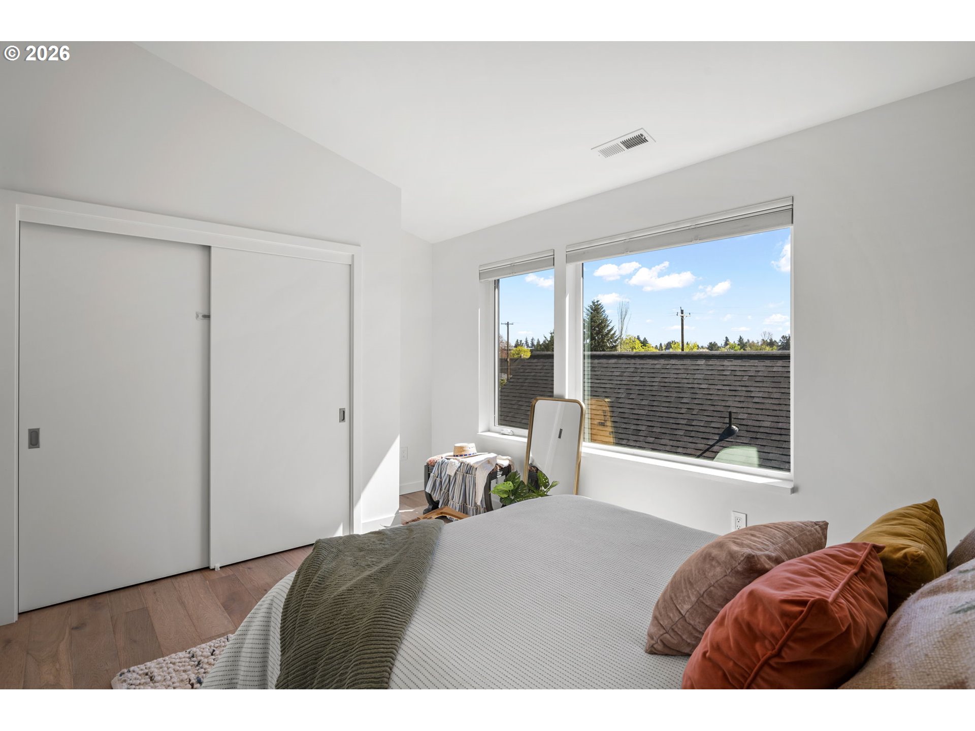 Striking Scandinavian-inspired modern home in Richmond! Soaring tall ceilings and expansive windows flood the home with incredible natural light, creating bright, airy living spaces throughout. Main floor features a warm, inviting gas stove fireplace in the living room, a convenient half bath, and opens to a spacious covered deck—perfect for seamless indoor/outdoor living and entertaining. Thoughtfully designed entryway provides space for shoes, coats, and backpacks, while an amazing mud room off the garage adds everyday convenience and organization. Gourmet kitchen features quartz counters, stainless steel appliances, a large eating island, custom built-ins, and an oversized walk-in pantry, offering both style and exceptional functionality. Upper level offers a luxurious primary suite with a vast walk-in closet and spa-like bathroom featuring an incredible walk-in shower and double sinks. Two additional bedrooms, a convenient upper-level laundry room, and an awesome loft/flex space ideal for work, play, or relaxation complete the level. Enjoy stunning views of Mt. Tabor, downtown Portland, and the West Hills. High-end engineered hardwood floors throughout upper living levels. Lower level ADU with private entrance includes modern cement floors and laundry hookup—perfect for guests or rental income. Designed for both entertaining and everyday living, this home offers light-filled spaces and a low-maintenance yard. Ideally located just a short distance to some of the best shops, restaurants, theaters, and coffee on both Hawthorne and Division. [Home Energy Score = 4. HES Report at https://rpt.greenbuildingregistry.com/hes/OR10200485]