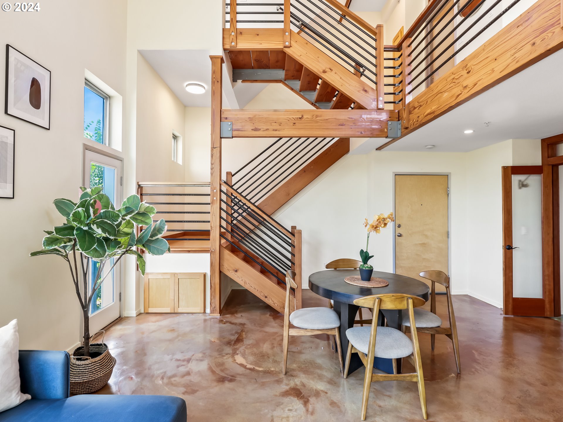 NEW LISTING, FIRST OPEN HOUSE, SATURDAY, 4/4, 12-2 PM! Unit #201. Welcome to the unique and sought-after Clinton Street Lofts, designed by Burgee Architecture. Step inside to discover main-level radiant concrete floors, stained with warm colors and accented by exposed industrial beams, and an amazing stairwell featuring steel and Fir accents. The soaring ceilings and numerous windows flood the space with loads of natural light. The living room, dining room, and kitchen are all open to each other. The great room footprint includes one main-level bedroom with French doors, a Juliette balcony, and an en-suite half bath. The kitchen features a new subway tile backsplash, gas cooking, and stainless-steel appliances. Going upstairs you'll find an open loft with cork floors, an eastern balcony, and a southern Juliette balcony. You will also find a full bath with newer tile floor, a soaking tub/shower combination, and a stackable washer and dryer. Don't miss the showstopping 12x8 rooftop deck surrounded by its living roof with amazing views of the west hills and downtown. All this and so much more comes together to create a truly eco-friendly live/work environment. Just a stroll away are the eateries, coffee houses and shopping of Clinton/Division. Mass trans is also just one block away. A 96 Walk Score, a 99 Bike Score, and brand new siding round out this architectural gem.