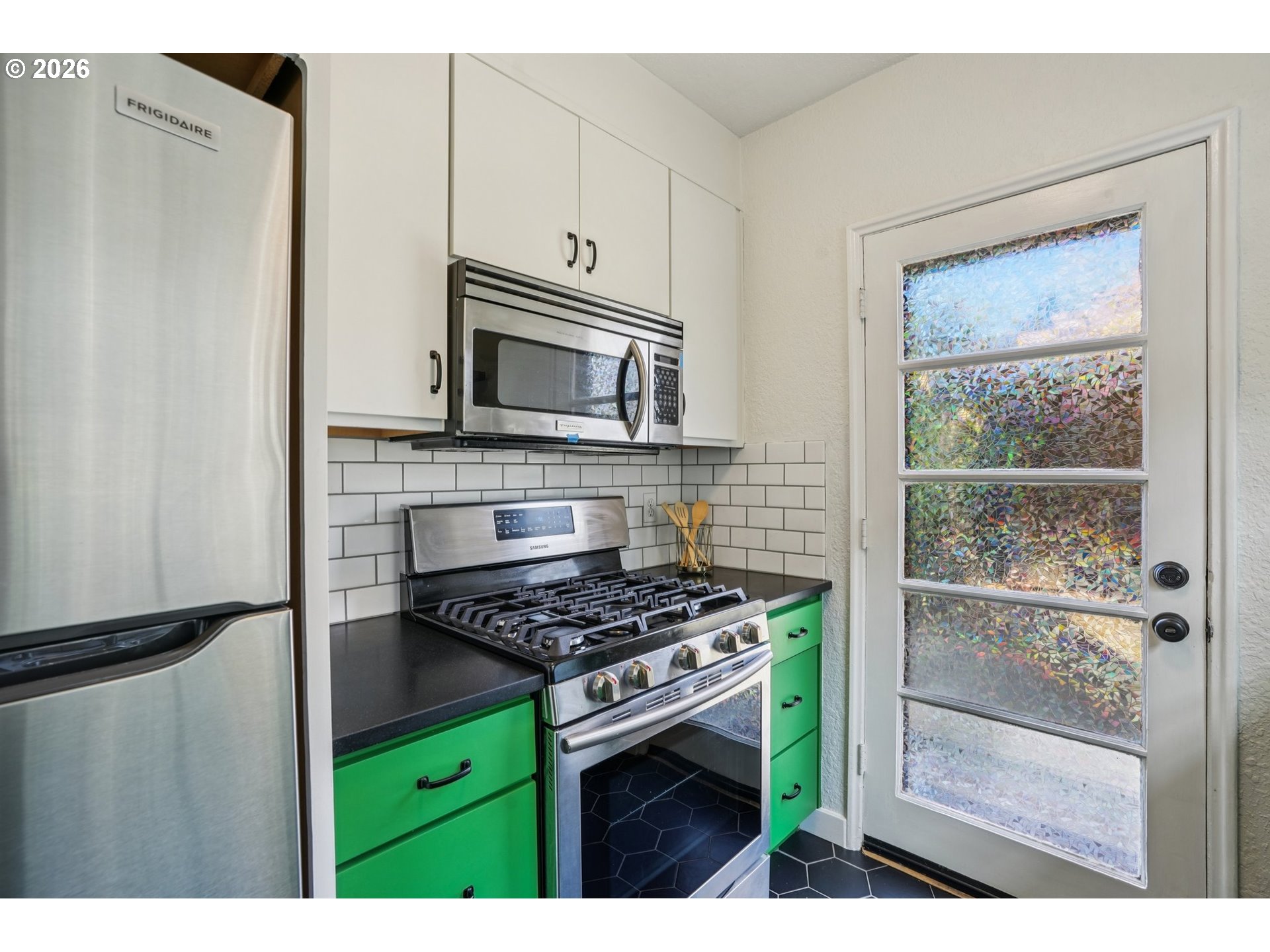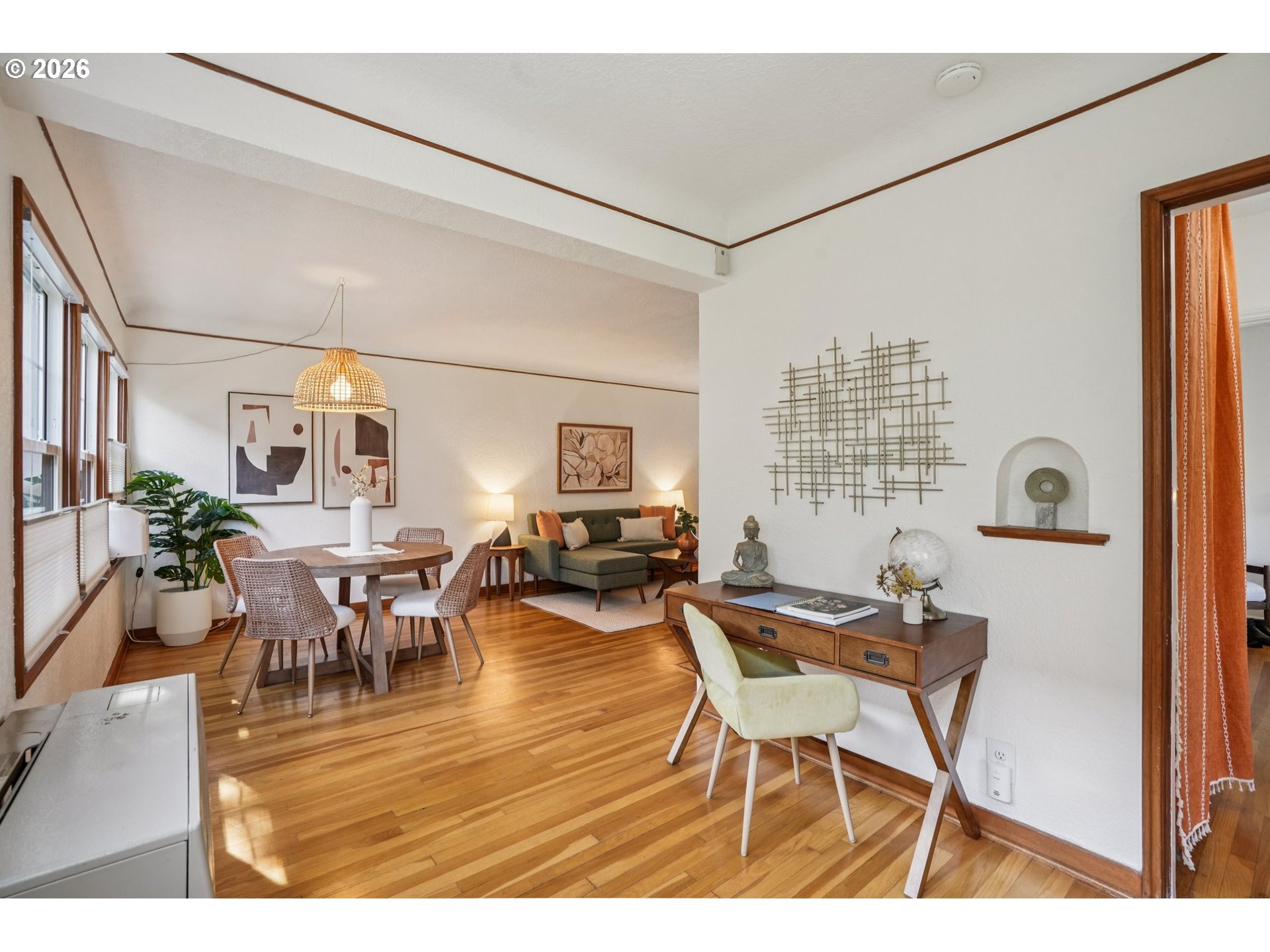 Tucked into the heart of SE Portland’s sought-after Hosford-Abernethy neighborhood, this light-filled mid-century modern condo at Terrazzo Condominiums offers the perfect blend of charm, comfort, and convenience. Ideally positioned in a quiet interior setting, it features a wall of windows overlooking lush hydrangeas and manicured greenery—creating a peaceful, private retreat.Inside, warm hardwood floors and a cozy wood-burning fireplace anchor the inviting living space, while the thoughtfully designed single-level layout lives larger than its footprint. The kitchen is well-equipped with stainless steel appliances and solid surface countertops, ideal for both everyday living and entertaining.Double-pane windows enhance comfort and efficiency, and generous storage—including a dedicated basement space and a garage with industrial shelving—adds exceptional functionality.Enjoy access to a shared covered deck with BBQ and seating, perfect for relaxing or gathering with friends. Community amenities include spacious laundry facilities for oversized loads, secure bike storage, and beautifully maintained grounds.HOA dues cover water, sewer, trash, exterior maintenance, and more—offering truly low-maintenance living. Just one block off Division and near Ladd’s Addition, you’re minutes from New Seasons, popular dining spots, parks, and easy downtown access.