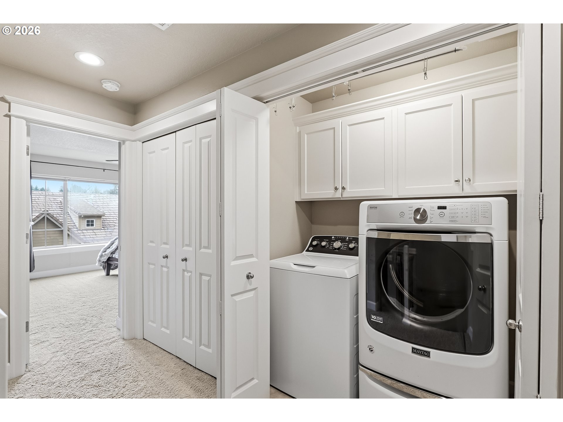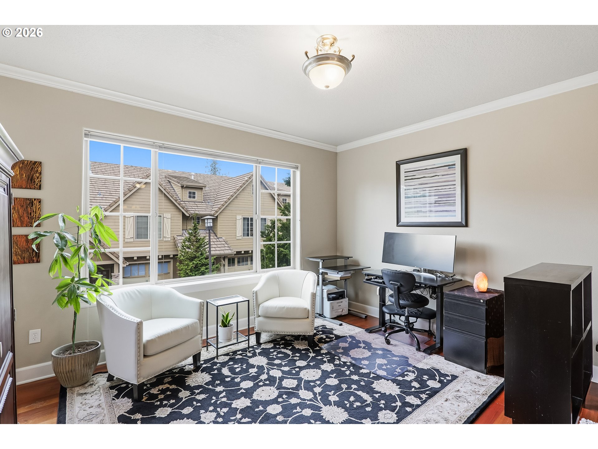 Light-filled townhome featuring high-end finishes and an exceptional location in coveted Forest Heights. Hardwood floors, crown moulding, oversized windows, and high ceilings create an airy feel throughout the main living areas. The living room showcases high ceilings, a gas fireplace, and a versatile nook ideal for a workspace or reading area, with a balcony just off the space for easy indoor-outdoor living. The dining area features high ceilings and a sliding glass door that opens to the private backyard. The kitchen is thoughtfully designed with a cook island and range hood, granite countertops, pantry, solid wood cabinetry, built-in oven and microwave, and stainless steel appliances. Upstairs, two spacious primary suites feature vaulted ceilings, walk-in closets with organizers, and ensuite baths. One suite offers double sinks, a soaking tub, and a walk-in shower. The oversized two-car tandem garage is extra deep and wide, offering exceptional storage with walls lined with built-in shelving, a workbench, utility sink, and additional storage beneath the stairs. The backyard features a privacy fence, patio, turf, and gas hookup, perfect for entertaining. Prime location with direct trail access to Mill Pond Park and just steps from the Forest Heights Village Center, with easy access to major highways, downtown Portland, NW 23rd, and Forest Park trails. Quiet neighborhood and top-rated schools complete the package. [Home Energy Score = 9. HES Report at https://rpt.greenbuildingregistry.com/hes/OR10238255]