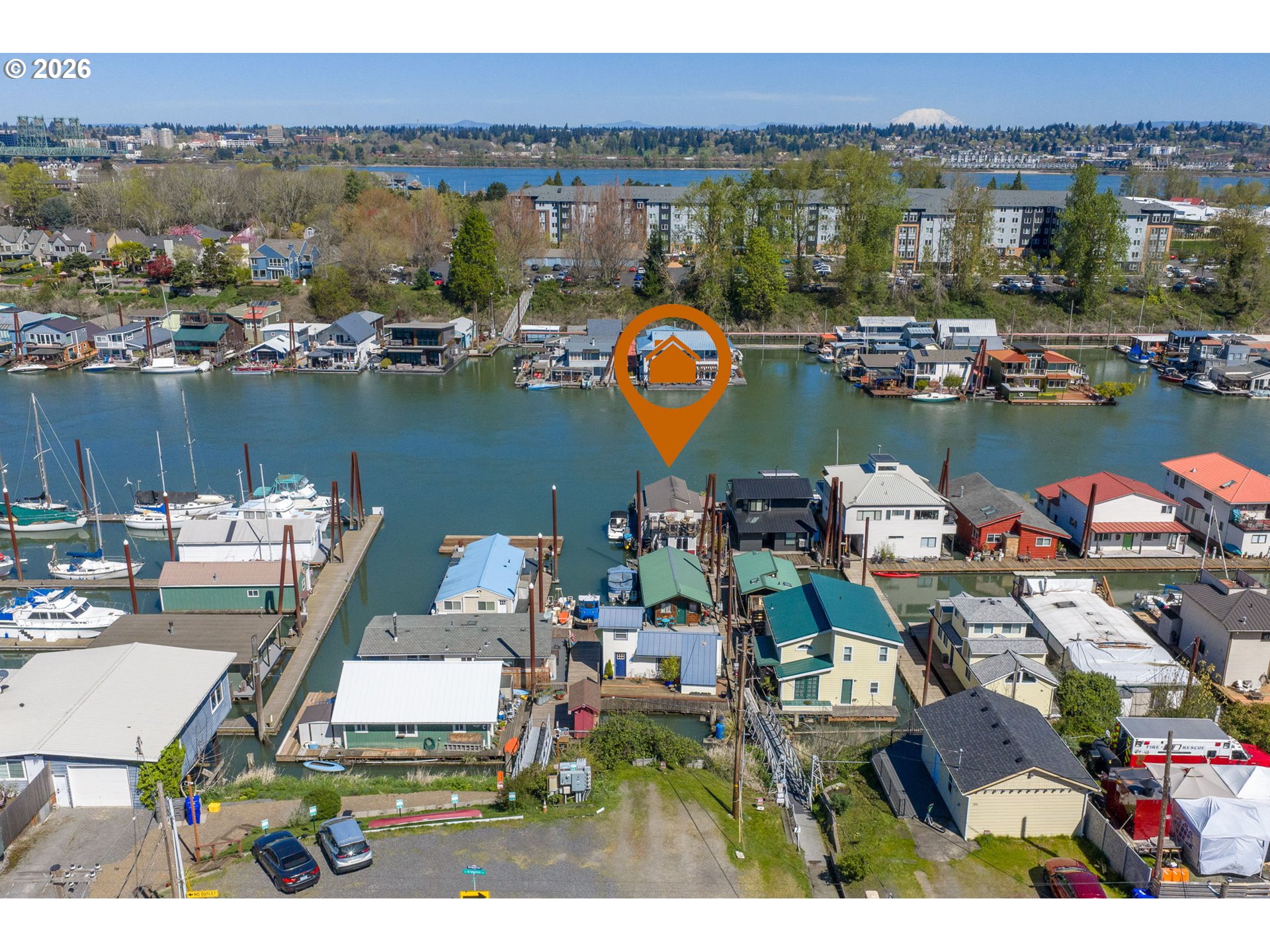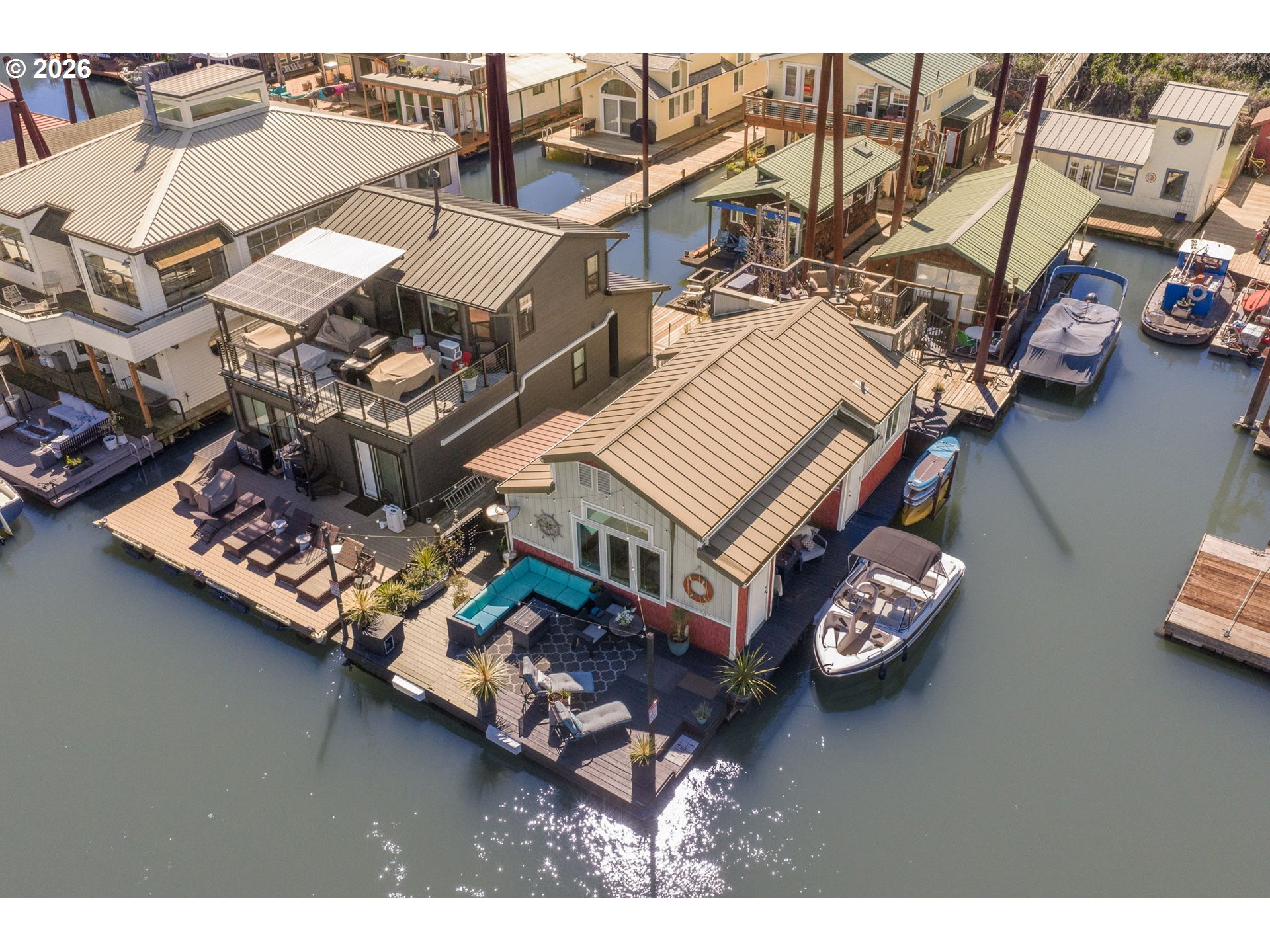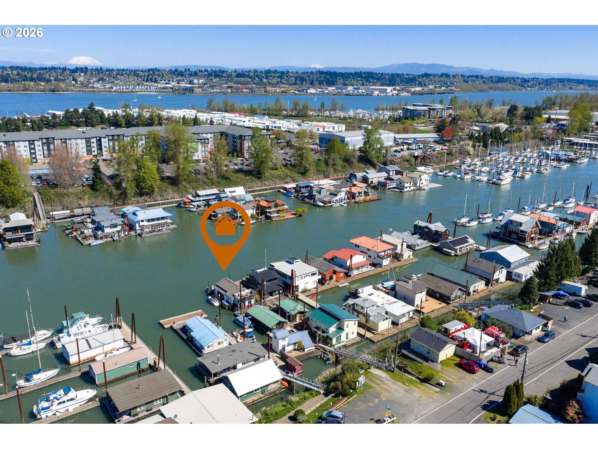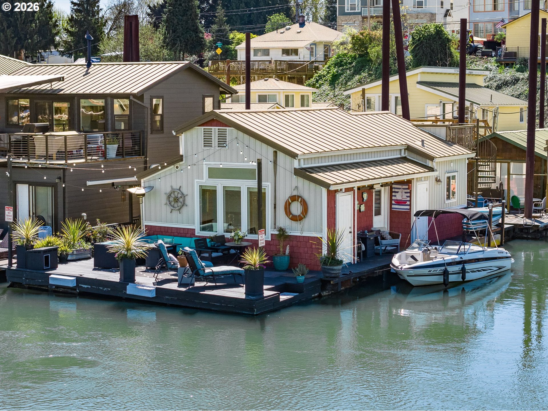 End-corner slip with open lagoon views to the west, creating a bright, open feel and incredible sunsets. Located on calm waters in a no-wake zone, this home offers easy boating.The main living space features engineered hardwoods, a built-in bar, and an electric fireplace, flowing into a well-equipped kitchen with solid surface countertops, newer stainless appliances, and plenty of cabinet space. Bedrooms offer double closets, and the home also includes a utility closet with a full-size washer and dryer.Outdoor living is a standout, with expansive deck space that includes a large front deck perfect for entertaining, a private covered heated deck, and a rooftop deck with sweeping views. Park your boat right out front, or take your boat or paddle board to The Deck or Island Cafe for lunch, dinner, or a relaxing afternoon on the water.If you’ve ever dreamed of living the floating home lifestyle, this is a great place to start. With a float rating of 4, the home is financeable for up to 80% loan-to-value, making river living more within reach. Front-row seats to the Christmas Ships complete the experience.