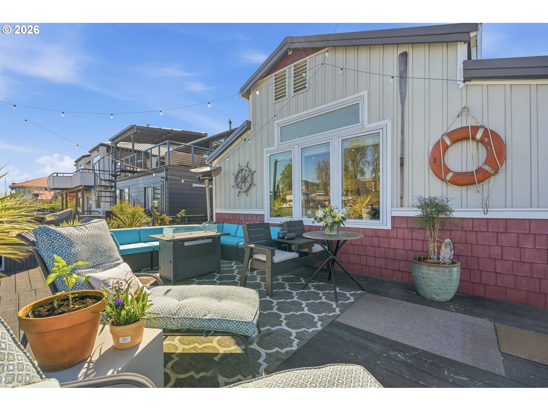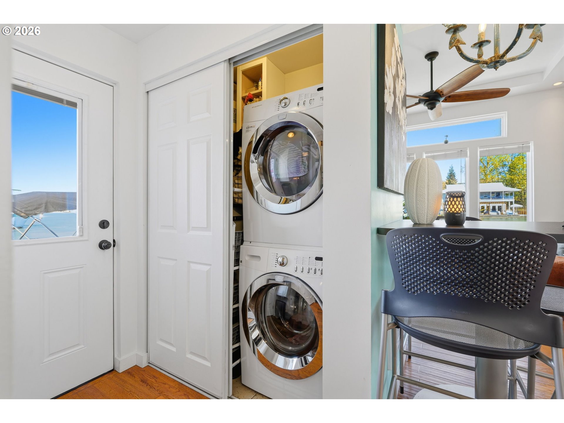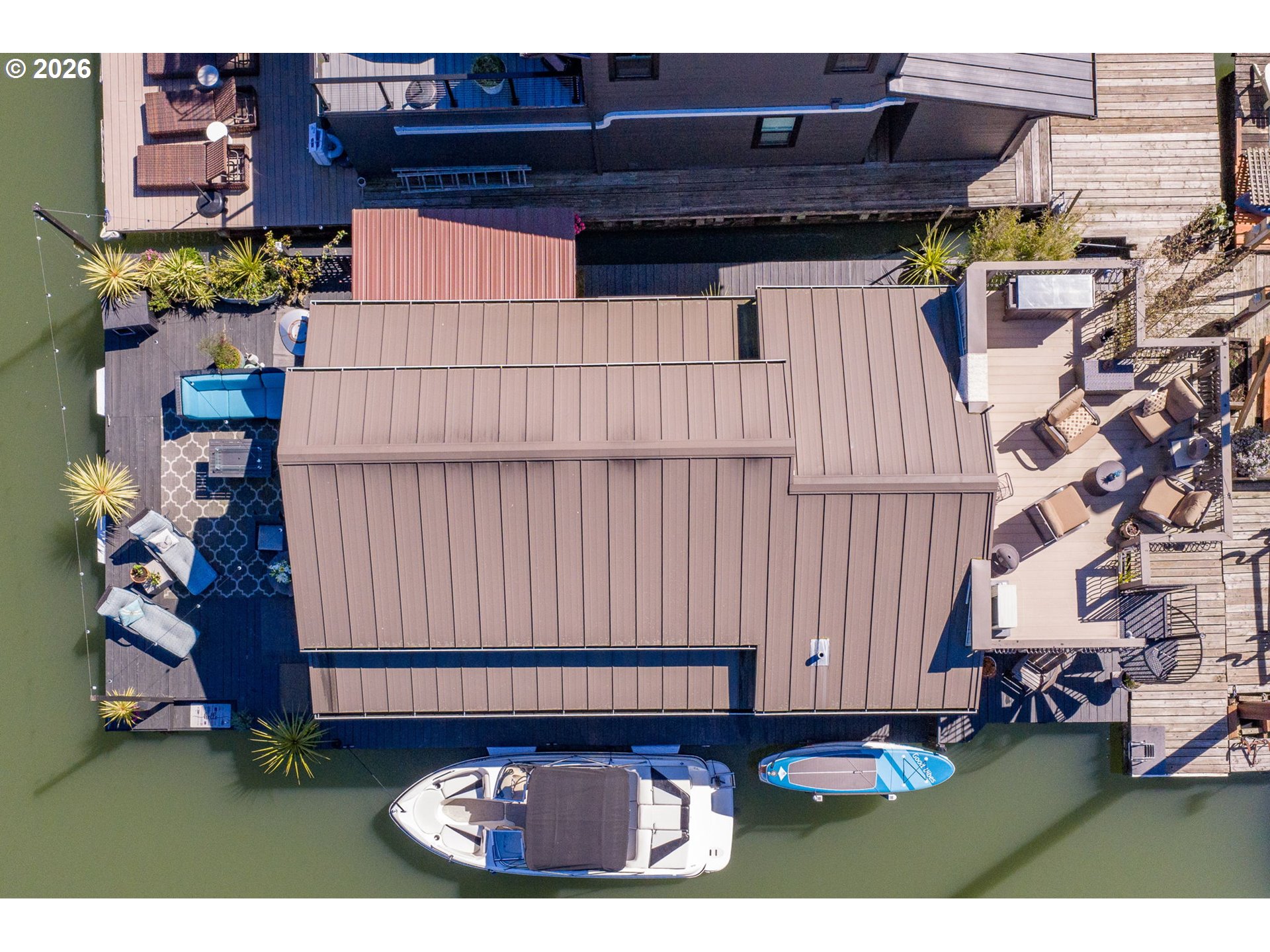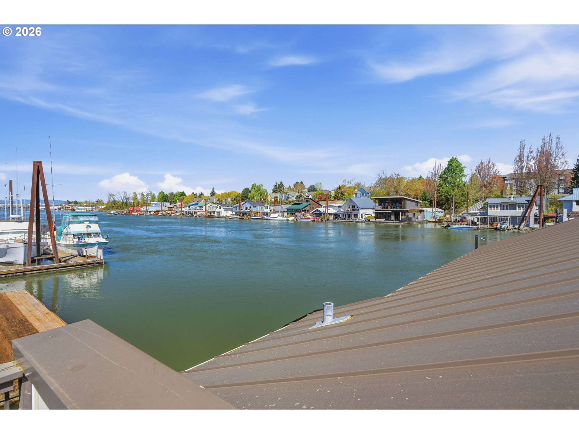 End-corner slip with open lagoon views to the west, creating a bright, open feel and incredible sunsets. Located on calm waters in a no-wake zone, this home offers easy boating.The main living space features engineered hardwoods, a built-in bar, and an electric fireplace, flowing into a well-equipped kitchen with solid surface countertops, newer stainless appliances, and plenty of cabinet space. Bedrooms offer double closets, and the home also includes a utility closet with a full-size washer and dryer.Outdoor living is a standout, with expansive deck space that includes a large front deck perfect for entertaining, a private covered heated deck, and a rooftop deck with sweeping views. Park your boat right out front, or take your boat or paddle board to The Deck or Island Cafe for lunch, dinner, or a relaxing afternoon on the water.If you’ve ever dreamed of living the floating home lifestyle, this is a great place to start. With a float rating of 4, the home is financeable for up to 80% loan-to-value, making river living more within reach. Front-row seats to the Christmas Ships complete the experience.