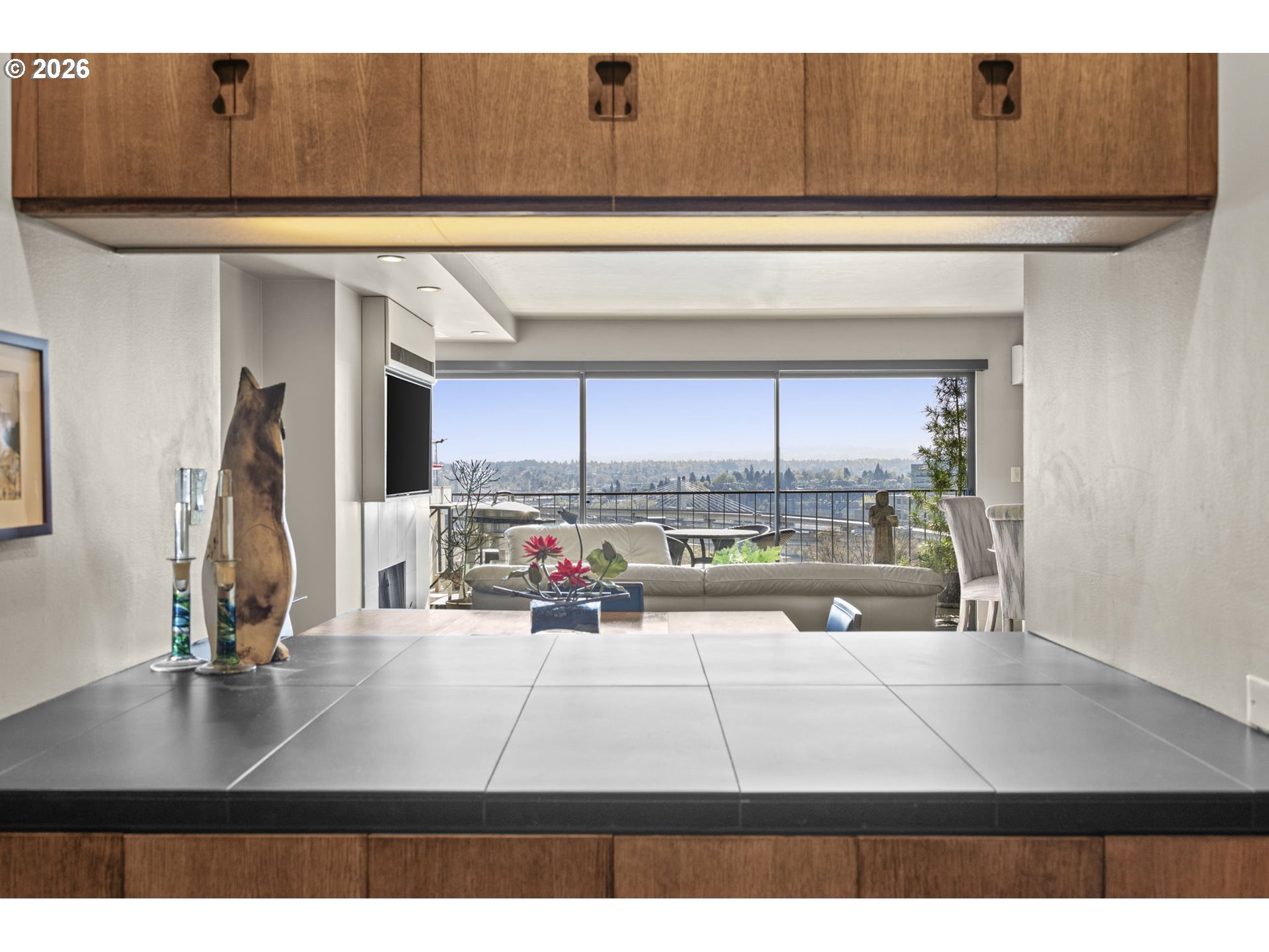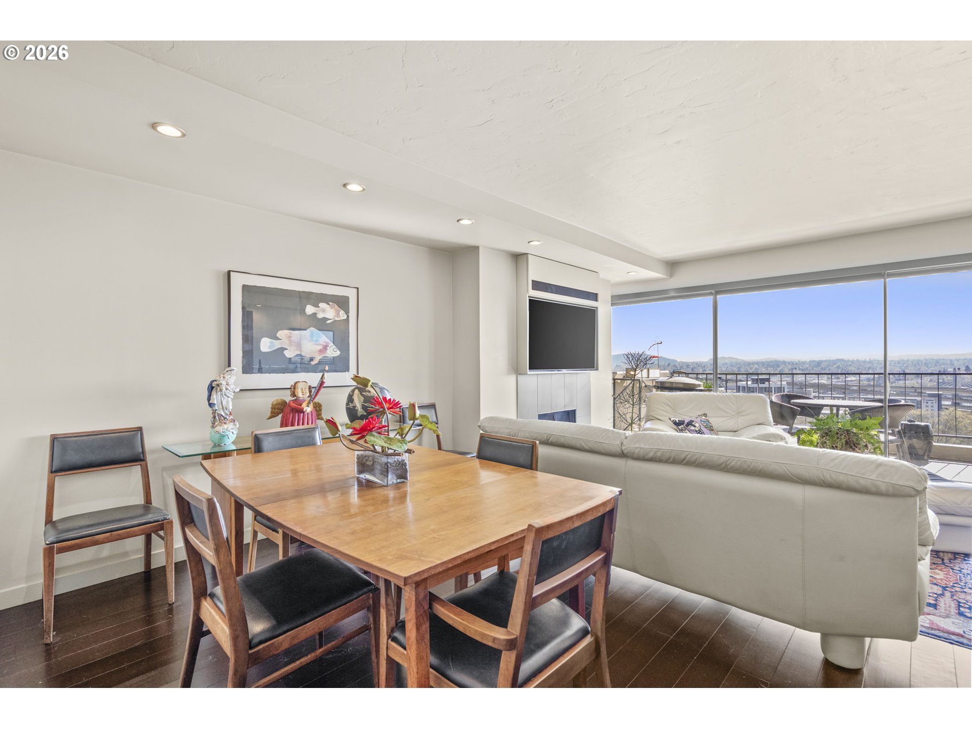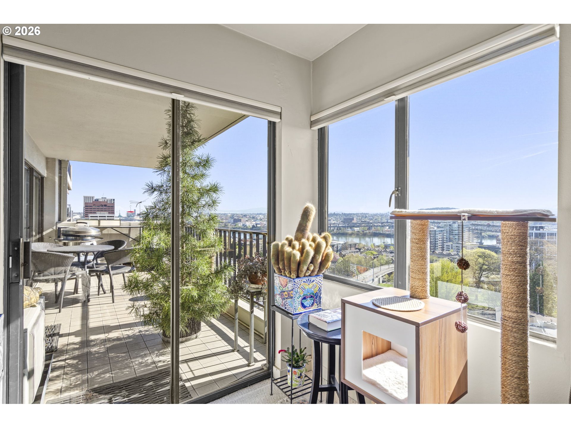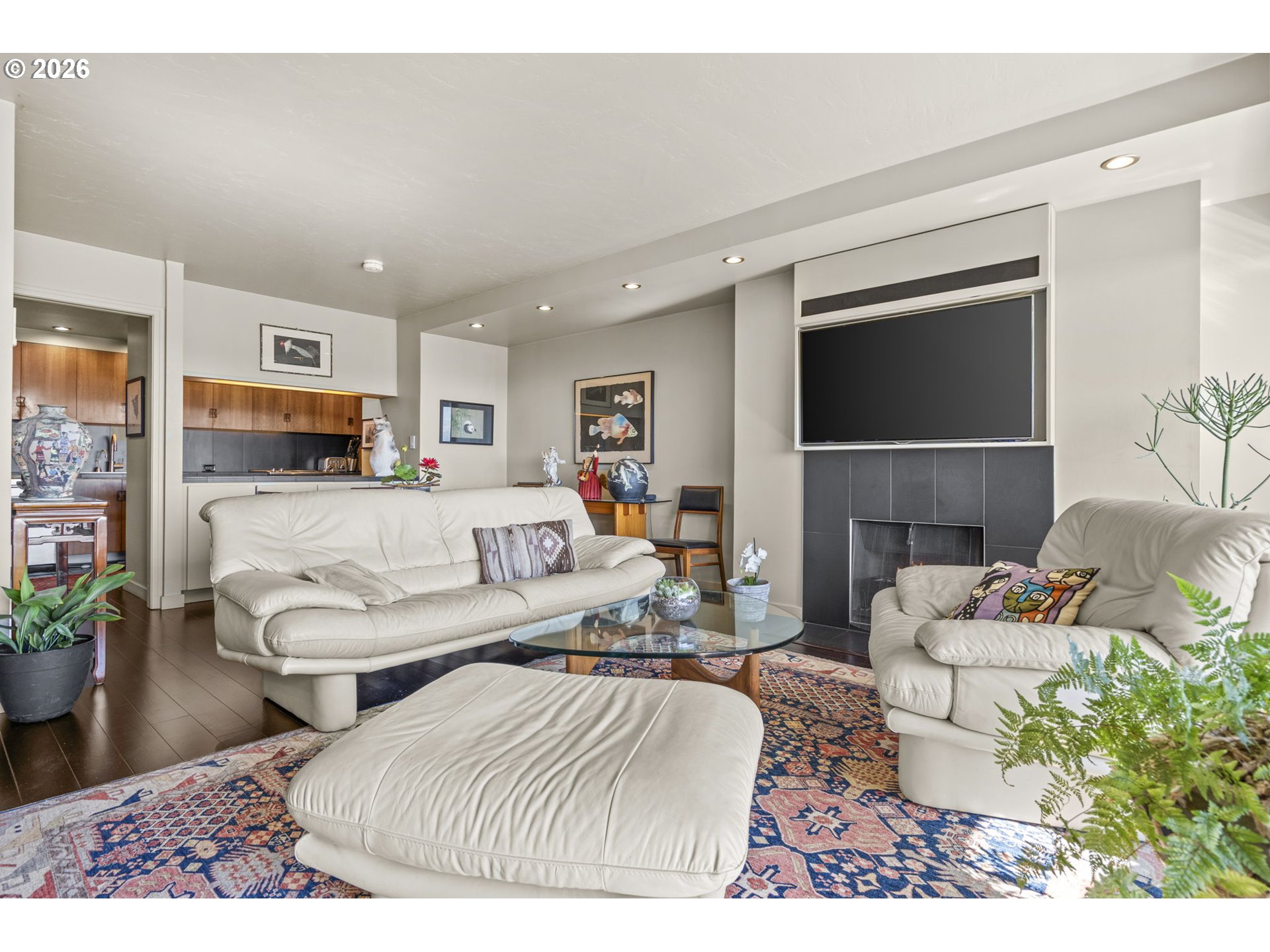(503) 893-8874Experience elevated urban living in this masterfully renovated condo with a sophisticated mid-century vibe. Beyond the striking entry, walnut-paneled walls and dark flooring lead to an expansive, light-filled floor plan. Floor-to-ceiling sliders open to a sprawling east-facing deck, offering front-row seats to Mt. Hood sunrises and Willamette River views.This tech-forward home is designed for the modern professional, featuring a dedicated home theater, Alexa-integrated lighting/appliances, with hardwired Ethernet and wireless throughout. The chef’s kitchen boasts a large peninsula island, dedicated bar, and high-end stainless appliances—including a Bosch dishwasher, Sharp microwave drawer, and Alexa-controlled GE range and LG side by side refrigerator. Kitchen opens to dining and living room with cozy gas river-rock fireplace and built in entertainment center.Retreat to the primary suite, where a private slider opens to the view deck. The en-suite features a massive walk-in shower and smart-scheduled heated floors, built-ins and walk-in closet. A second bedroom currently serves as a media room/office, complemented by a second remodeled full bath with a tile tub / shower.This unit includes a highly accessible parking space near the Lincoln gate and a large storage unit. Resort-style amenities include a 24-hour concierge, indoor/outdoor pools, spa, sauna, and fitness rooms, community rooms with kitchens. Highly sought after guest parking unheard of downtown. Perfectly situated near the Waterfront, PSU, MAX, Streetcar and the downtown Cultural District. Pet friendly and rental cap not met.