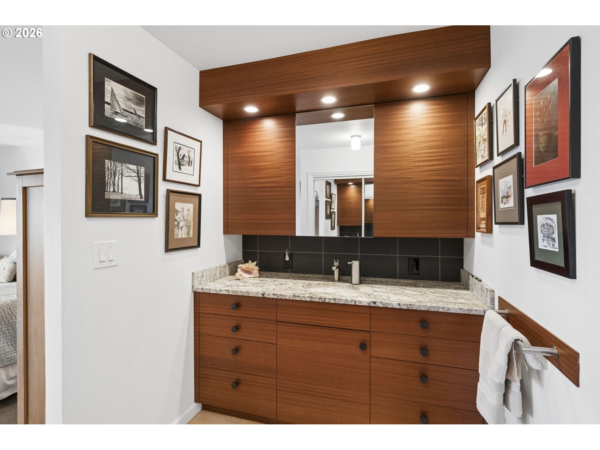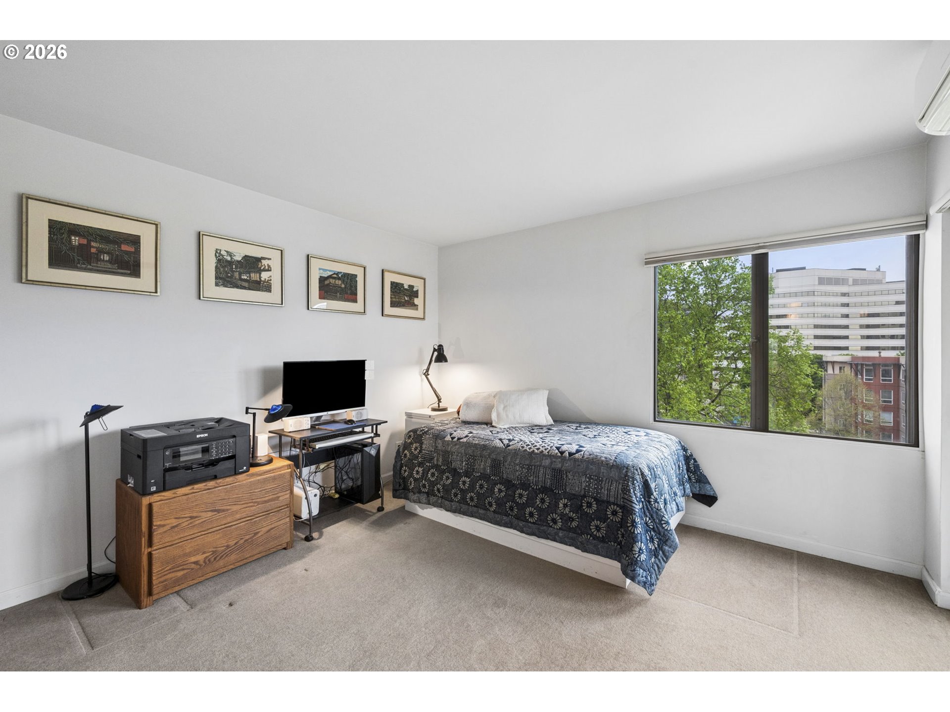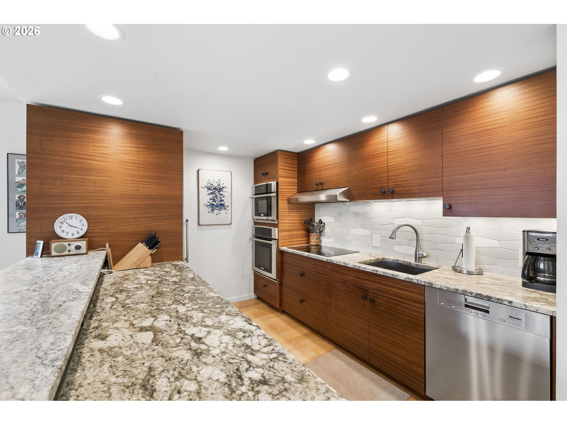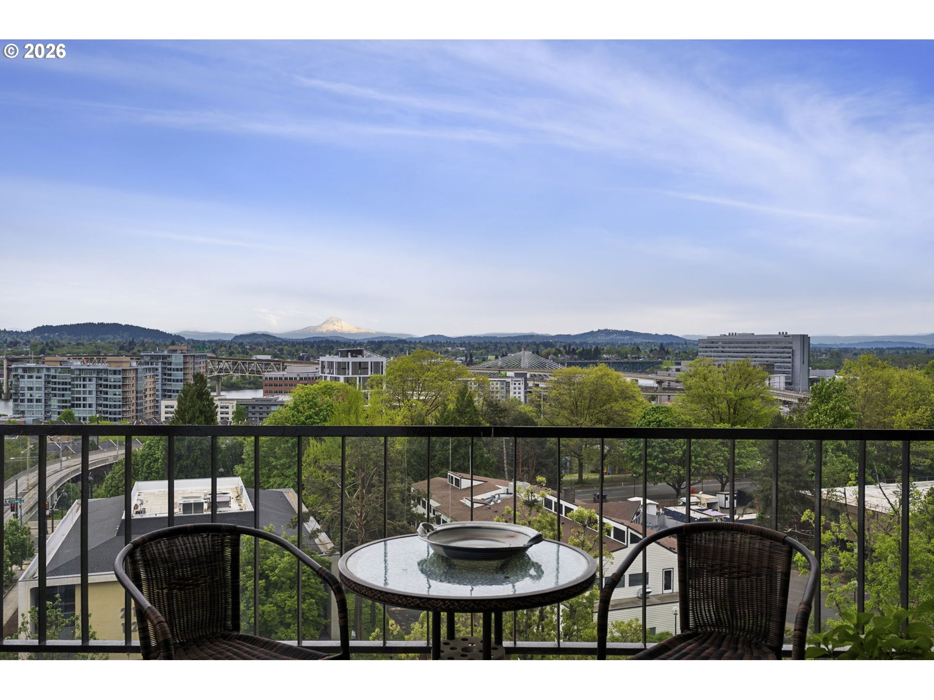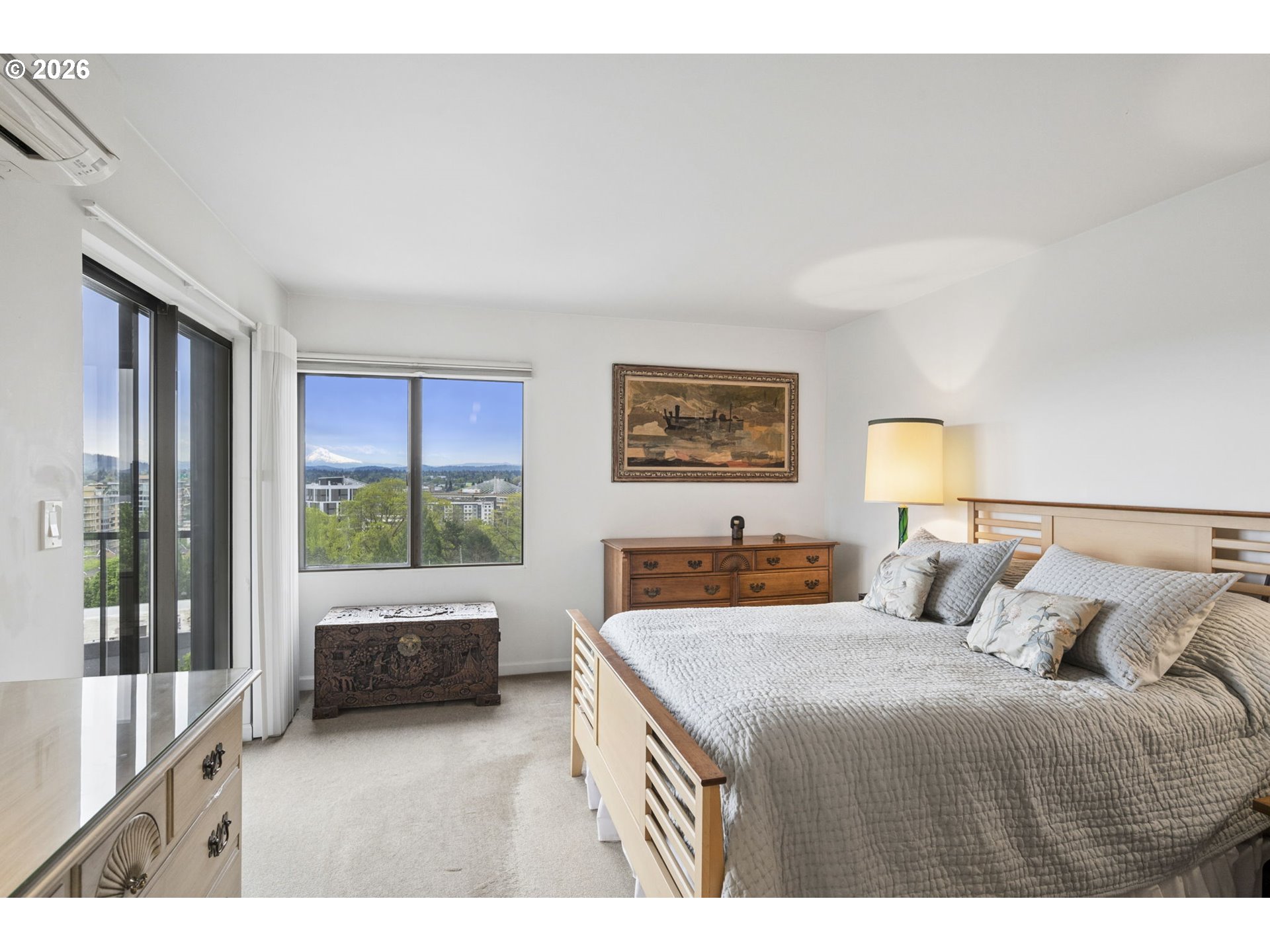 Beautifully remodeled, highly sought-after north-facing end unit in the Lincoln Tower. This quiet, light-filled home features an open floor plan with maple hardwood floors throughout and high quality New Zealand wool carpeting in the bedrooms.The expansive living room opens to a covered, tiled balcony showcasing stunning views of Mt. Hood and the Willamette River—perfect for entertaining or enjoying peaceful sunrises.The gourmet kitchen has been thoughtfully updated with custom Western African Sapele wood soft-close cabinetry, granite countertops, and high-end stainless steel appliances. It flows seamlessly into the dining area, which opens to a west-facing balcony—ideal for relaxing with sunset views and a glass of wine.The spacious primary suite includes a beautifully remodeled bathroom with granite and Sapele wood finishes, New Zealand wool carpet, and blackout Hunter Douglas window shades. It also opens to a the east-facing balcony with city lights and Mt. Hood views. The second bedroom offers convenient access to a nearby remodeled full bath and its own access to the west-facing balcony.Additional upgrades include:Mitsubishi mini-split systems in every room,Triple-pane windows and sliding doors system,Hunter Douglas window coverings throughout,New 50-gallon hot water heater,Water filtration system,Utility room with sink and storage.The unit also includes secure parking and storage on the convenient 1B level.Residents enjoy resort-style amenities, including a 24-hour concierge, indoor and outdoor pools, spa, sauna, fitness center, and community rooms with kitchens. Ample guest parking—rare for downtown—is also available.Ideally located near the waterfront, PSU, MAX, streetcar lines, and the downtown cultural district. Pet-friendly building with rental cap not yet met.