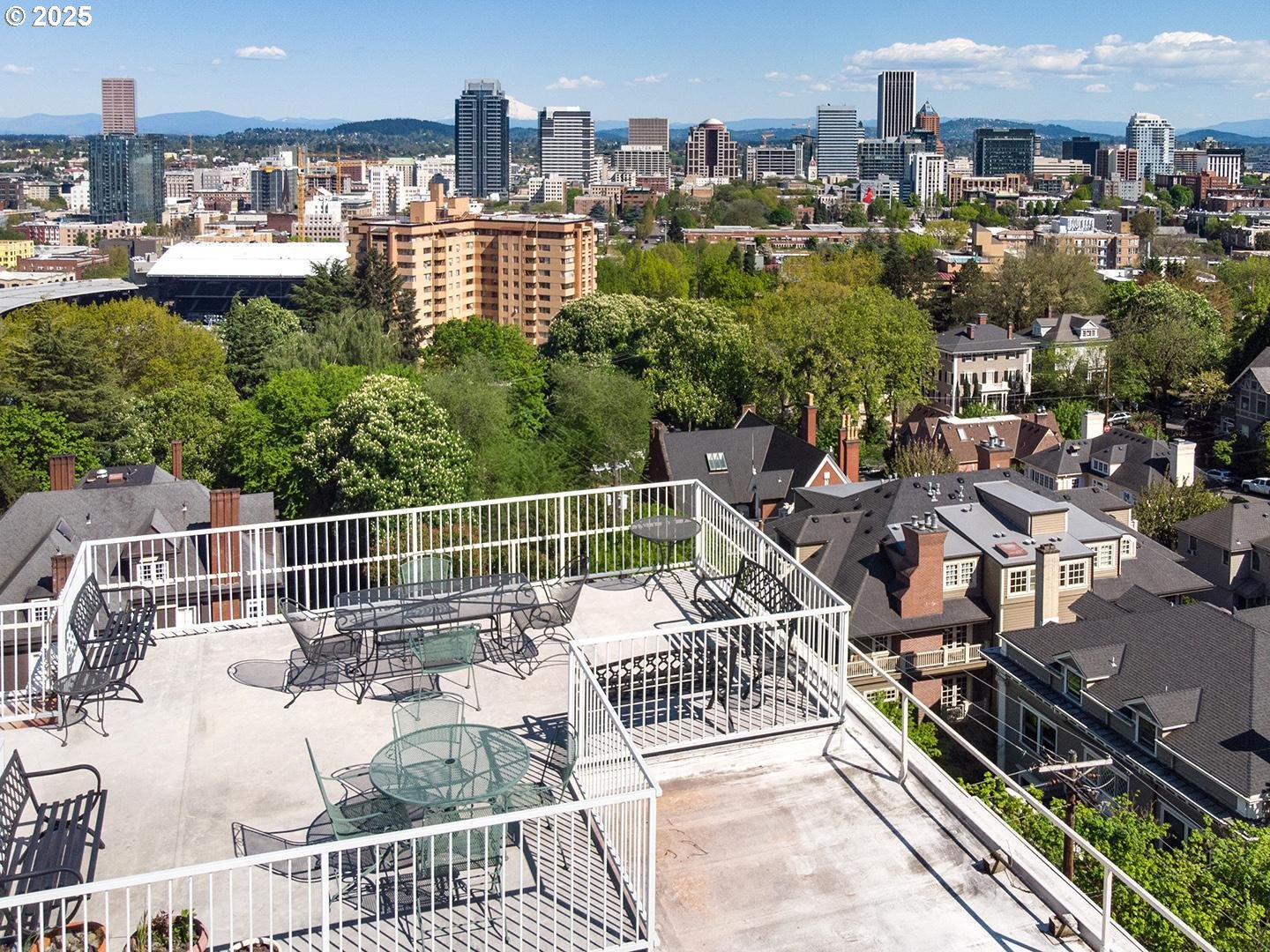 Enjoy city and territorial views along with lovely sunsets from this beautifully maintained 2bdr/2ba condo in a prime location offering an exceptional floor plan. Spacious living and dining rooms, custom window treatments, large windows and great natural light throughout. Numerous updates in kitchen and baths, including quartz and granite, stainless appliances, fixtures and hardwood flooring. The galley kitchen provides ample and deep cabinet storage along with a generous in-unit laundry/storage room. A covered patio to the west with room for a propane or gas grill. Amazing rooftop deck offering panoramic views and an updated weight room at the main level. One deeded parking space with a gated entry, and a 2nd secure storage room at the lower east parking area. Easy access to Washington Park, NW shopping and restaurants, MAX and a bus stop at the corner. A pet-friendly community and a well-run HOA. There is an opportunity to assume a 3.25% VA loan, as well, and buyer does not have to be a veteran.