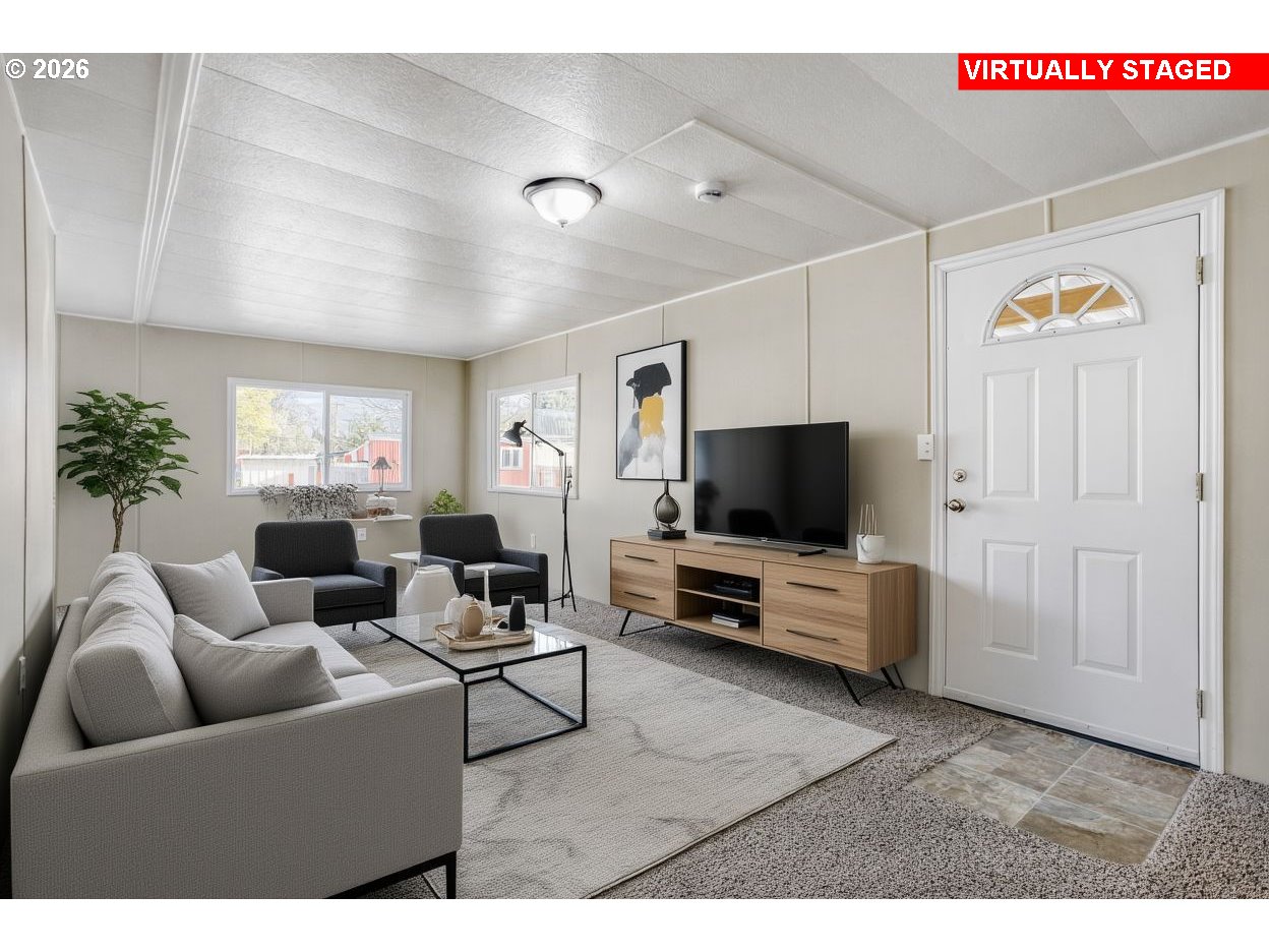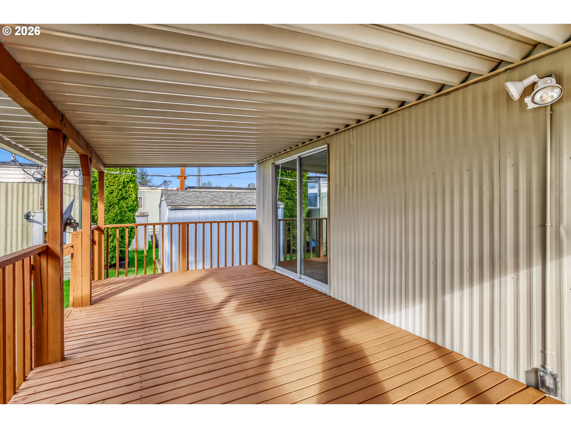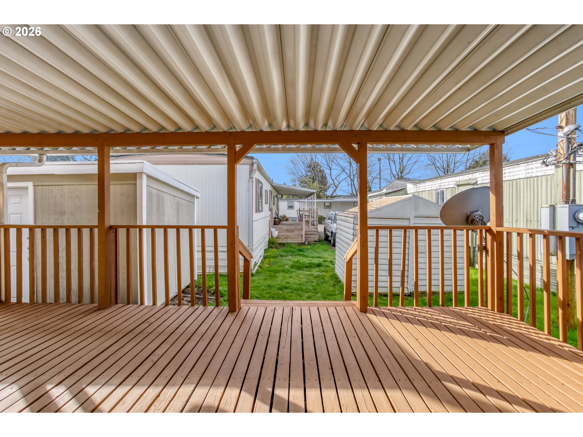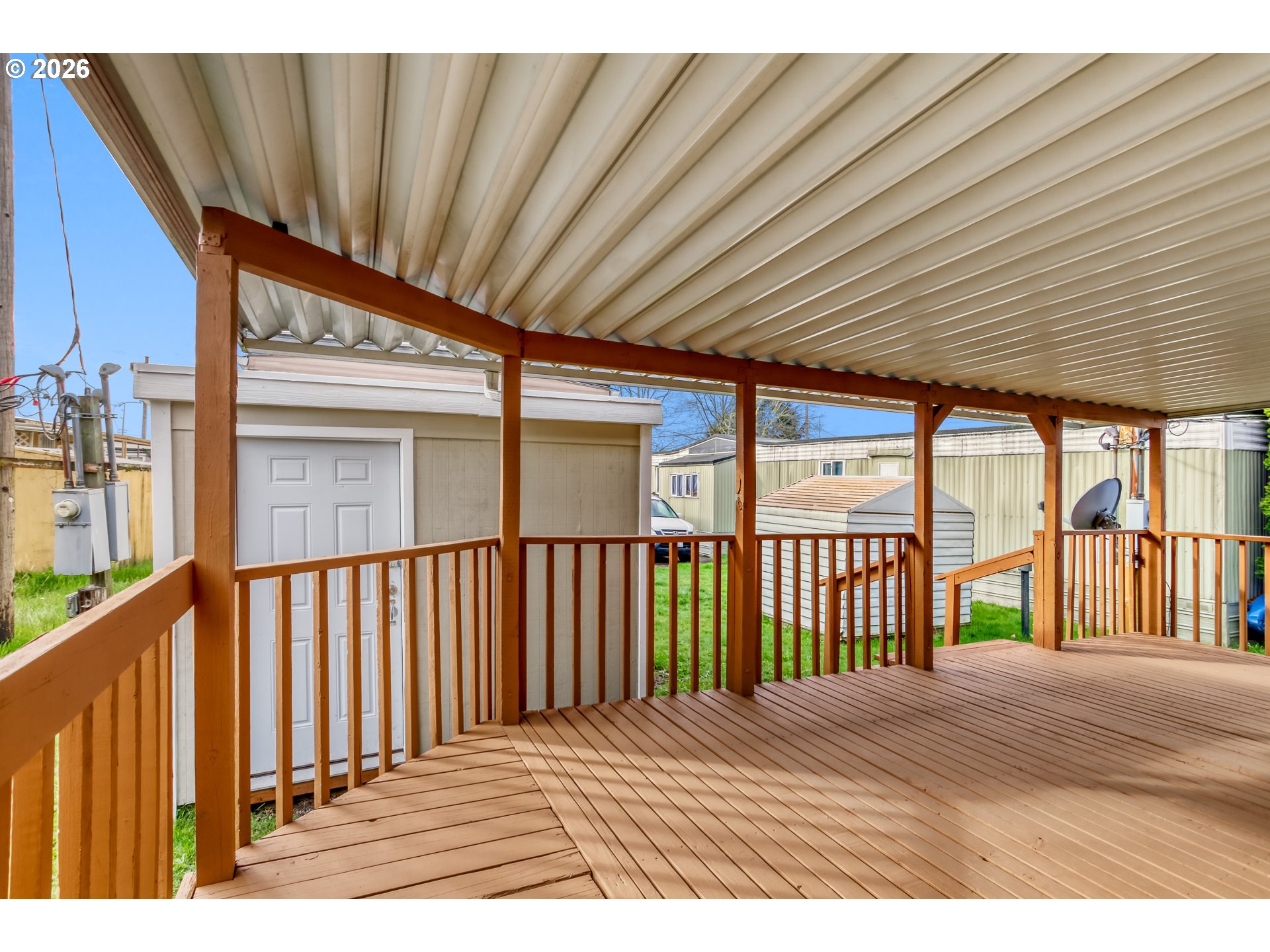 Updated double-wide manufactured home in Central Trailer Park, an all-age community in a convenient SE Portland location. This home offers a spacious layout with great natural light and numerous recent updates including a new roof, newer double-pane vinyl windows, fresh interior and exterior paint, recently serviced HVAC and new flooring throughout. The living room flows seamlessly into the dining area with built-in cabinetry and display shelving, while the kitchen features an eating nook, refrigerator, range, exterior access and a dedicated laundry space with hook-ups. The primary bedroom includes a sliding door leading to a fully covered deck that extends along the home, ideal for year-round outdoor enjoyment. Covered carport parking with space for two vehicles plus a tool shed for additional storage. Space rent is $820/month (garbage included; water/sewer billed separately) and the park offers secure mailboxes. Two indoor pets allowed up to 20lbs. Financing available!