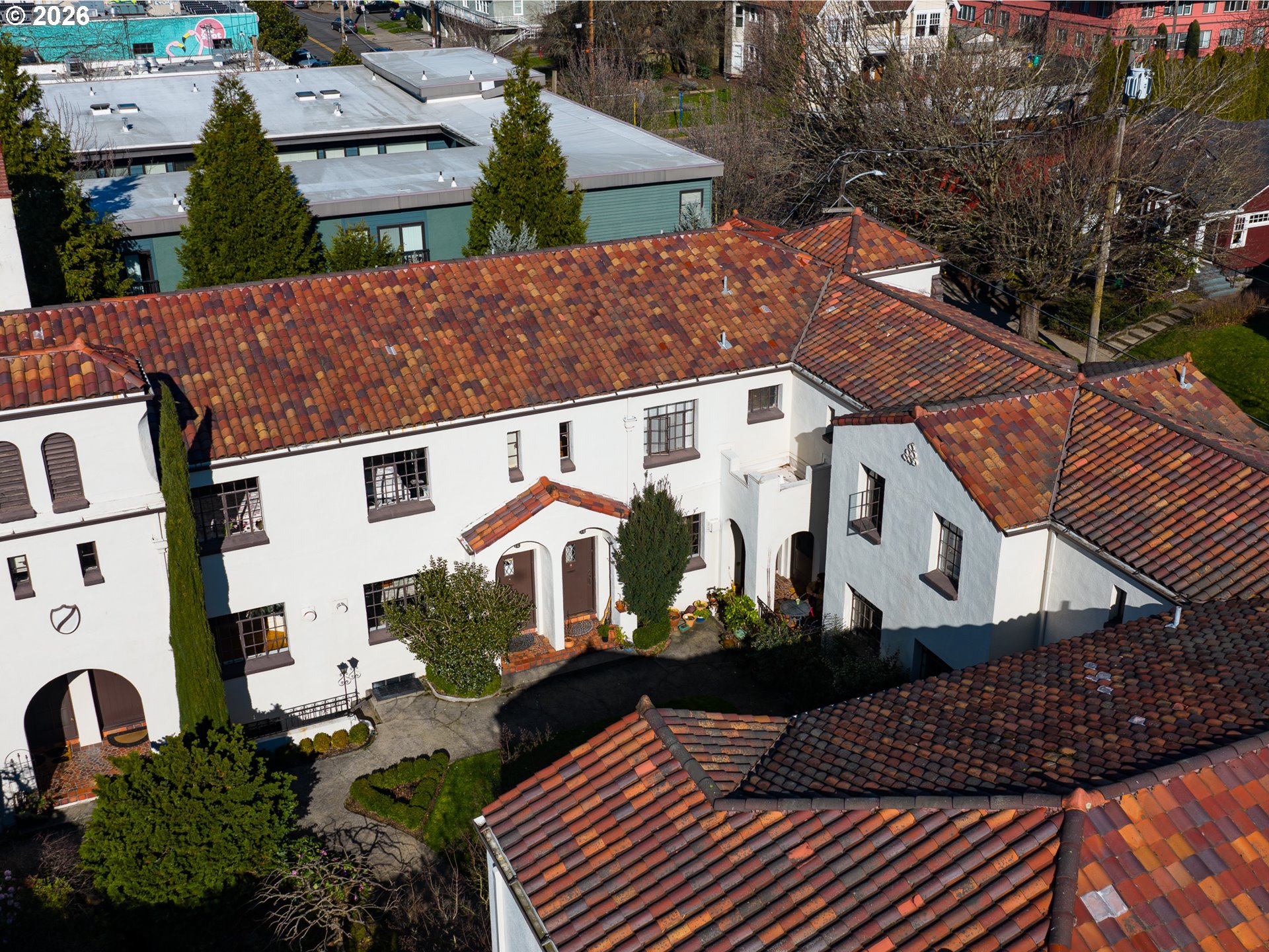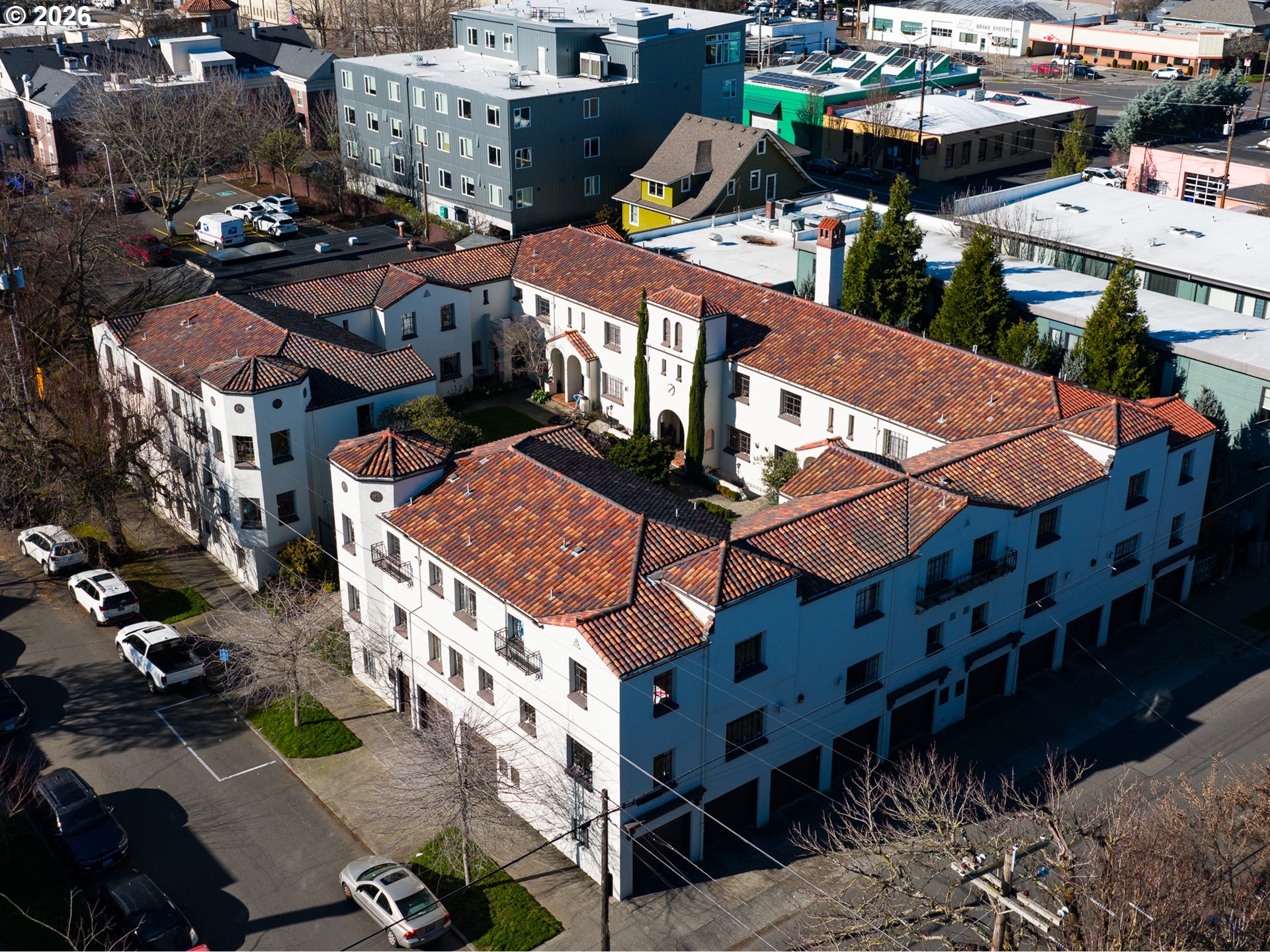 Built in 1928 during an era when architecture embraced curves, natural light, and thoughtful design, this residence was designed by noted architect Carl Linde and is recognized on the National Historic Register. It blends timeless character with carefully integrated modern updates — striking a balance that feels both authentic and effortless. Southern-facing windows invite in abundant natural light, illuminating warm hardwood floors, soft archways, and a gracefully curved staircase accented with decorative wrought-iron detailing. The spaces feel welcoming and intentional, defined by architectural form rather than fleeting trends. Upstairs offers a peaceful retreat, with bedrooms kept comfortable year-round by newer mini-splits and mornings that begin softly in filtered light. The main level is designed for gathering, anchored by a freestanding Jøtul gas fireplace and flowing naturally into a thoughtfully updated kitchen featuring stainless steel appliances and a five-burner gas cooktop — where modern function meets enduring charm. Situated within a secure, gated courtyard framed by lush landscaping and a tranquil water feature, the home also includes storage, bike amenities, and shared community spaces that create both convenience and connection. Just beyond the gates, Portland unfolds — cafés, vintage shops, neighborhood grocers, and effortless access to the beloved Kerns district, all within a few blocks, complemented by an impressive 100 Bike Score and 96 Walk Score. Light-filled and architectural. Warm, storied, and unmistakably Portland. Ready to welcome its next chapter.