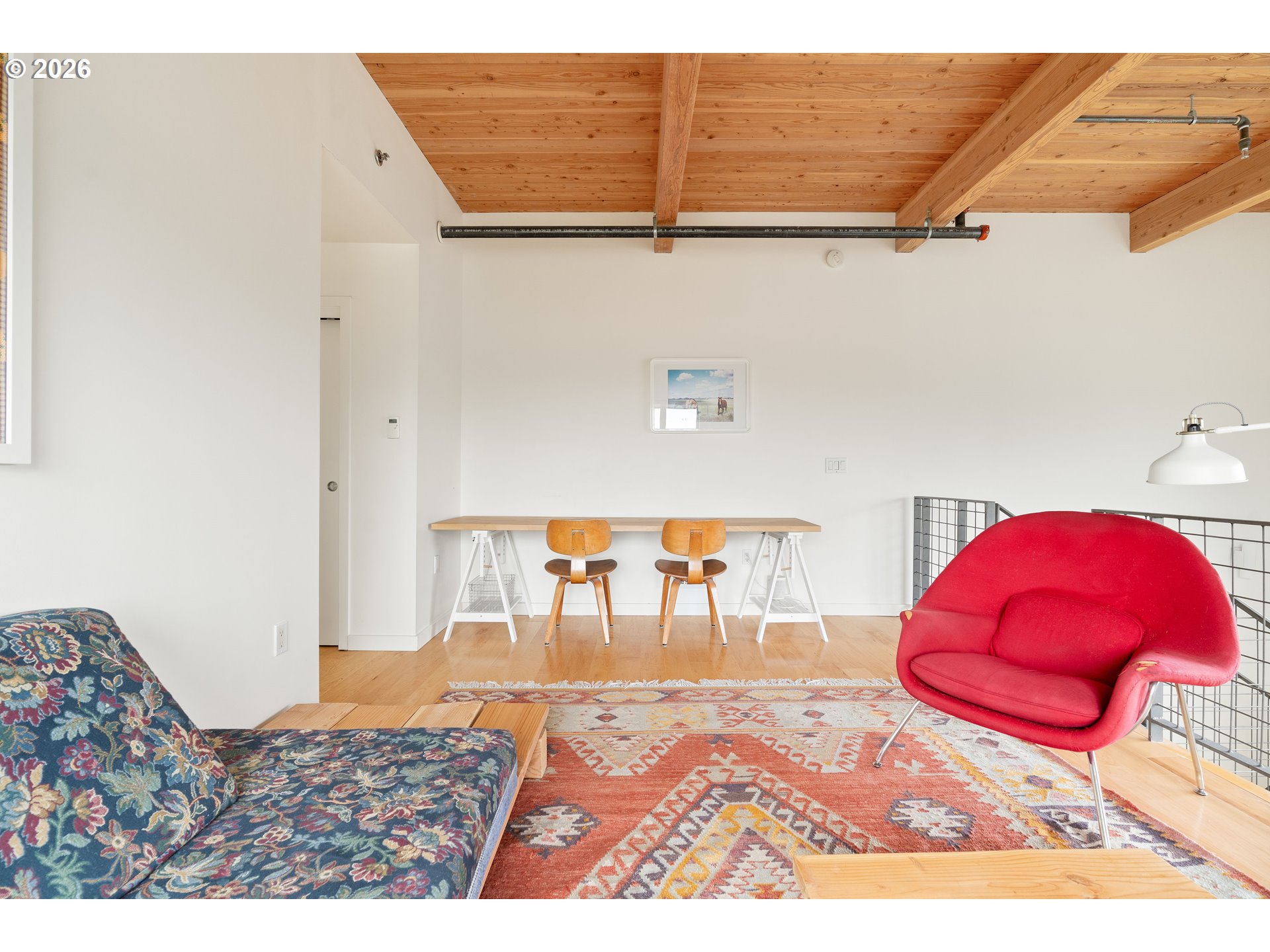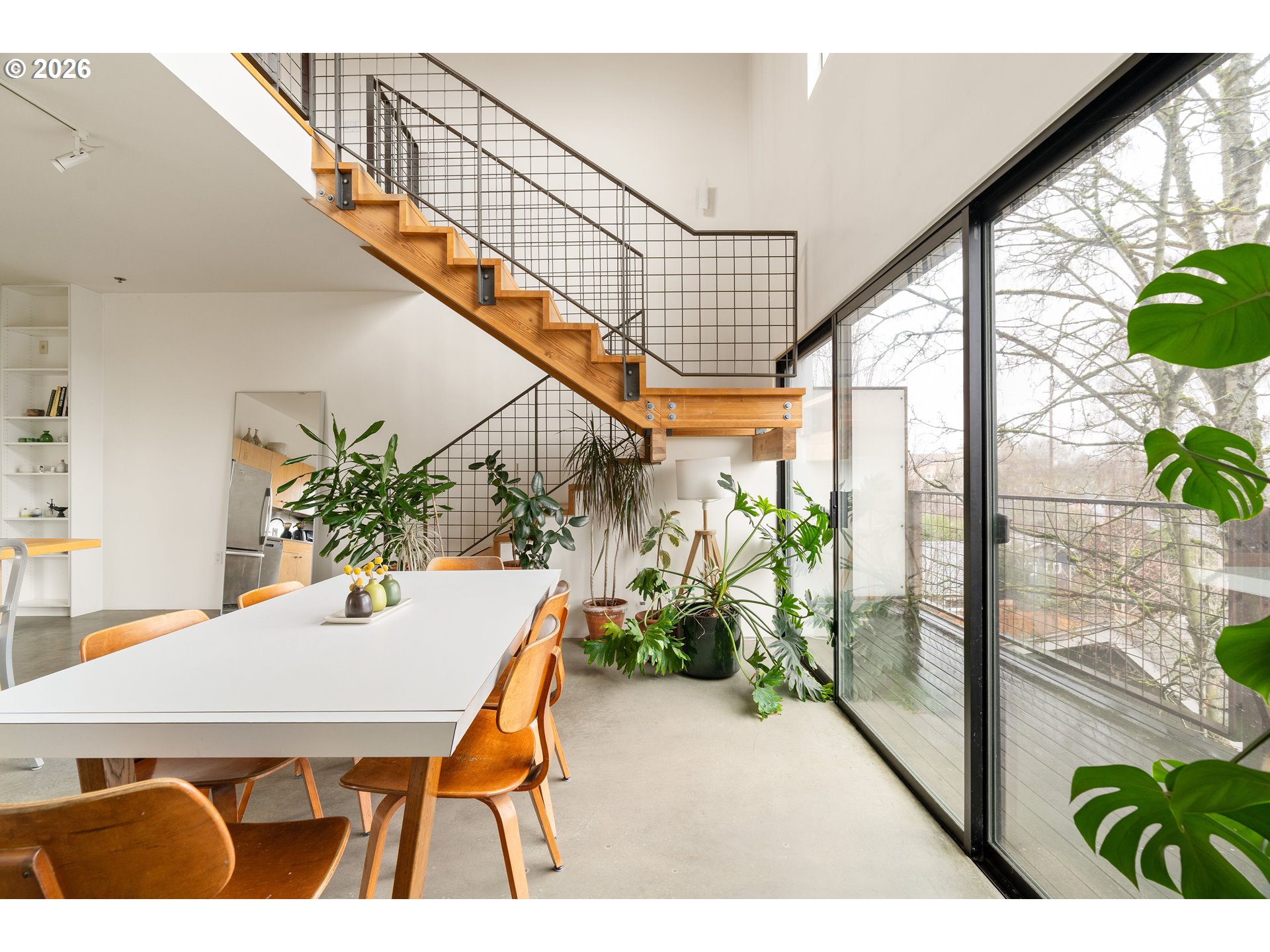 Rare opportunity to own the most desirable unit in the esteemed Meranti Lofts building. Designed by the award-winning firm Holst Architecture and named for the natural Meranti wood that graces the exterior of this stunning building, this large corner unit offers privacy and coveted private outdoor spaces that most of the other units do not have. Step inside and be captivated by the soaring, two-level vaulted ceiling that spans the kitchen, dining, and living spaces, creating an airy, light-filled environment. Large Northeast-facing windows flood the interior with natural light, highlighting the high-quality materials throughout. Built in 2006, this loft features concrete floors with integrated radiant heat, natural wood tongue and groove ceilings, and large sliding glass doors in the living room. Enjoy indoor-outdoor living with two private outdoor decks offering serene views of Mt. Tabor and surrounding trees. The natural wood and metal floating staircase is a centerpiece, leading to a large floating loft area—a perfect flex space for a home office or a casual living area, complete with a seasonal peek-a-boo view of Mt. Hood. The primary suite is a modern retreat, featuring a large closet with organizers and the convenience of an in-unit washer and dryer. It also includes a private covered deck and a large, sun-drenched bathroom. A second bedroom on the main level is perfect for guests or a private office. Ductless mini-splits provide A/C in the bedrooms for comfort during the warmer months. Embrace a vibrant urban lifestyle with top restaurants/cafes like L'Echéle and Stumptown Coffee outside your door, and minutes from Division Street's famed restaurant row, New Seasons. A dedicated covered parking space and a secure storage locker are included, completing this perfect package for sophisticated city living.