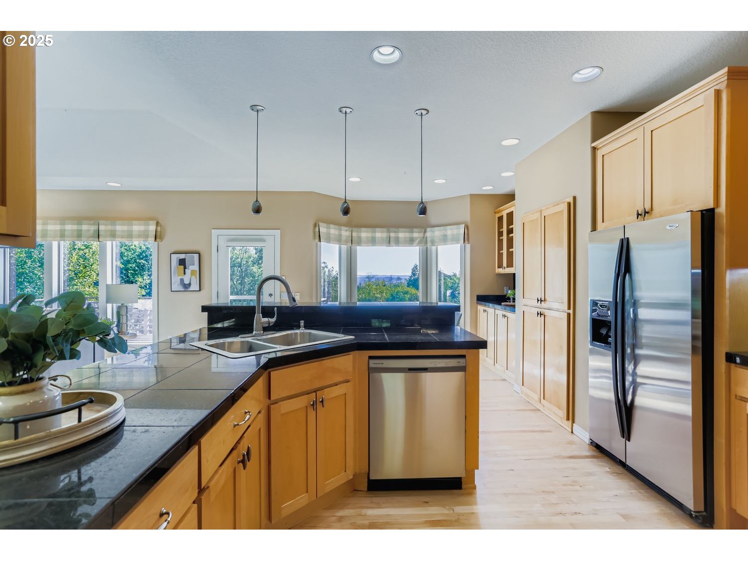 Views! Situated at the end of the cul-de-sac this home offers luxury, views and privacy! Light, bright & a entertainer's dream of classic elegance in a private Forest Heights setting on almost 1/2 acre of land with forest & valley views! Huge entry with freshly polished Maple hardwood floors lead you into the formal dining area. Office has French doors & is light and bright. Spacious Family room has a gas fireplaced with stunning views & is open to the Kitchen. This kitchen is a cook's dream and comes with Stainless steel appliances, buffet with built in cabinets, pantry, Granite counters, plenty of maple cabinets, peninsula with eat bar, eating area with door to the large deck which has a gas hook up for your BBQ. Newly painted Primary Bedroom with valley views on the main has private bath with 2 separate sink vanities, shower, water closet and walk in closet with built ins. 10' ceilings in dramatic lower level Great room that has a wet bar with refrigerator and door to the lower level deck with hot tub. 2nd primary suite plus 2 nice size bedrooms makes this a great private space. Enjoy the stunning Valley Views from both upper and lower decks. Sloped yard has a Level grassy area with garden. Oversized 2-car garage has built-ins. New Carpet, freshly polished Maple Floors & Many upgrades throughout make this home perfect! Convenient location to Hillsboro or downtown PDX! No HOA! [Home Energy Score = 4. HES Report at https://rpt.greenbuildingregistry.com/hes/OR10241419]