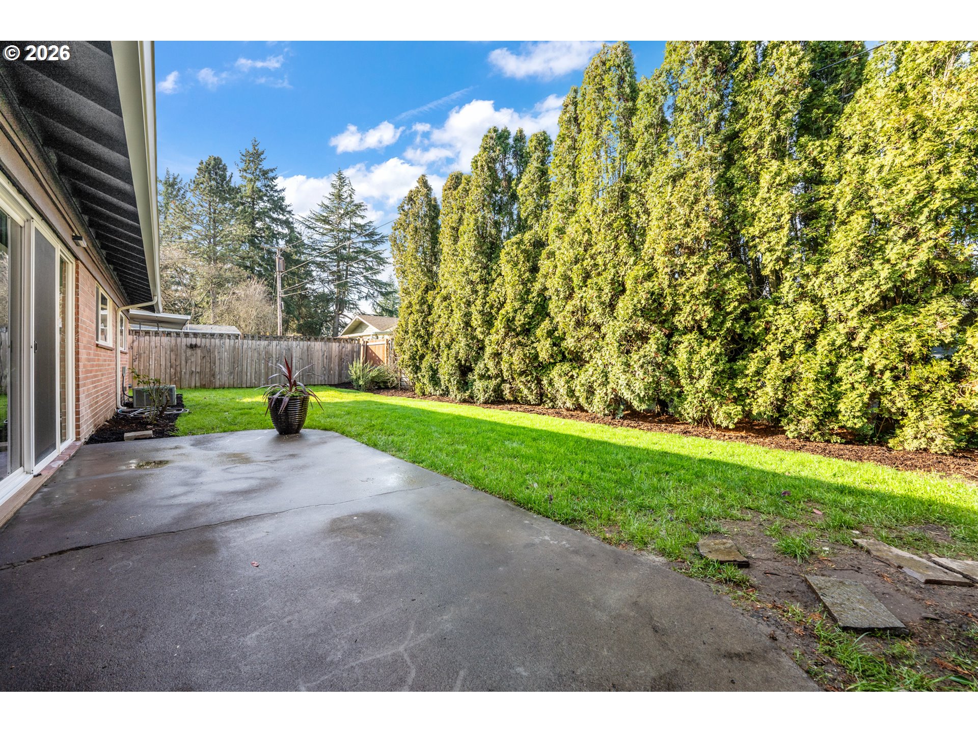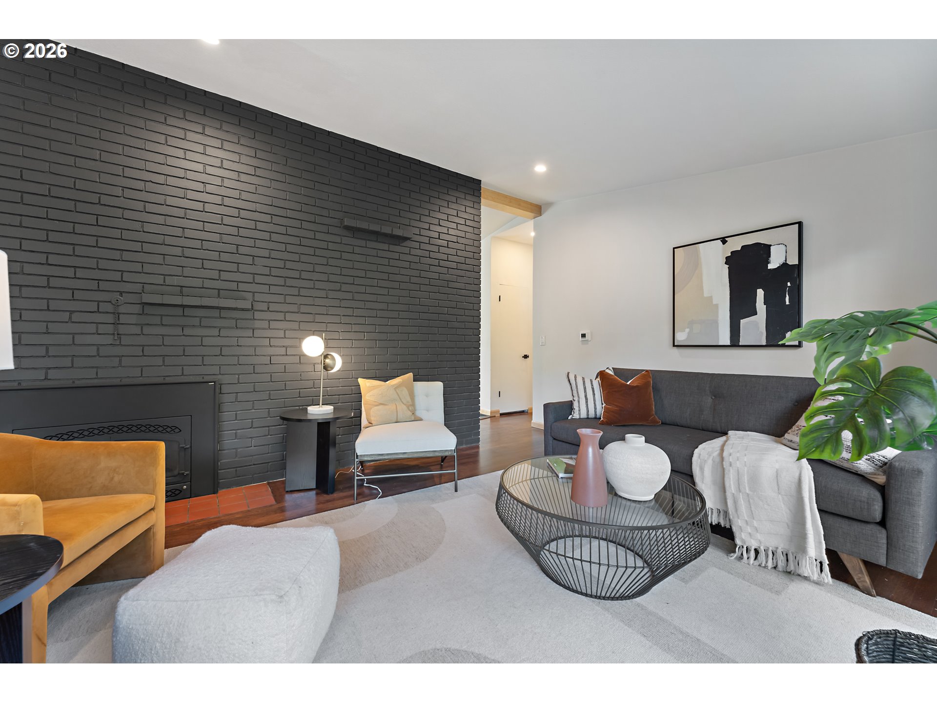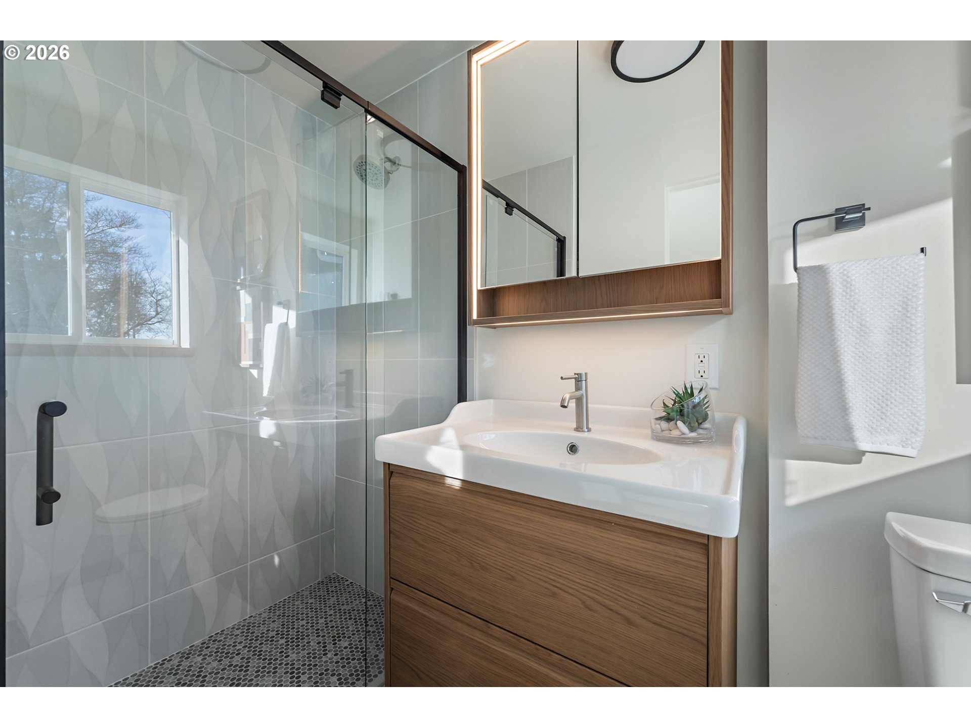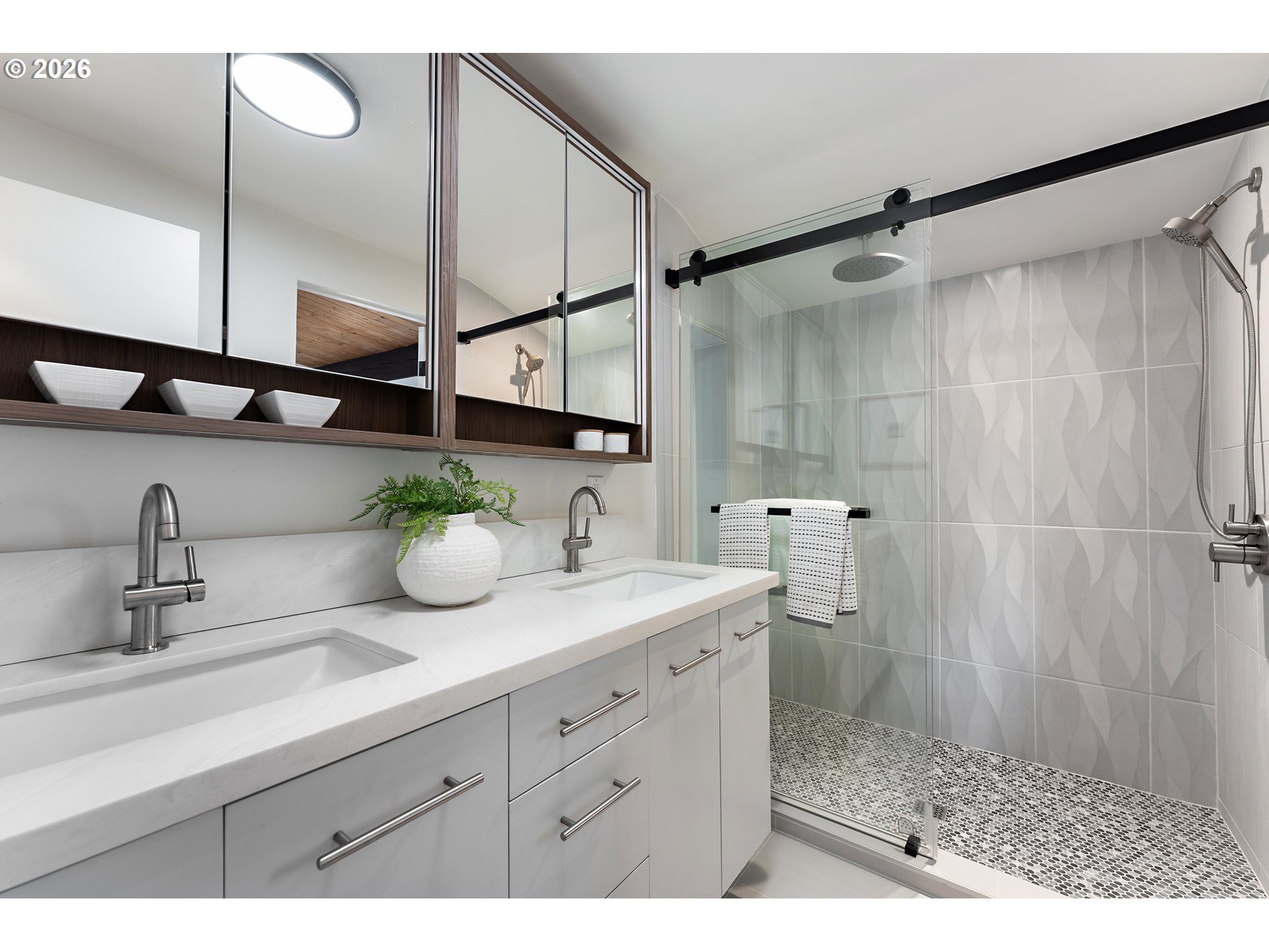 Meticulously updated 1956 mid-century modern ranch with contemporary finishes. Original hardwood floors, period double fireplace, vaulted ceilings. Beautifully remodeled kitchen with custom solid wood cabinets, quartz counters, large pantry, and stainless-steel appliances, including a built-in induction range that flows to a cozy family room and spacious entry. The light and airy living & dining space opens to the fully fenced back yard with an expansive patio that is perfect for outdoor entertaining. A total of four bedrooms and three full baths, including a primary suite with a vaulted tongue and groove wood ceiling, double closets, walk-in shower and custom tile work. A second primary also offers a vaulted ceiling, a walk-in shower and custom tile work. New windows, roof, plumbing, updated electrical, interior and exterior paint, and furnace. The home offers a large tool/garden shed and enclosed exterior storage area on the north side of the home. [Home Energy Score = 1. HES Report at https://rpt.greenbuildingregistry.com/hes/OR10236922]