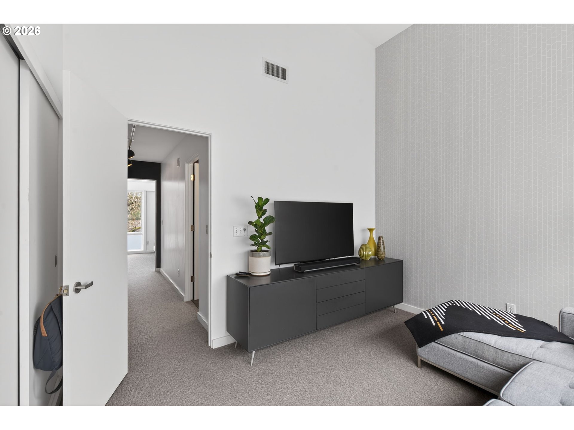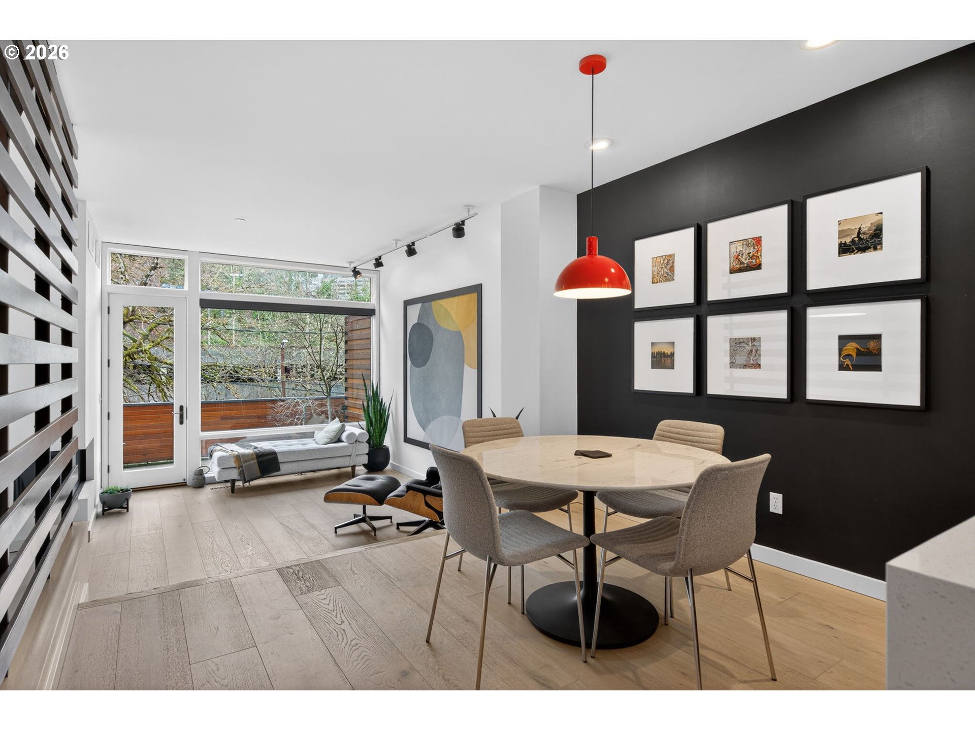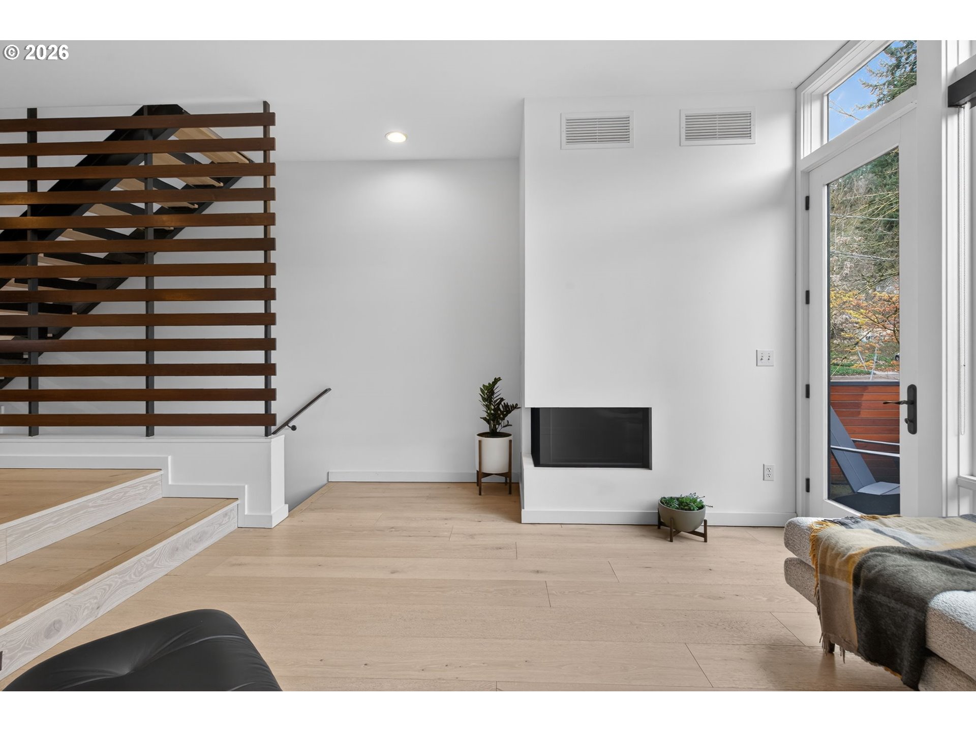 The gem of the community - completed remodeled with high end finishes throughout each level. Welcome to this tucked away boutique condo building just a few minutes from downtown, yet offering a sense of true privacy. The community offers a modern look with stylish interiors. This condo lives like a true home with an open floorplan on the main living level and wide plank oak flooring with walls of windows and three directional light. The living room offers a custom gas fireplace and stone suround, a wall of windows with a slider out to a very useable deck space great for outdoor dining or lounging. The kitchen has been expanded with solid surface waterfall countertop, large eating peninsula, high end appliances, and ample storage. Great space for a true dining table open to the kitchen as well. Slatted wood accent wall leads to the upstairs where you'll find a true owners suite with vaulted ceilings, full bathroom with skylight, and high end finishes. Ample sized second bedroom can function well as a den/office. Lower level entry with access to oversized tandem garage great for storing toys, outdoor gear, or vehicle. Literally minutes to downtown core, access to the freeway, and shopping. Just blocks to restauraunts, PSU, Farmers Market, MAX train, and parks.