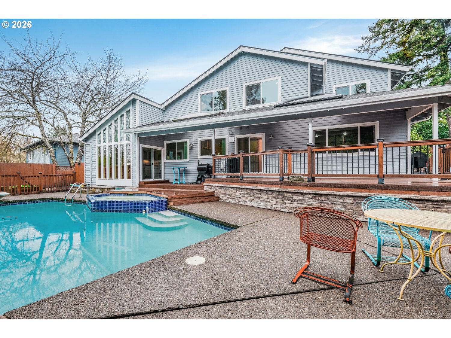 Stunning upscale contemporary home set on a private .24-acre lot surrounded by mature trees and territorial views. Bright and airy with vaulted ceilings, floor-to-ceiling windows, and gorgeous hardwood floors throughout. This home is designed for effortless living and entertaining. The inviting living room features soaring ceilings and a dramatic stacked-stone wood-burning fireplace. Chef’s kitchen offers stainless steel appliances, eat-bar seating, pantry, and seamless flow to gathering spaces. Spacious family room showcases another fireplace, vaulted ceiling, custom built-ins, and a wet bar that's perfect for hosting. Indoor-outdoor living shines with two sets of sliders from the family room to a private patio and a large 41x13 covered deck overlooking the in-ground pool and hot tub. Fully fenced backyard provides exceptional privacy with raised garden beds and room to relax or play. Main-level primary suite includes double closets, private bath with dual vanity, and direct access to the covered deck and pool. Second bedroom on main level is ideal for a private office or guest space. Upstairs features two generous bedrooms, a full guest bath, and a versatile bonus room with skylight that's perfect for a media room, guest retreat, or creative space. Ideally located close to dining, shopping, schools, neighborhood parks, and nature trails. A rare blend of privacy, style, and lifestyle, this home truly has it all.