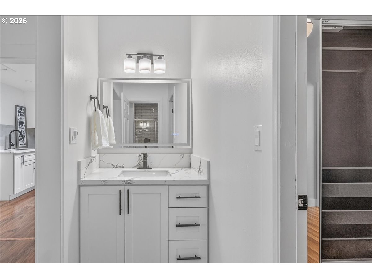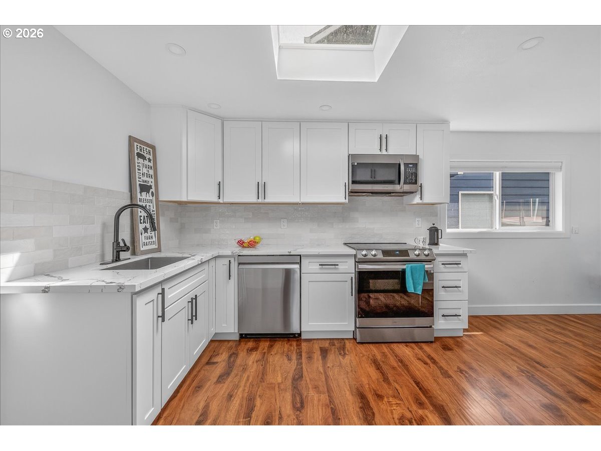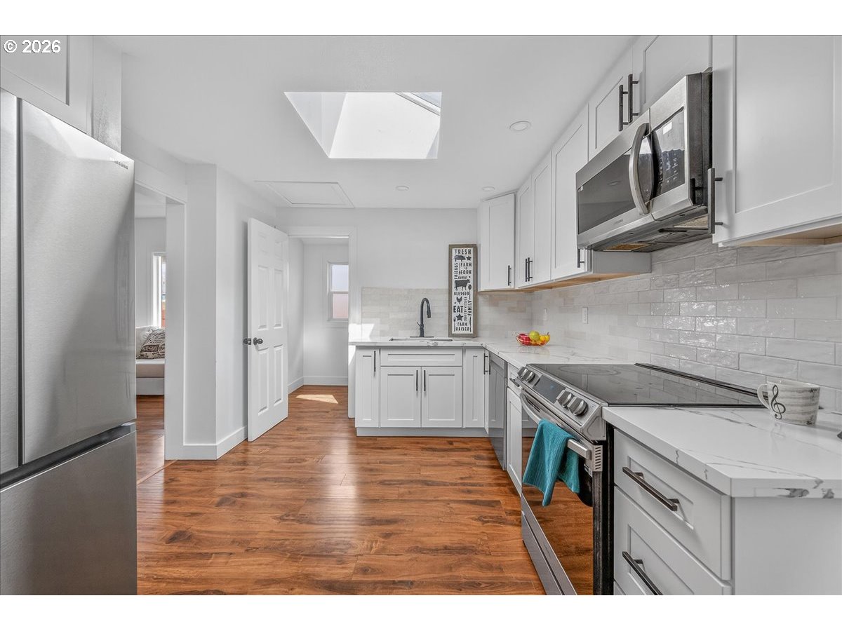 (503) 893-8874Move-in ready. New roof (2023). 6 bedrooms, 3 full bath home with 2 separate front entrances. North one: 4 bd/2 bath, living rm & kitchen/dining rm, south one: 2 bd/1 bath, living rm & kitchen space w/dining area; Buyers to do own due diligence. Main-level spacious master bd w/large WI closet. Fresh & bright, vinyl floor, tastefully remodeled kitchen and bathrooms w/quartz countertop and new cabinets with appliances. Basement is spacious for storage. New roof. Conveniently located for shopping, bus line, PCC SE Campus. Easy access to Hwy 205. Fruit trees in the front yard. Fenced backyard, well-maintain. with so much possibilities. HES - 1.