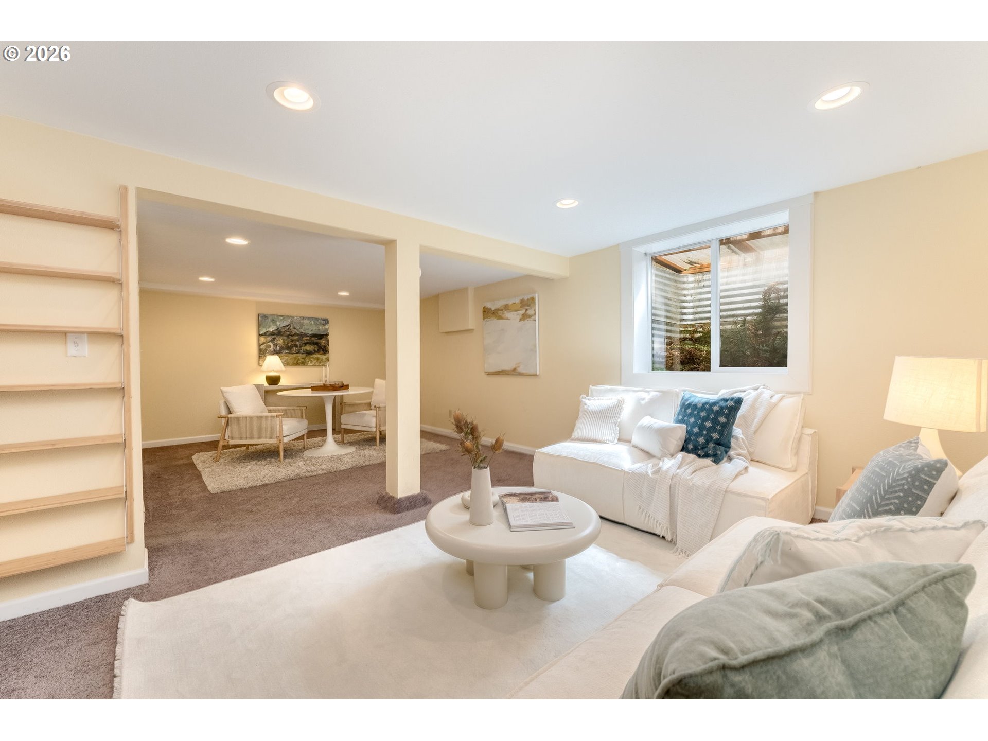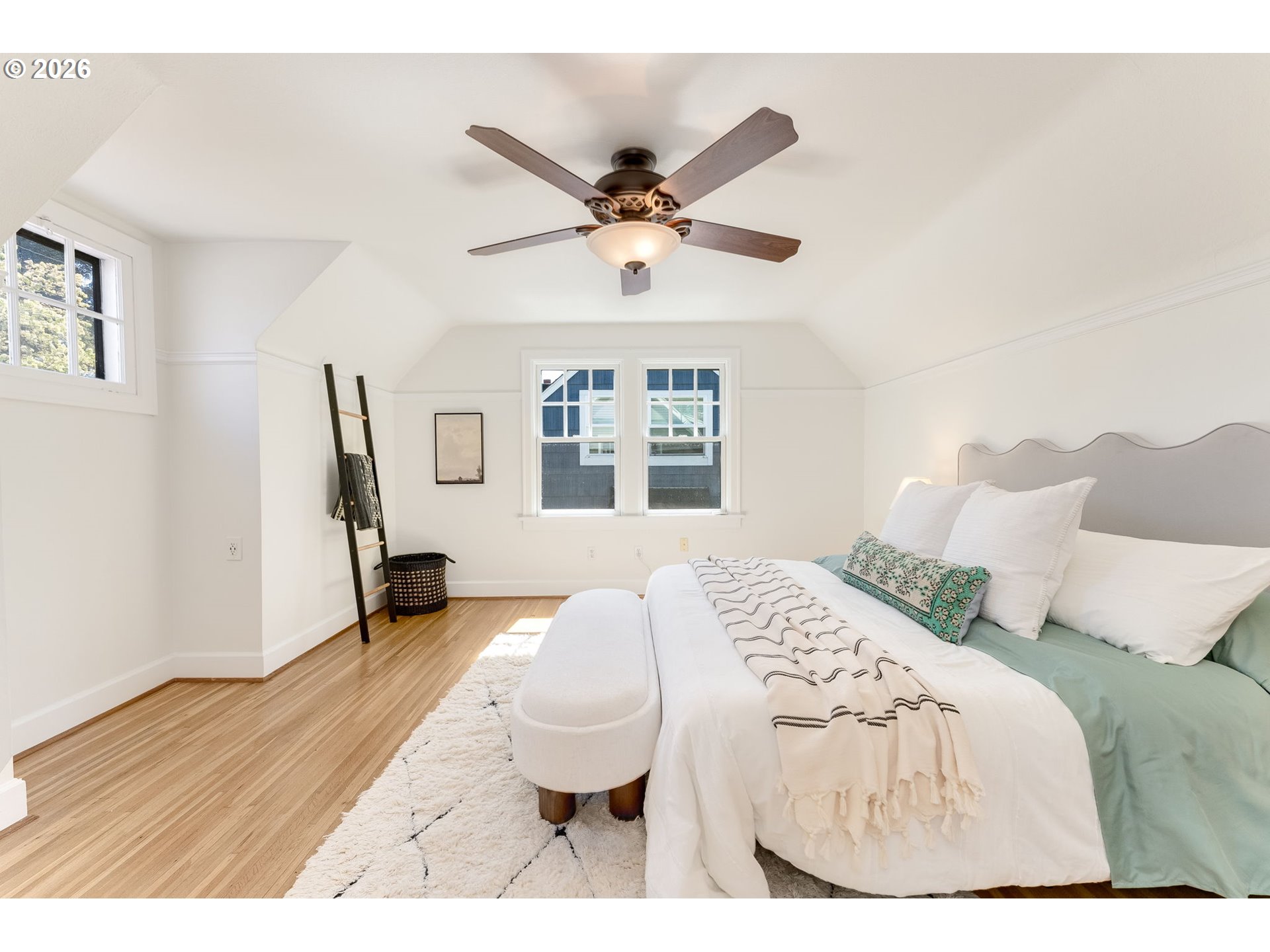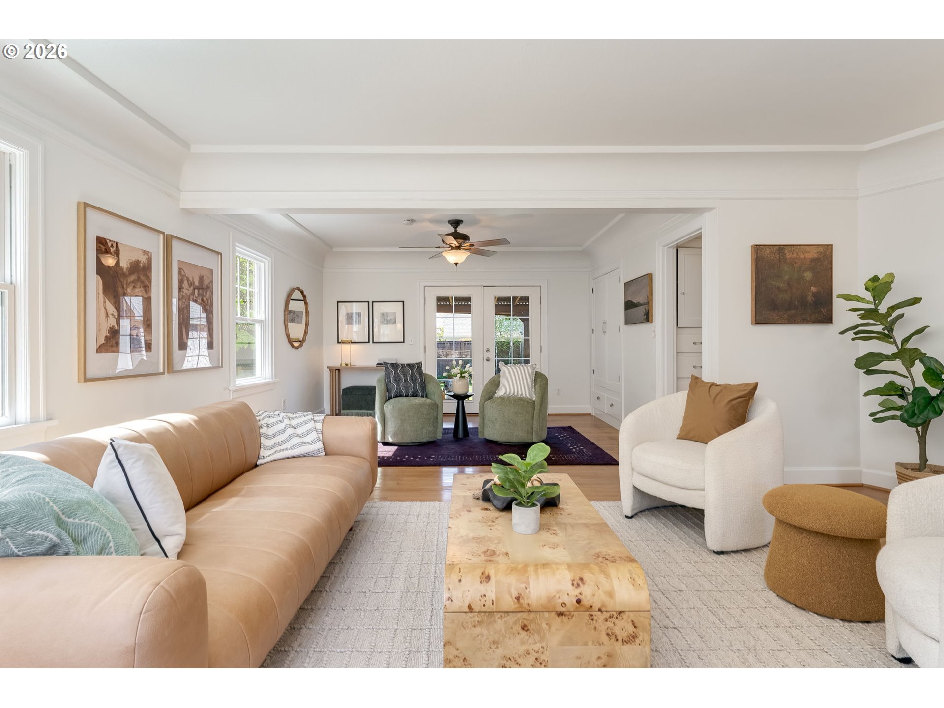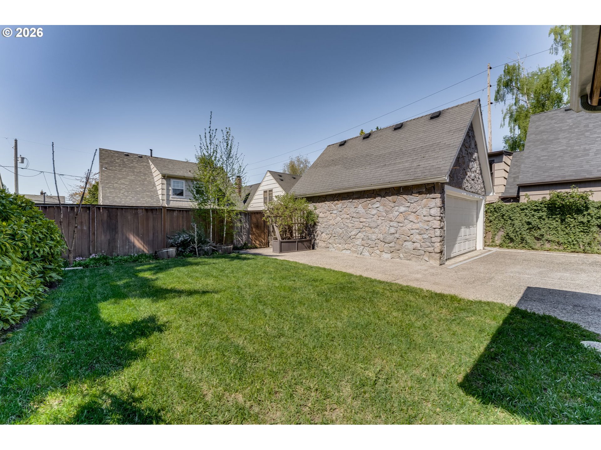 Perched on the tree-lined streets of Portland’s beloved Alameda neighborhood, this enchanting Storybook Tudor feels like something out of a fairytale—blending timeless architecture and cozy elegance. With its striking brick and stonework, leaded glass windows, and arched doorways, this home captures the romance of a bygone era while offering the comfort of modern updates. Inside, original hardwood floors, charming built-ins, and an ornate fireplace create a warm, inviting atmosphere. The light-filled, expanded living room flows effortlessly, while French doors open to a covered patio for year-round enjoyment. A dedicated dining room with classic built-ins is perfect for gatherings. The galley kitchen adds a delightful twist with its vibrant pink design—full of personality, charm, and whimsy. Just off the kitchen, a versatile main-level den can serve as an office or third bedroom, paired with a beautifully finished marble bath. Upstairs offers two spacious bedrooms and another full marble bath, creating a peaceful retreat. The lower level features a large great room with egress, a non-conforming fourth bedroom, and a partial bath—ideal for guests. Outside, the fully fenced yard showcases a mature garden with native plantings and seasonal blooms. A long driveway allows easy off-street parking, while the rare detached two-car garage with attic storage adds convenience. Thoughtful energy-efficient upgrades—including forced air heating and cooling, enhanced insulation, and solar-powered ventilation—ensure year-round comfort. Located in one of Portland’s most sought-after neighborhoods, Alameda offers a strong sense of community, beautiful streets, and easy access to parks, cafés, dining, and shopping.