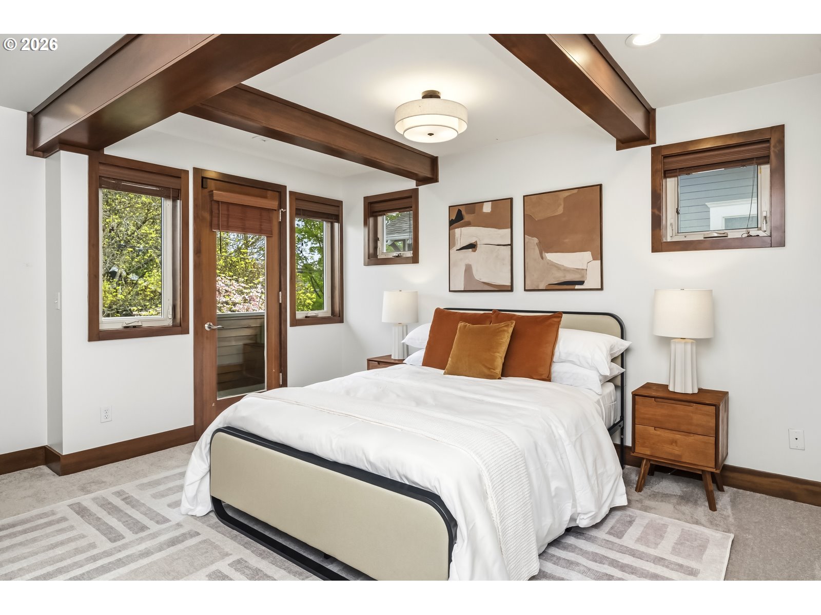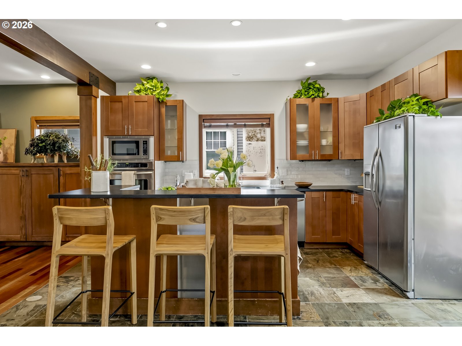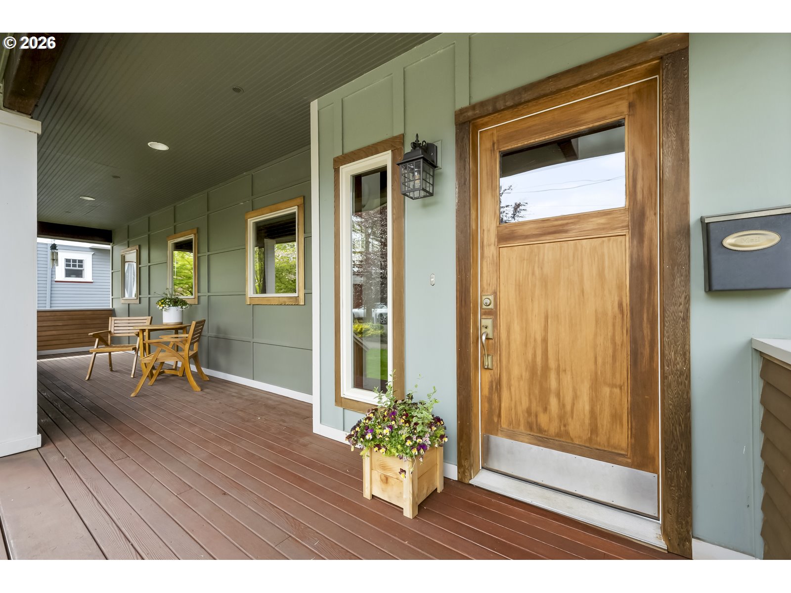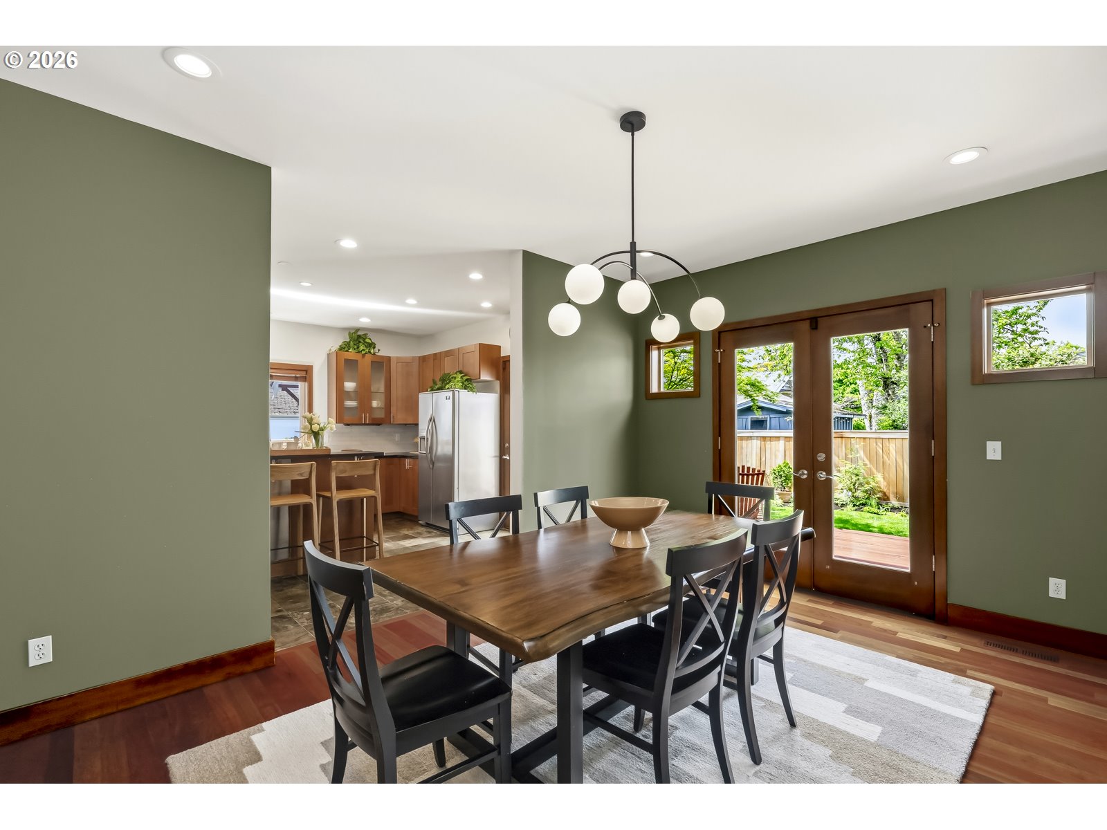Discover a home that blends classic Craftsman warmth with modern construction and contemporary touches. Step into an inviting entryway framed by exposed wood ceilings, slate tile, and tall windows that flood the space with natural light. The open concept main level is bright and airy, grounded by rich hardwood floors, custom cabinetry, a gas fireplace, and a sleek staircase. The kitchen flows seamlessly into the dining and living areas so you can stay connected while entertaining. An additional front room provides a welcoming workspace, den, or extra bedroom. Upstairs, a sunlit landing with hardwood floors doubles as a reading nook or plant retreat and adjoins the hallway to four bedrooms all with new carpet. Unwind in the primary suite with its private balcony, exposed wood beams, walk-in closet, and jacuzzi tub while the kids or guests enjoy one of the three additional bedrooms, each with tall ceilings and generous closets. Also upstairs is a second bathroom and tucked away laundry area. A long driveway ends at a detached garage with additional side parking and a tree shaded back yard. Entertain on the deck with access to the kitchen, dining room, and a mud room that has a convenient sink. A two-block walk takes you to the neighborhood ridge and parks, where you can stroll along the golf course and take in stunning views of Mount Hood. As a bonus, rooftop solar powers the entire house for $17/month electricity bills and produces enough additional energy to charge an EV. [Home Energy Score = 7. HES Report at https://rpt.greenbuildingregistry.com/hes/OR10148588]