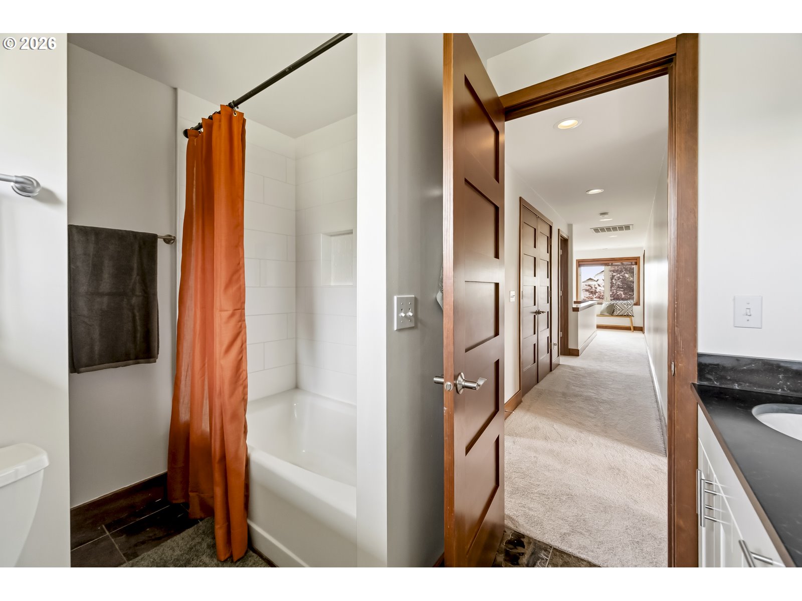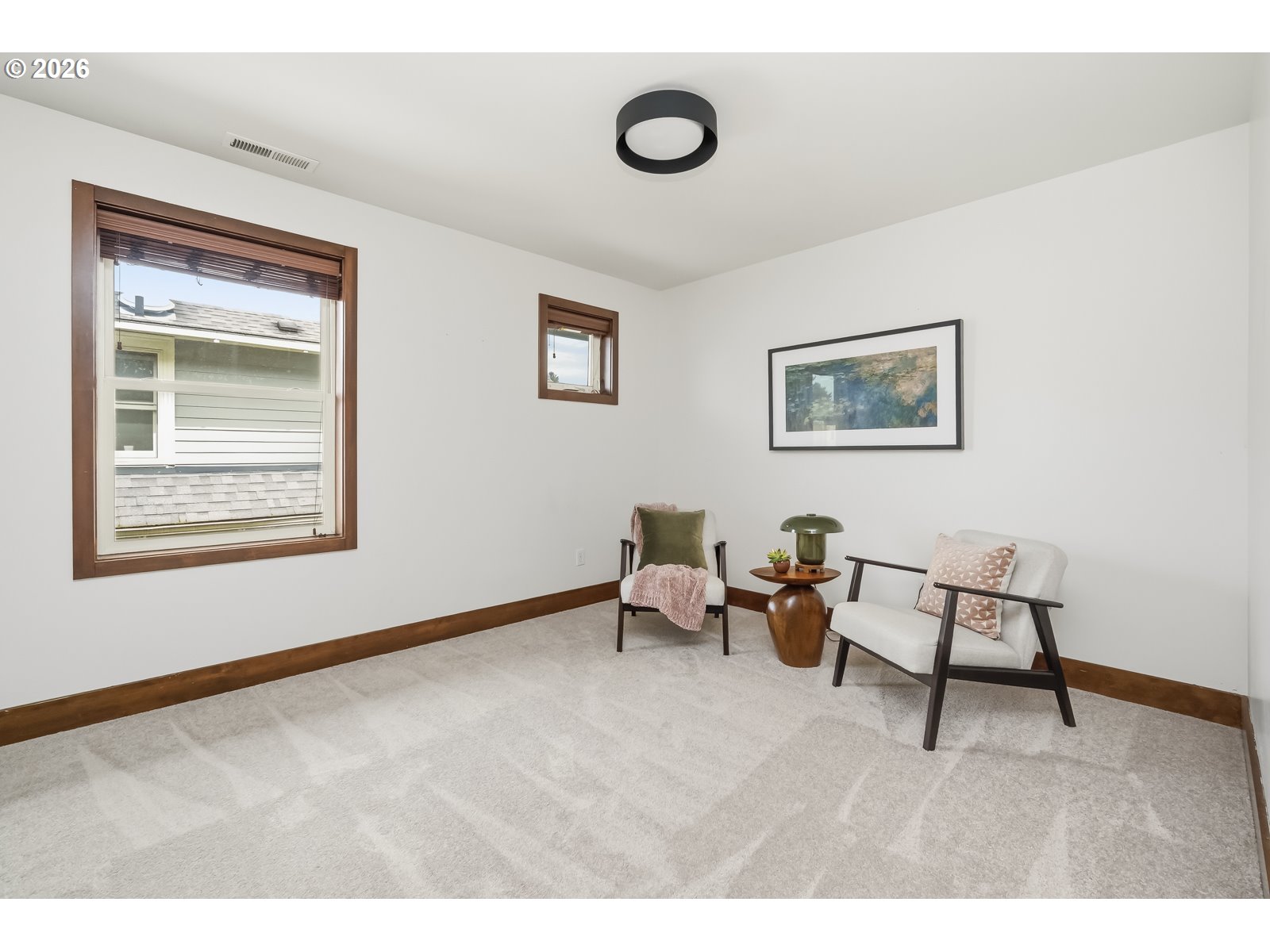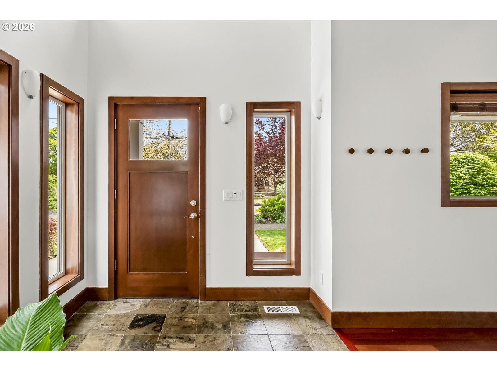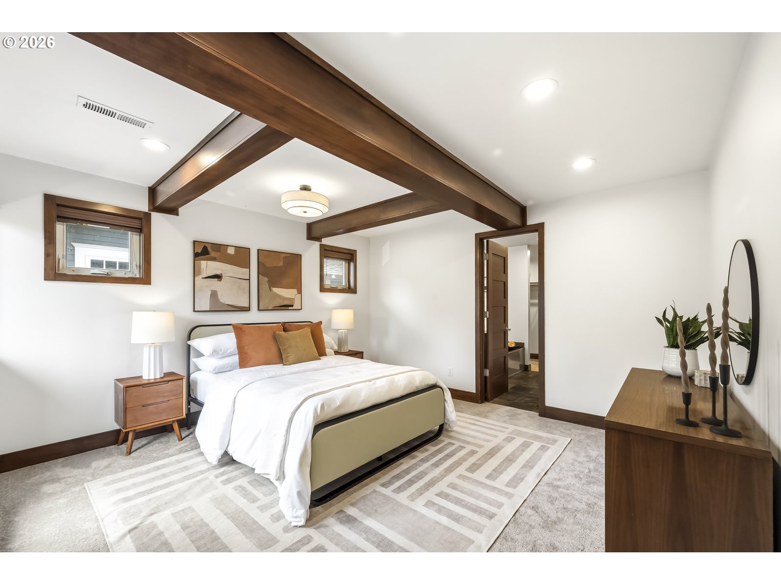 Discover a home that blends classic Craftsman warmth with modern construction and contemporary touches. Step into an inviting entryway framed by exposed wood ceilings, slate tile, and tall windows that flood the space with natural light. The open concept main level is bright and airy, grounded by rich hardwood floors, custom cabinetry, a gas fireplace, and a sleek staircase. The kitchen flows seamlessly into the dining and living areas so you can stay connected while entertaining. An additional front room provides a welcoming workspace, den, or extra bedroom. Upstairs, a sunlit landing with hardwood floors doubles as a reading nook or plant retreat and adjoins the hallway to four bedrooms all with new carpet. Unwind in the primary suite with its private balcony, exposed wood beams, walk-in closet, and jacuzzi tub while the kids or guests enjoy one of the three additional bedrooms, each with tall ceilings and generous closets. Also upstairs is a second bathroom and tucked away laundry area. A long driveway ends at a detached garage with additional side parking and a tree shaded back yard. Entertain on the deck with access to the kitchen, dining room, and a mud room that has a convenient sink. A two-block walk takes you to the neighborhood ridge and parks, where you can stroll along the golf course and take in stunning views of Mount Hood. As a bonus, rooftop solar powers the entire house for $17/month electricity bills and produces enough additional energy to charge an EV. [Home Energy Score = 7. HES Report at https://rpt.greenbuildingregistry.com/hes/OR10148588]