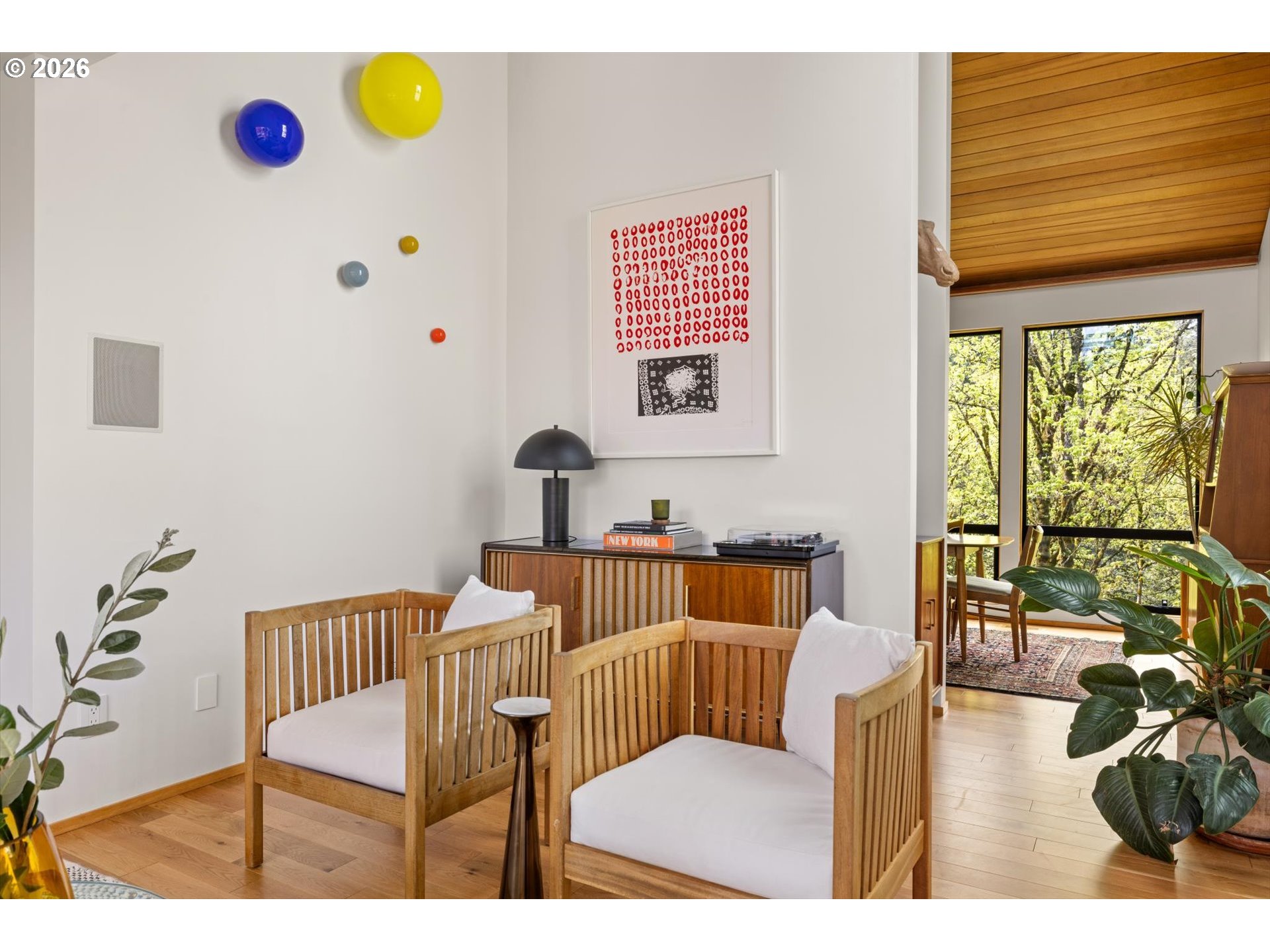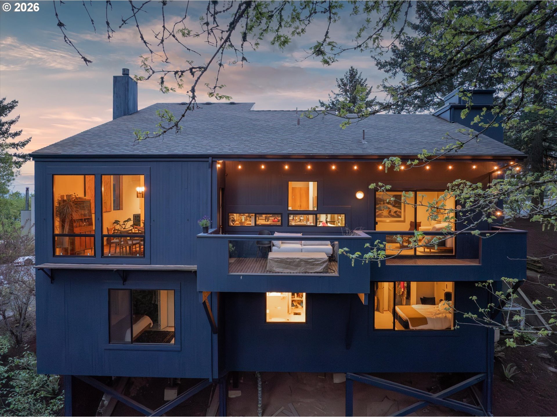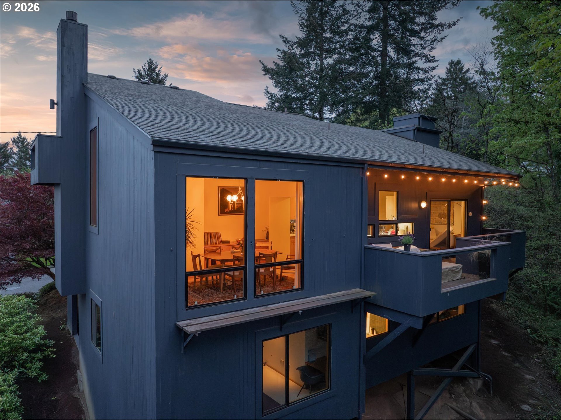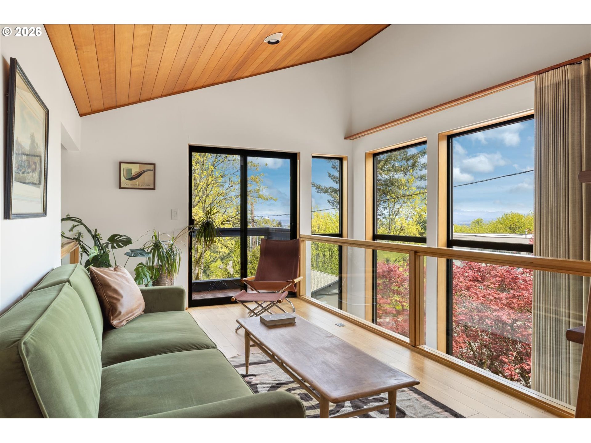 (503) 893-8874** OPEN HOUSE Sat 4/25 12-3pm. Private tours for buyers without agent representation can be booked at calendly.com/tour-time ** Designed by architectural team of York & Yodogawa & originally built for H. Chik M. Erzurumlu, a structural engineer & longtime Portland State professor, this home reflects a clear understanding of how space, light, & structure come together over time. When his wife fell ill, an elevator was added to connect each floor and the garage, allowing them to remain in the home they had created together. Set at the end of a quiet cul-de-sac, this one-of-a-kind home is grounded in its setting, balancing open outlooks with a sense of privacy among the surrounding trees. Natural light pours through expansive windows, including a dramatic two-story living room with floor to ceiling glass that frames Mt. St. Helens and layered views. A series of levels, loft space, & decks create moments for gathering & retreat, with a dedicated formal dining area positioned to take in the forest outlook. The kitchen is complete with Bertazzoni oven and Bosch refrigerator. A vaulted cedar ceiling brings warmth and scale to the main living areas, complemented by a gas fireplace, 4-inch oak floors underfoot, & custom cabinetry that carries throughout the home. Bathrooms are finished in imported travertine and Ann Sacks tile. The lower level is dedicated to three bedrooms, each with generous picture windows that look directly into the surrounding forest. The loft, complete with a wet bar & private deck, offers a more tucked away place to retreat, with generous storage thoughtfully integrated. With a high efficiency gas furnace, a whole house generator, & low maintenance grounds, the home is as considered in function as it is in feeling. In a setting where multi-level homes are often the norm, the elevator to every level, including the garage, offers long term ease and flexibility, all just moments from OHSU, nearby parks, trailheads, and a quick connection into the city.