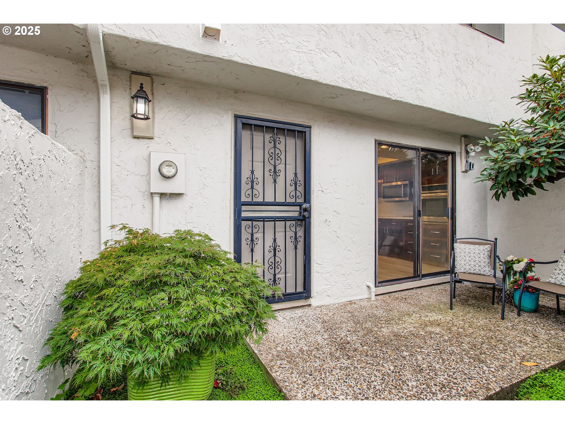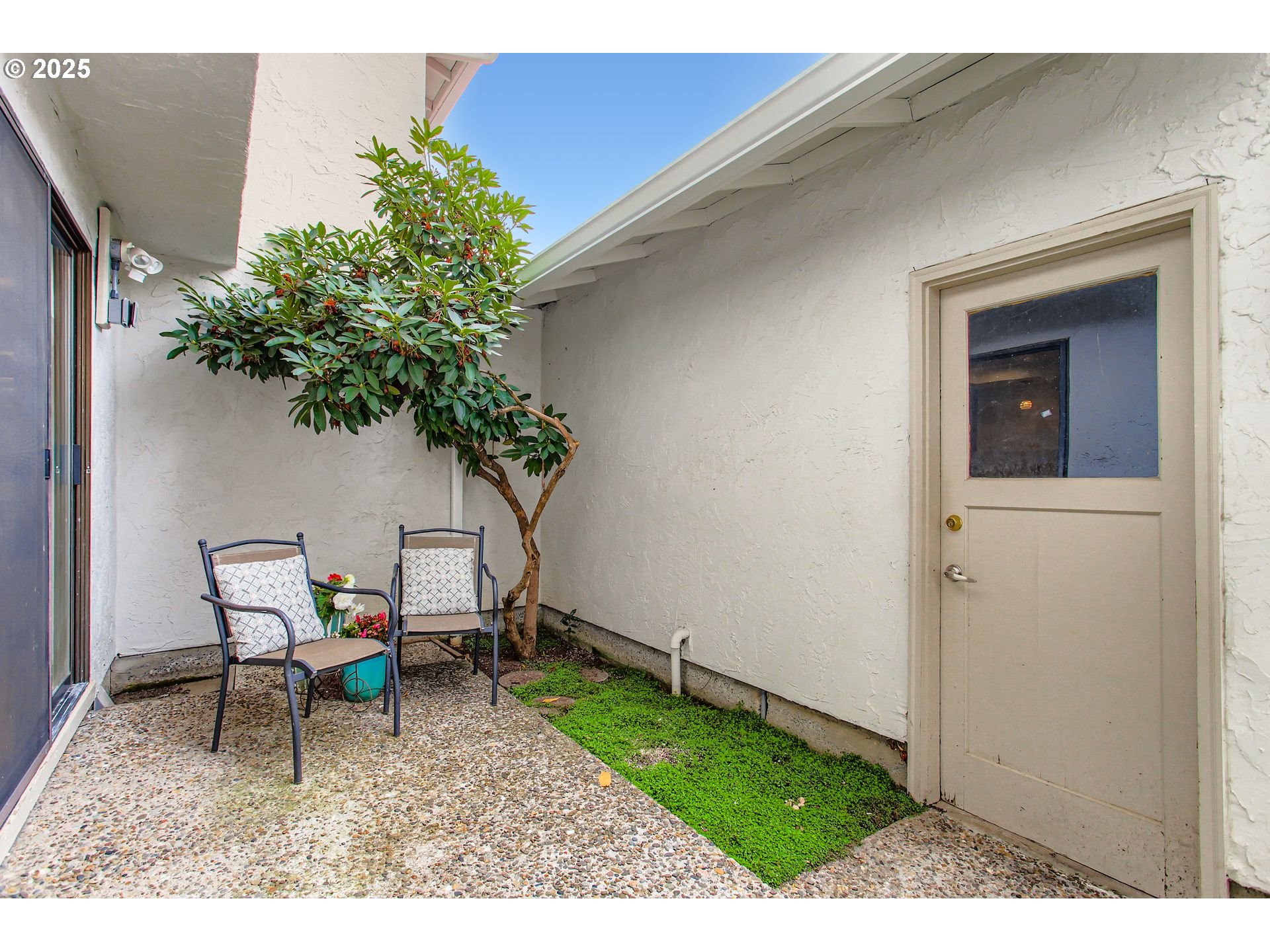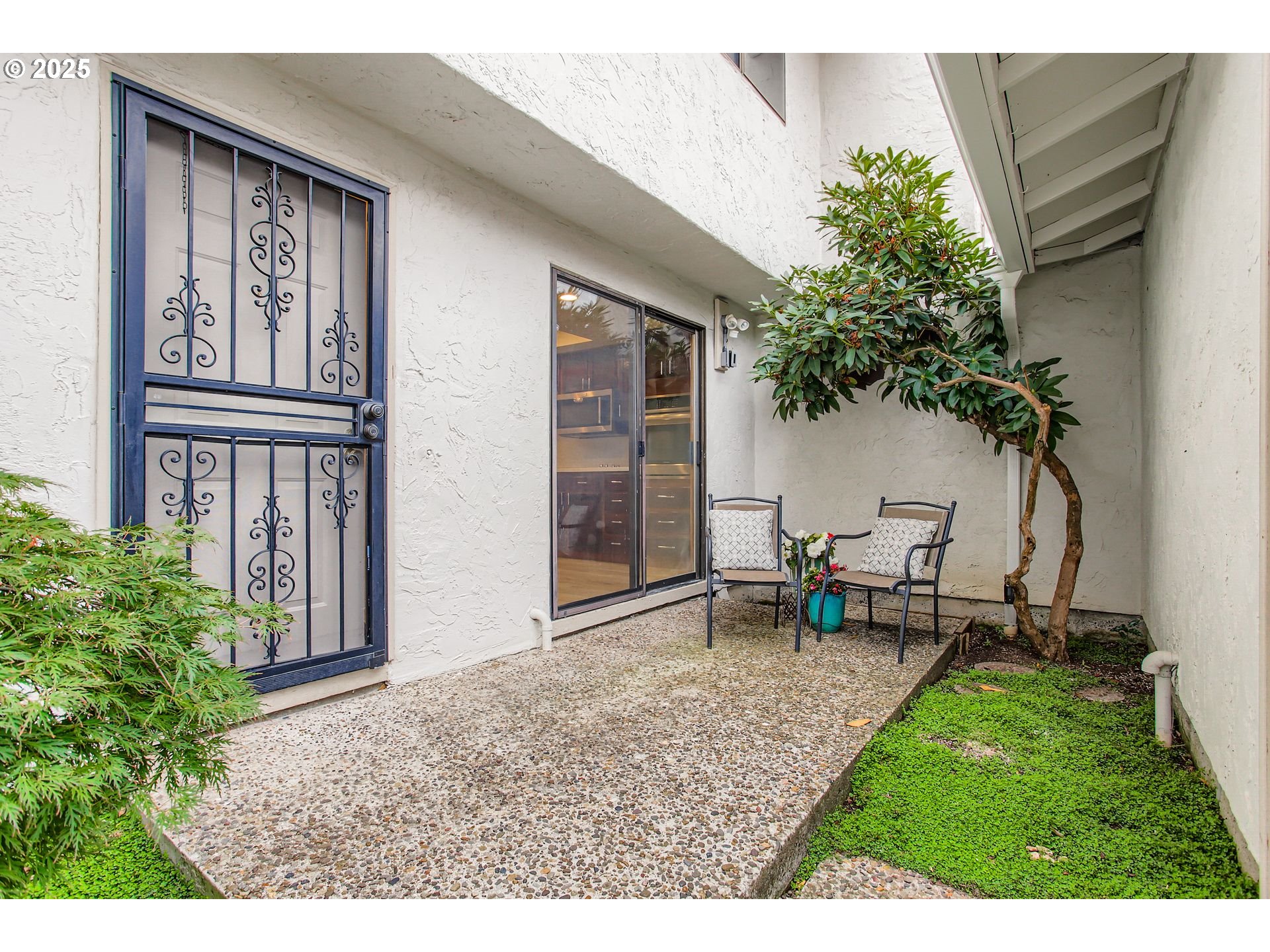 Charming Mediterranean-style condo featuring two private courtyard patios that evoke the feel of a European villa. The enclosed backyard is a lush retreat with a Japanese Maple and a Redbud Forest Pansy tree creating a green oasis. Inside, the spacious living and dining area is filled with natural light from large picture windows and warmed by a cozy gas fireplace. The kitchen, remodeled in 2018, offers a newer cooktop, oven, dishwasher, and garbage disposal. Upstairs, both bedrooms include beautifully remodeled bathrooms, complemented by new carpet and fresh interior paint throughout. Additional highlights include a 1-car garage and a new roof and gutters in 2024 and new exterior paint 2025. HOA amenities cover water, sewer, garbage, clubhouse access, exterior maintenance, beautifully maintained grounds, and ample guest parking.