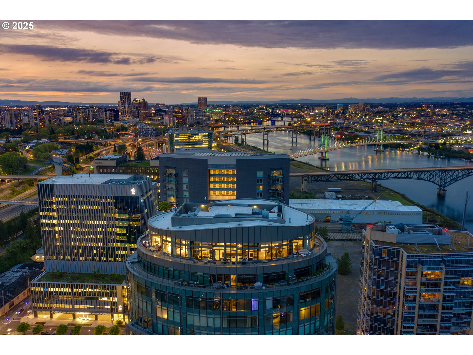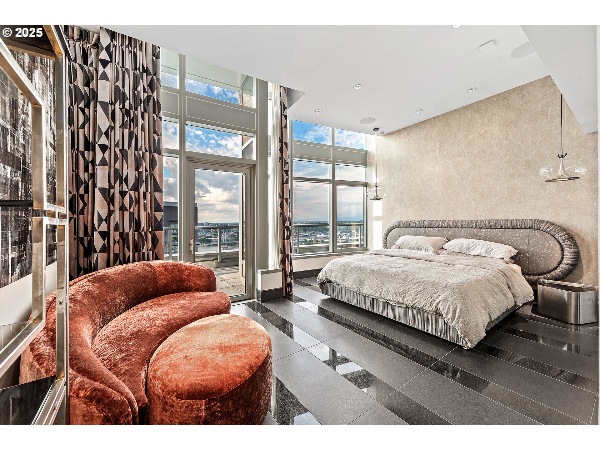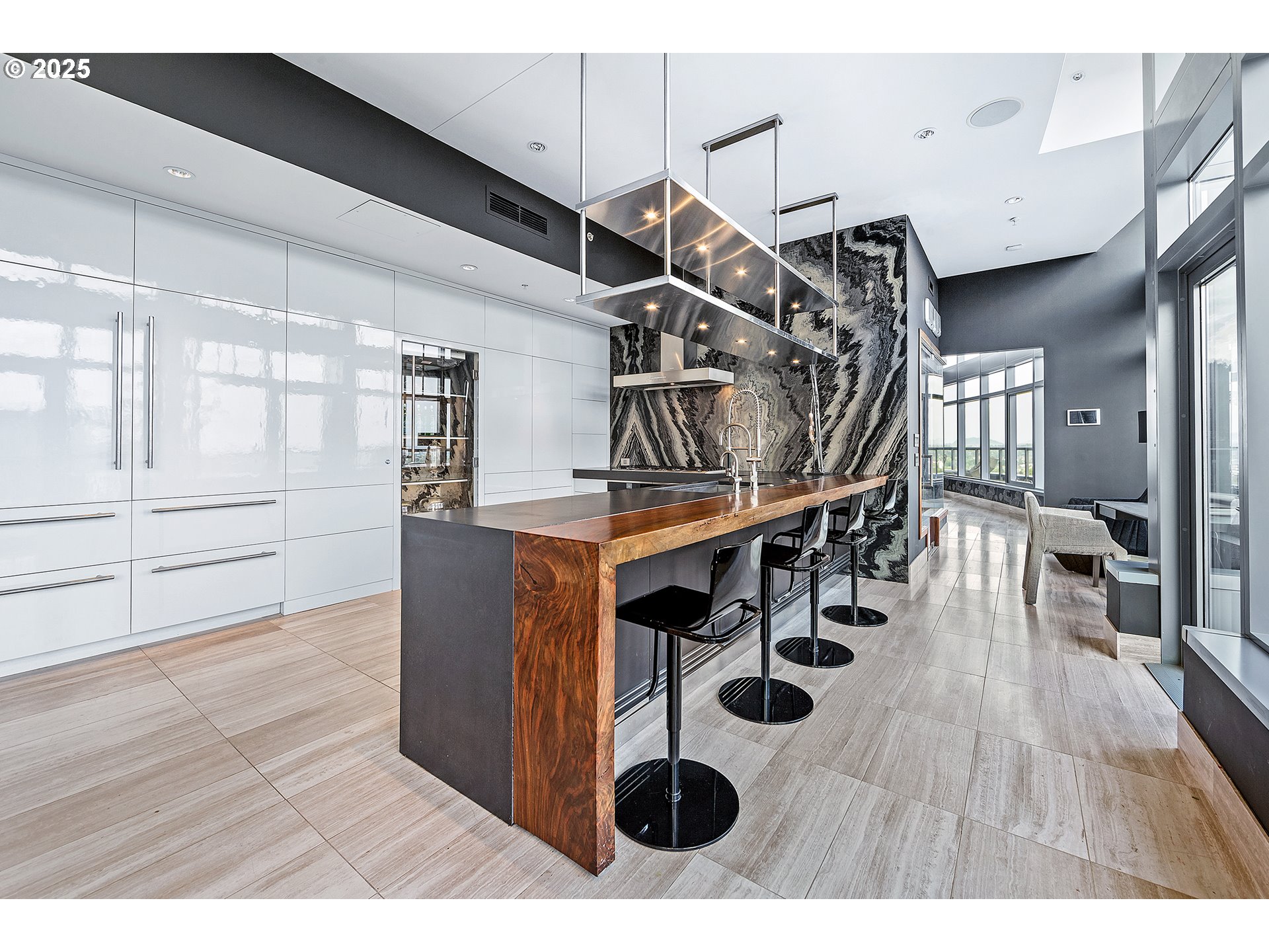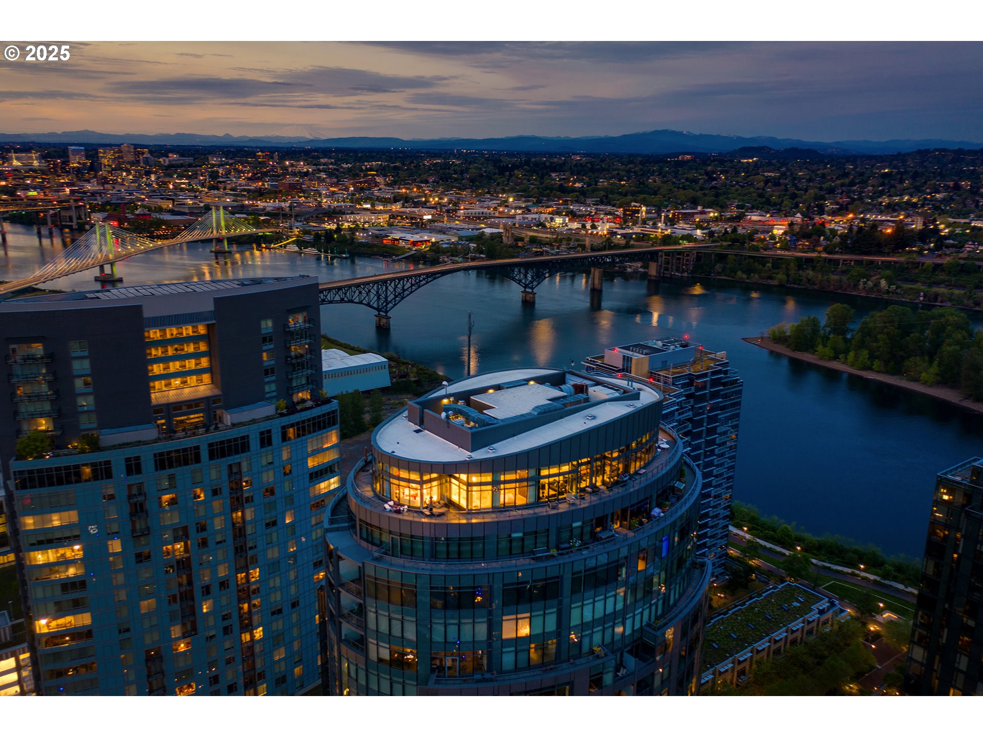 Live at the pinnacle of Portland luxury in this one-of-a-kind full-floor penthouse atop the iconic John Ross in the South Waterfront. Perched 325 feet above the city, this 4,865 sqft residence offers unmatched 360-degree views of Mt. Hood, the Willamette River, city lights, and surrounding mountains from every room and its private 2,094 sq ft wraparound terrace. Privately accessed via elevator, this 4 bed, 4.5 bath home is a masterclass in custom design, featuring rich natural materials, dramatic lighting, and luxe finishes hand-selected in Milan. The living spaces flow elegantly, perfect for both intimate evenings and grand entertaining. Highlights include a walnut-paneled hallway with inlaid marble floors, a show-stopping living room with mountain views, a striking bronze chandelier, and seamless access to the expansive terrace. The gourmet kitchen features floor-to-ceiling custom cabinetry, Ciopllini marble slab backsplash, Miele appliances, and a waterfall walnut/concrete island. A lounge with built-in bar, burl wood accents, and custom snakeskin glass cabinetry adds flair. The formal dining room features a smoked glass/marble Roche Bobois table and glass-enclosed wine cellar. The primary suite is a private sanctuary with city views, patio access, and a lavish ensuite with marble soaking tub, rose gold fixtures, and Gessi Italian sinks. Three additional oversized bedrooms each feature ensuite baths. Includes 4 parking spaces, private storage, 24/7 concierge, gym, and access to the Greenway Trail. This is Portland penthouse living at its finest—exclusive, elevated, and unforgettable.
