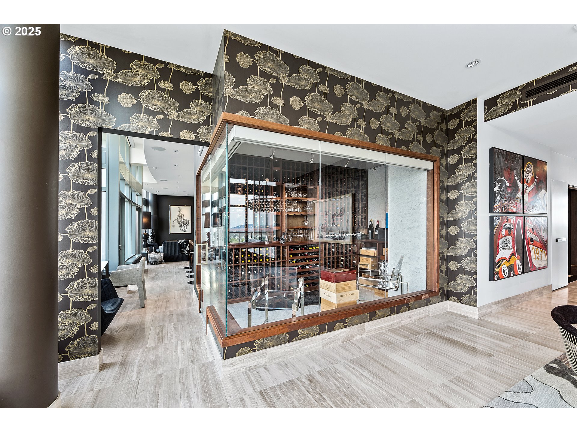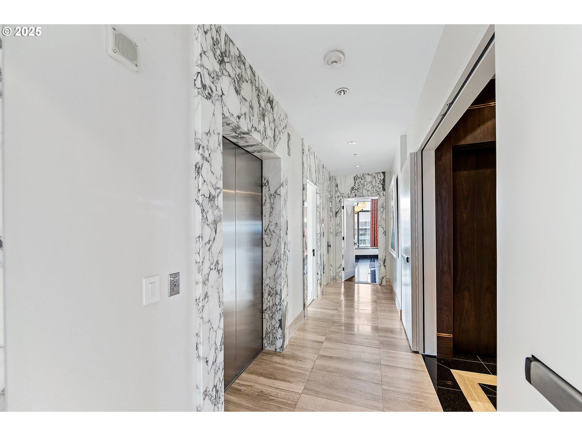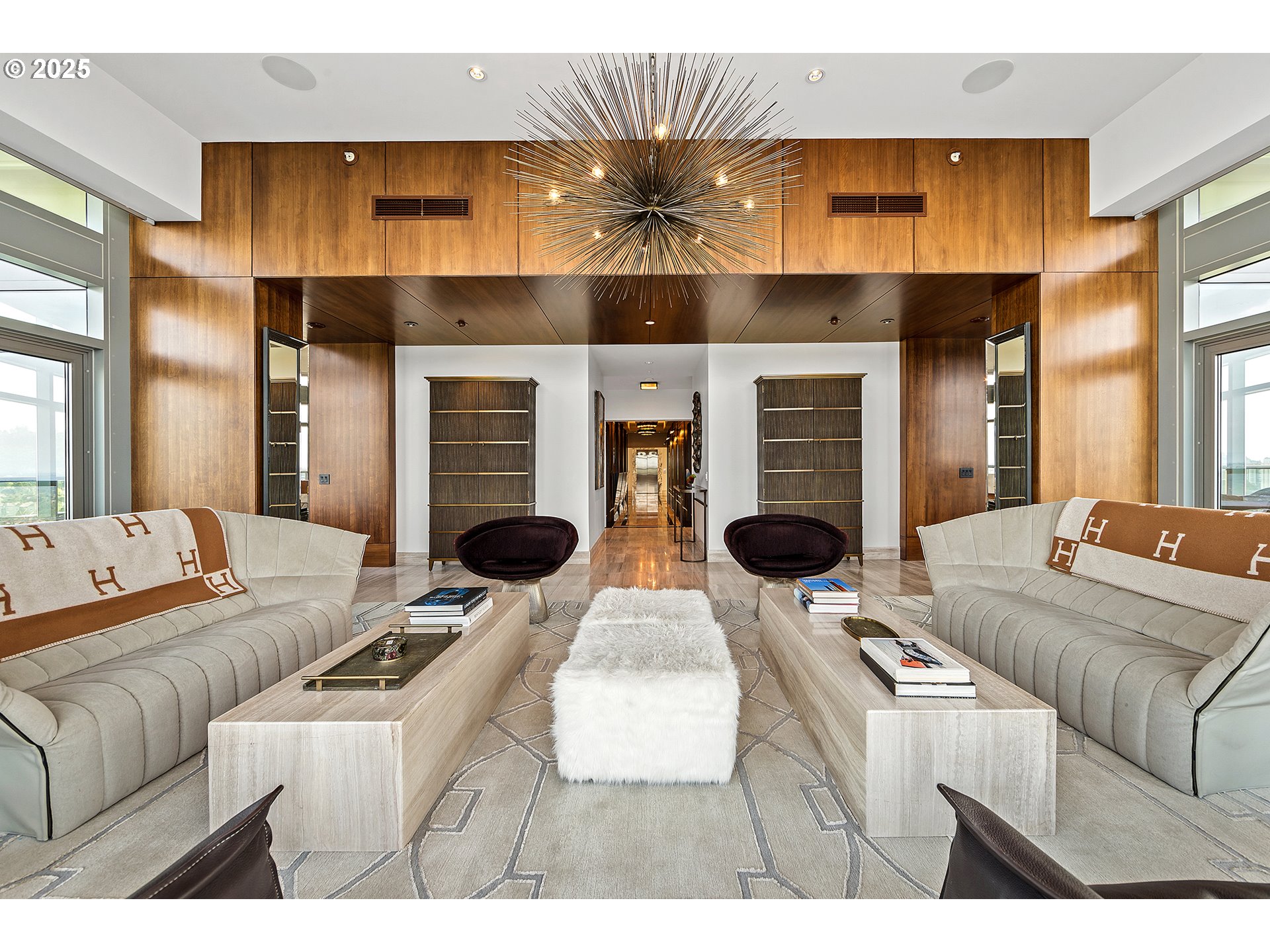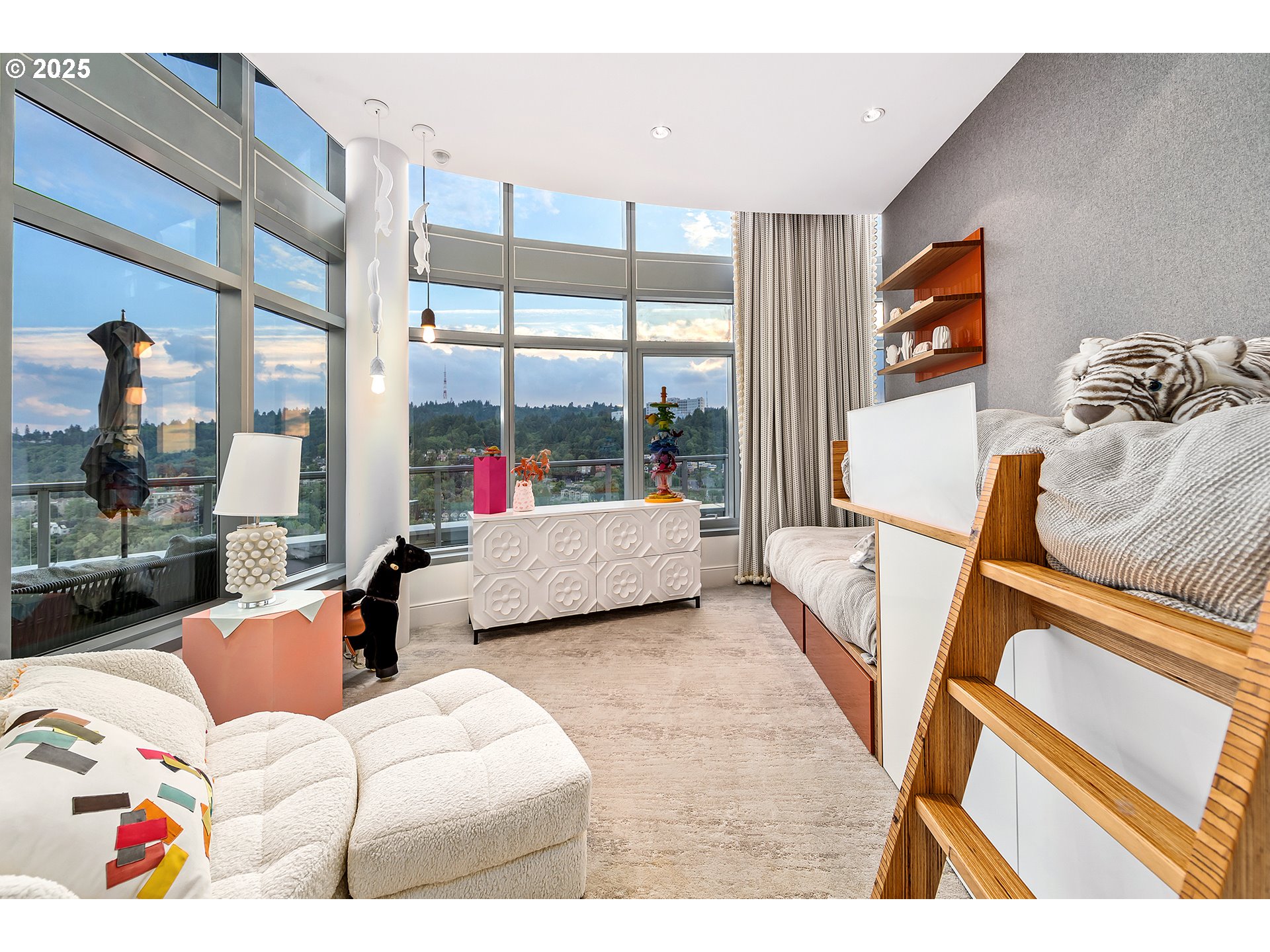 Live at the pinnacle of Portland luxury in this one-of-a-kind full-floor penthouse atop the iconic John Ross in the South Waterfront. Perched 325 feet above the city, this 4,865 sqft residence offers unmatched 360-degree views of Mt. Hood, the Willamette River, city lights, and surrounding mountains from every room and its private 2,094 sq ft wraparound terrace. Privately accessed via elevator, this 4 bed, 4.5 bath home is a masterclass in custom design, featuring rich natural materials, dramatic lighting, and luxe finishes hand-selected in Milan. The living spaces flow elegantly, perfect for both intimate evenings and grand entertaining. Highlights include a walnut-paneled hallway with inlaid marble floors, a show-stopping living room with mountain views, a striking bronze chandelier, and seamless access to the expansive terrace. The gourmet kitchen features floor-to-ceiling custom cabinetry, Ciopllini marble slab backsplash, Miele appliances, and a waterfall walnut/concrete island. A lounge with built-in bar, burl wood accents, and custom snakeskin glass cabinetry adds flair. The formal dining room features a smoked glass/marble Roche Bobois table and glass-enclosed wine cellar. The primary suite is a private sanctuary with city views, patio access, and a lavish ensuite with marble soaking tub, rose gold fixtures, and Gessi Italian sinks. Three additional oversized bedrooms each feature ensuite baths. Includes 4 parking spaces, private storage, 24/7 concierge, gym, and access to the Greenway Trail. This is Portland penthouse living at its finest—exclusive, elevated, and unforgettable.