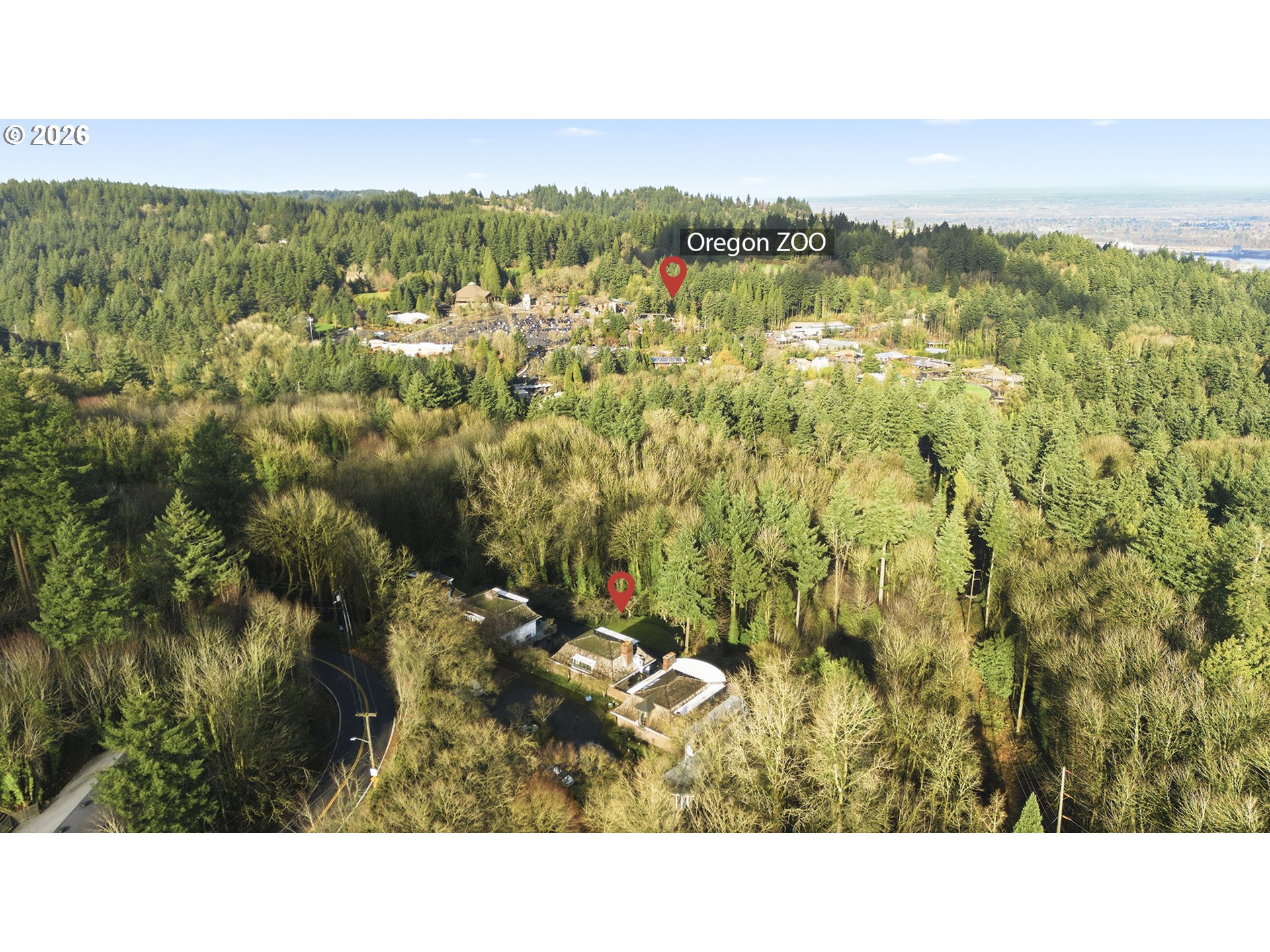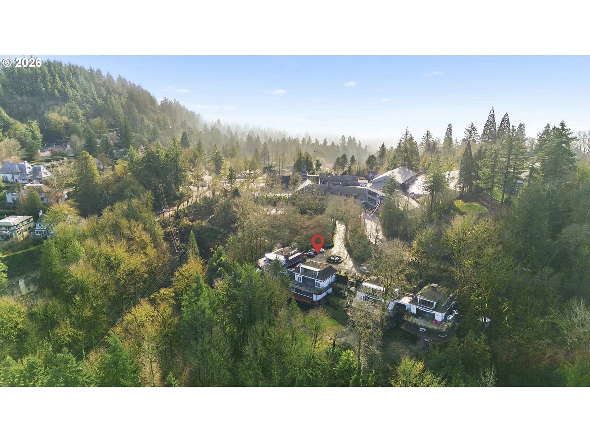 This gorgeous four-story home offers a truly special opportunity within a private community of just four residences, nestled on beautiful, park-like grounds just minutes from the city. Enjoy the serenity of the charming water fountain, nearby walking trails, and the convenience of being close enough to hike to the Oregon Zoo. Set high in the hills and only a ten-minute walk to Council Crest, the property provides a peaceful, tree-lined setting with filtered city views. On clear days, take in the distant vistas of Mount St. Helens and Mount Adams, along with views of the Portland skyline from every level of this gorgeous home. Nature lovers will appreciate the vibrant wildlife, including frequent sightings of bald eagles, deer, and resident owls.Inside, the home is masterfully designed for versatility. The layout features five bedrooms, four bathrooms, and two full kitchens. The primary kitchen is located on the main floor, while the lower level features a second full kitchen and living space. This lower level is perfectly suited for use as an ADU (Accessory Dwelling Unit), providing a high-end separate rental opportunity or a private space for multi-generational living.A three-car garage adds convenience, complemented by a large adjacent shop perfect for projects or storage. With a flexible floor plan offering endless possibilities for guests, extended family, or work-from-home living, this dreamy property presents an exceptional opportunity to put down roots in one of the area's most unique and serene settings. Come see it today.
