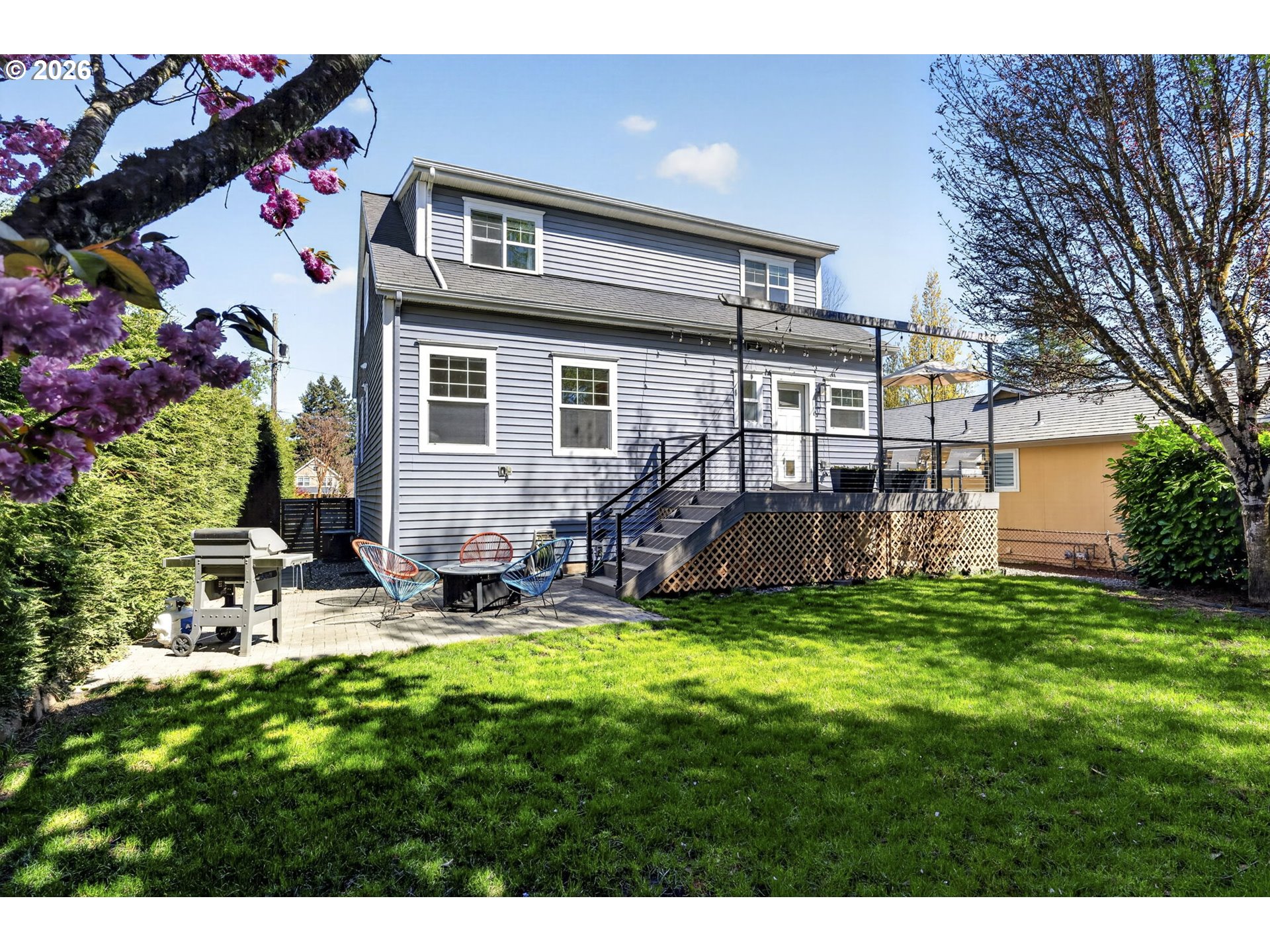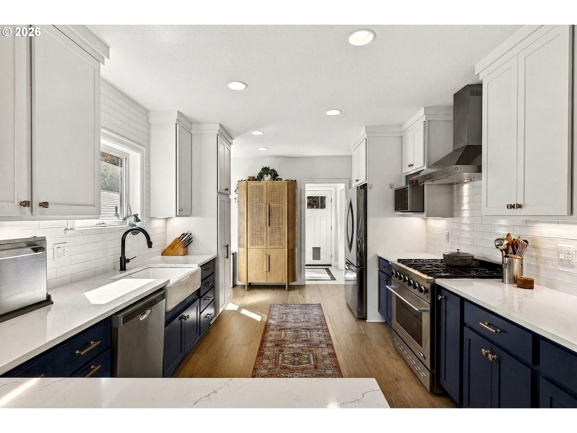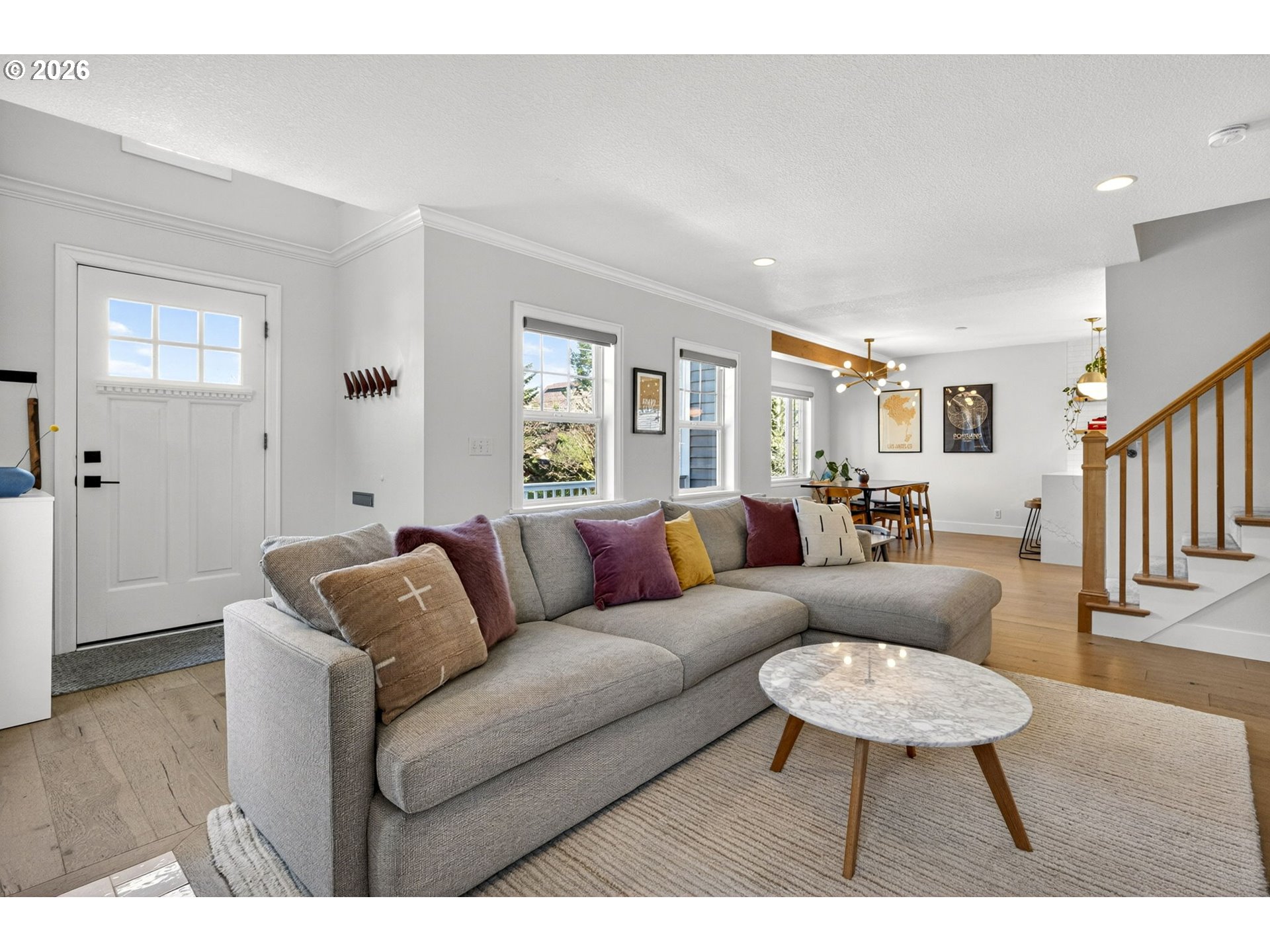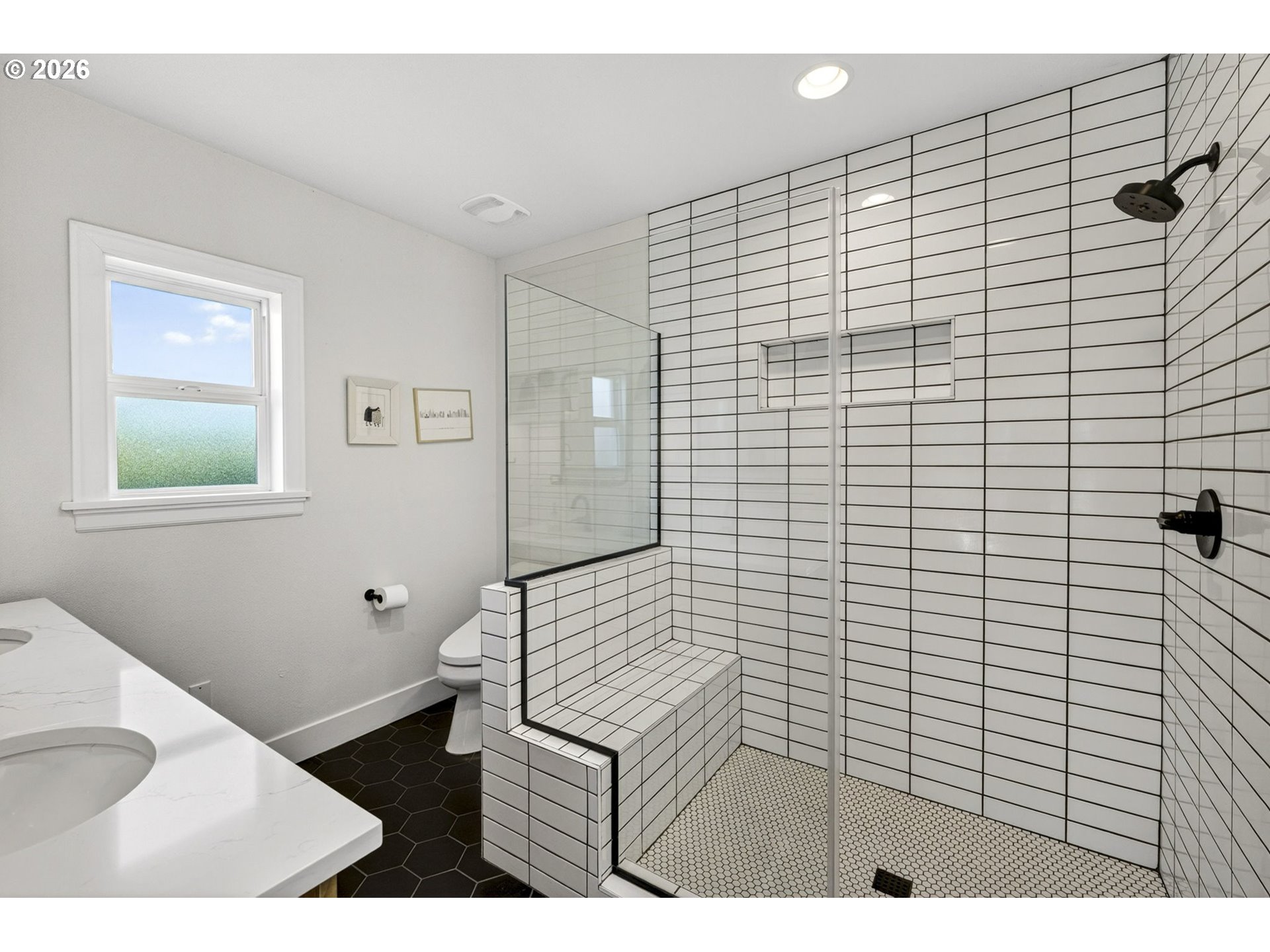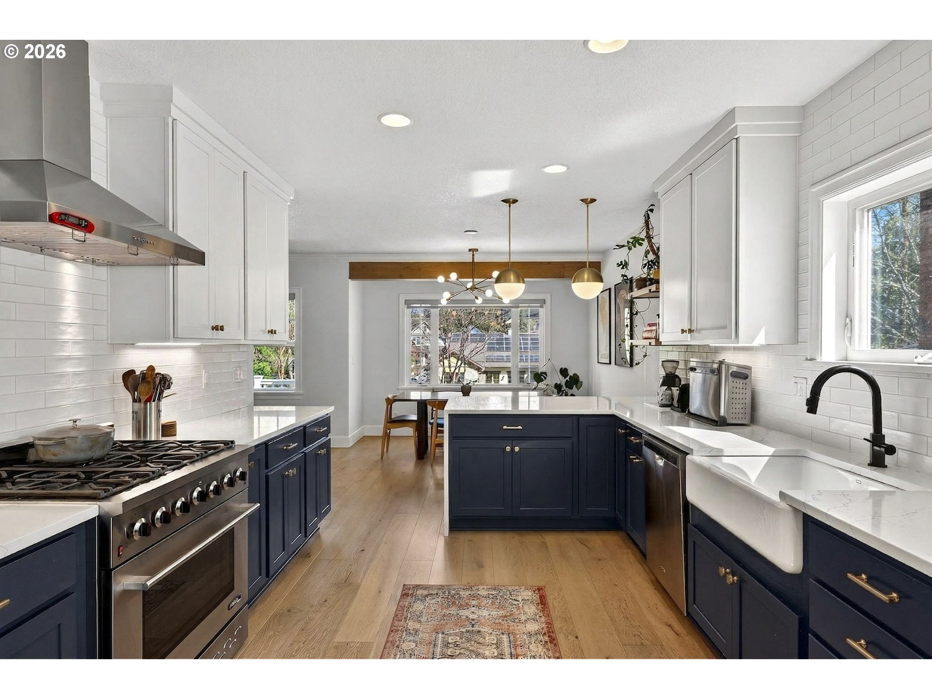 Nestled in one of Portland’s coveted neighborhoods, this Cape Cod–inspired home blends classic charm with thoughtful updates. Steep gables, dormer windows, and crisp white trim create timeless curb appeal, while a 2019 renovation refreshed nearly every surface inside. The wide-plank white oak floors and an open, airy layout set the tone for easy living and entertaining. At the center, the updated kitchen features new cabinetry, a quartz island with seating, subway tile backsplash, farmhouse sink, and updated lighting—flowing seamlessly into the living area anchored by a fireplace.The main-level primary suite offers convenience and comfort with an ensuite bath featuring a walk-in shower and double vanity. Upstairs, two additional bedrooms are complemented by a vaulted bonus room with dormers—ideal as a fourth bedroom, office, or media space. All bathrooms were updated in 2019, and new window treatments throughout add a cohesive, finished feel to the home. From the Trex deck to the paver patio with its perfect fire pit setting, this fully fenced backyard is made for summer nights and easy entertaining. Inside, you'll find peace of mind with a newer furnace (2023), central AC (2019), a dedicated laundry room, and an EV-ready tandem garage. In the coveted Duniway school district and conveniently located near Reed College, with easy access to the shops and restaurants in Woodstock and Sellwood.