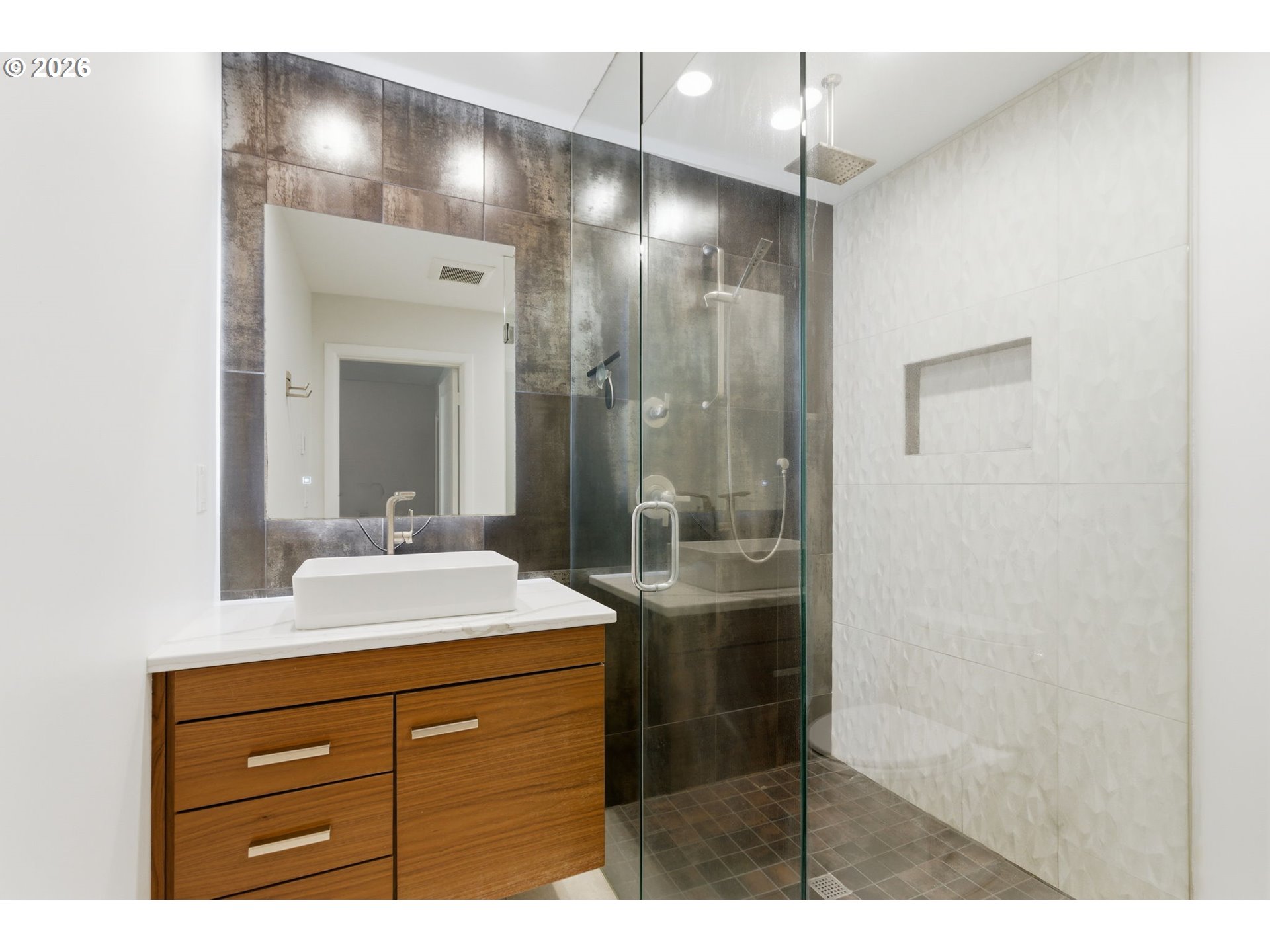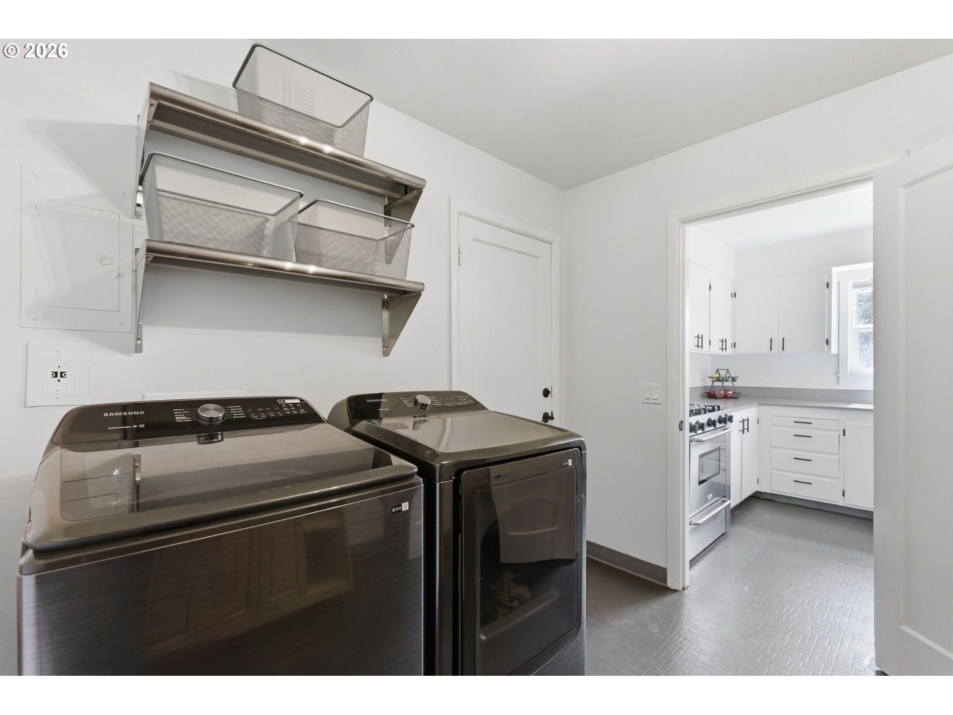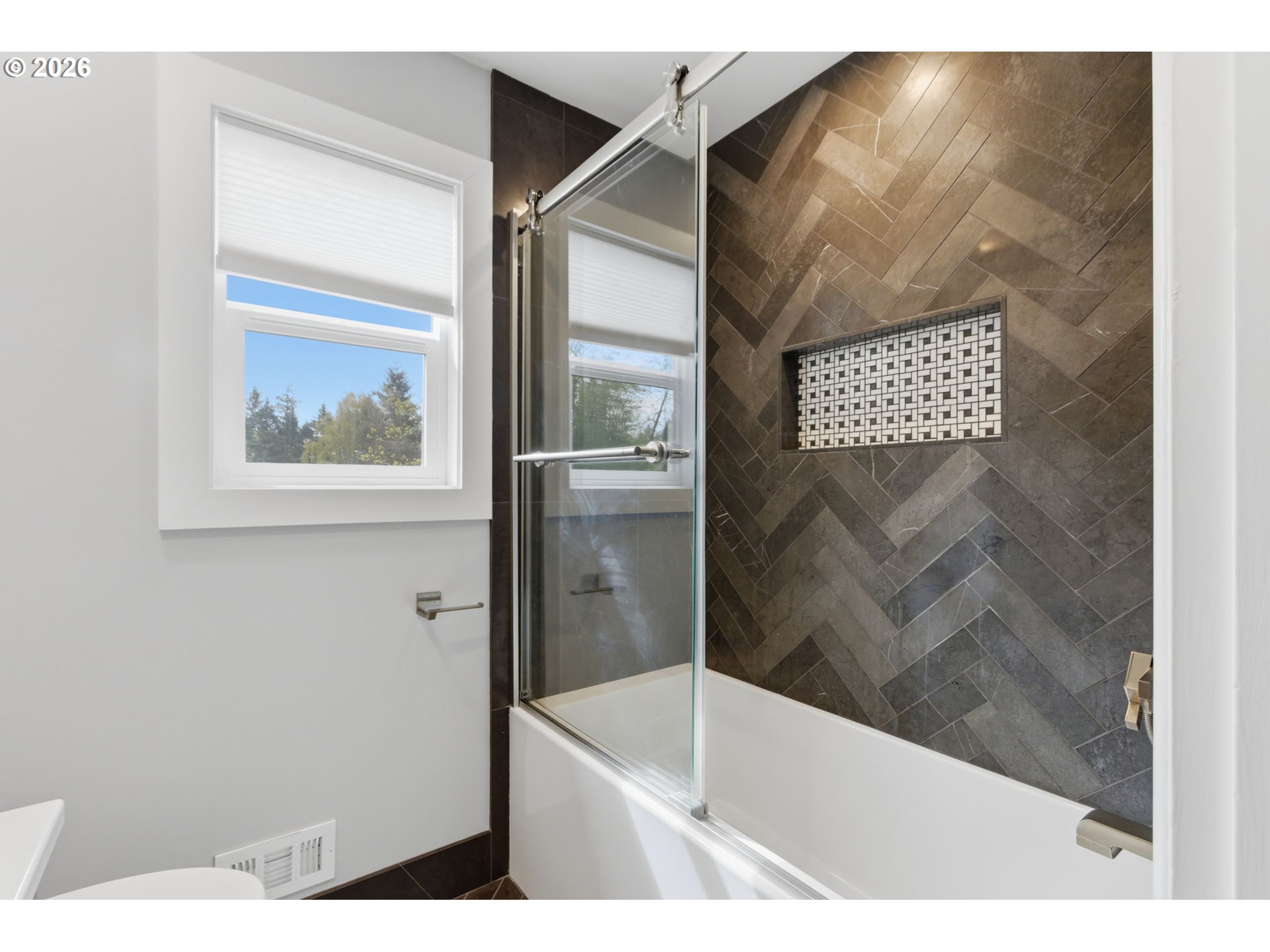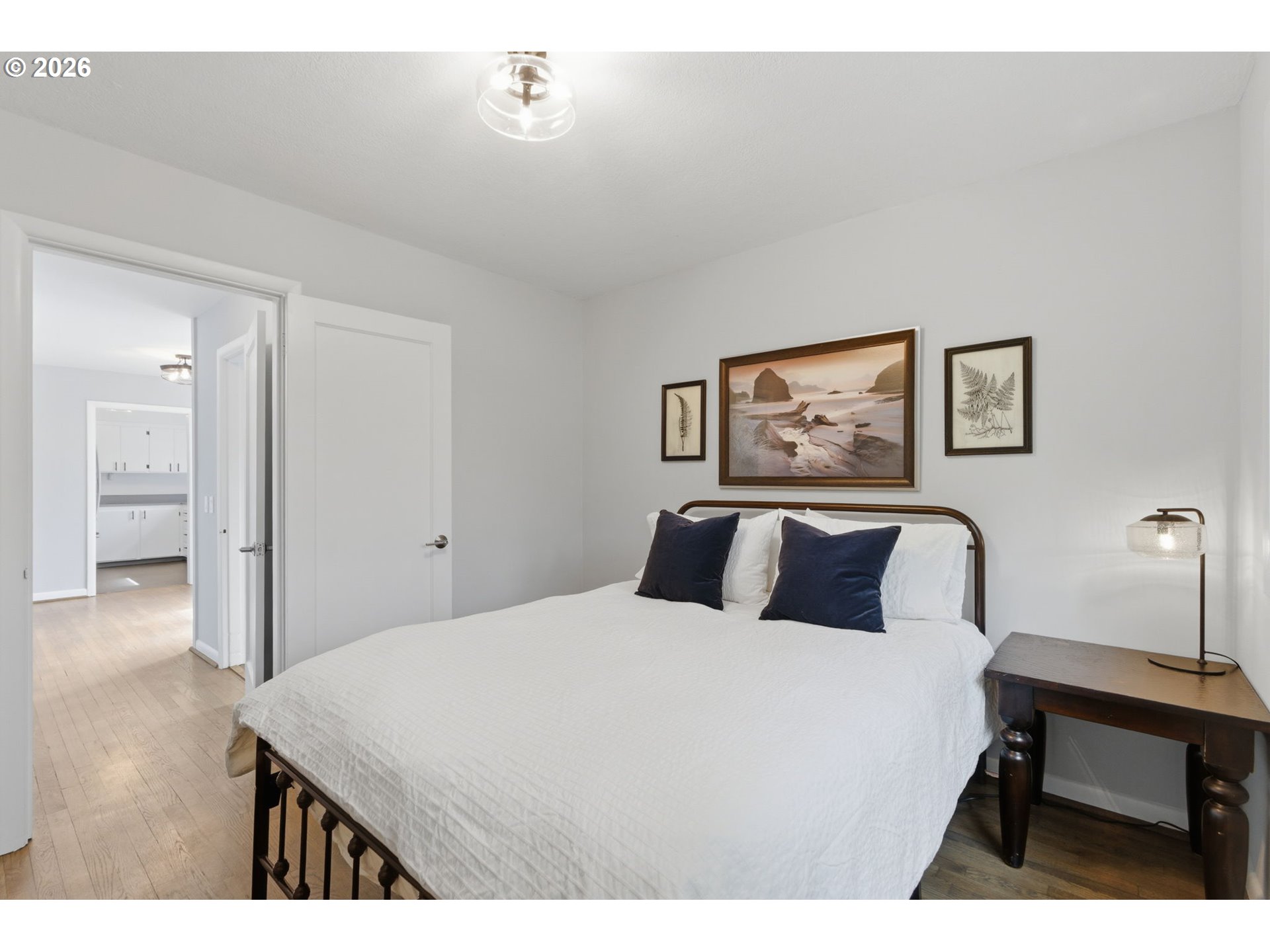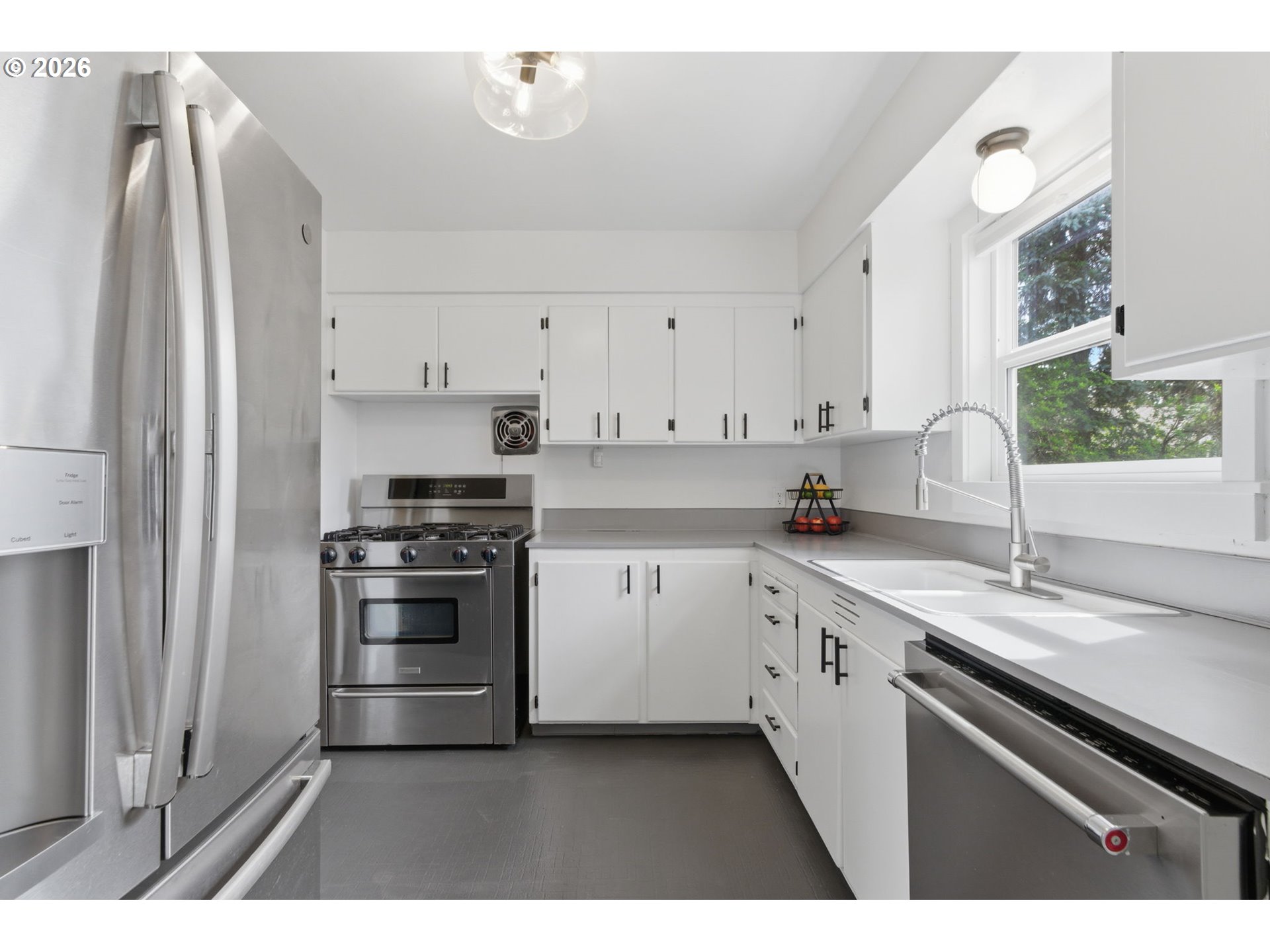 Charming one-level home in desirable Bridlemile offering the ease of main-level living with a thoughtful blend of modern upgrades and timeless character. The light-filled living room features large windows that invite abundant natural light, along with details such as a coved ceiling with molding and a classic brick fireplace that creates a warm focal point connecting the living and dining areas. This home has been extensively improved with refinished original hardwood floors, new windows, a new roof, new gutters, updated siding & new exterior paint, new plumbing, and beautifully remodeled bathrooms. The kitchen is equipped with a double basin sink, gas range and stainless steel appliances ideal for everyday living while the laundry room includes a washer/dryer and built-in shelving for added storage. French doors open to an expansive deck overlooking a generous 0.24-acre lot with a fully fenced, oversized backyard—perfect for outdoor enjoyment, gardening, or gatherings. The updated bathrooms feature tile flooring, quartz countertops, vessel sinks, and LED backlit mirrors for a modern, elevated feel. New furnace and AC within the last year. Don't miss the extra large crawlspace for additional storage, or other possibilities! A wonderful opportunity to enjoy comfort and style in one of Portland’s most sought-after neighborhoods, with convenient access to Hillsdale, downtown Portland, and Raleigh Hills amenities, parks, and schools as well as Beaverton tech corridor Nike and Intel. [Home Energy Score = 2. HES Report at https://rpt.greenbuildingregistry.com/hes/OR10246175]