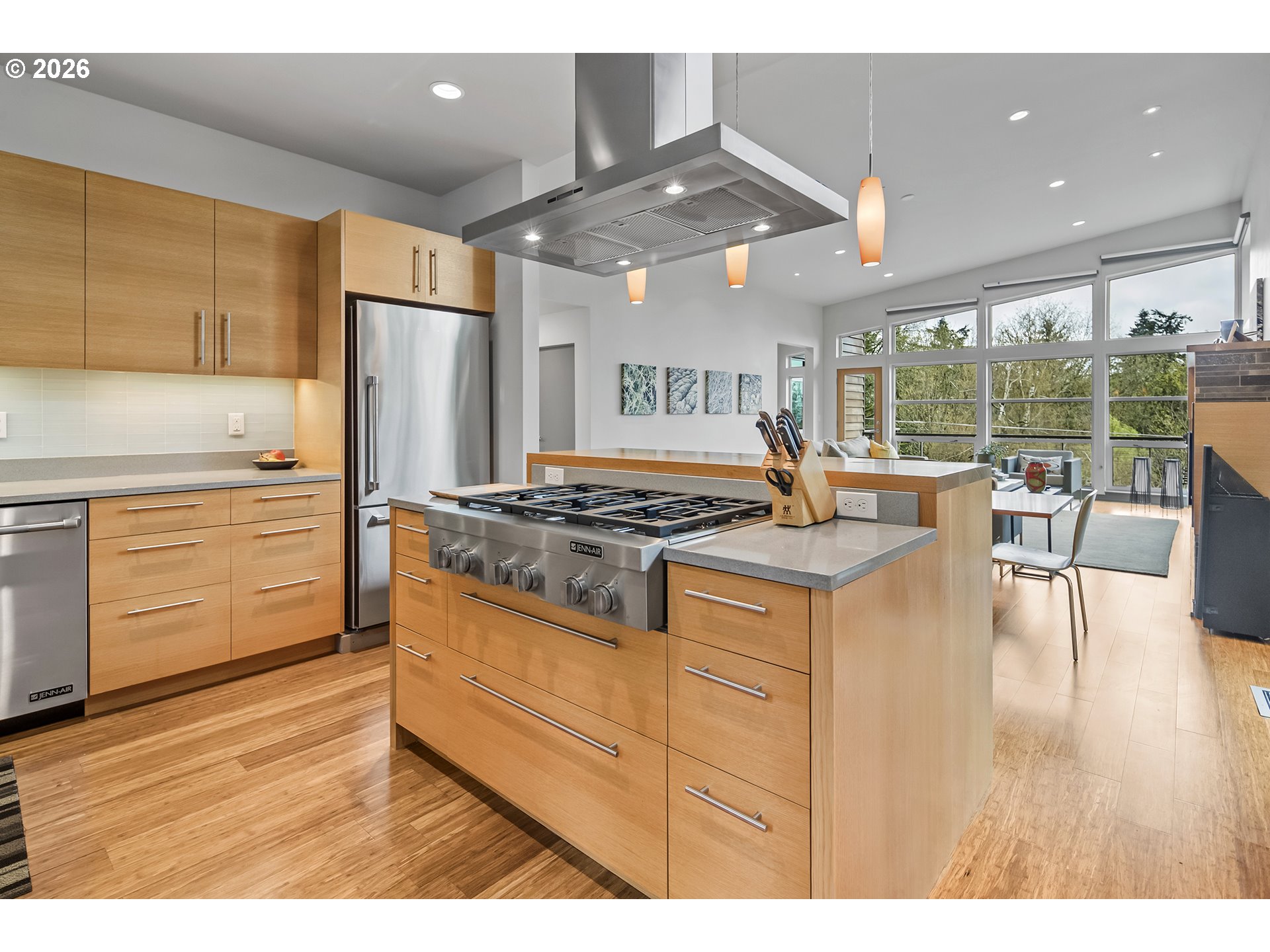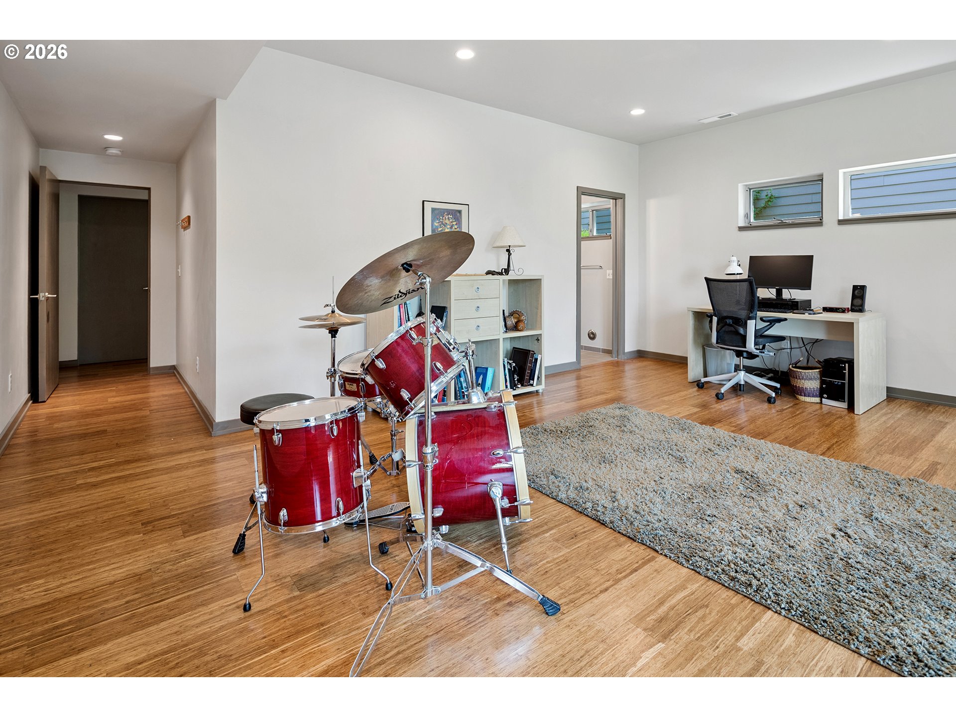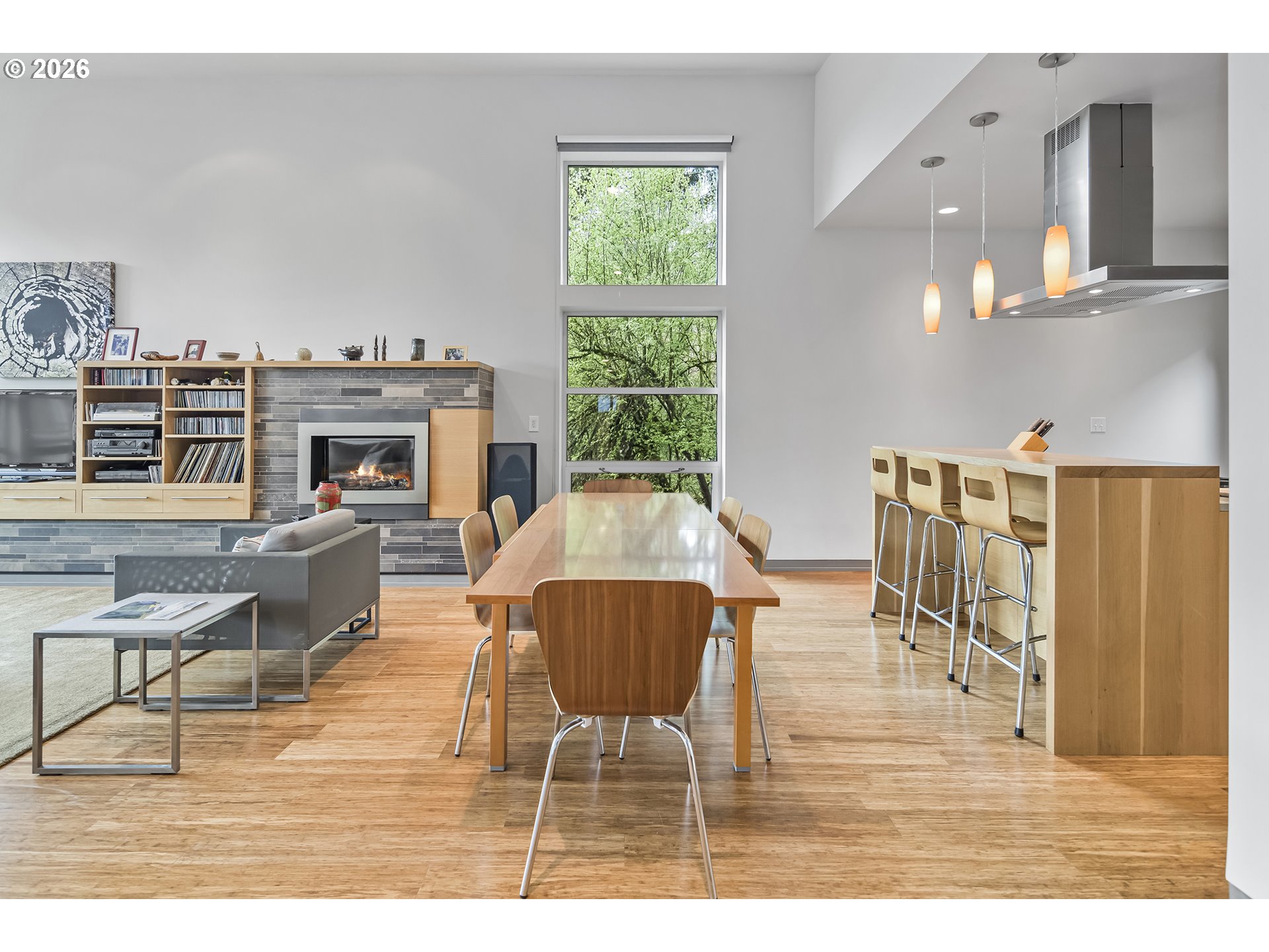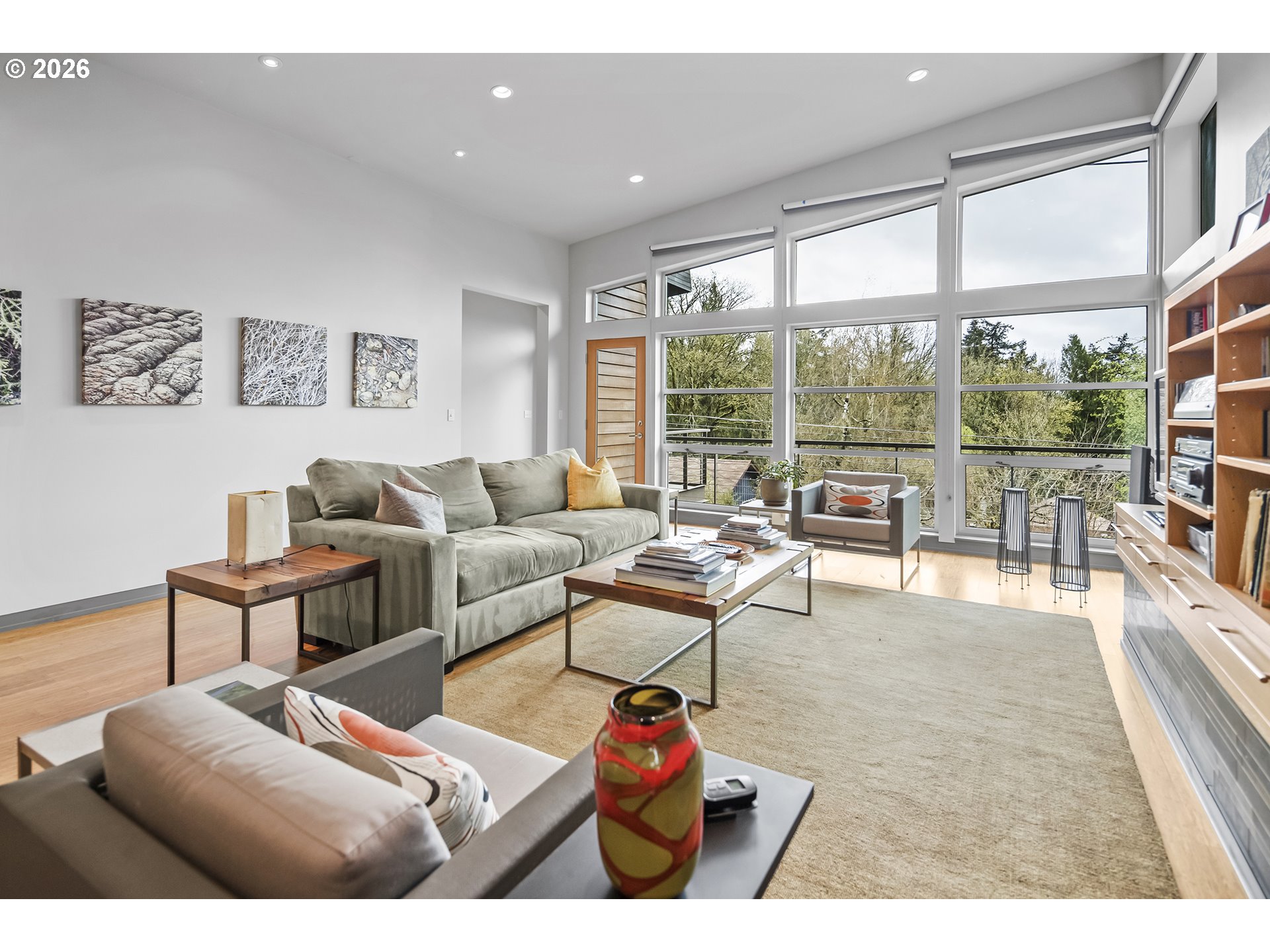 Bridlemile Modern Musician’s Sanctuary in the SW Hills. This architect designed custom home located on a quiet, serene dead-end street is an absolute beauty and full of soul. It is Highly Designed, Green Minded with an expansive southern territorial view and is within walking distance of Bridlemile & St. Thomas More schools. The wonderfully light filled, open plan living space features large windows, South facing balcony, vaulted ceilings, a glass tiled gas fireplace, an amenity rich kitchen with solid White Oak cabinetry, recycled glass countertops and exits to a mahogany outdoor deck. The house plan also includes a large Media/Flex room with high ceilings, full bath and separate exterior entry door. The home’s plumbing fixtures and fittings are all high end quality and the flooring throughout is engineered bamboo planking with glass tile bathrooms. The exterior cladding is all natural, stained cedar siding with triple glazed, tinted windows for energy efficiency. The mechanical system is an electrical heat pump system (Heat Recovery Ventilation Unit) with an emergency back-up gas furnace and On-Demand gas water heater. This home has been lovingly cared for and looks and feels like a new home. Built in 2011. [Home Energy Score = 8. HES Report at https://rpt.greenbuildingregistry.com/hes/OR10237308]
