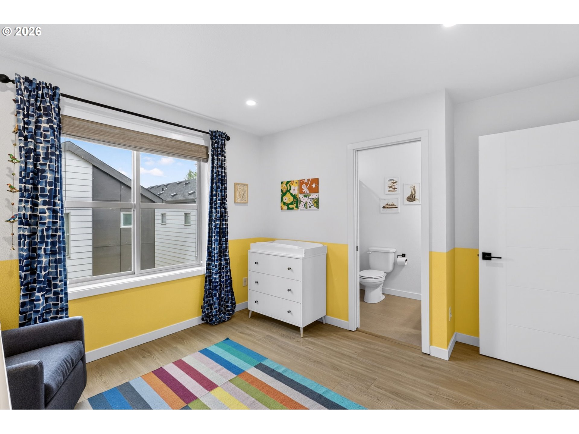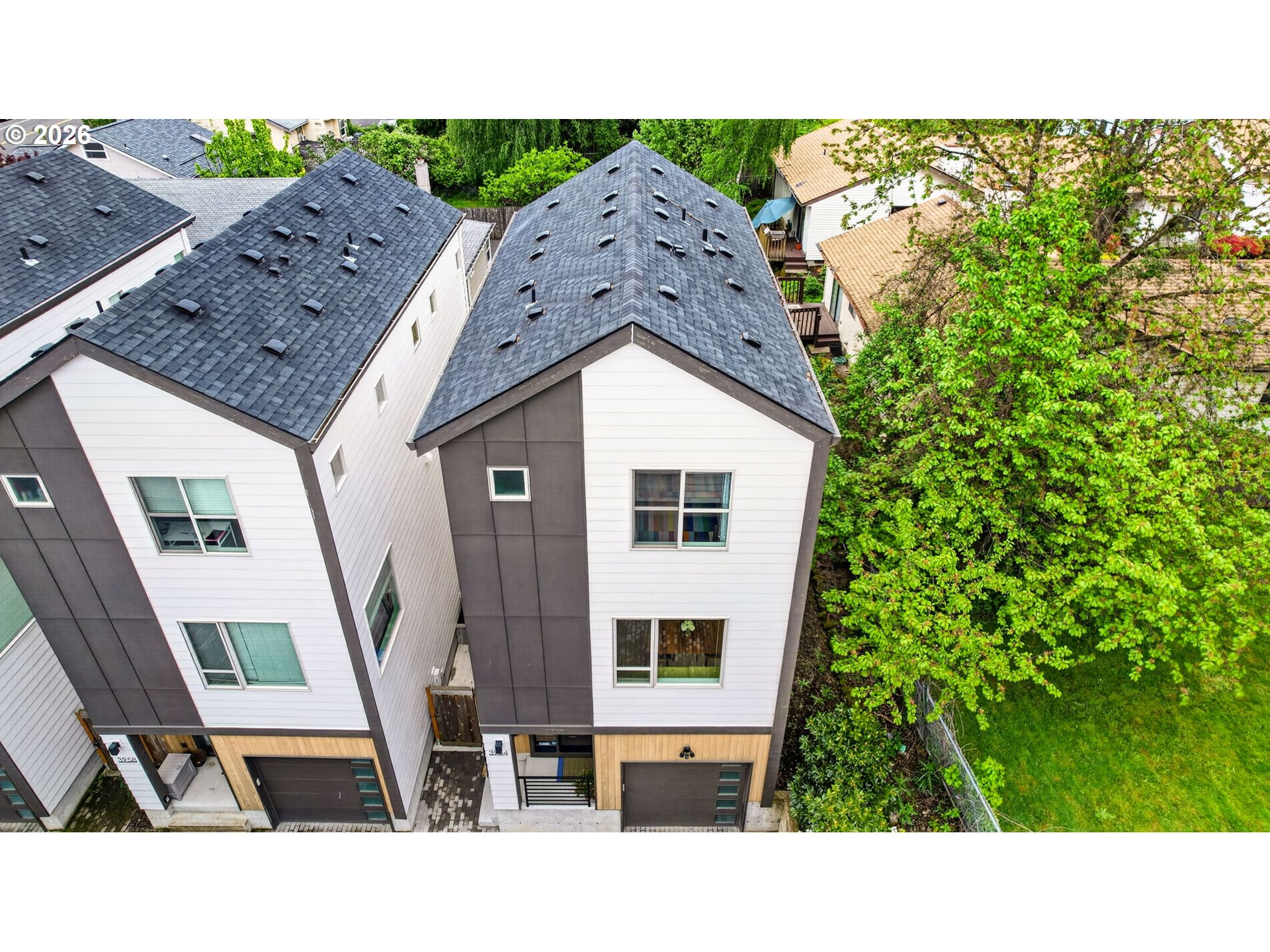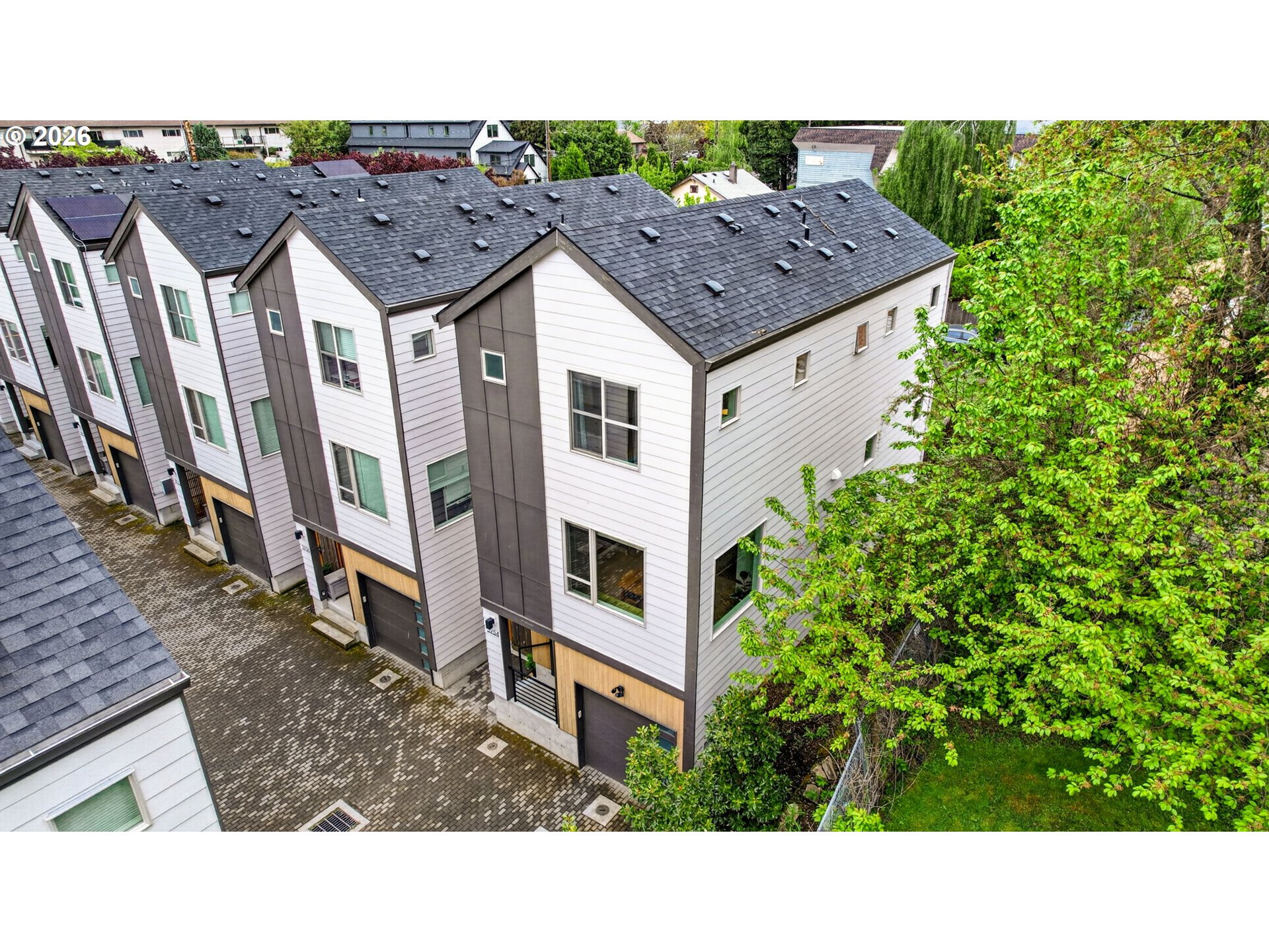 This stylish end-unit detached home lives like a house and not a condo, with no shared walls, an attached garage and a private yard. Tucked back at the end of a private driveway, the bustle of Gladstone Street fades away. Located in one of Portland‘s latest hotspots close to restaurants, bars, Trader Joe’s, and transit, this quality construction townhome by Caliber Homes shows you really can have it all. Soaring ceilings, high-end finishes, and walls of windows looking out to greenery and trees make this one stand out. Thoughtfully designed, every space has a purpose and this makes living here easy and peaceful. The low Homeowner Association dues cover professional management, the common area maintenance and landscaping so you don’t have to worry about yard work. This home was constructed in 2021 using energy efficient, long lasting and low maintenance materials so you can relax and spend your money catching a bite to eat at the several options within blocks of your new home. Designed with two primary suites and the laundry upstairs and a third room with fireplace that doubles as a den or 3rd bedroom on the entry level, the floor plan can accommodate working from home or overnight guests who want their privacy. The spacious main floor is designed for flexibility with an open kitchen and with plenty of room for both a formal dining space, informal bar seating as well as a spacious living room.