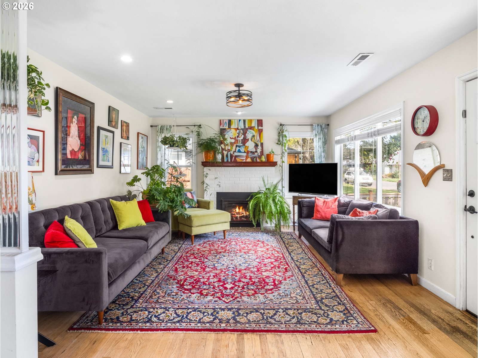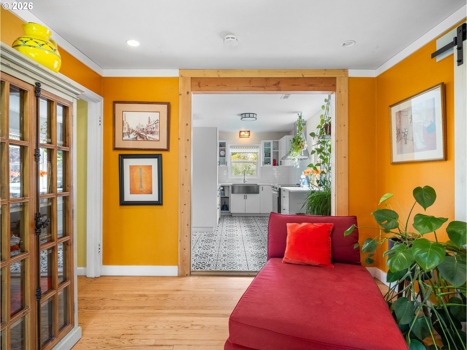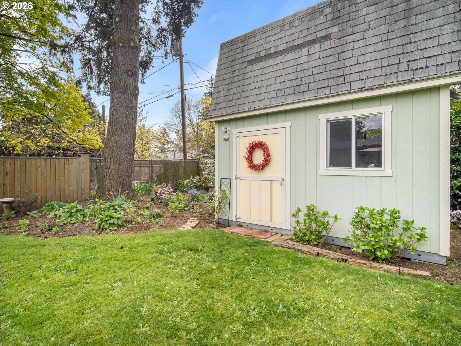 Step into this sunny, light filled home that is move in ready. This two bedroom, one bathroom house features hardwood floors, a spacious living room, designated dining area, flex room to the out side and a large covered patio. The house boasts many updates, including a new roof in 2025, a fully remodeled kitchen in 2020 featuring quartz countertops and an open concept, an on demand hot water heater, remote controlled gas fireplace, custom blinds in kitchen and a freshly updated bathroom. The main bedroom has a large walk in closet with an oversized washer and dryer while the second has a large closet with built in storage. Enjoy the fully fenced, oversized lot with a lovely, established garden. A small two story shop out back awaits new owners to make it their own unique space. All of this is situated on a quiet, treelined street with off street parking. [Home Energy Score = 8. HES Report at https://rpt.greenbuildingregistry.com/hes/OR10181516]