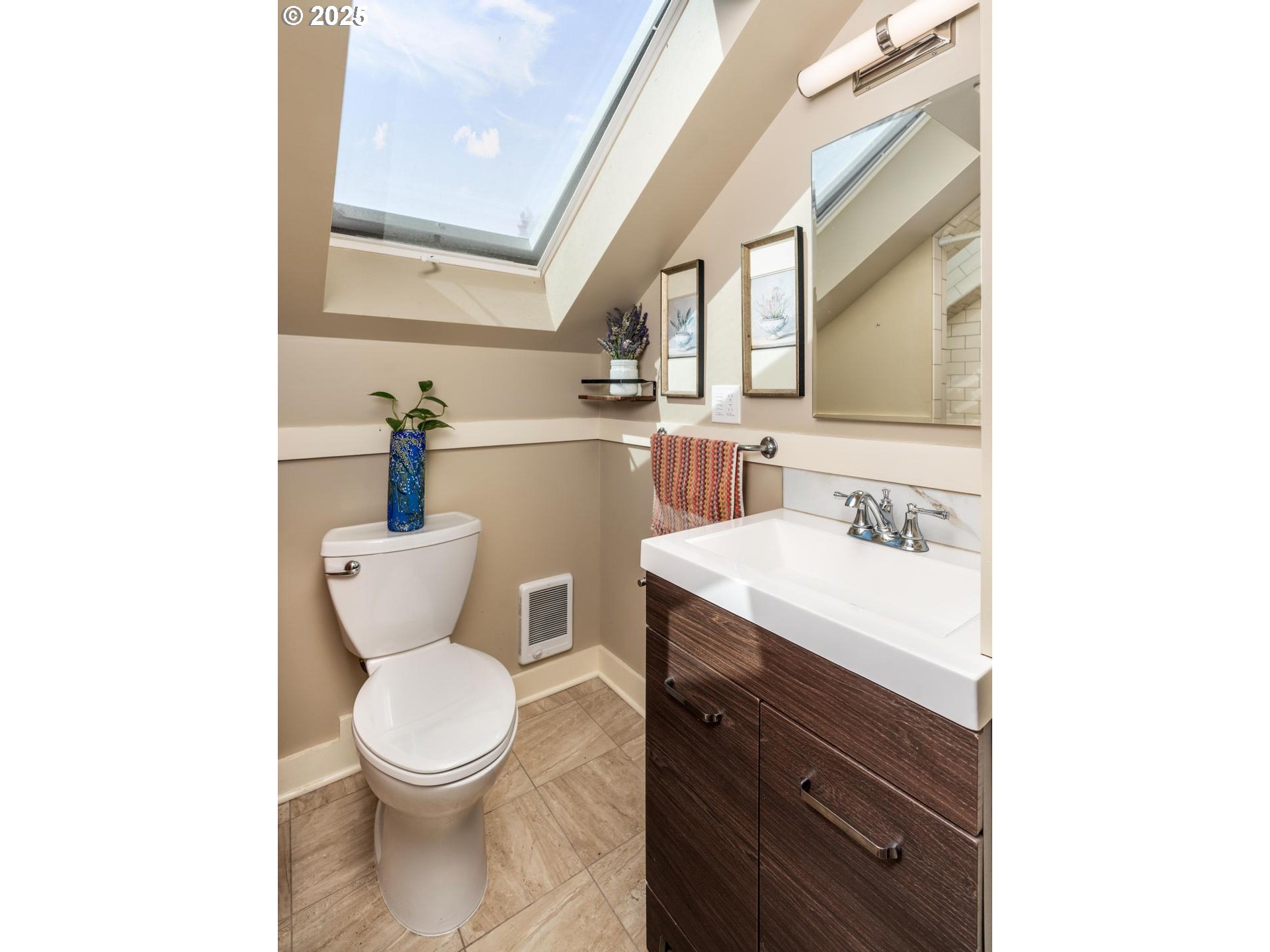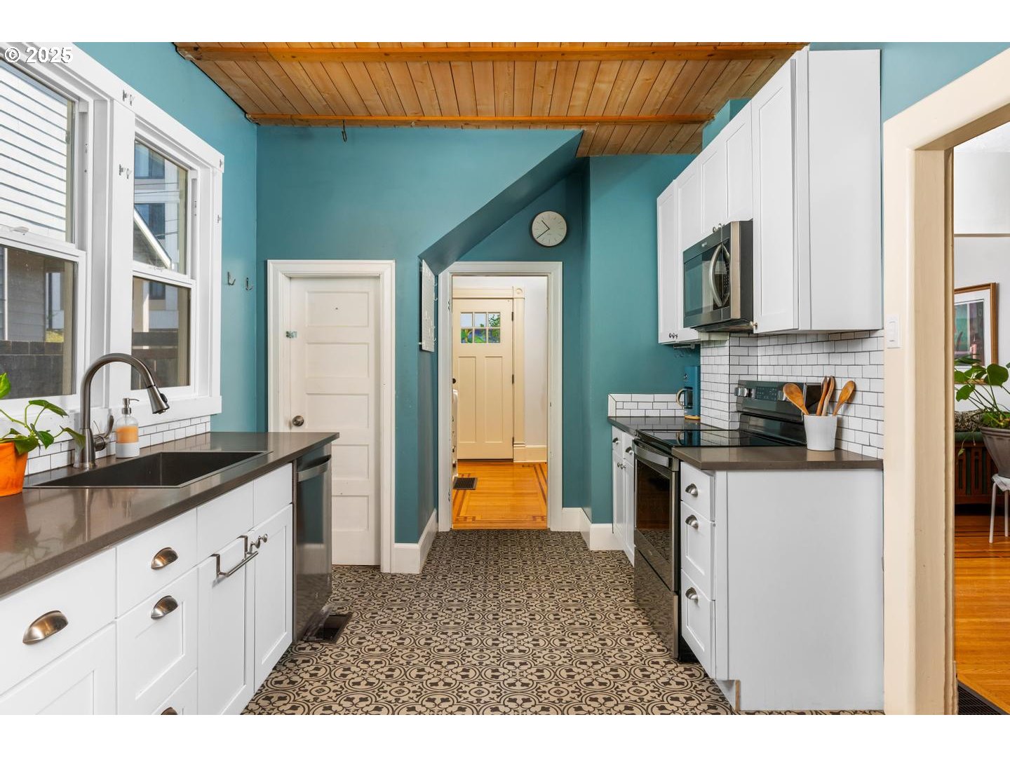 Nicely remodeled kitchen and bathrooms, including updated plumbing and electrical, in desirable Montavilla. Full width, covered front porch and dedicated entry welcome you and your guests. Living and dining rooms feature high ceilings, hardwood floors with inlays and large, energy-efficient double-pane windows, bringing in an abundance of natural light. Nicely remodeled kitchen with quartz counters, shaker cabinets, subway tile backsplash, natural wood ceiling and stainless appliances. One full, updated bathroom on each level; main floor bath has quartz counters, and second floor bath has subway tile shower and two skylites. Three bedrooms, all upstairs; two have wood-like laminate flooring and the third has built-in drawers. Yard with large, flagstone patio. Less than two blocks to restaurants and coffee on NE Glisan, including Futura Coffee Roasters. Walk Score 85, Very Walkable, bike score 99, Biker’s Paradise. [Home Energy Score = 4. HES Report at https://rpt.greenbuildingregistry.com/hes/OR10139348]
