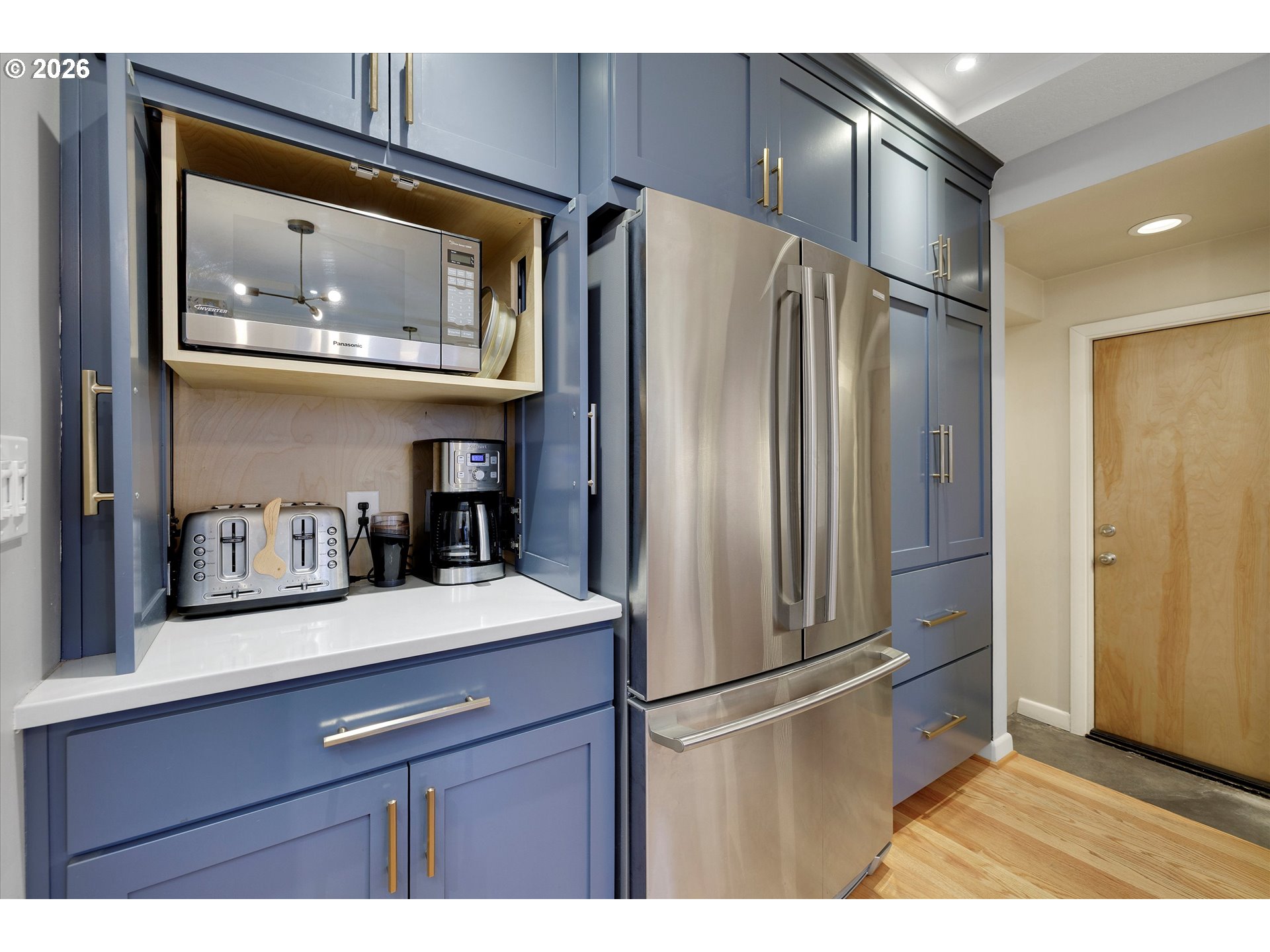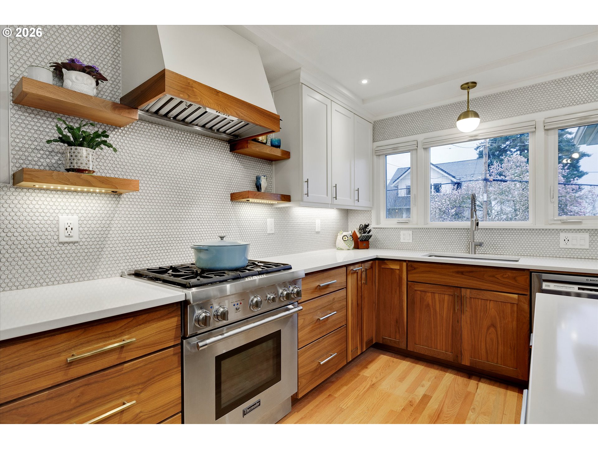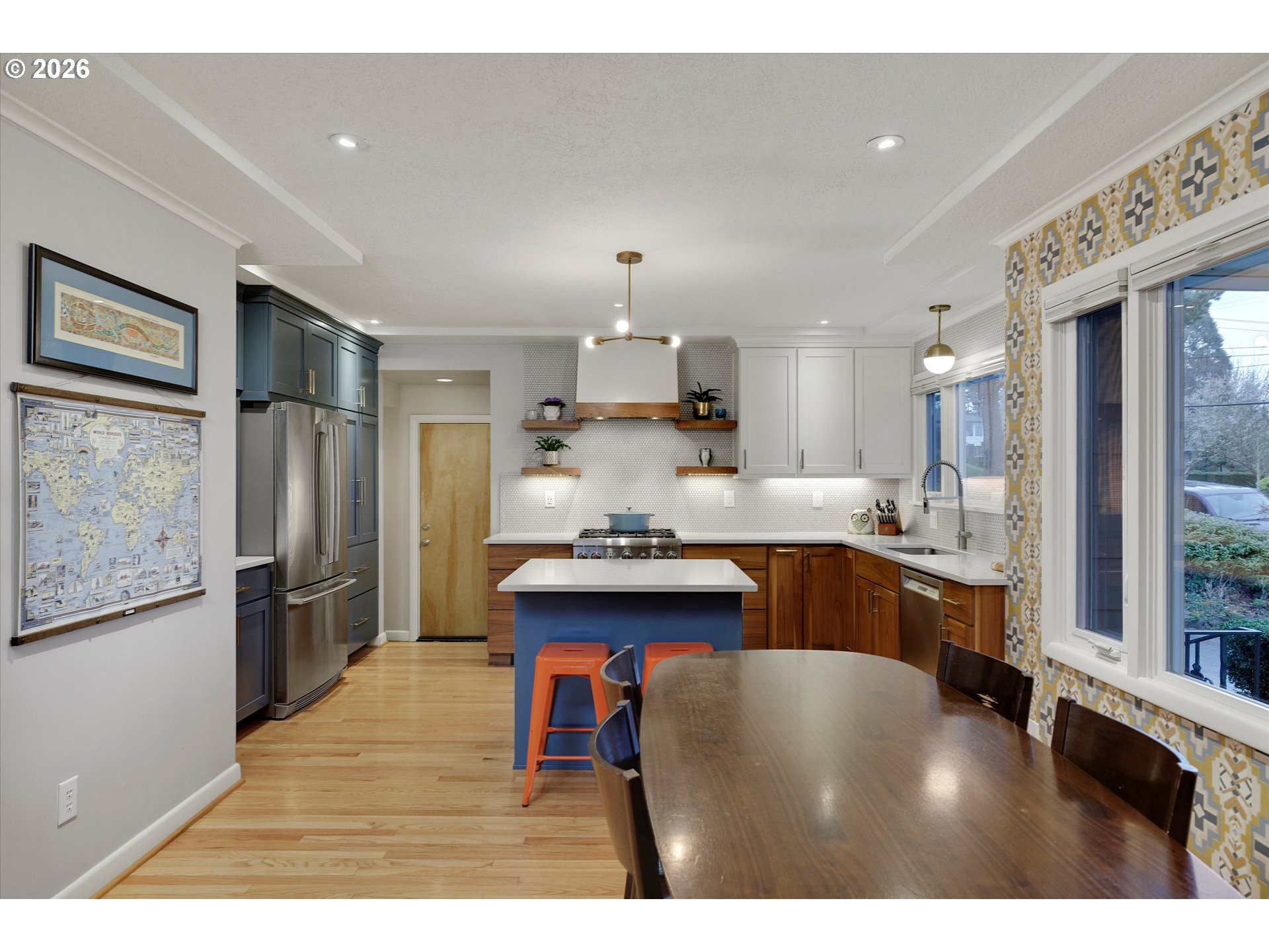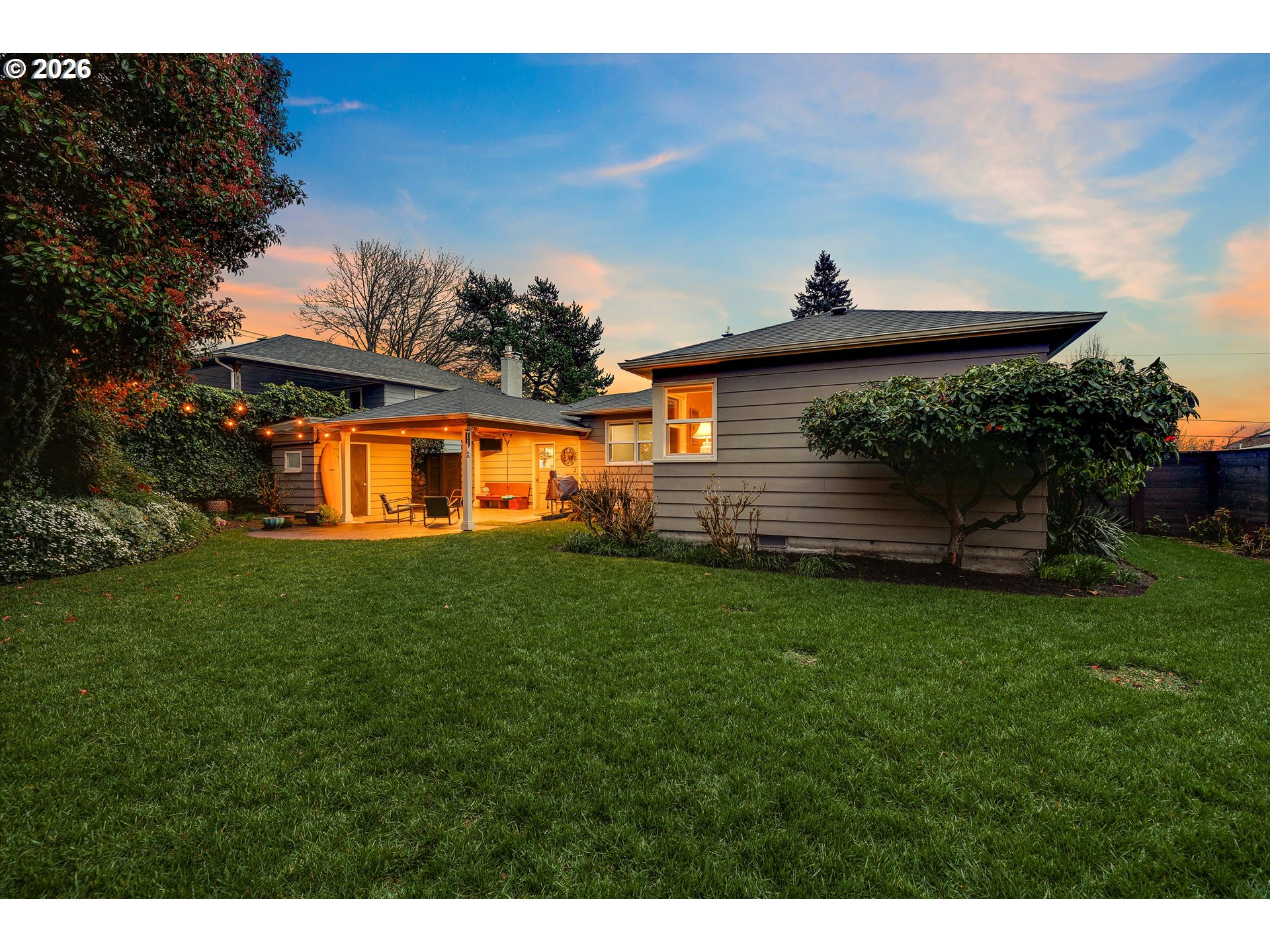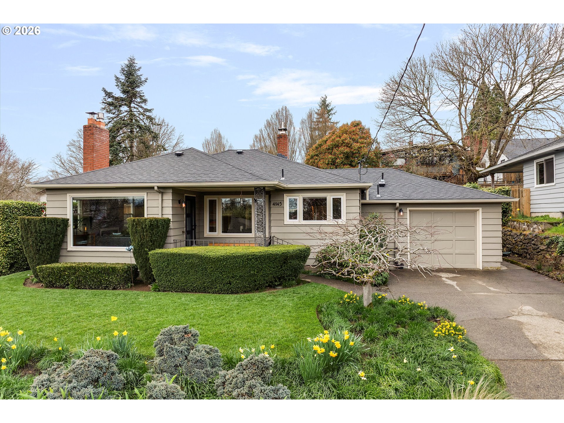 Located in coveted Eastmoreland Heights, close to Woodstock and minutes to downtown Portland. This fully renovated 1952 Mid-Century Ranch is loaded w/ character & charm while offering thoughtful, designer-level updates throughout. Original hardwood floors, expansive picture windows and a gas fireplace anchor the light-filled living room, where the home’s elevated posture captures peaceful territorial views. The designer kitchen is a true showpiece with walnut cabinetry, quartz countertops, penny tile backsplash w/ open shelving and a gourmet Thermador gas range. The dining room boasts the same views & designer touches adding personality while honoring the home’s Mid-Century vibe. 2 out of the 4 bedrooms feature original built-ins & shelves + drawers, true to the craftsmanship of this era. The fully finished basement expands the footprint with a fourth bedroom, full bath, spacious family room w/ wood stove and oversized bonus/storage room with stained concrete floors. Set on a beautifully maintained 7,550 sq ft lot, the yard is spacious, flat, usable, and impeccably cared for & private. A large covered patio creates the perfect space for year-round entertaining. Garage workshop space and a separate shed provide additional storage plus tons of closets inside. Only 2 owners since the home was built in 1952 w/ extensive updates & upgrades the last 13 years. Upgrades: Double-pane vinyl windows, roof, furnace, hot water heater, updated plumbing & electrical, Hunter Douglas blinds, radon mitigation system, sprinkler system front & back & updated water line to the house — No detail overlooked here - delivering you a true turnkey home in one of Southeast Portland’s most desirable neighborhoods. [Home Energy Score = 3. HES Report at https://rpt.greenbuildingregistry.com/hes/OR10245440]