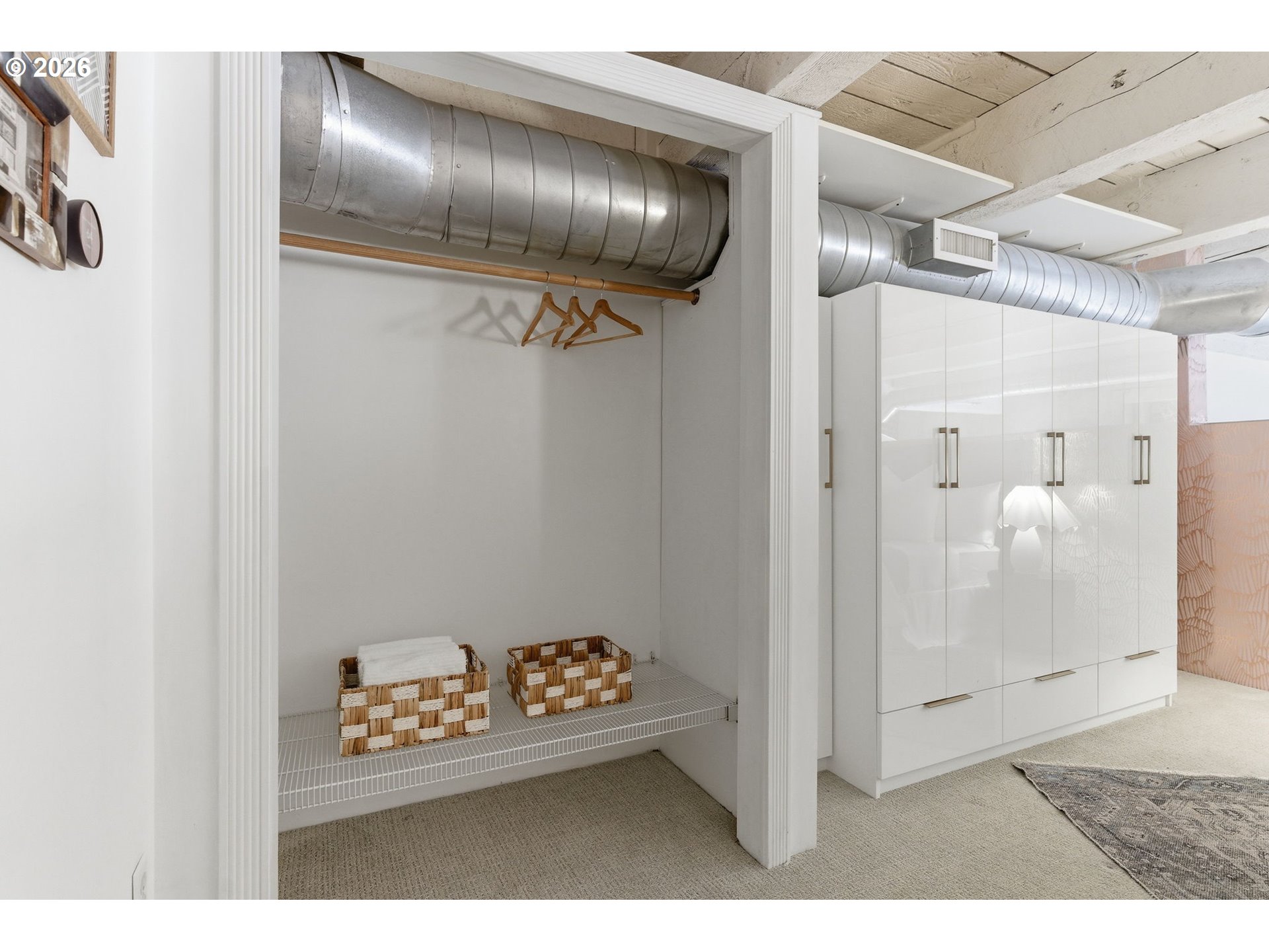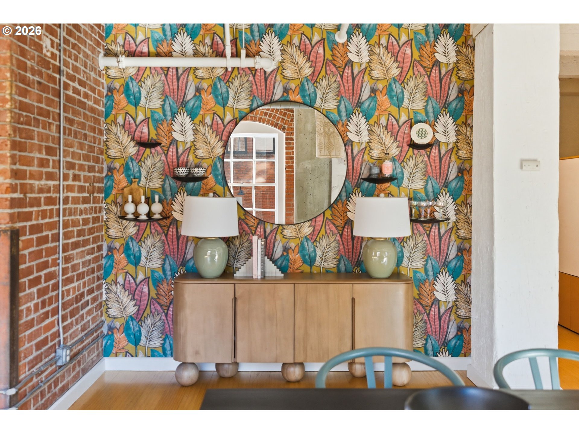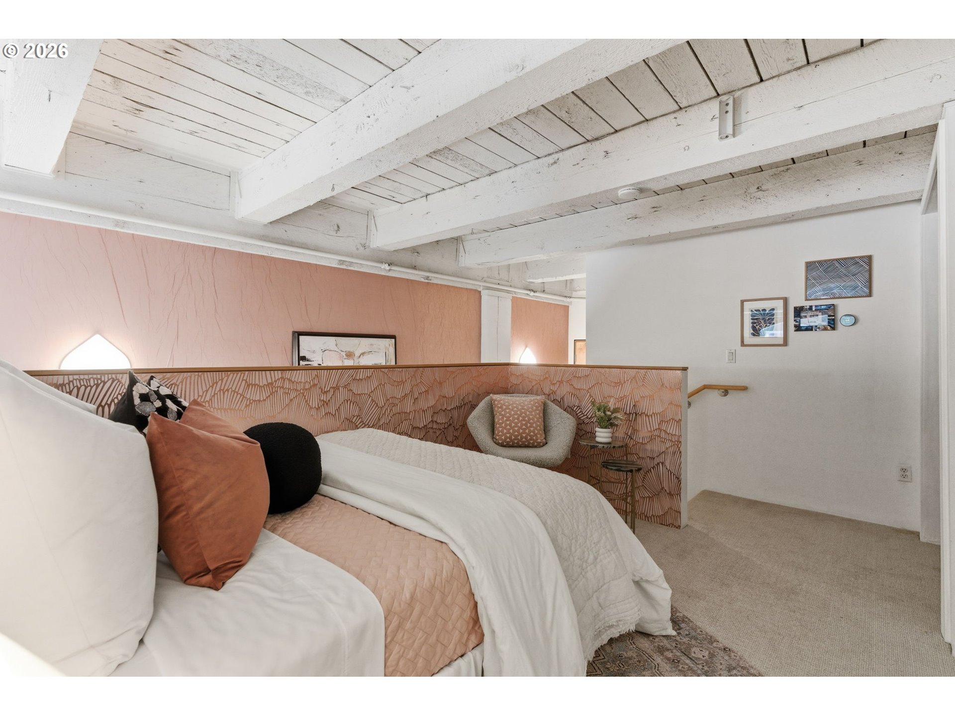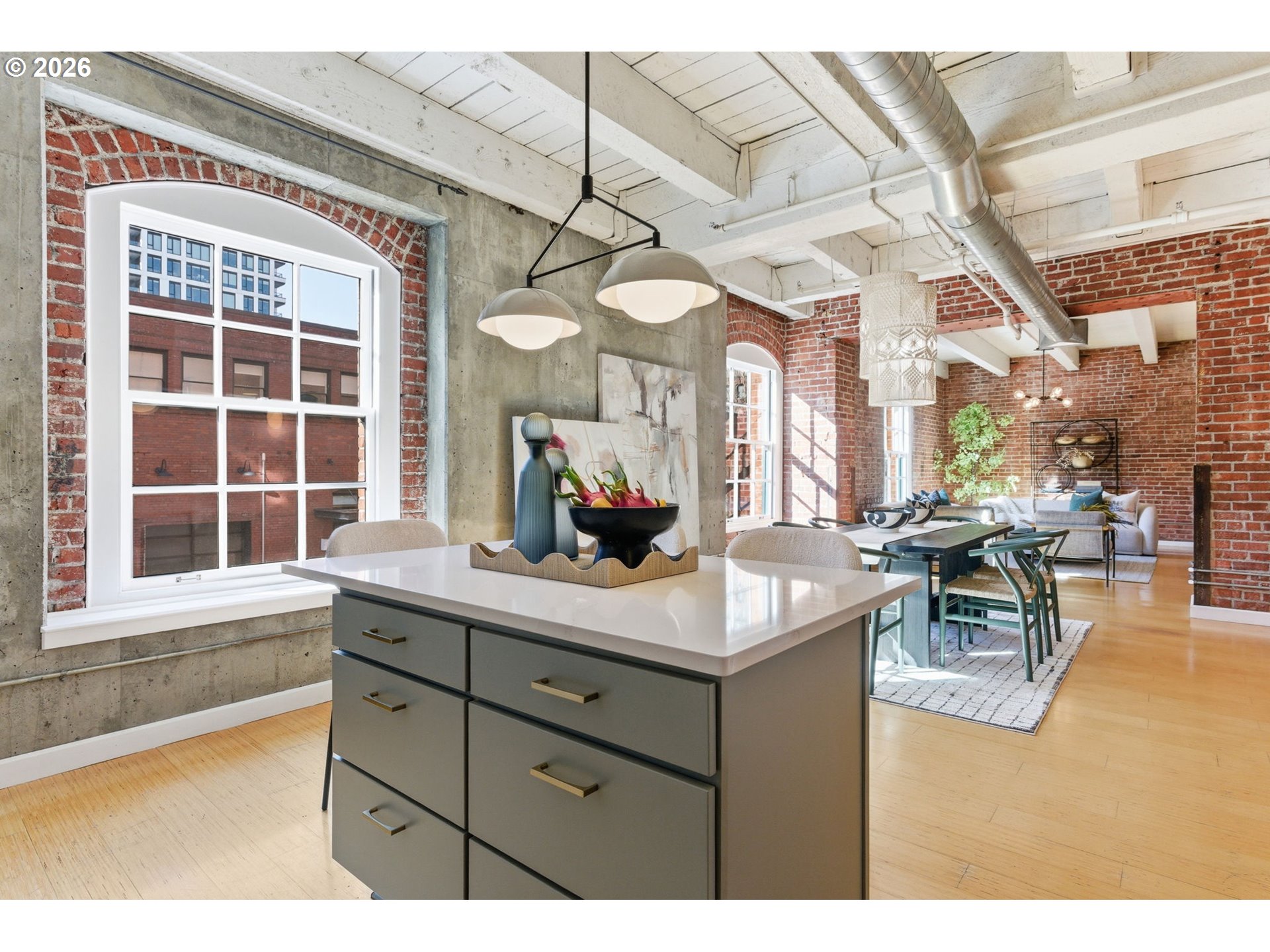 Industrial character meets refined design in this striking one-bedroom loft at the historic Chown Pella. 10-foot beamed ceilings, oversized warehouse windows, and a dramatic mix of exposed brick and concrete walls create a space rich in texture and filled with warm western light. The fully remodeled kitchen features a large island, brand-new Café appliances, and updated cabinetry and pantry, seamlessly connecting to the open living and dining areas.Elevated design details can be found throughout, including statement lighting, curated hardware, and custom wallpaper that add personality while complementing the building’s original industrial architecture.Upstairs, the lofted bedroom offers a private retreat complete with a California Closets system for exceptional storage and organization.The remodeled bathroom features a spacious walk-in shower, tile flooring, polished finishes, and newer washer and dryer. Residents of the Chown Pella enjoy access to a shared rooftop deck with sweeping city and mountain views.Perfectly positioned in the heart of the Pearl District, this home offers effortless access to some of Portland’s best restaurants, galleries, parks, and shopping, while also providing convenient access to major freeways for easy commuting.