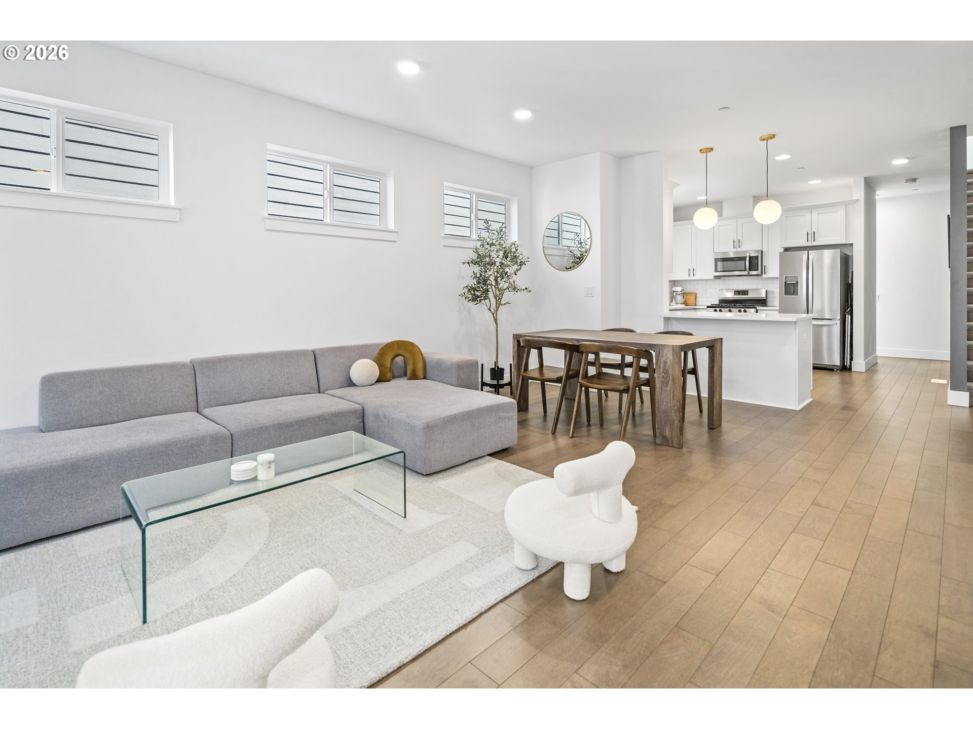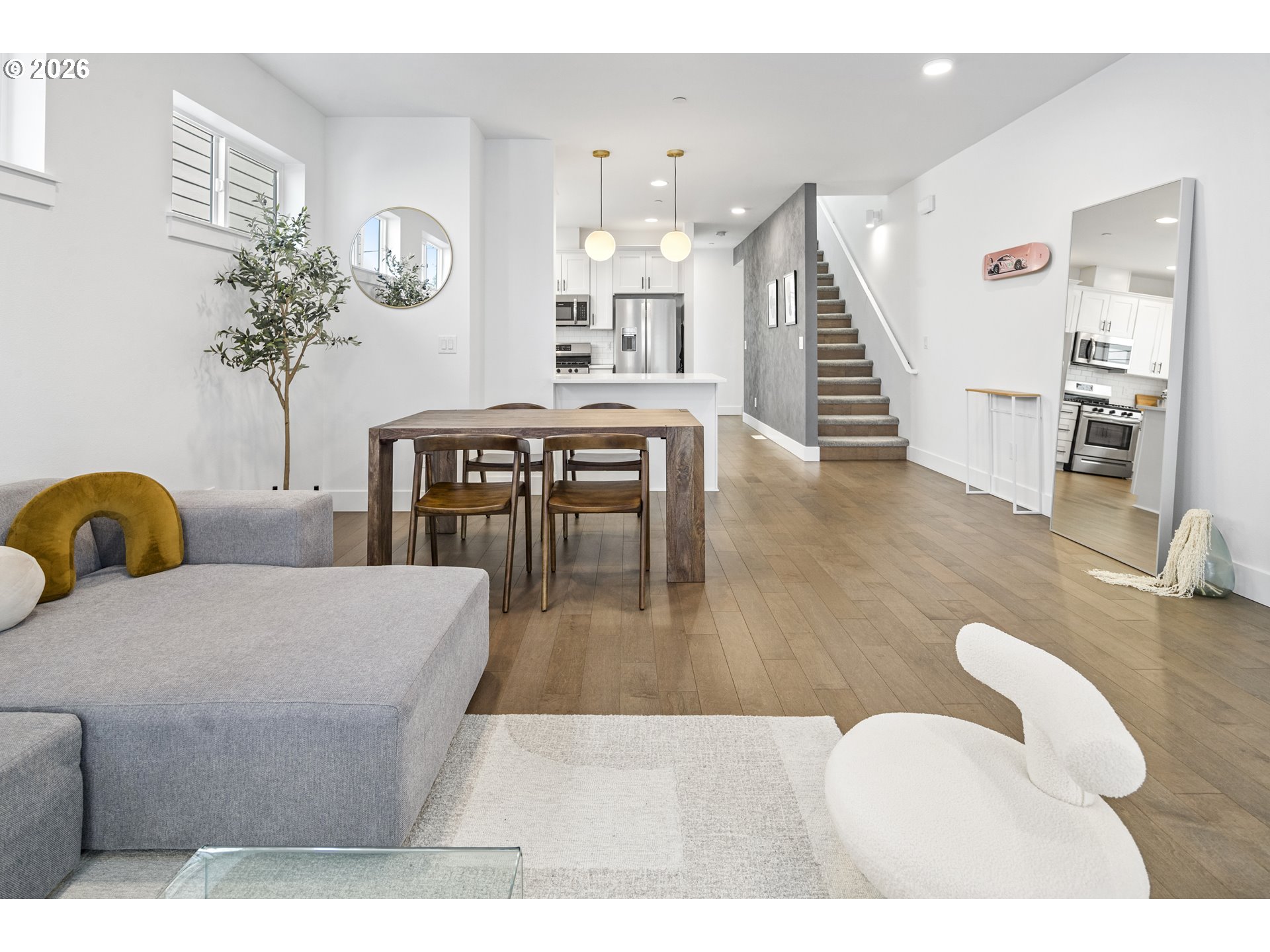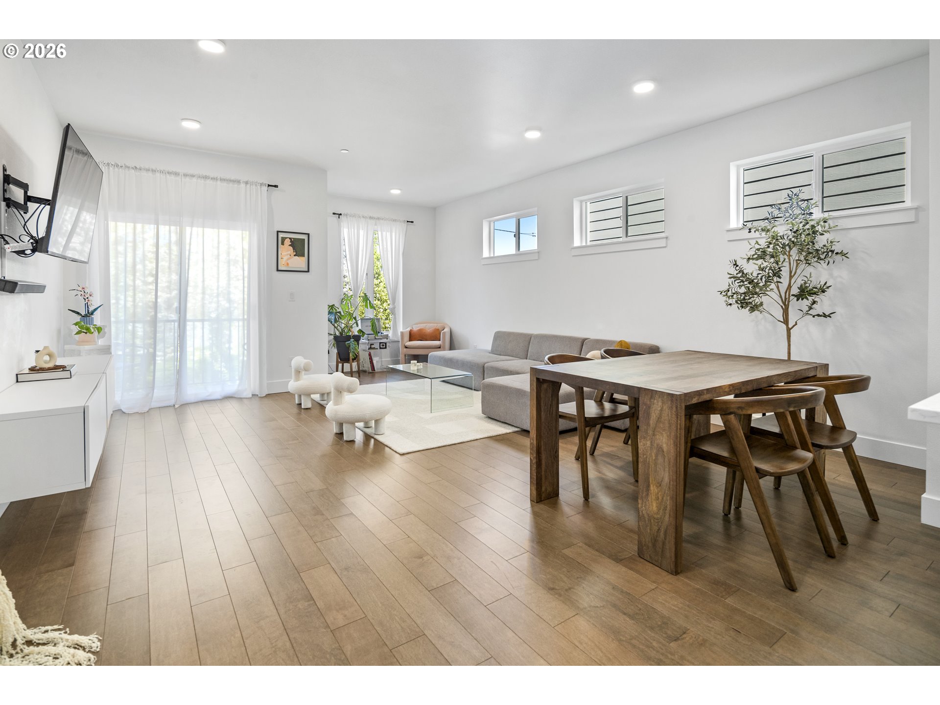 Delightful townhouse-style condo offering the privacy of a detached single-family home with the convenience of low-maintenance living and a low HOA fee! This spacious 1,714 sq ft tri-level home features a versatile 3-bedroom, 2.5-bath floor plan. The ground-level bedroom is ideal for guests, a home office, or multi-generational living with its adjoining full shower/tub bathroom. The main living area offers an open-concept living and dining space with abundant natural light and hardwood flooring. The spacious kitchen boasts quartz countertops, stain-less steel appliances, and stunningly crisp cabinets. Upstairs, the dual bedrooms are joined by a shared, luxurious bathroom and a walk-through closet that complements the walk-in primary closet. Don't miss this excellent opportunity to own a stylish, functional home in a desirable setting with a private street and dedicated single car garage, plus driveway parking and a sunny balcony!